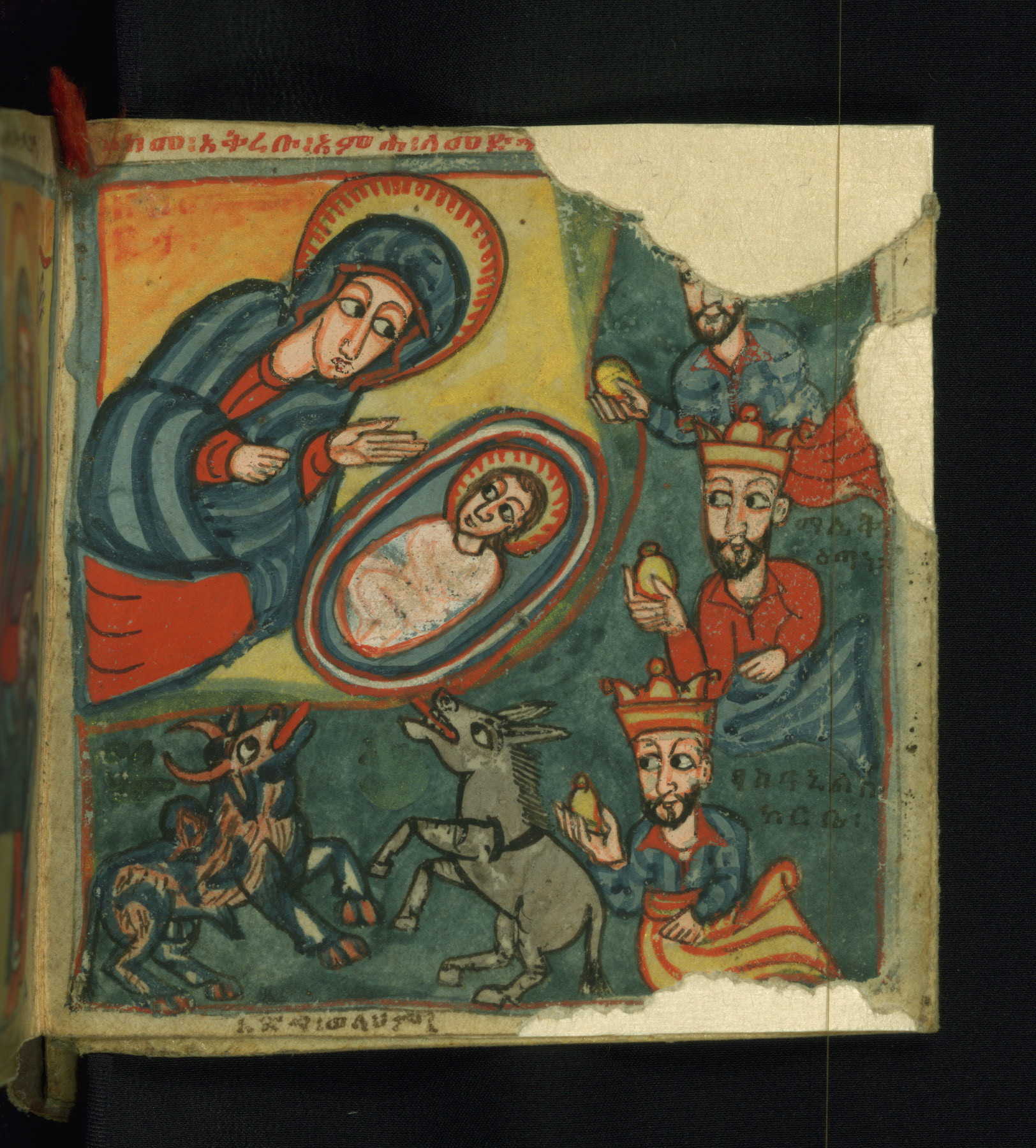 The inscription at the top reads: "ዘከመ፡ አቅረቡ፡ አምሐ፡ ለመድኅ[ን፡]," or "How they offered presents to the Savior." The inscription on the right reads: "ማሌቅ፡ ዕጣን፡ -------[?]ስባኒልስ፡ ከርቤ፡," or "Maleq (presented) incense ----- [?]basnils (presented) myrrh." The inscription on the bottom reads: "አድግ፡ ወላህም፡," or "A donkey and a cow."