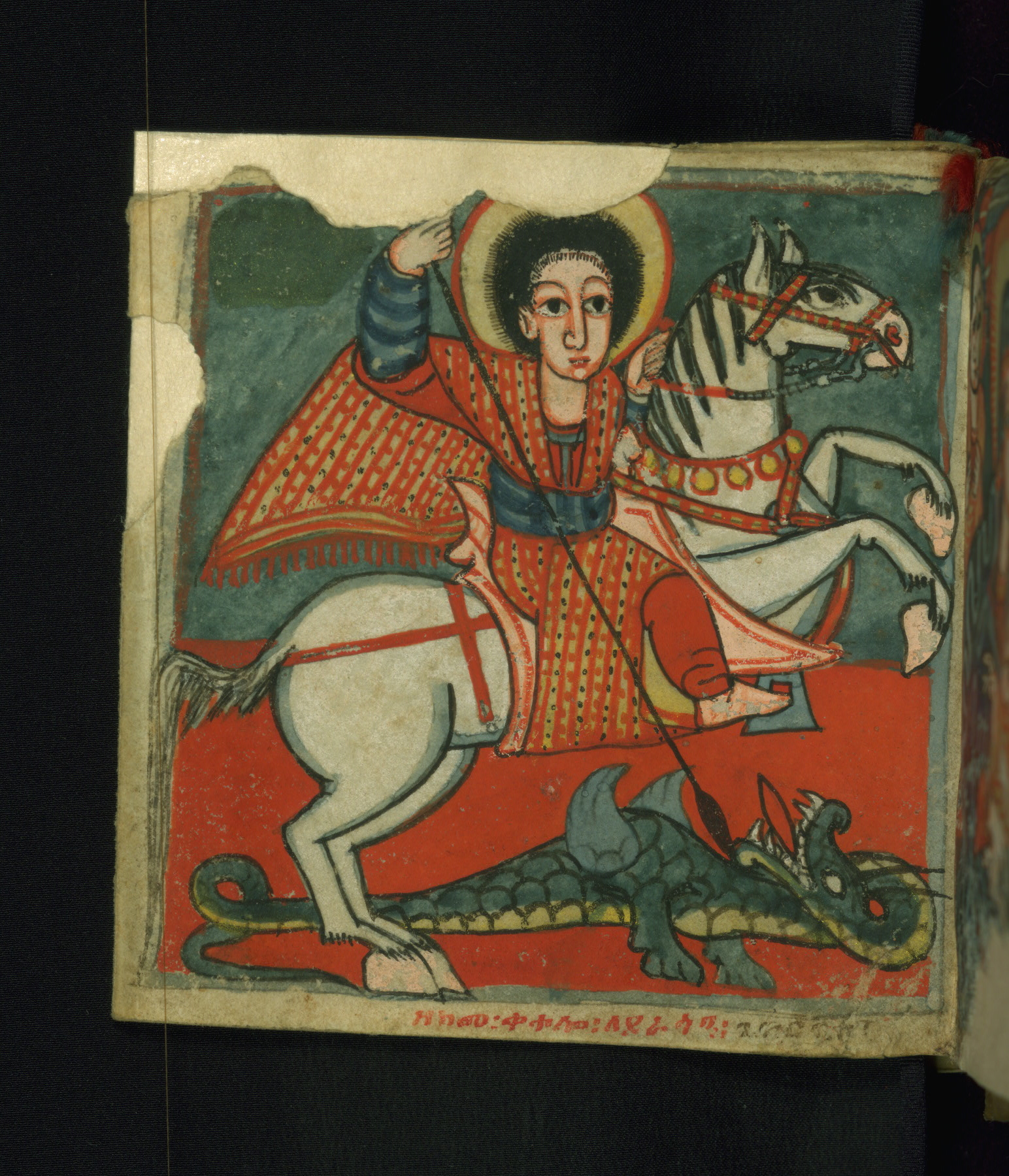 The inscription on the bottom reads: "ዘከመ፡ ቀተሎ፡ ለደራጎን፡ ጊዮርጊስ፡," or "How George killed the dragon."