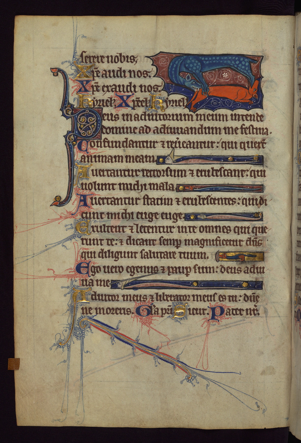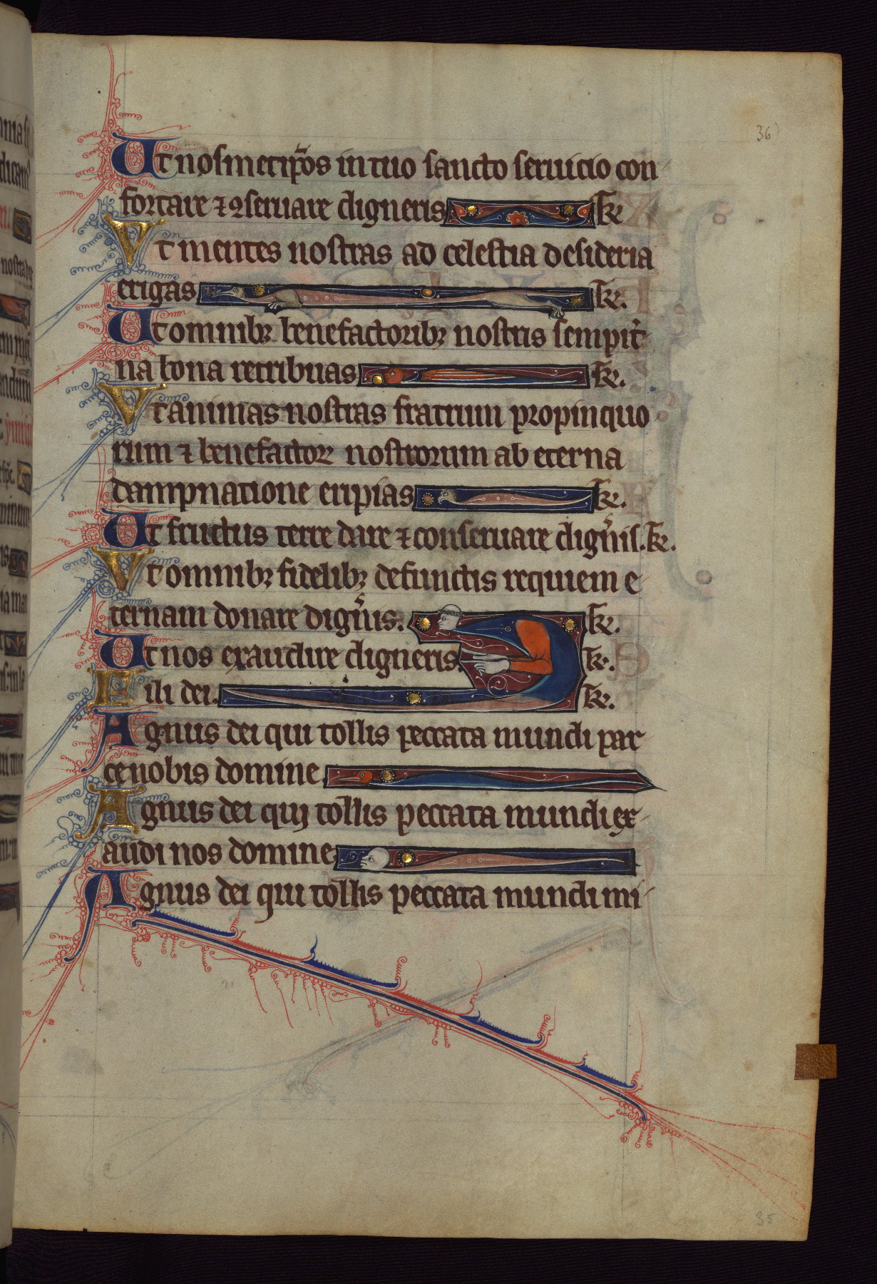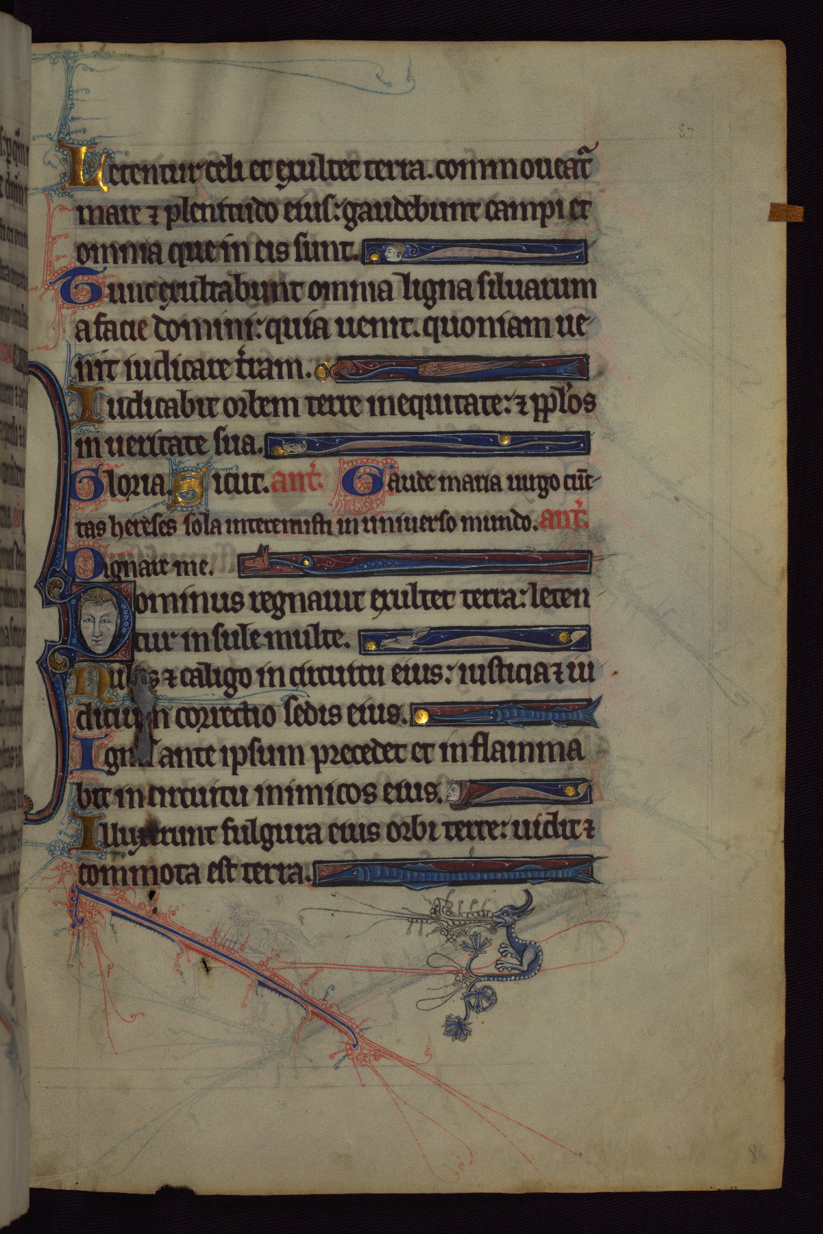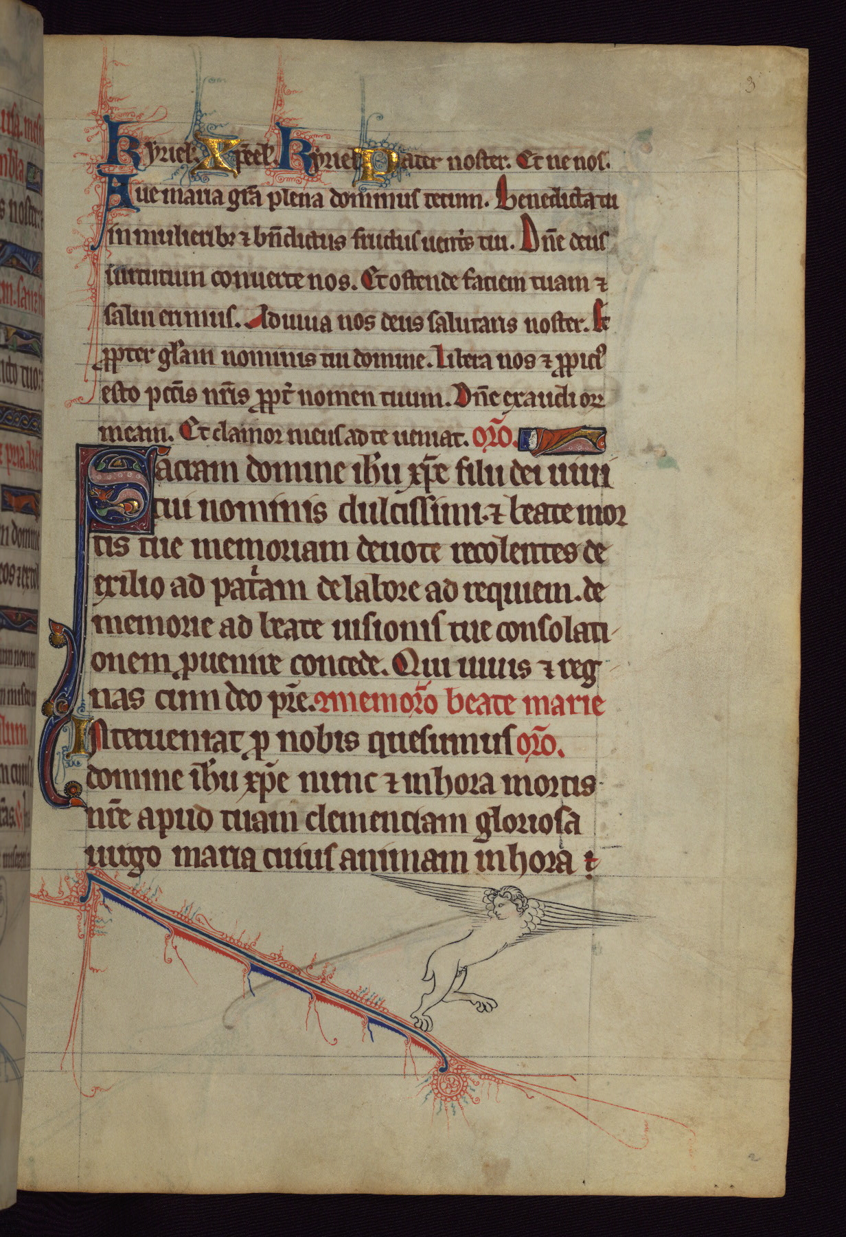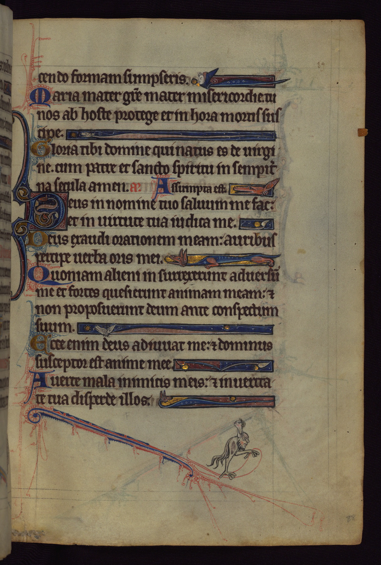 This finely illuminated and iconographically rich book of hours was made in England at the end of the thirteenth century. The manuscript is incomplete and misbound. Its main artist can also be found at work in a Bible (Oxford, Bodleian Library Ms. Auct. D.3.2) and a psalter (Cambridge, Trinity College Cambridge Ms. O.4.16). The manuscript contains a number of unusual texts, including the Hours of Jesus Crucified and the Office of St. Catherine. The patron of the manuscript is not clear; a woman is depicted as praying in many of the initials, but rubrics in the Office of the Dead mention "freres" (brothers). The imagery is inventive, and the Hours of Christ Crucified are graced with images depicting the funeral of Reynard the Fox in its margins. In the absence of a calendar, it is not possible to locate the origin of the manuscript precisely.