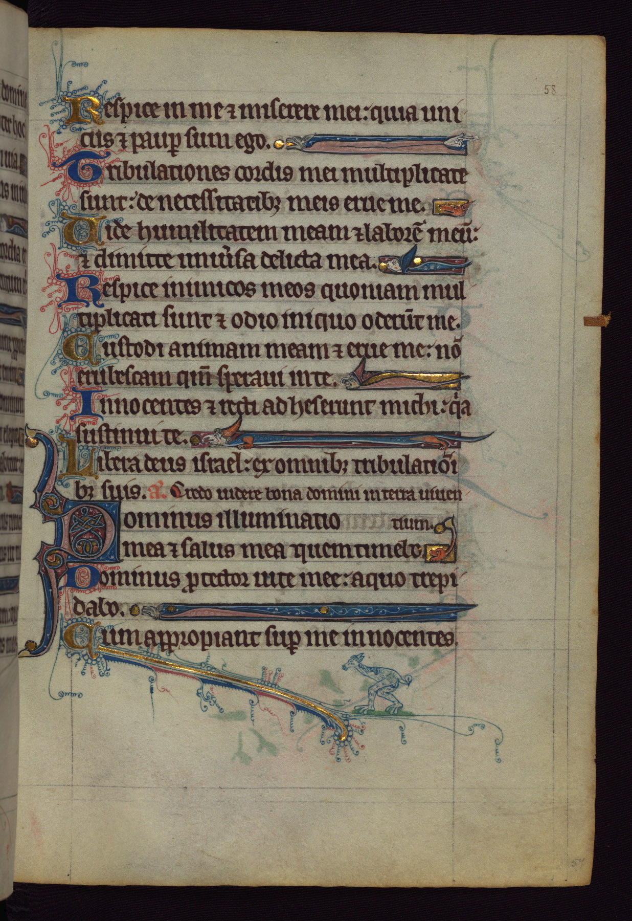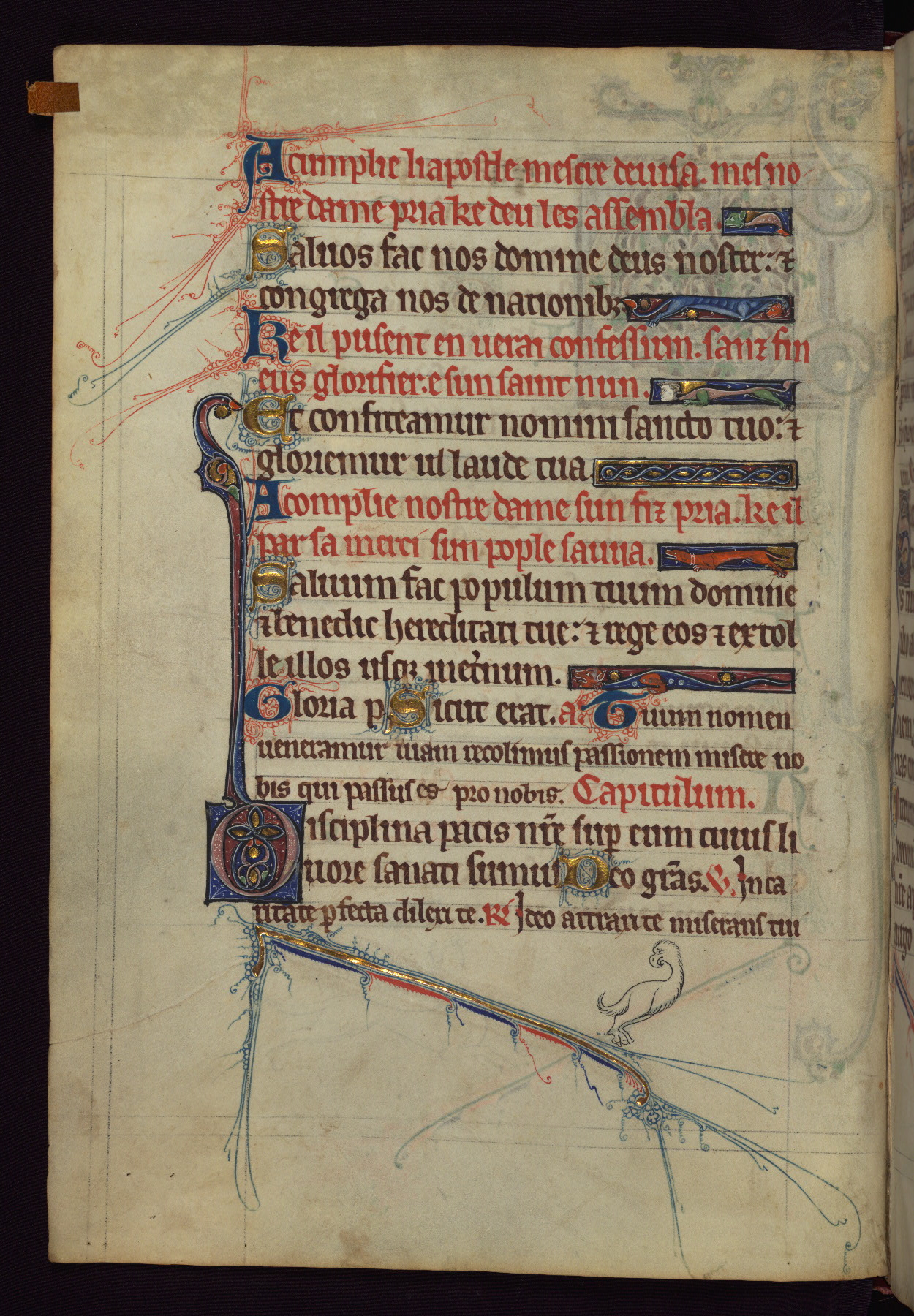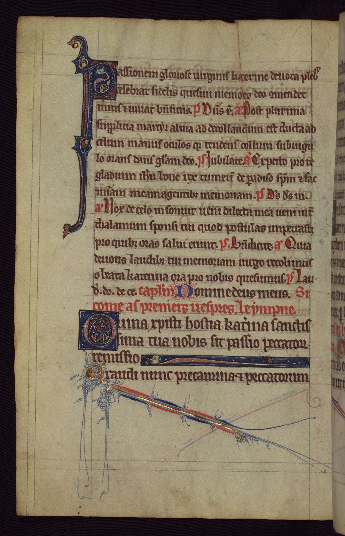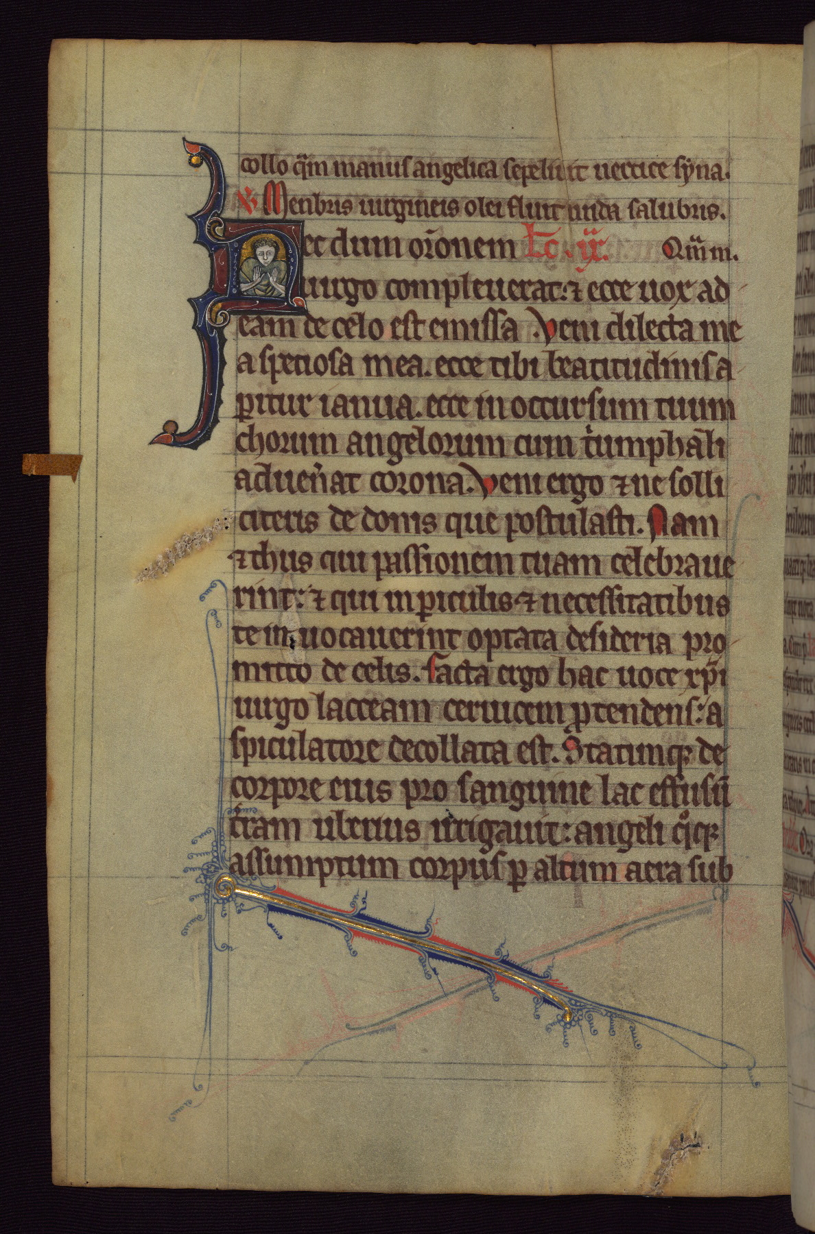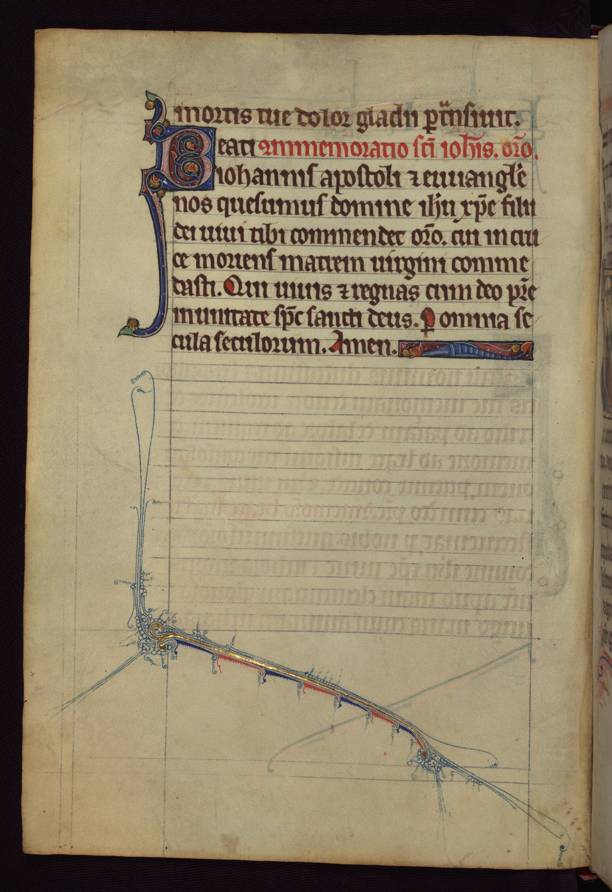 This finely illuminated and iconographically rich book of hours was made in England at the end of the thirteenth century. The manuscript is incomplete and misbound. Its main artist can also be found at work in a Bible (Oxford, Bodleian Library Ms. Auct. D.3.2) and a psalter (Cambridge, Trinity College Cambridge Ms. O.4.16). The manuscript contains a number of unusual texts, including the Hours of Jesus Crucified and the Office of St. Catherine. The patron of the manuscript is not clear; a woman is depicted as praying in many of the initials, but rubrics in the Office of the Dead mention "freres" (brothers). The imagery is inventive, and the Hours of Christ Crucified are graced with images depicting the funeral of Reynard the Fox in its margins. In the absence of a calendar, it is not possible to locate the origin of the manuscript precisely.