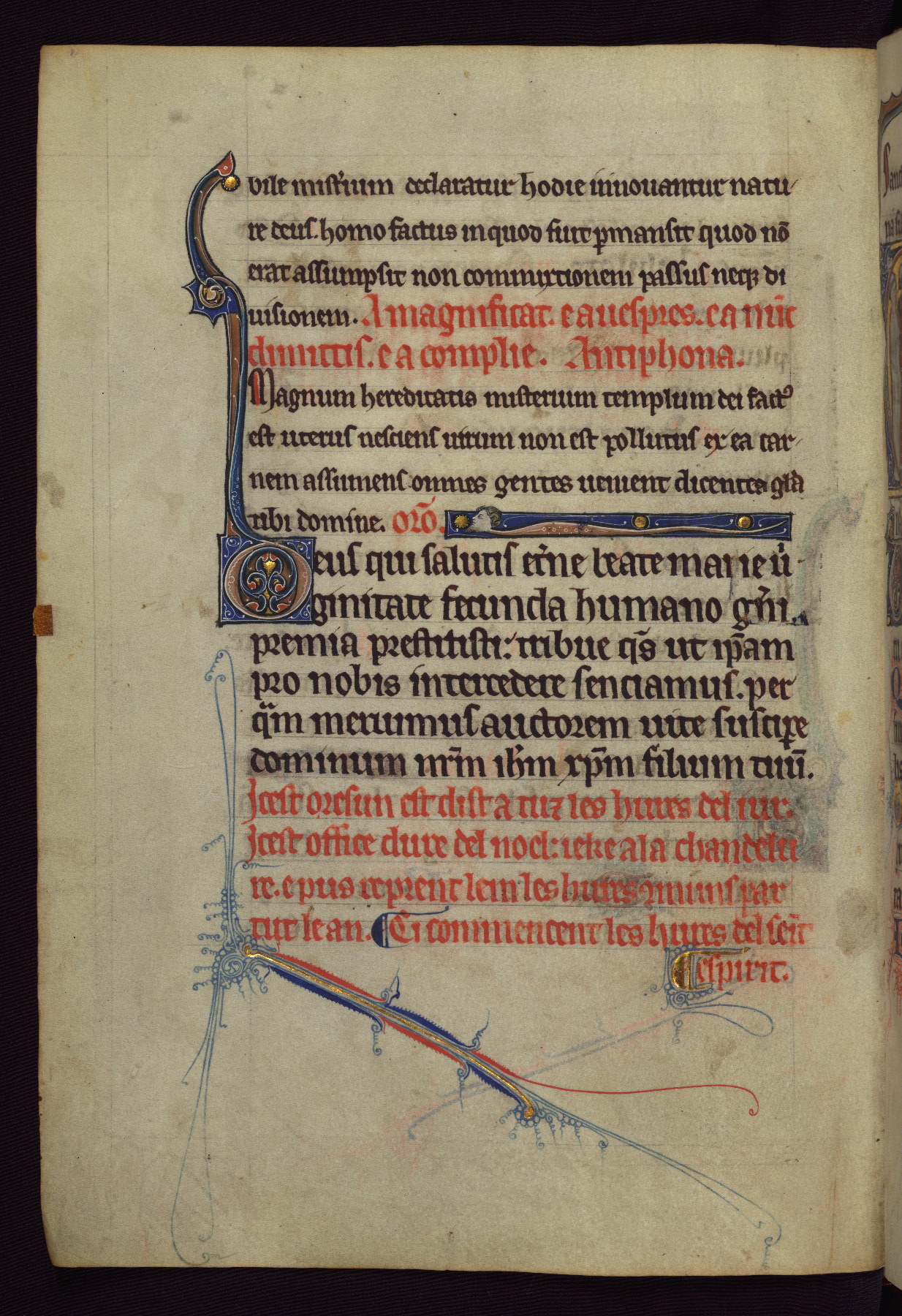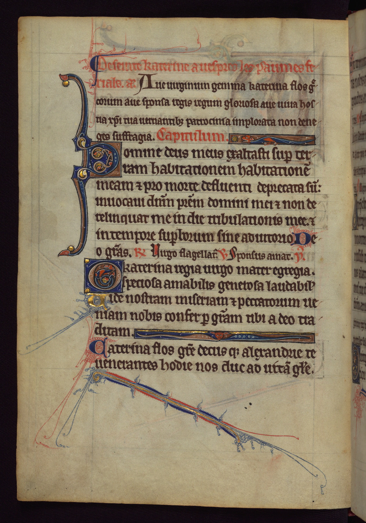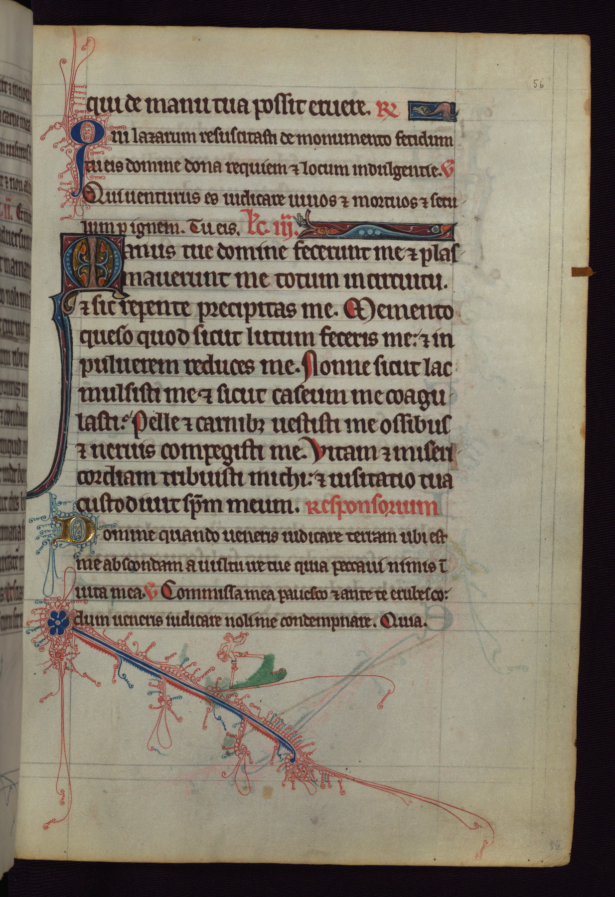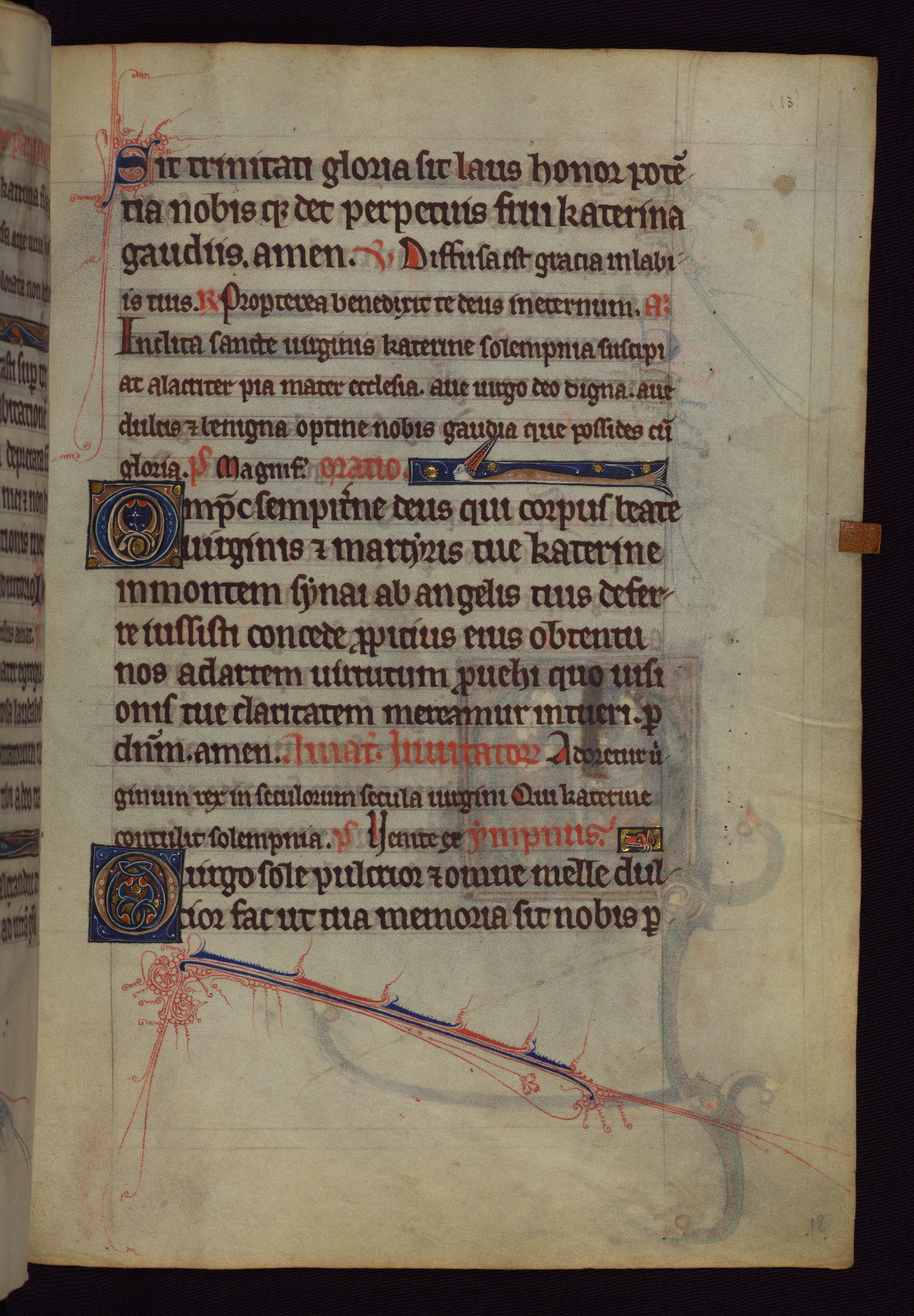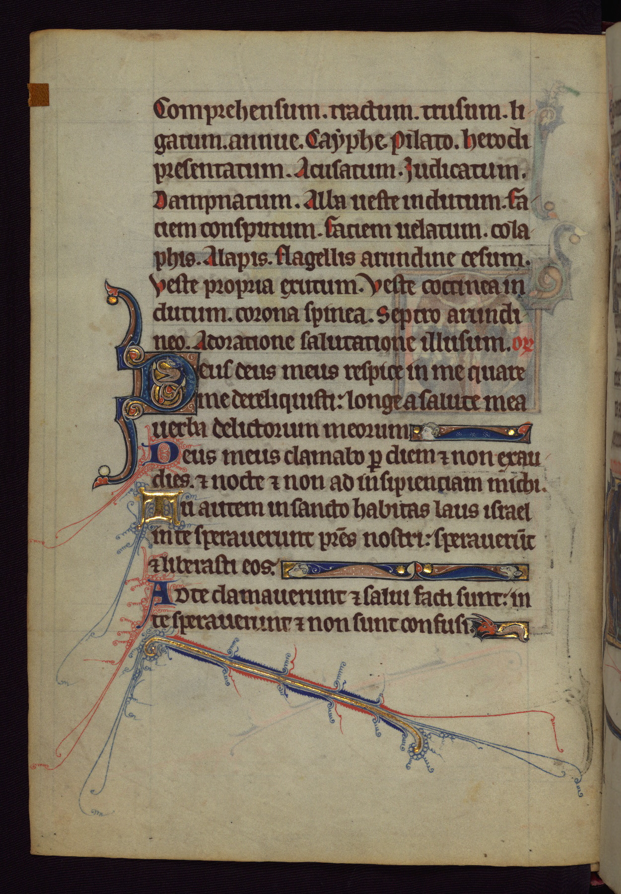 This finely illuminated and iconographically rich book of hours was made in England at the end of the thirteenth century. The manuscript is incomplete and misbound. Its main artist can also be found at work in a Bible (Oxford, Bodleian Library Ms. Auct. D.3.2) and a psalter (Cambridge, Trinity College Cambridge Ms. O.4.16). The manuscript contains a number of unusual texts, including the Hours of Jesus Crucified and the Office of St. Catherine. The patron of the manuscript is not clear; a woman is depicted as praying in many of the initials, but rubrics in the Office of the Dead mention "freres" (brothers). The imagery is inventive, and the Hours of Christ Crucified are graced with images depicting the funeral of Reynard the Fox in its margins. In the absence of a calendar, it is not possible to locate the origin of the manuscript precisely.