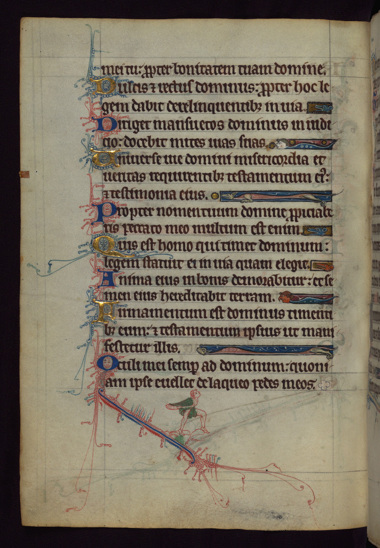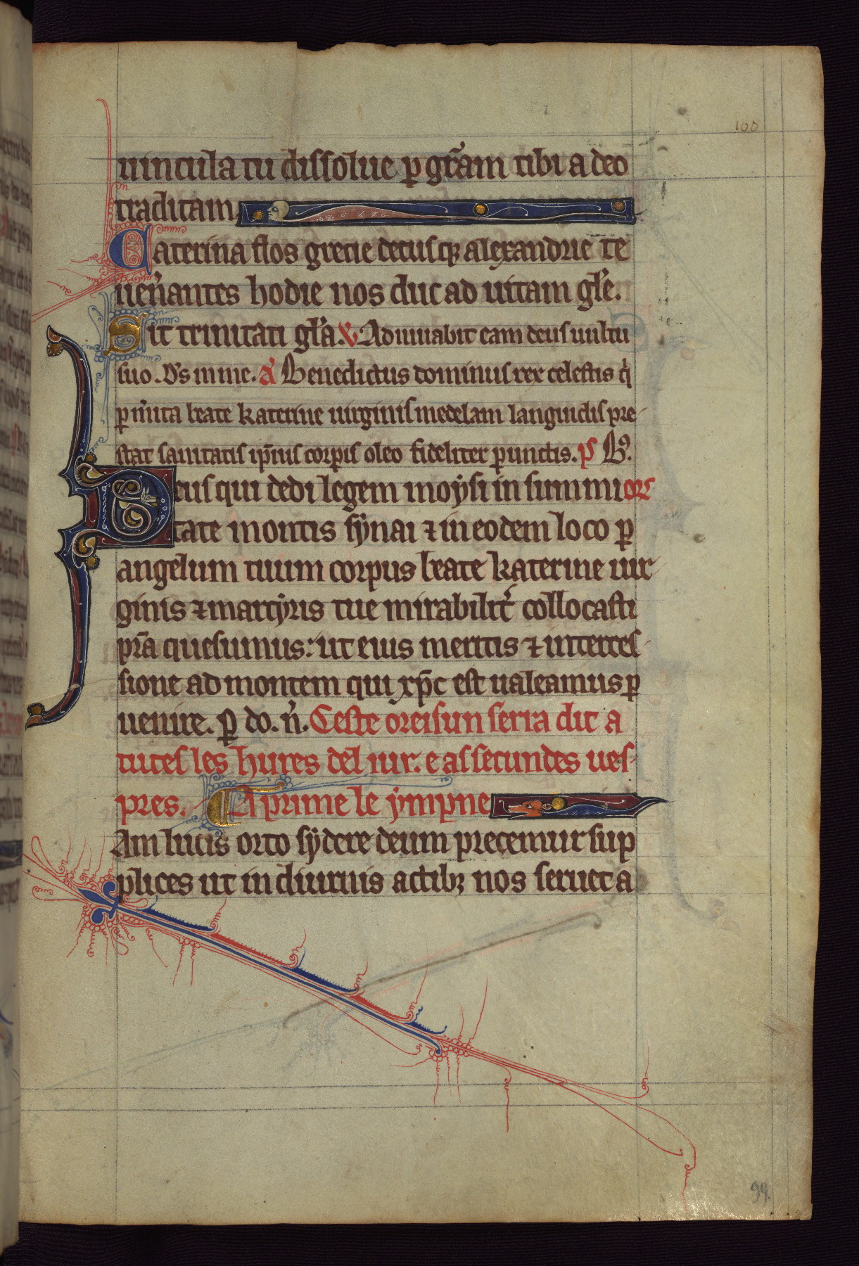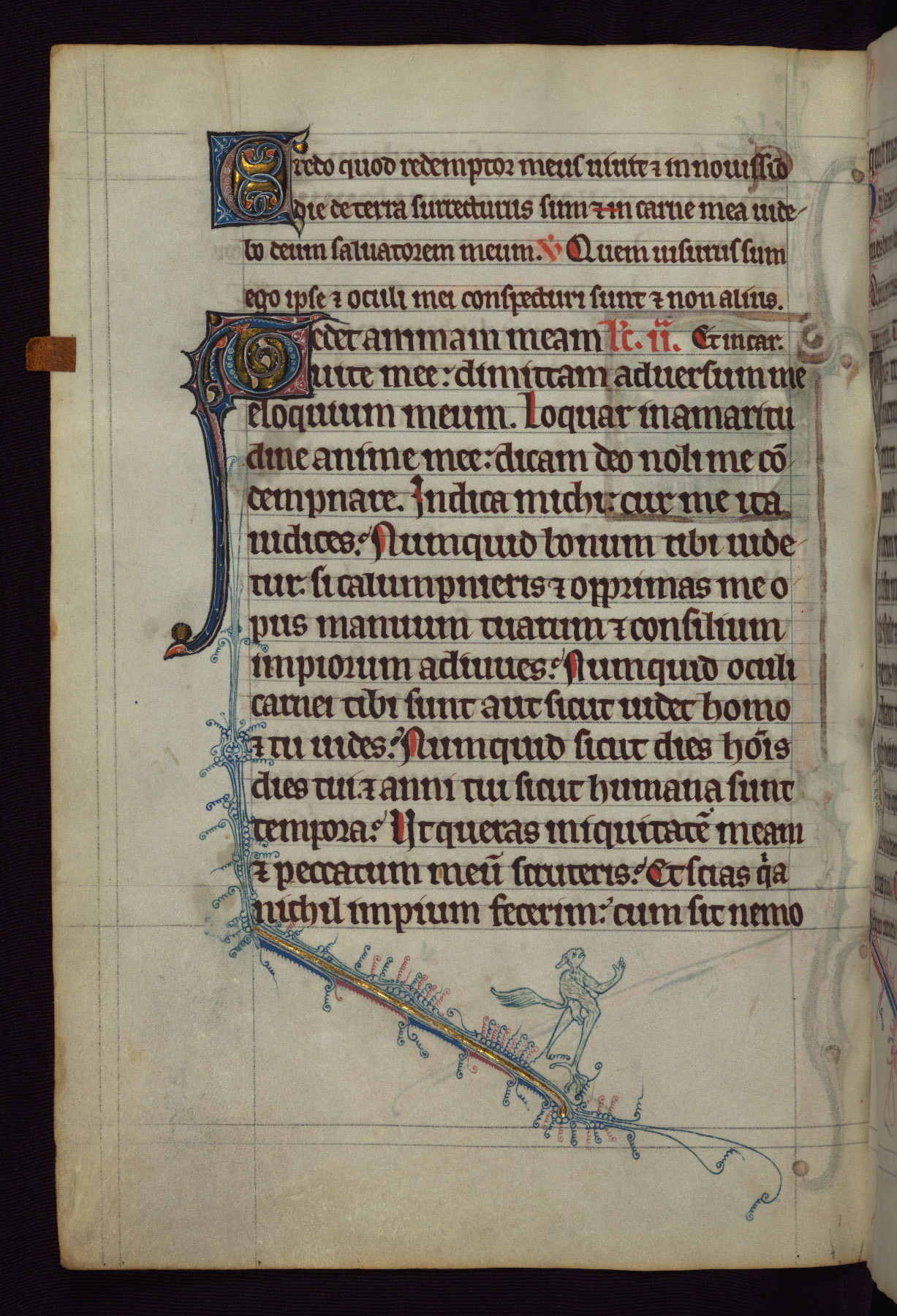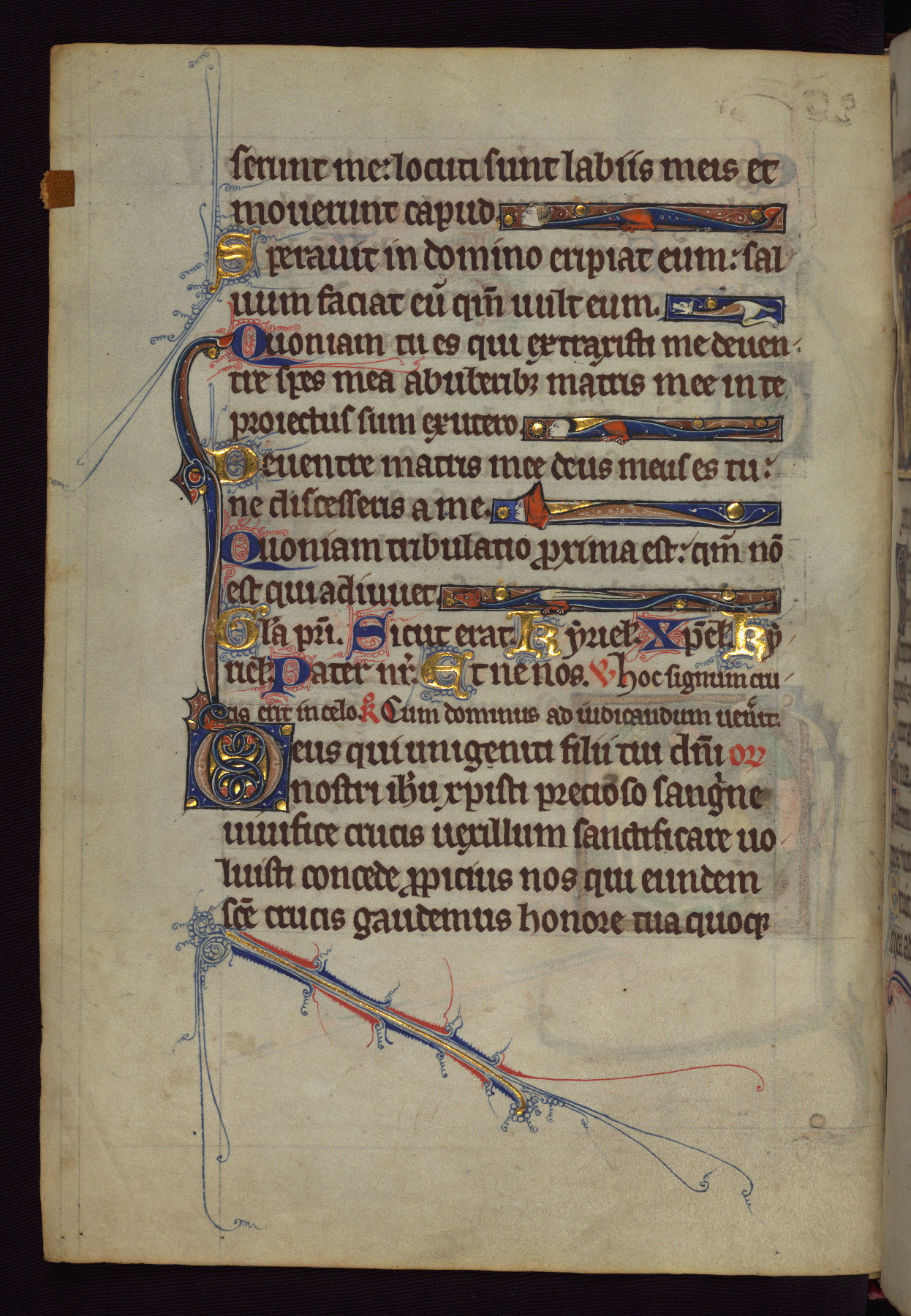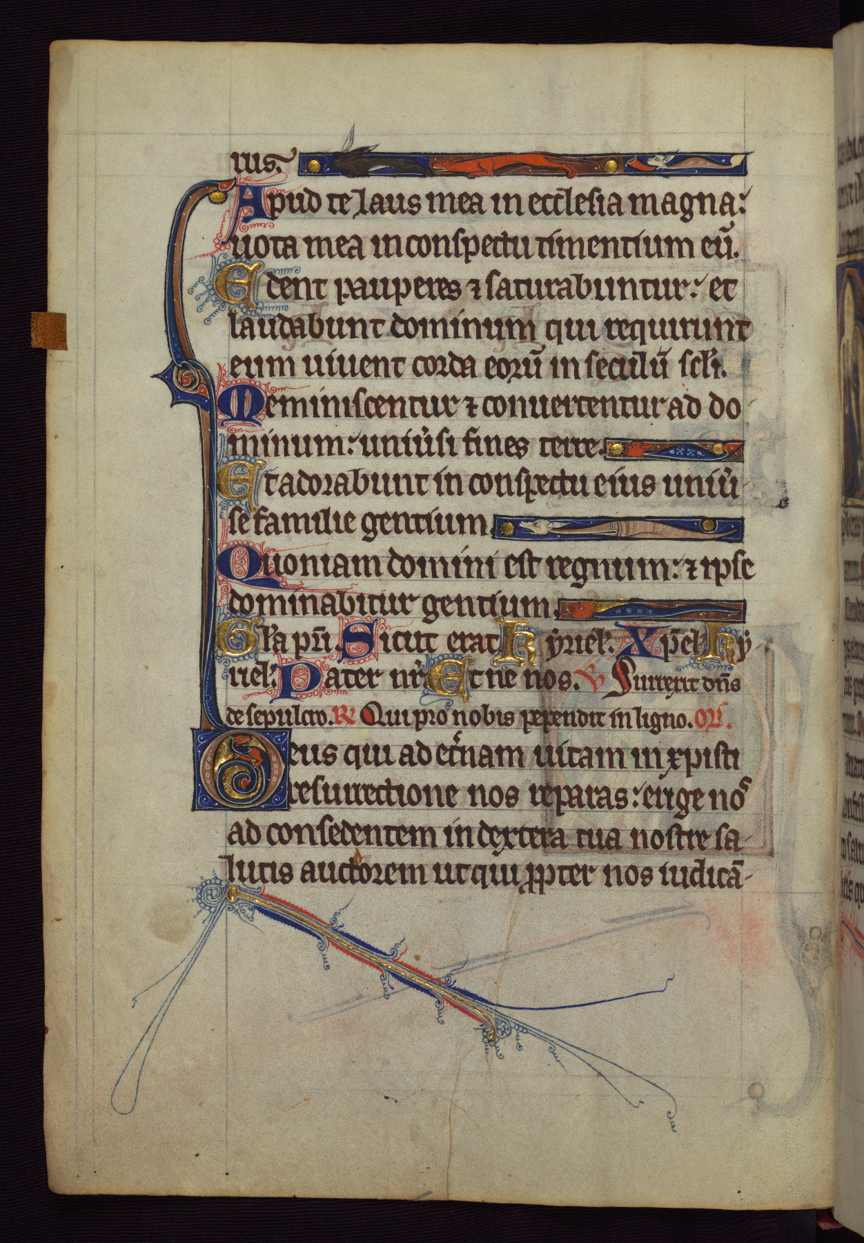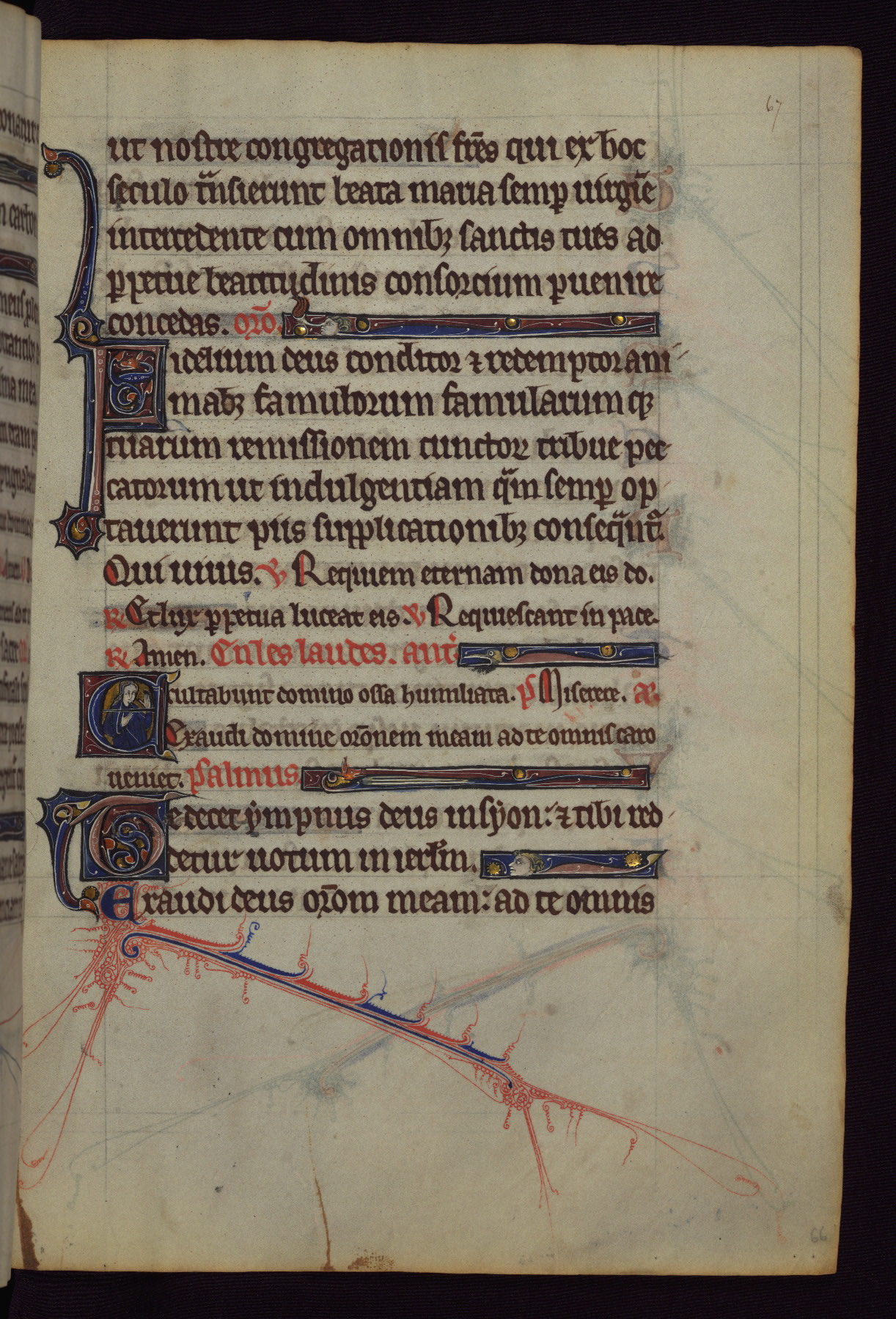 This finely illuminated and iconographically rich book of hours was made in England at the end of the thirteenth century. The manuscript is incomplete and misbound. Its main artist can also be found at work in a Bible (Oxford, Bodleian Library Ms. Auct. D.3.2) and a psalter (Cambridge, Trinity College Cambridge Ms. O.4.16). The manuscript contains a number of unusual texts, including the Hours of Jesus Crucified and the Office of St. Catherine. The patron of the manuscript is not clear; a woman is depicted as praying in many of the initials, but rubrics in the Office of the Dead mention "freres" (brothers). The imagery is inventive, and the Hours of Christ Crucified are graced with images depicting the funeral of Reynard the Fox in its margins. In the absence of a calendar, it is not possible to locate the origin of the manuscript precisely.