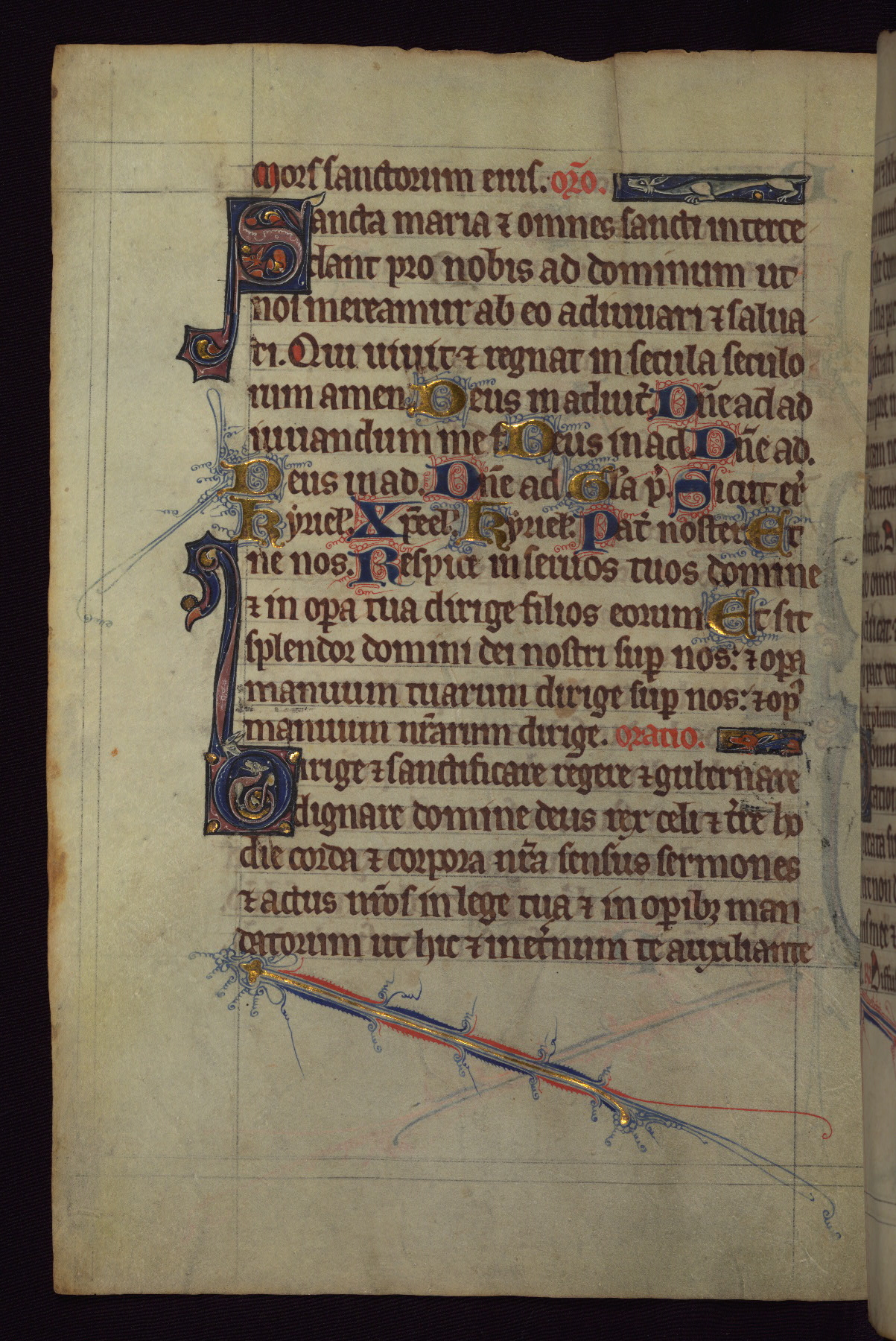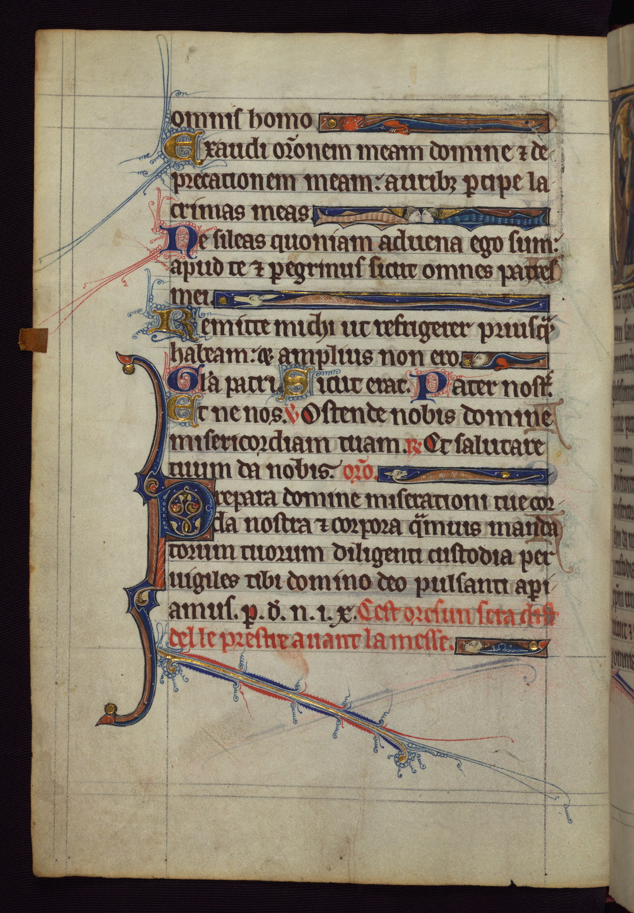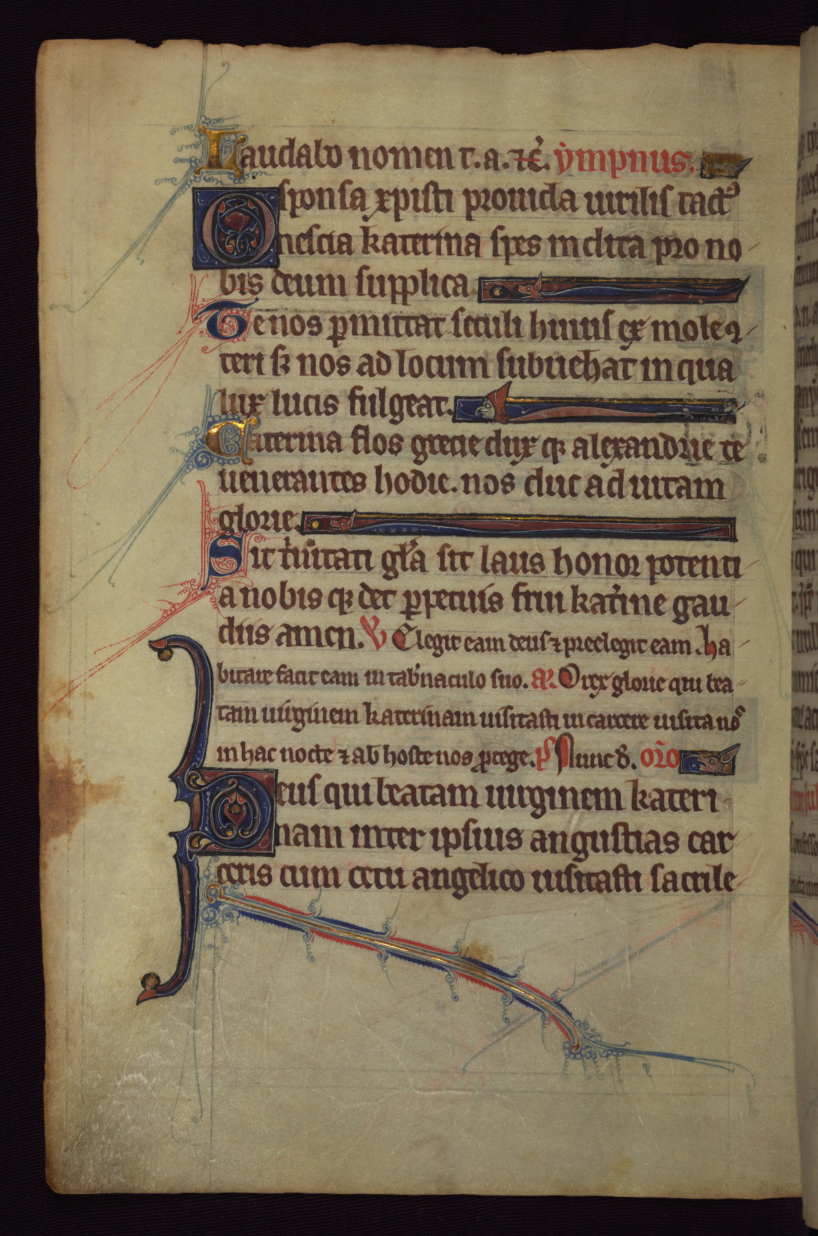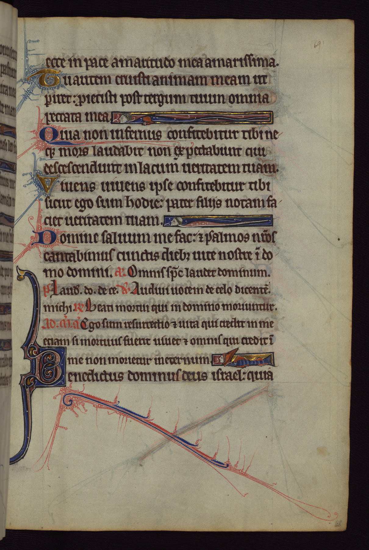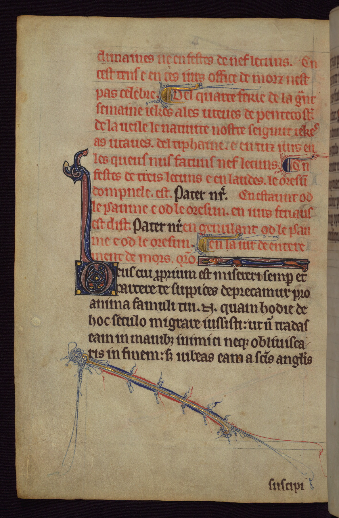 This finely illuminated and iconographically rich book of hours was made in England at the end of the thirteenth century. The manuscript is incomplete and misbound. Its main artist can also be found at work in a Bible (Oxford, Bodleian Library Ms. Auct. D.3.2) and a psalter (Cambridge, Trinity College Cambridge Ms. O.4.16). The manuscript contains a number of unusual texts, including the Hours of Jesus Crucified and the Office of St. Catherine. The patron of the manuscript is not clear; a woman is depicted as praying in many of the initials, but rubrics in the Office of the Dead mention "freres" (brothers). The imagery is inventive, and the Hours of Christ Crucified are graced with images depicting the funeral of Reynard the Fox in its margins. In the absence of a calendar, it is not possible to locate the origin of the manuscript precisely.