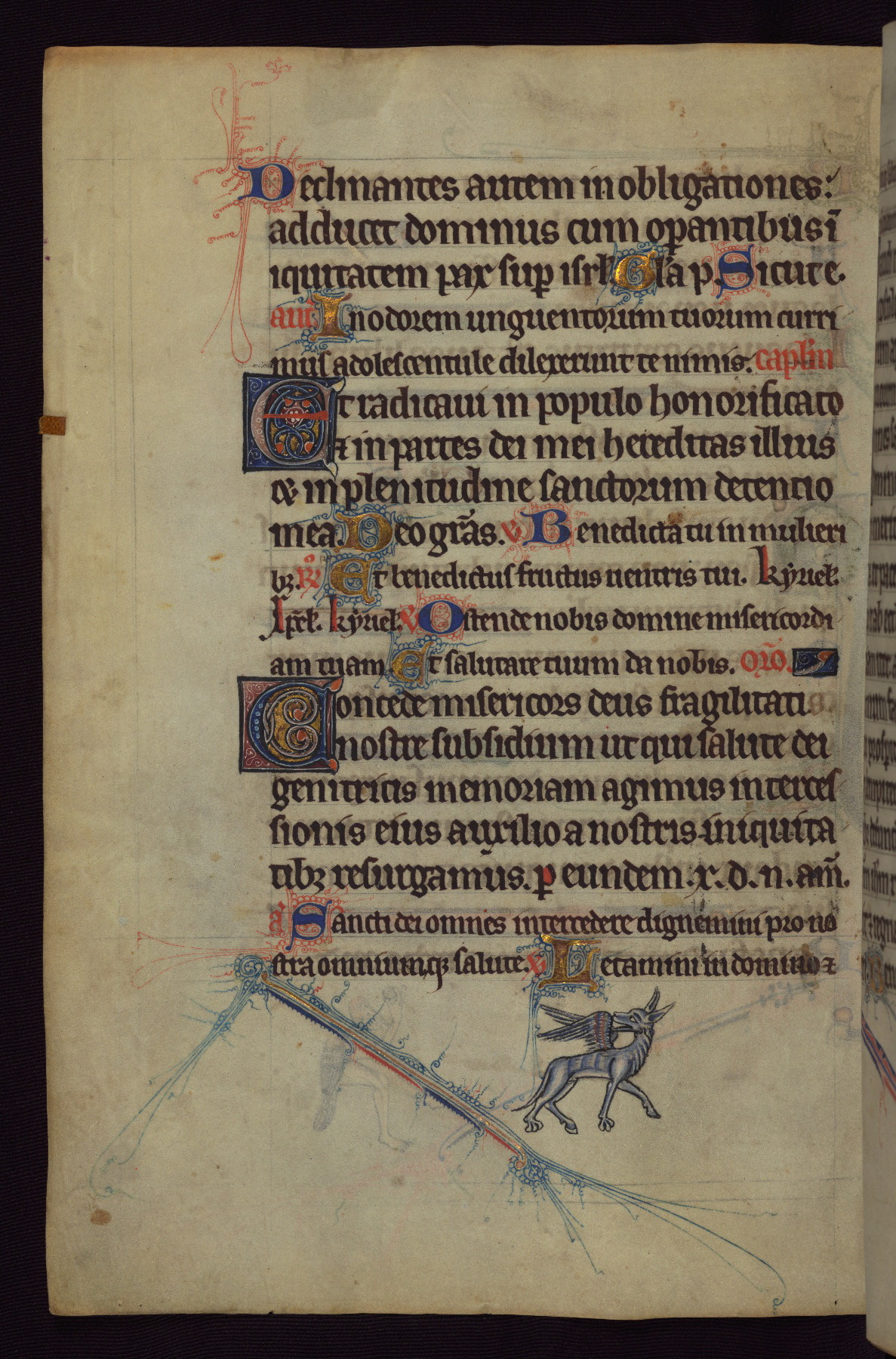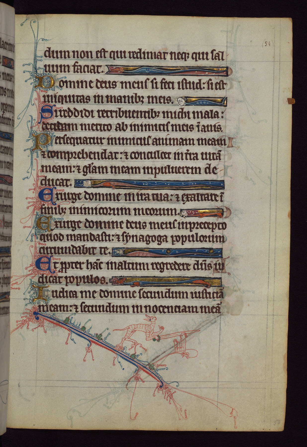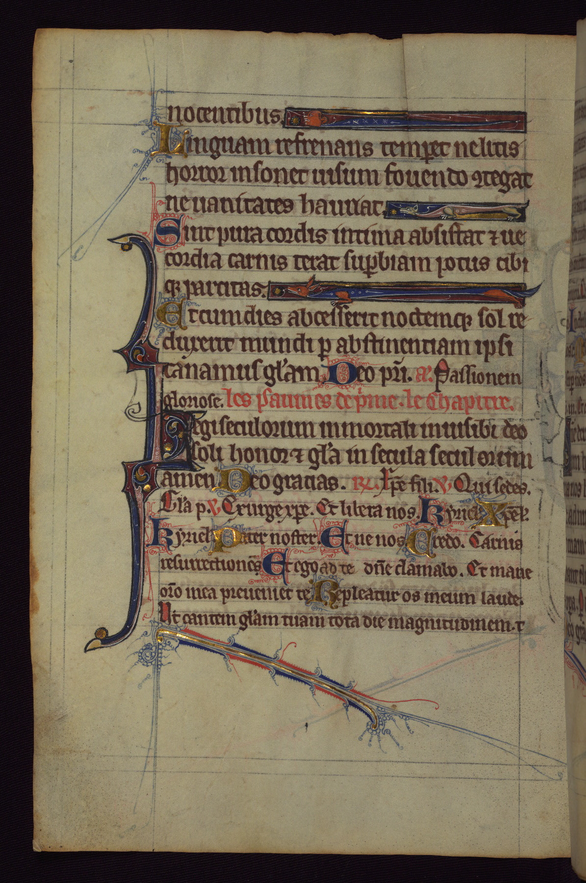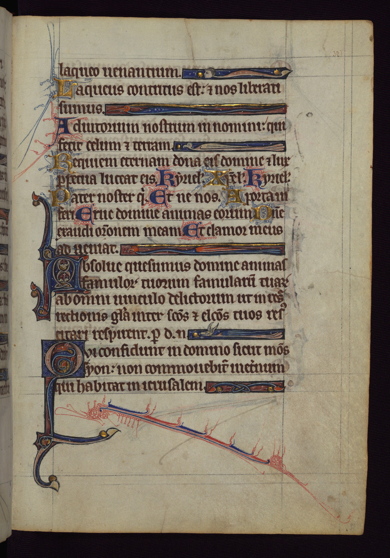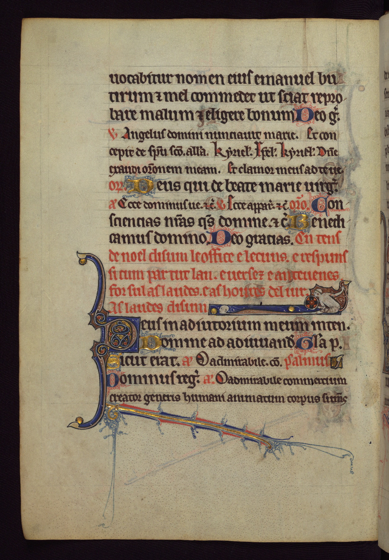 This finely illuminated and iconographically rich book of hours was made in England at the end of the thirteenth century. The manuscript is incomplete and misbound. Its main artist can also be found at work in a Bible (Oxford, Bodleian Library Ms. Auct. D.3.2) and a psalter (Cambridge, Trinity College Cambridge Ms. O.4.16). The manuscript contains a number of unusual texts, including the Hours of Jesus Crucified and the Office of St. Catherine. The patron of the manuscript is not clear; a woman is depicted as praying in many of the initials, but rubrics in the Office of the Dead mention "freres" (brothers). The imagery is inventive, and the Hours of Christ Crucified are graced with images depicting the funeral of Reynard the Fox in its margins. In the absence of a calendar, it is not possible to locate the origin of the manuscript precisely.