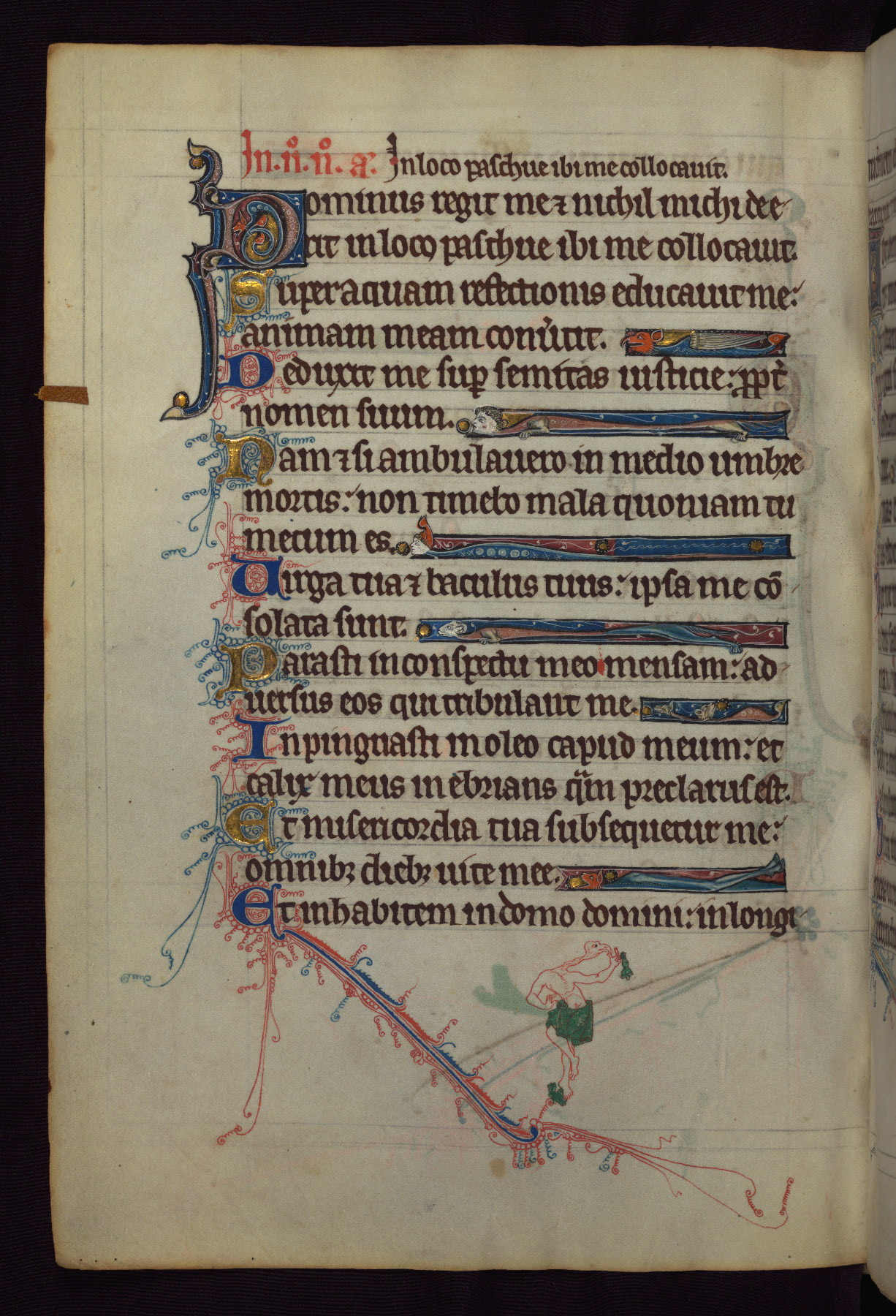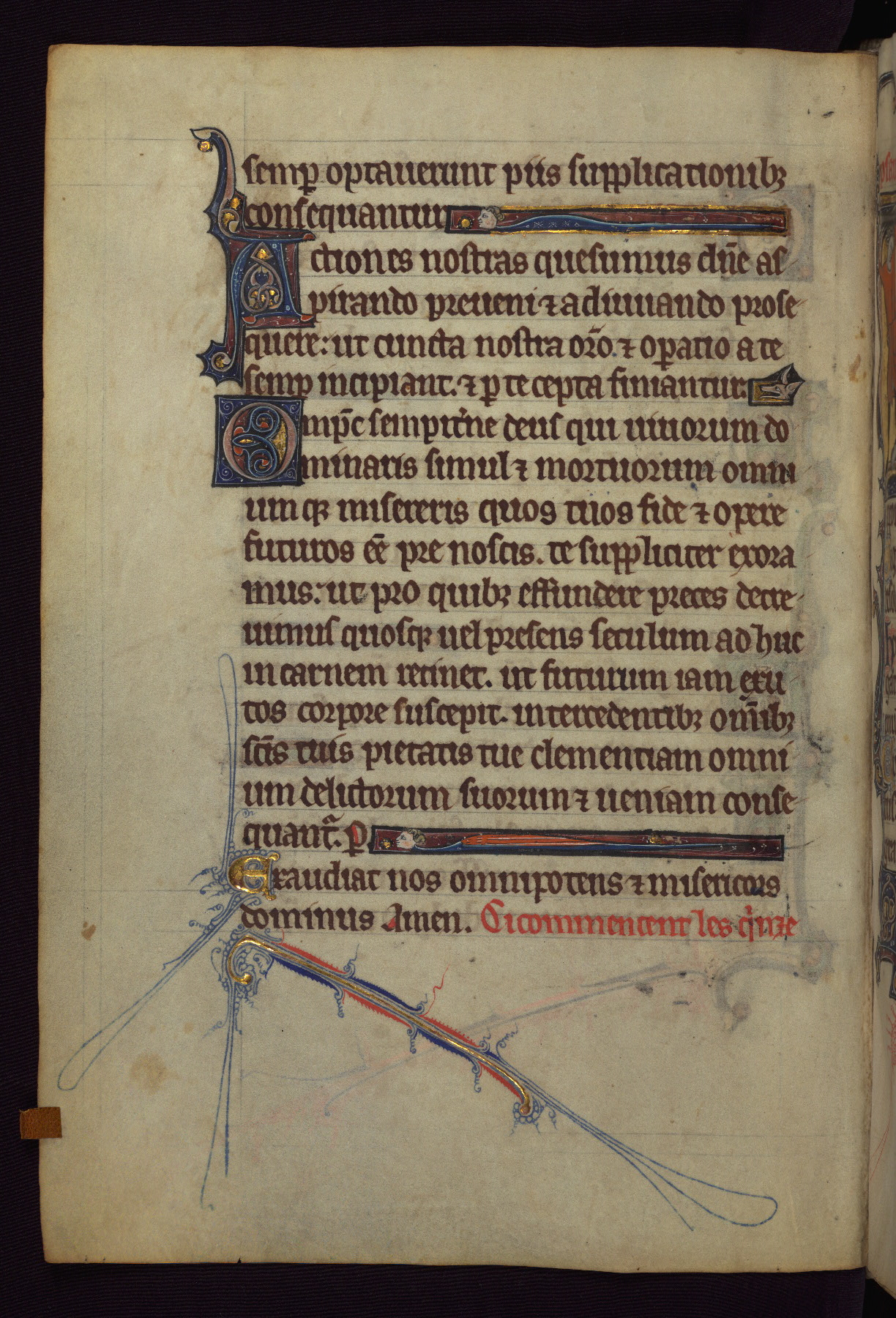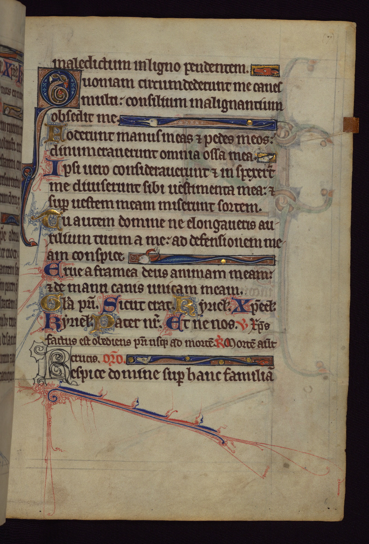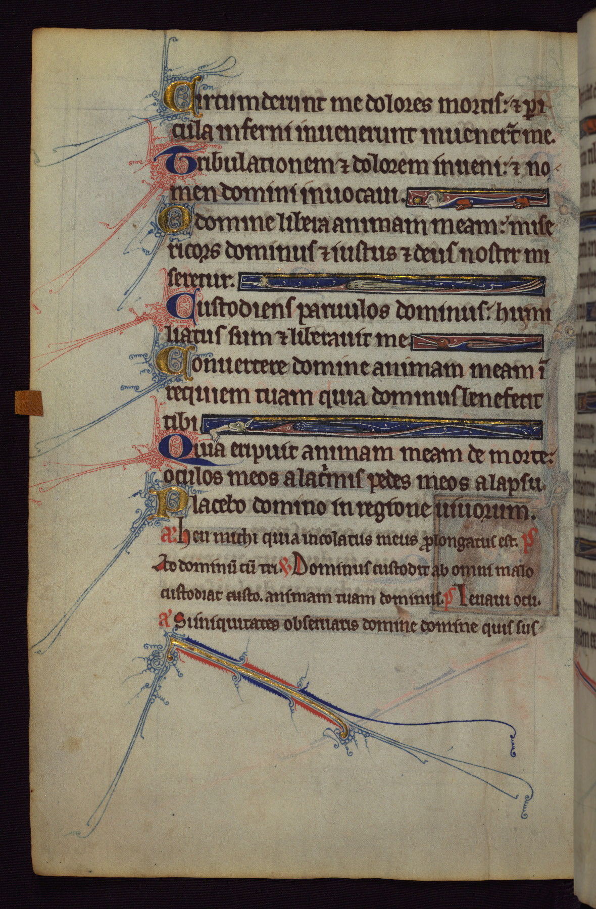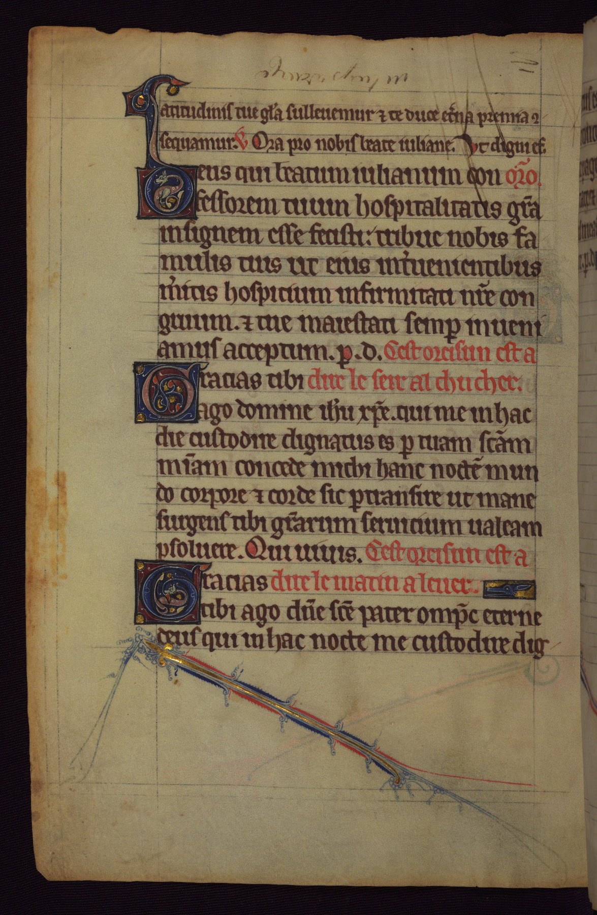 This finely illuminated and iconographically rich book of hours was made in England at the end of the thirteenth century. The manuscript is incomplete and misbound. Its main artist can also be found at work in a Bible (Oxford, Bodleian Library Ms. Auct. D.3.2) and a psalter (Cambridge, Trinity College Cambridge Ms. O.4.16). The manuscript contains a number of unusual texts, including the Hours of Jesus Crucified and the Office of St. Catherine. The patron of the manuscript is not clear; a woman is depicted as praying in many of the initials, but rubrics in the Office of the Dead mention "freres" (brothers). The imagery is inventive, and the Hours of Christ Crucified are graced with images depicting the funeral of Reynard the Fox in its margins. In the absence of a calendar, it is not possible to locate the origin of the manuscript precisely.