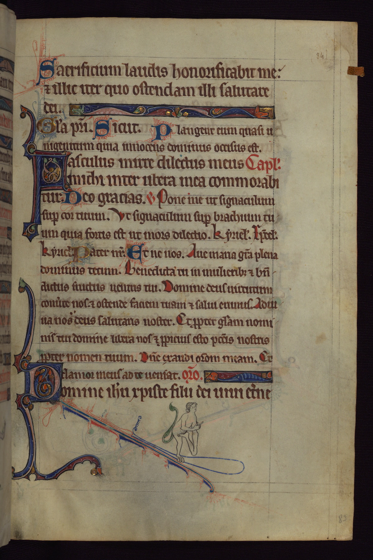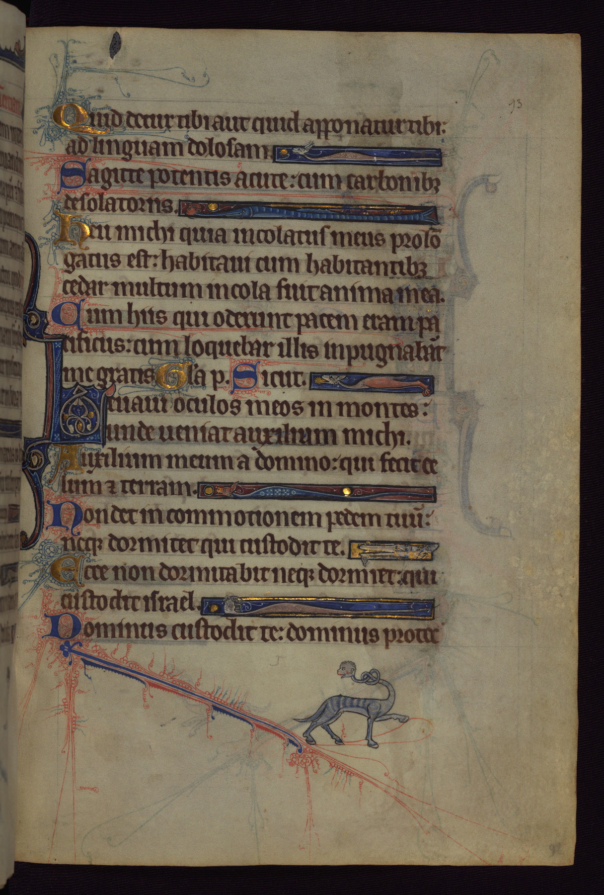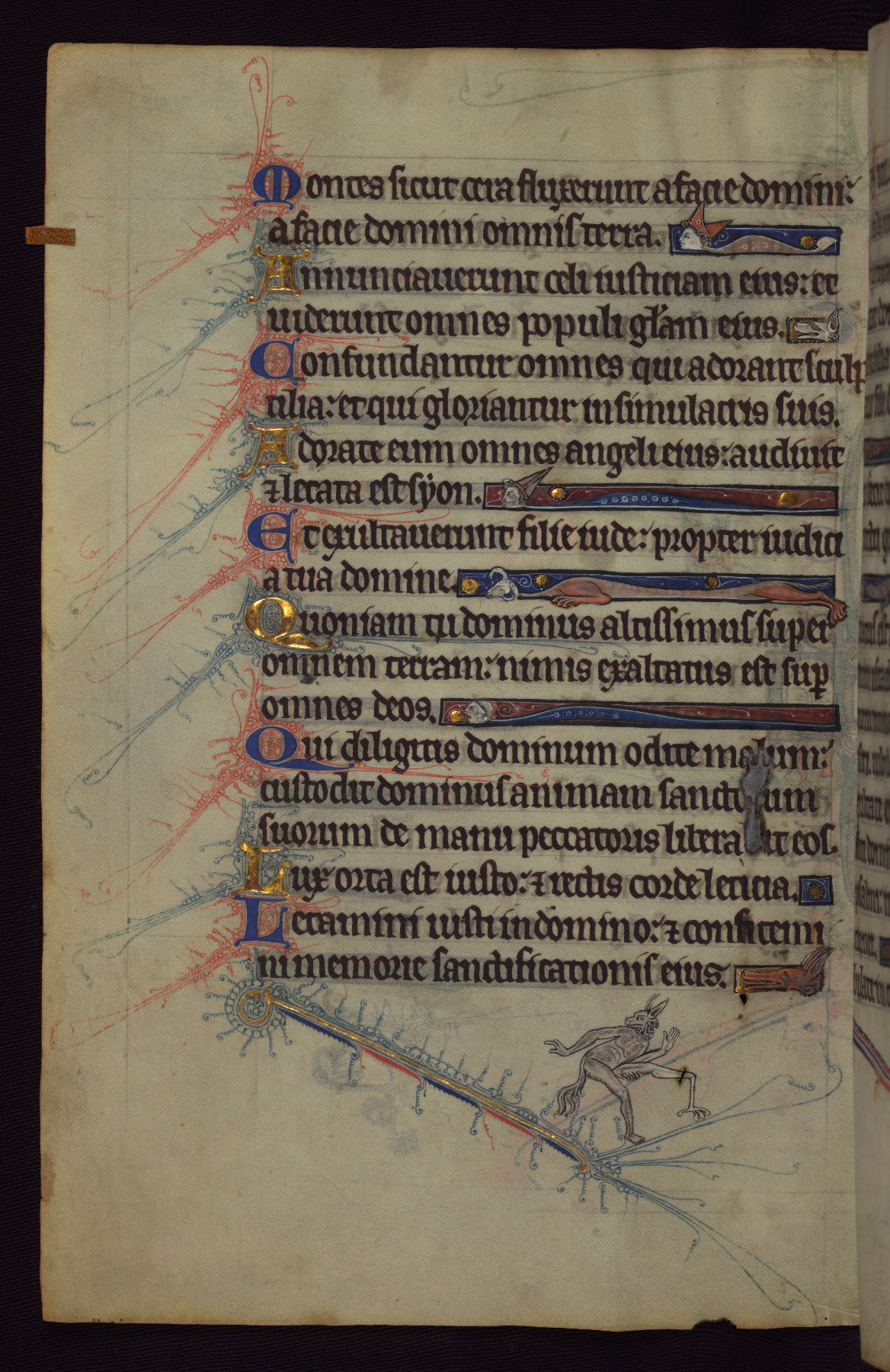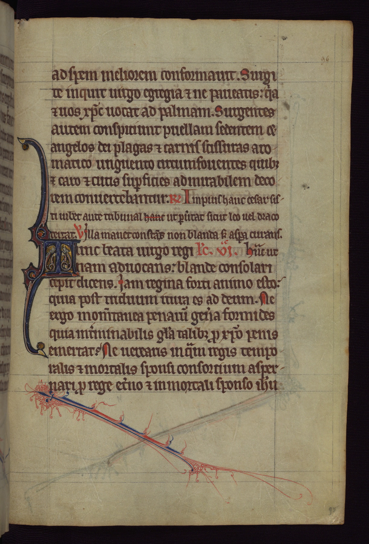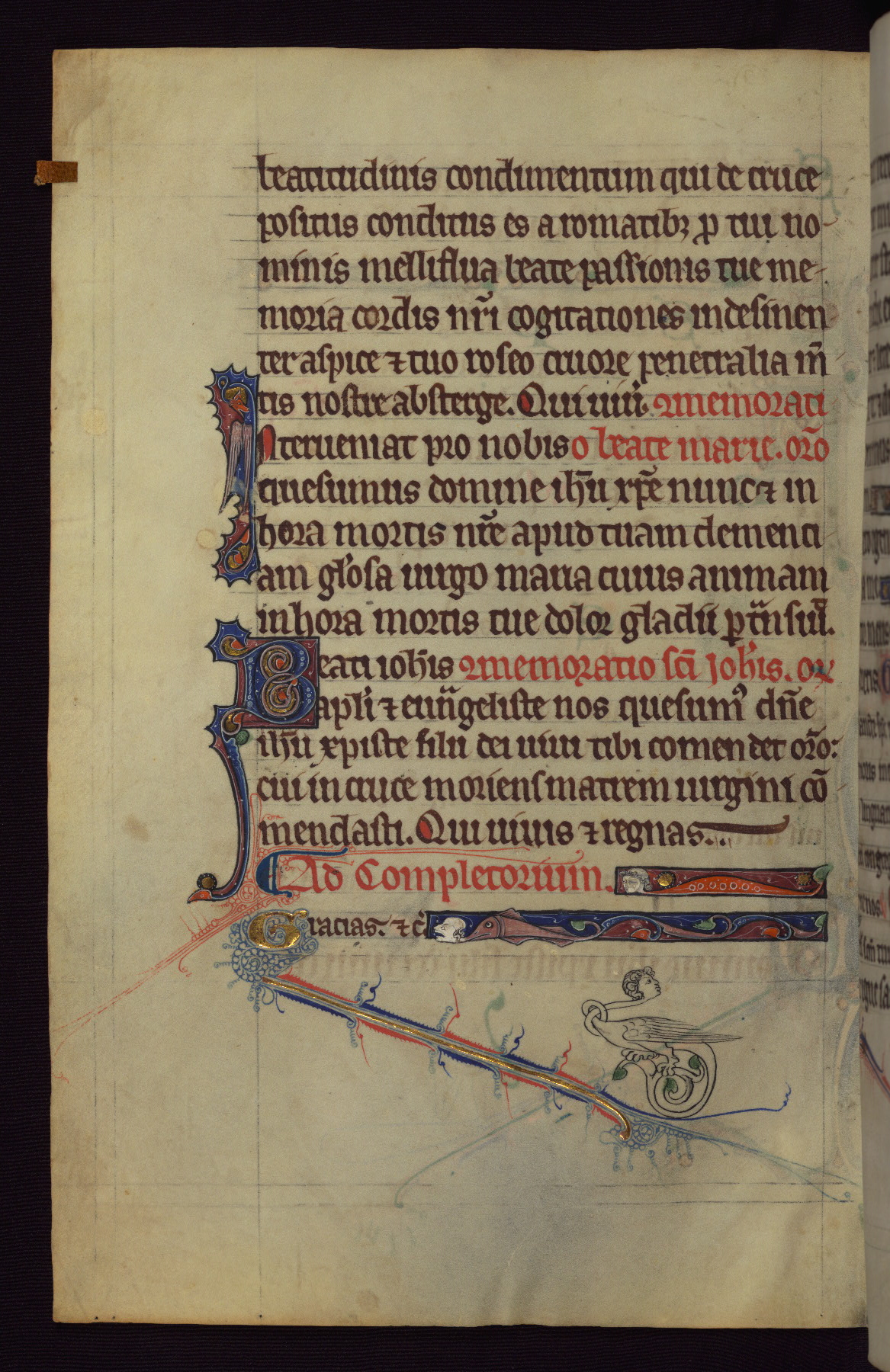 This finely illuminated and iconographically rich book of hours was made in England at the end of the thirteenth century. The manuscript is incomplete and misbound. Its main artist can also be found at work in a Bible (Oxford, Bodleian Library Ms. Auct. D.3.2) and a psalter (Cambridge, Trinity College Cambridge Ms. O.4.16). The manuscript contains a number of unusual texts, including the Hours of Jesus Crucified and the Office of St. Catherine. The patron of the manuscript is not clear; a woman is depicted as praying in many of the initials, but rubrics in the Office of the Dead mention "freres" (brothers). The imagery is inventive, and the Hours of Christ Crucified are graced with images depicting the funeral of Reynard the Fox in its margins. In the absence of a calendar, it is not possible to locate the origin of the manuscript precisely.