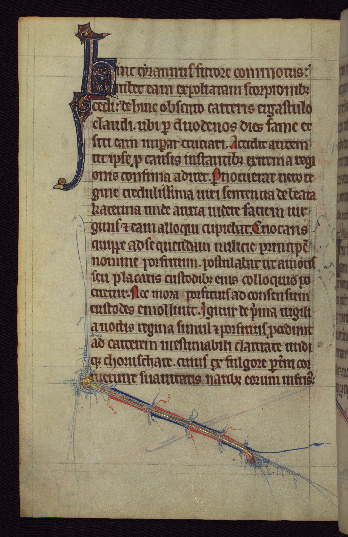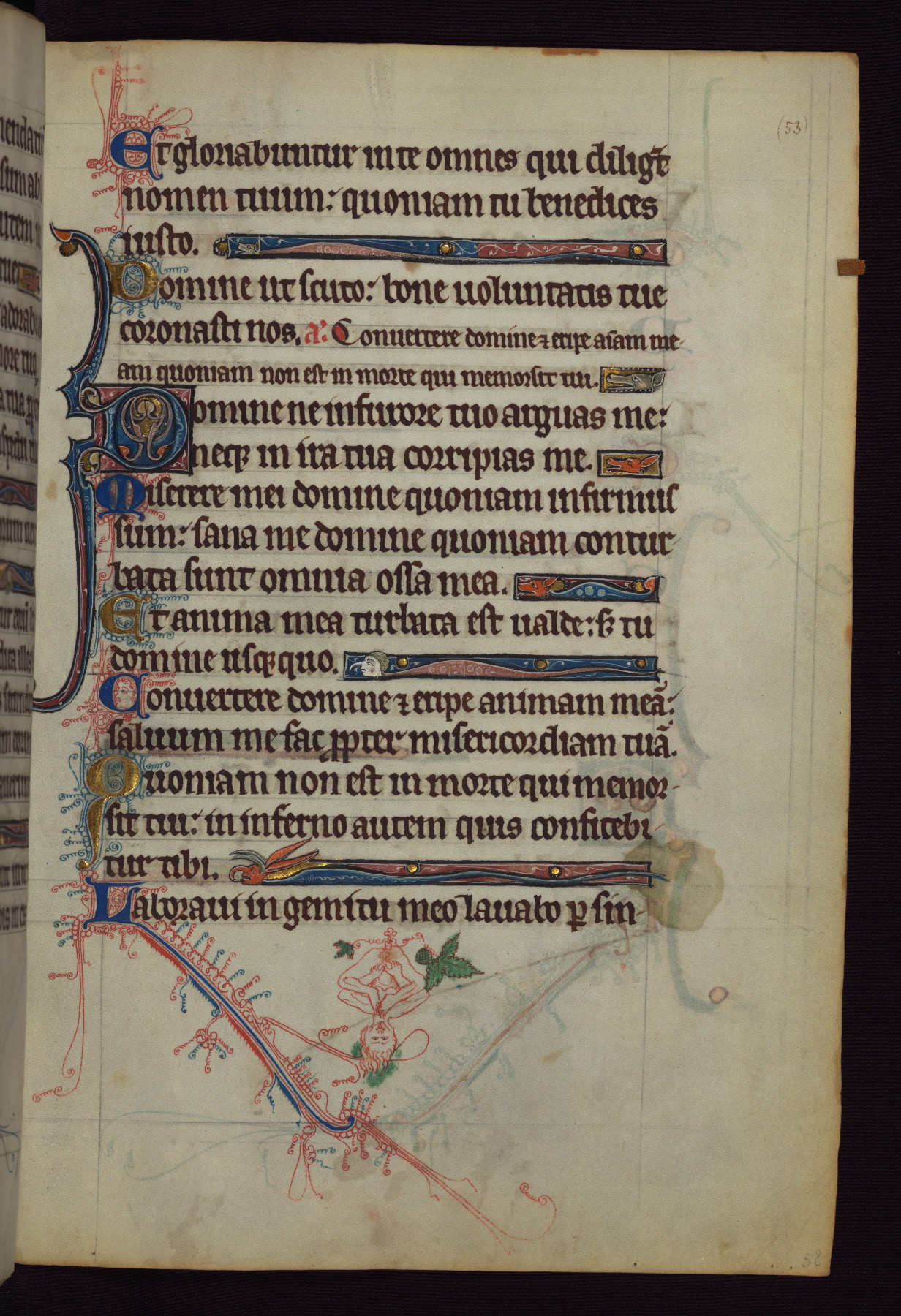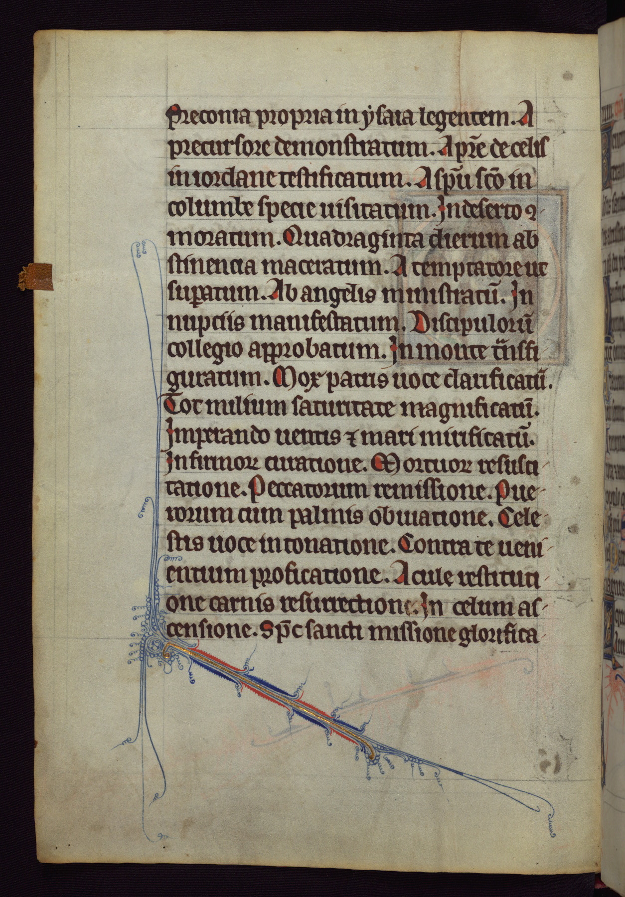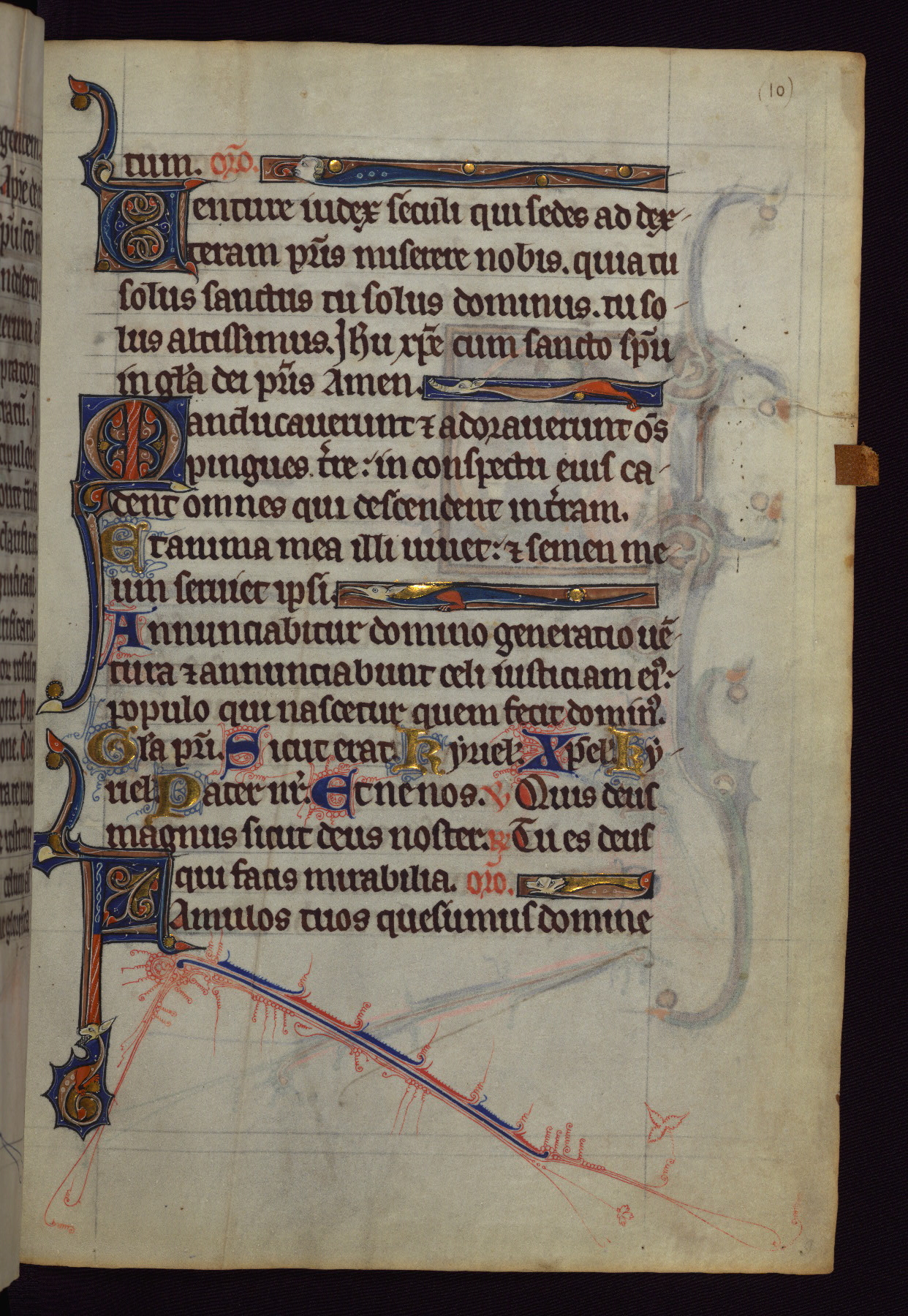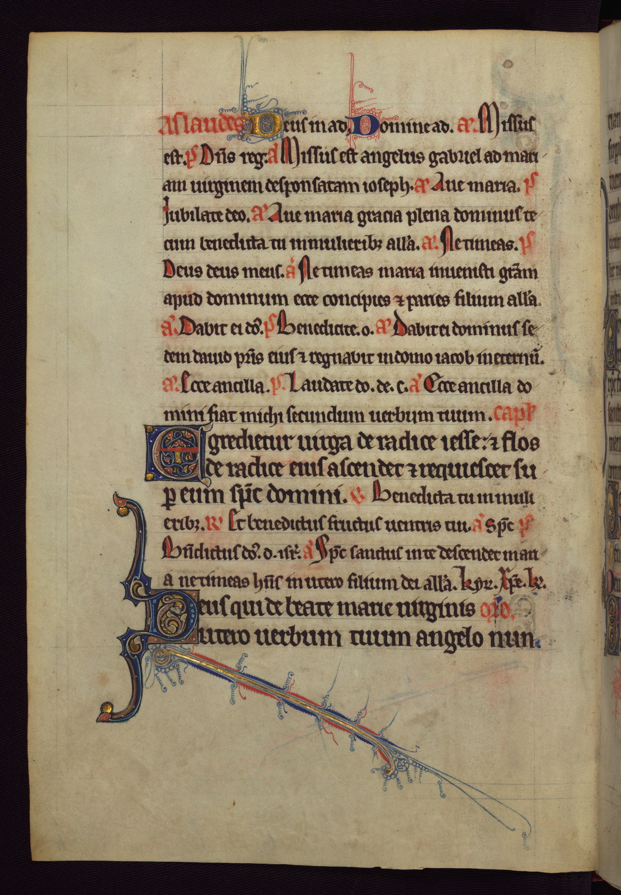 This finely illuminated and iconographically rich book of hours was made in England at the end of the thirteenth century. The manuscript is incomplete and misbound. Its main artist can also be found at work in a Bible (Oxford, Bodleian Library Ms. Auct. D.3.2) and a psalter (Cambridge, Trinity College Cambridge Ms. O.4.16). The manuscript contains a number of unusual texts, including the Hours of Jesus Crucified and the Office of St. Catherine. The patron of the manuscript is not clear; a woman is depicted as praying in many of the initials, but rubrics in the Office of the Dead mention "freres" (brothers). The imagery is inventive, and the Hours of Christ Crucified are graced with images depicting the funeral of Reynard the Fox in its margins. In the absence of a calendar, it is not possible to locate the origin of the manuscript precisely.