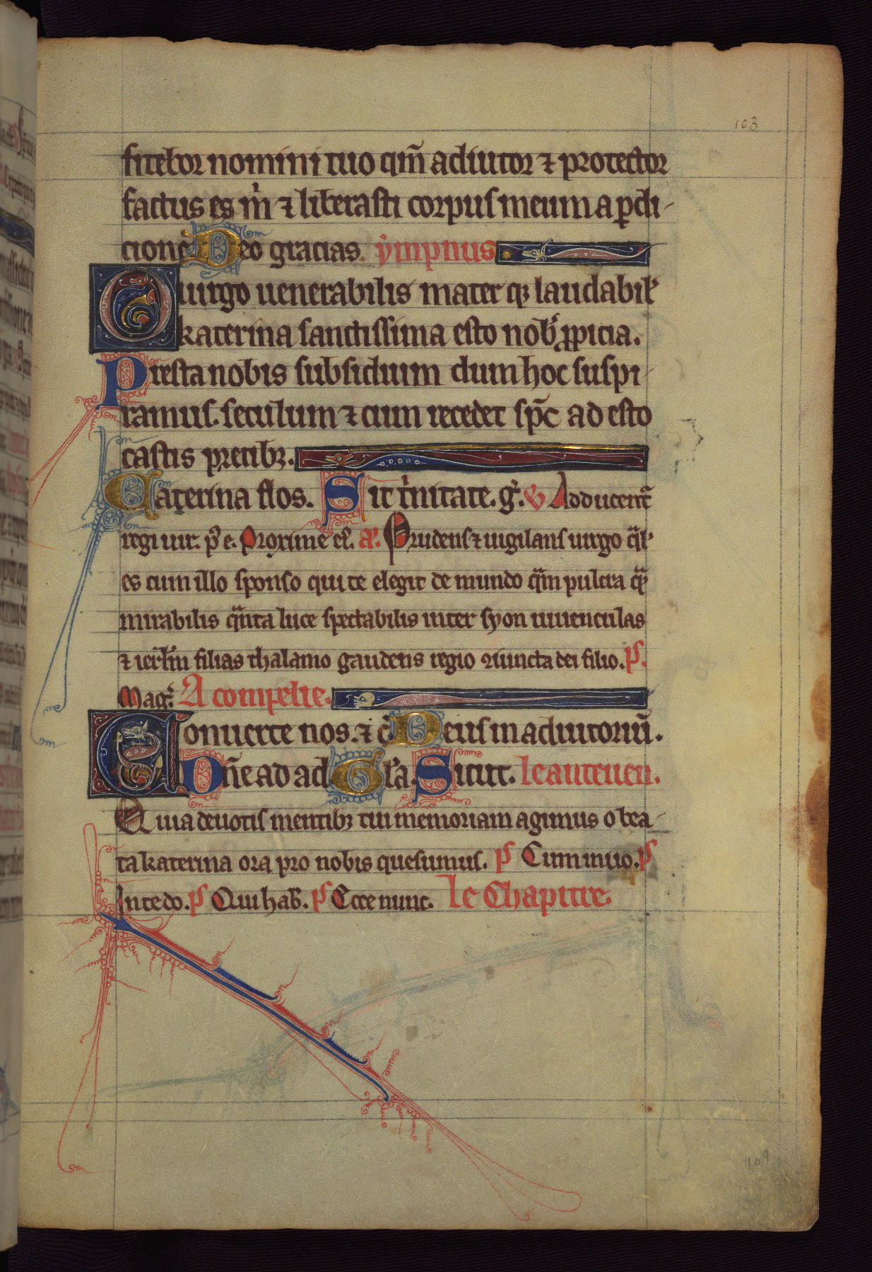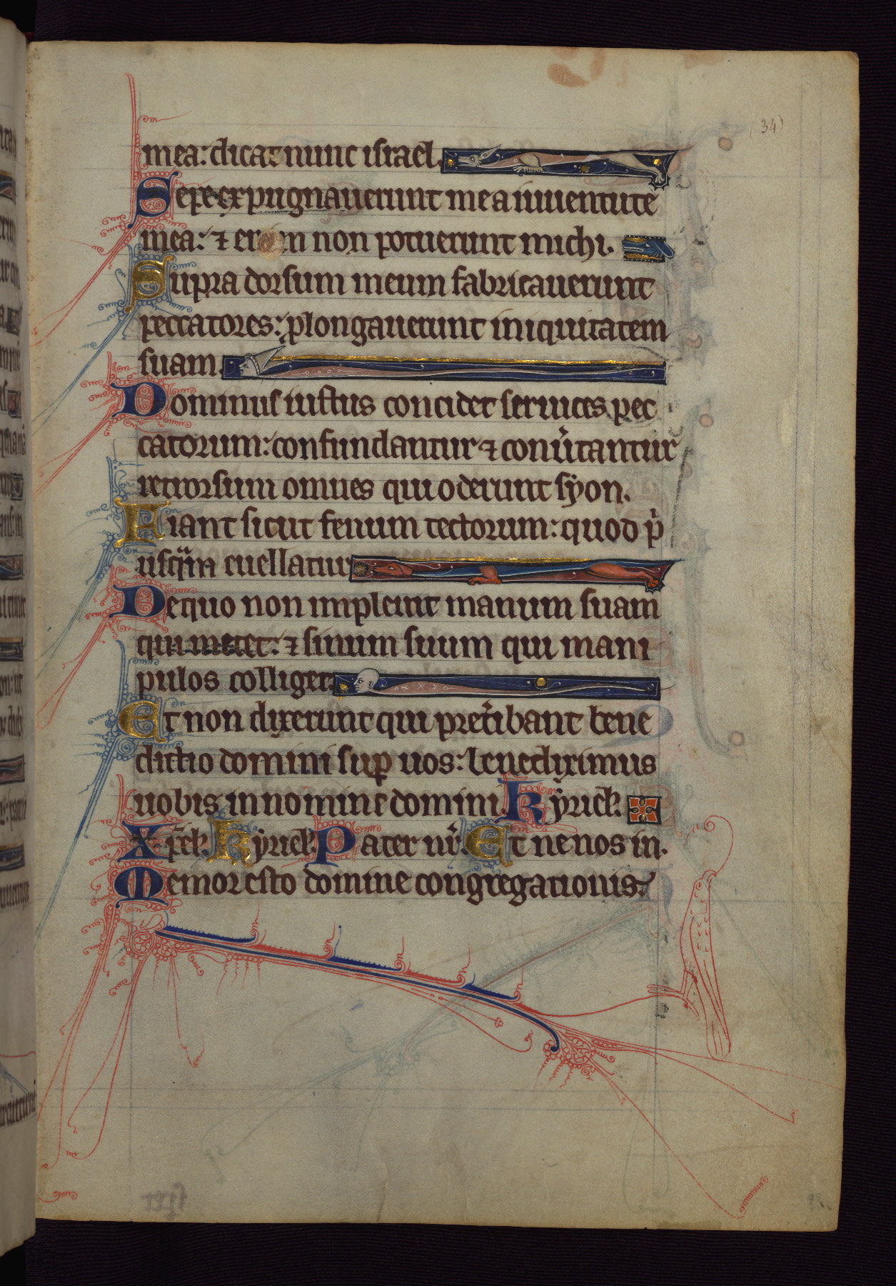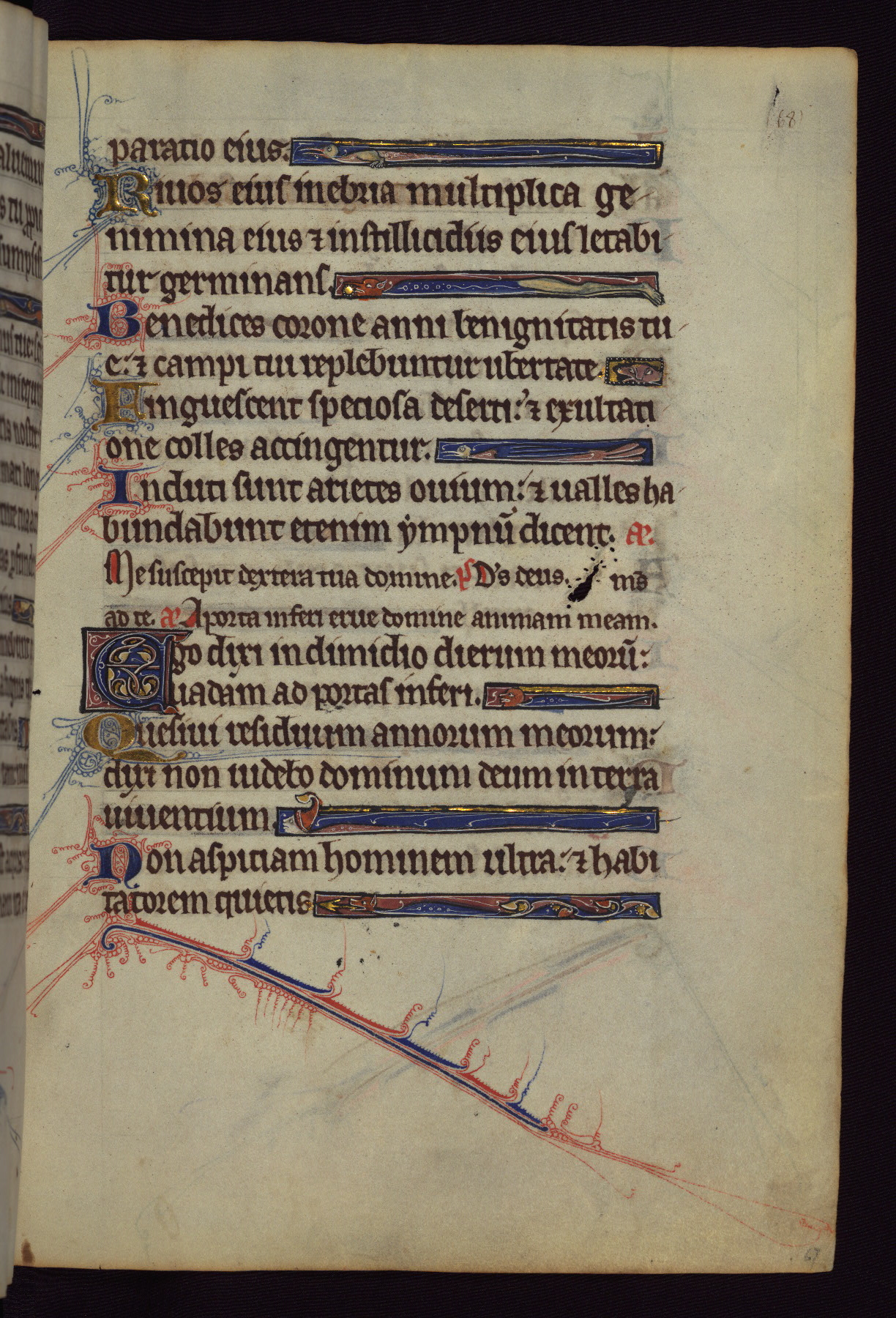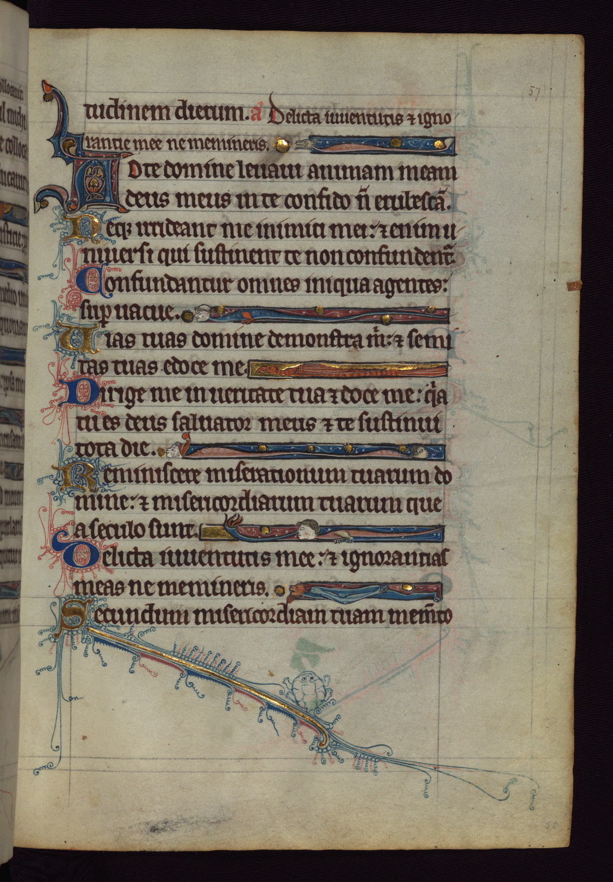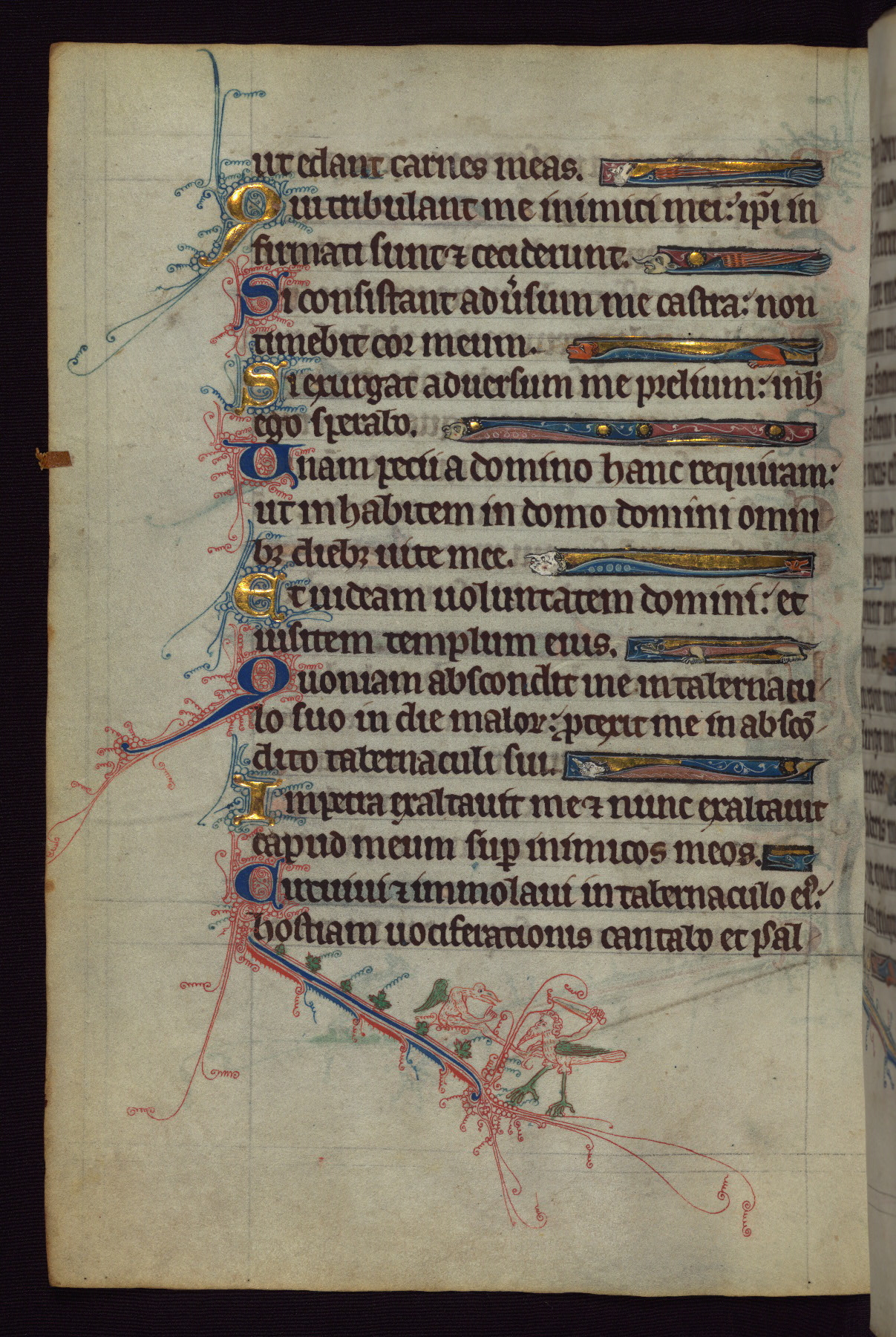 This finely illuminated and iconographically rich book of hours was made in England at the end of the thirteenth century. The manuscript is incomplete and misbound. Its main artist can also be found at work in a Bible (Oxford, Bodleian Library Ms. Auct. D.3.2) and a psalter (Cambridge, Trinity College Cambridge Ms. O.4.16). The manuscript contains a number of unusual texts, including the Hours of Jesus Crucified and the Office of St. Catherine. The patron of the manuscript is not clear; a woman is depicted as praying in many of the initials, but rubrics in the Office of the Dead mention "freres" (brothers). The imagery is inventive, and the Hours of Christ Crucified are graced with images depicting the funeral of Reynard the Fox in its margins. In the absence of a calendar, it is not possible to locate the origin of the manuscript precisely.