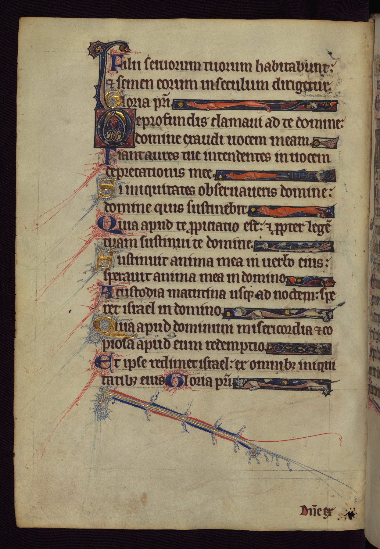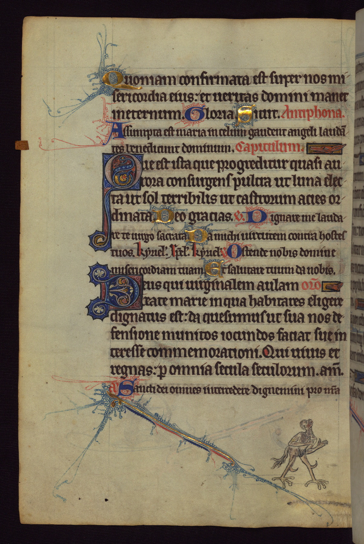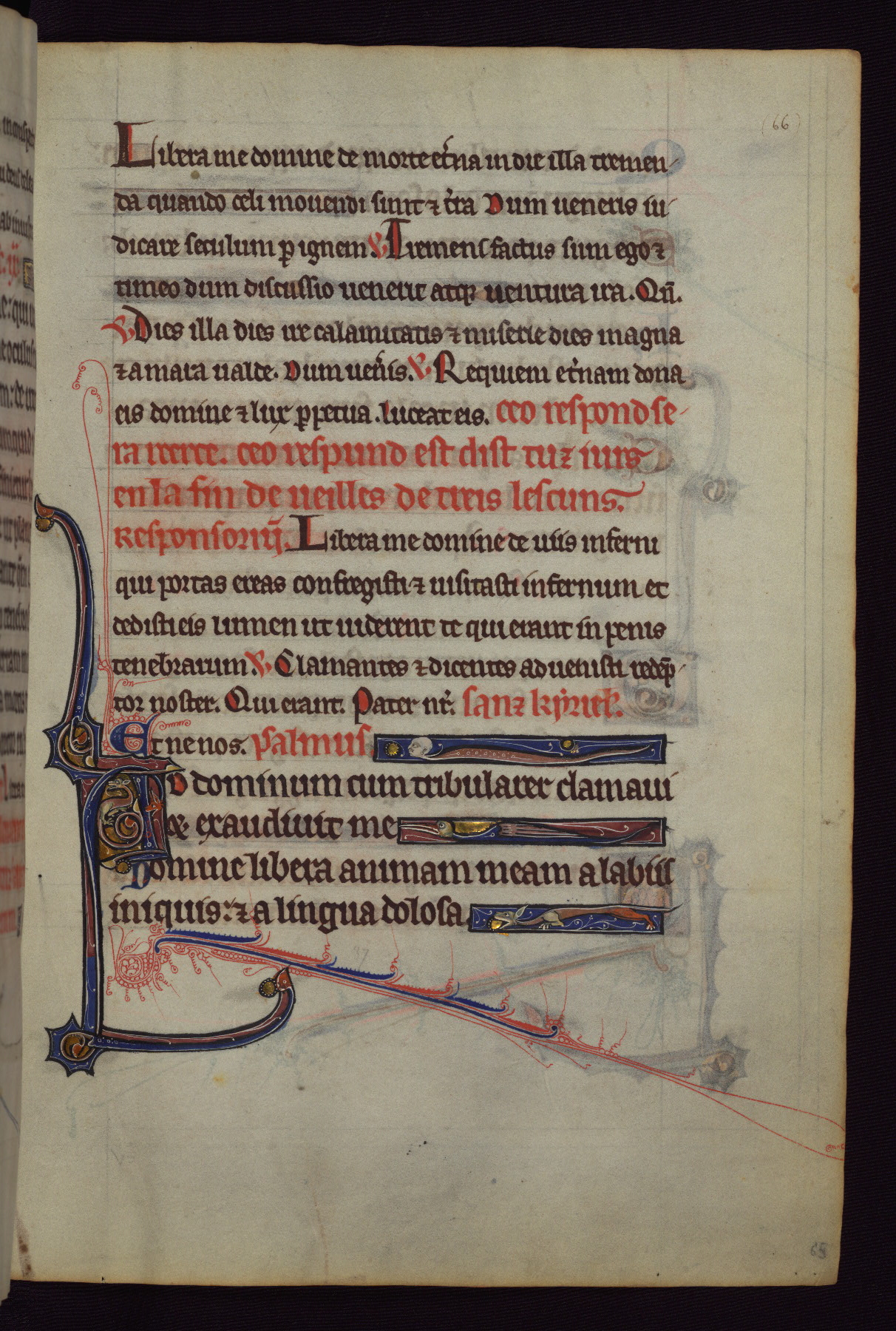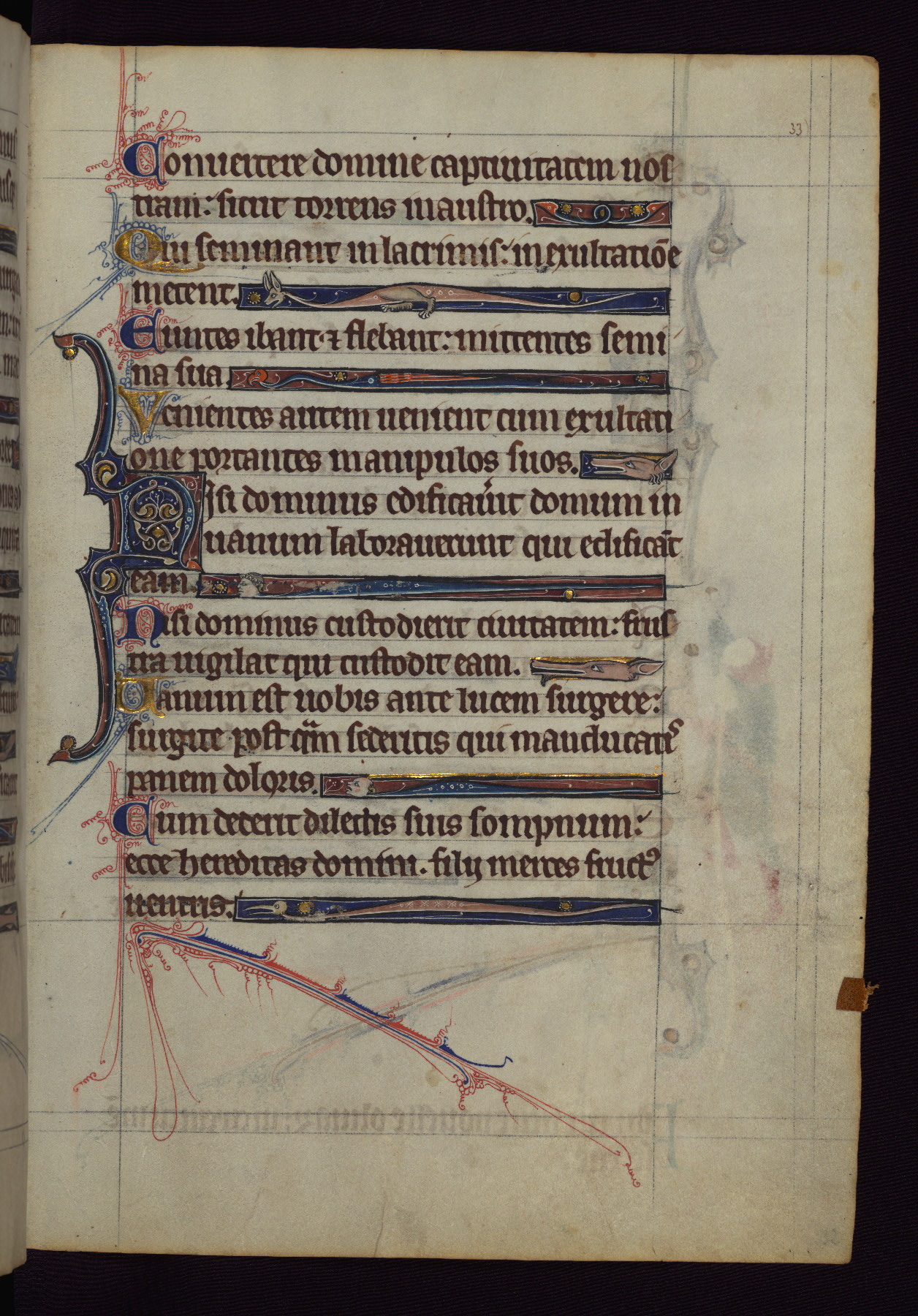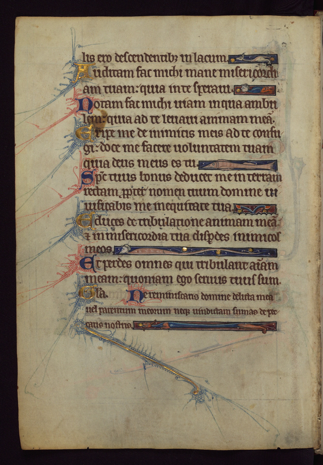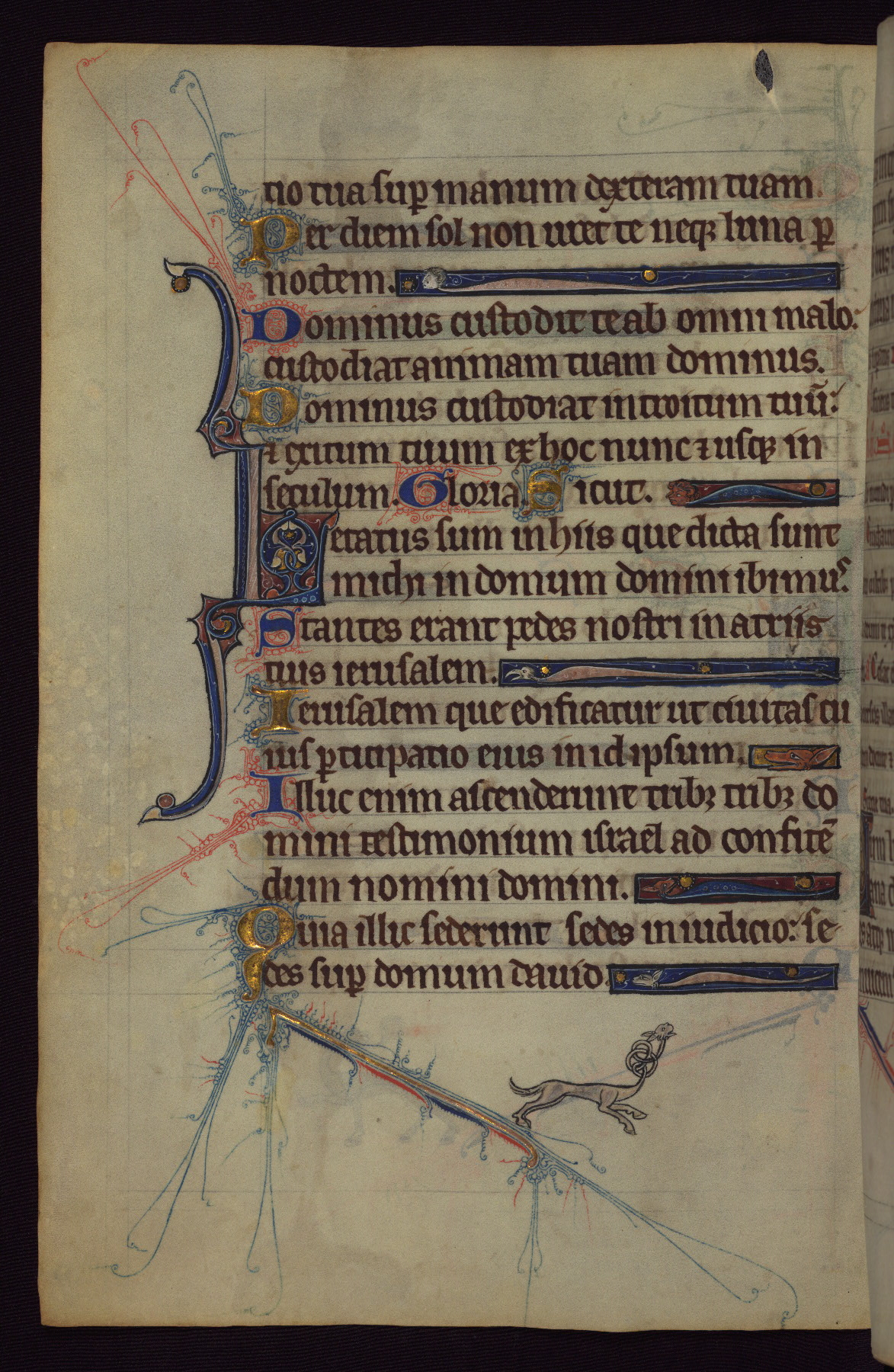 This finely illuminated and iconographically rich book of hours was made in England at the end of the thirteenth century. The manuscript is incomplete and misbound. Its main artist can also be found at work in a Bible (Oxford, Bodleian Library Ms. Auct. D.3.2) and a psalter (Cambridge, Trinity College Cambridge Ms. O.4.16). The manuscript contains a number of unusual texts, including the Hours of Jesus Crucified and the Office of St. Catherine. The patron of the manuscript is not clear; a woman is depicted as praying in many of the initials, but rubrics in the Office of the Dead mention "freres" (brothers). The imagery is inventive, and the Hours of Christ Crucified are graced with images depicting the funeral of Reynard the Fox in its margins. In the absence of a calendar, it is not possible to locate the origin of the manuscript precisely.