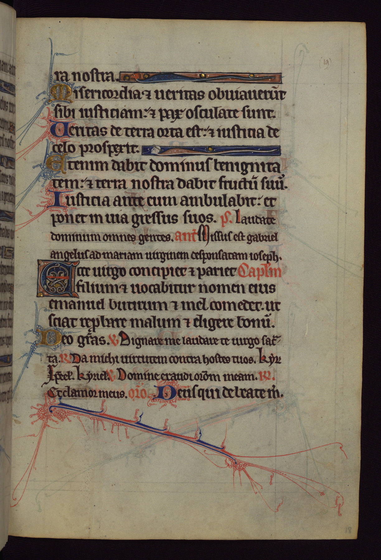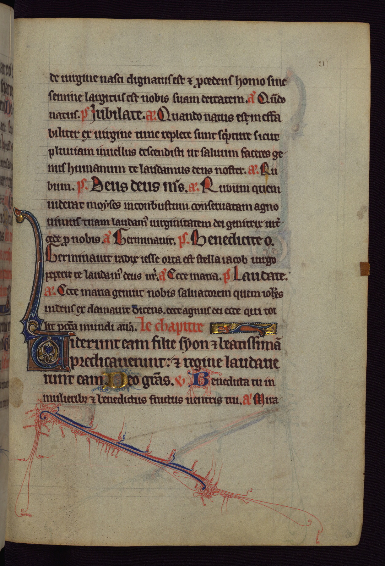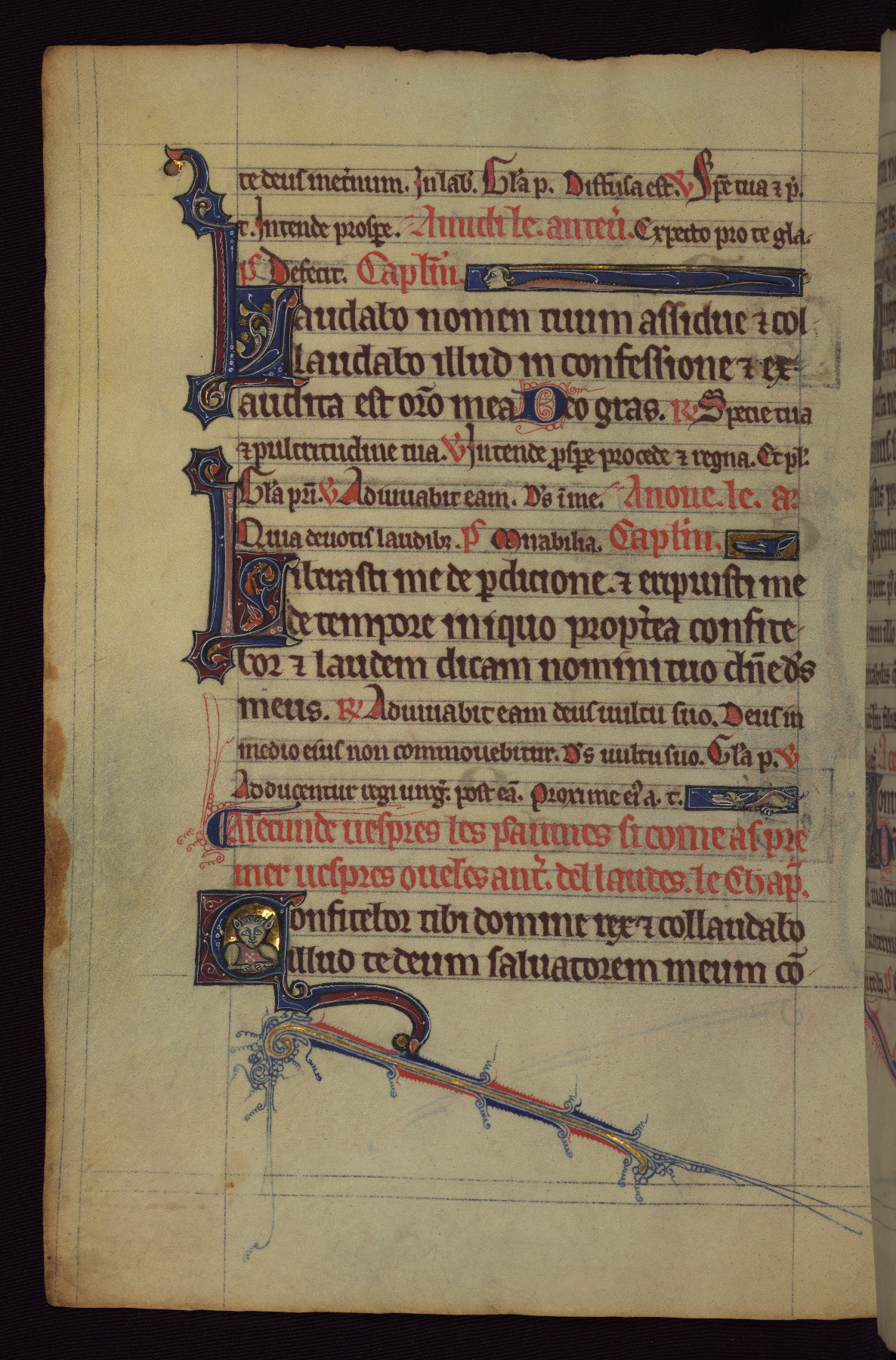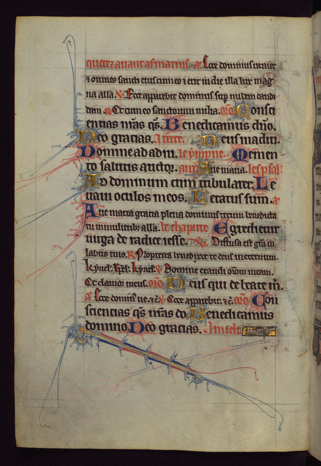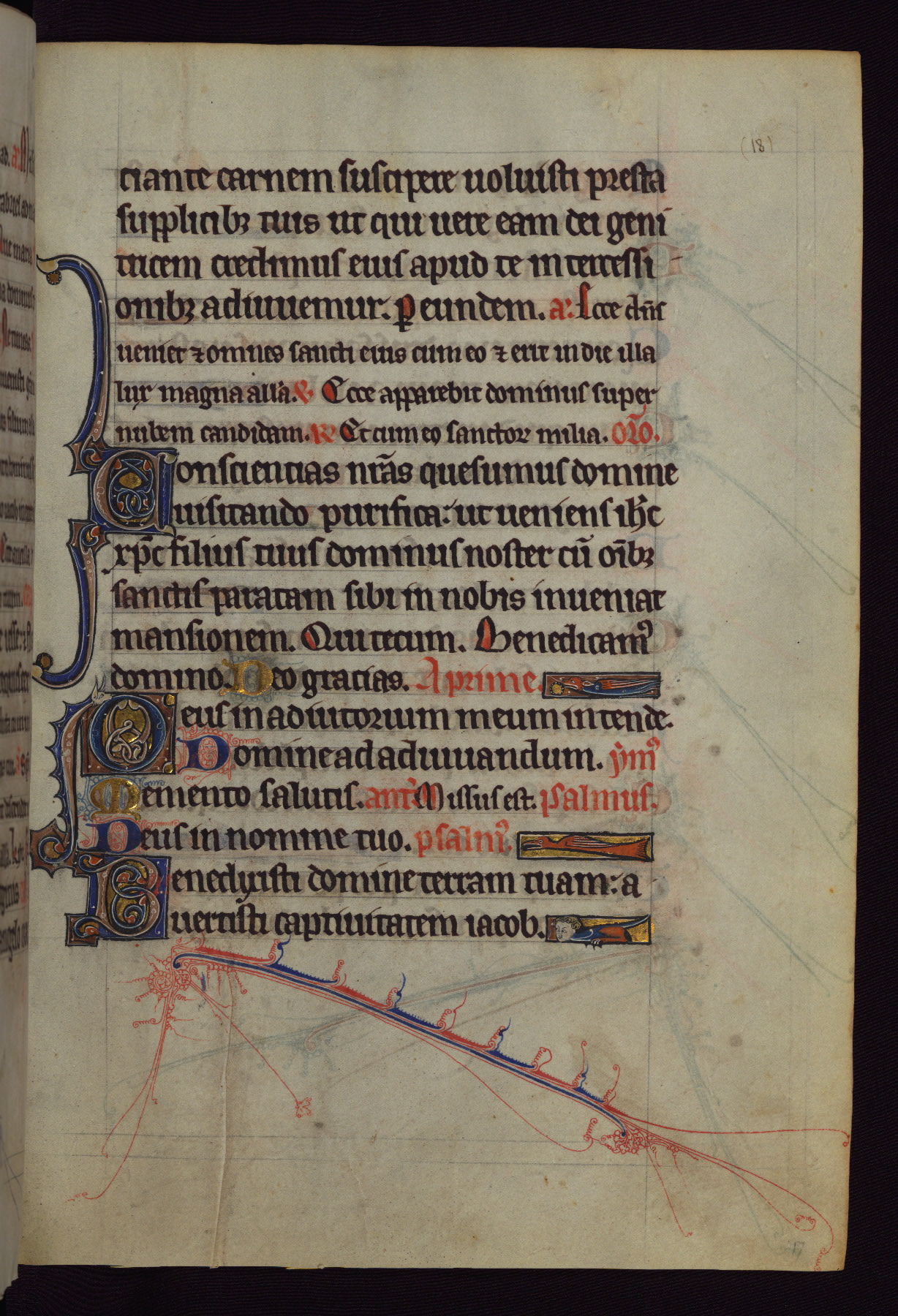 This finely illuminated and iconographically rich book of hours was made in England at the end of the thirteenth century. The manuscript is incomplete and misbound. Its main artist can also be found at work in a Bible (Oxford, Bodleian Library Ms. Auct. D.3.2) and a psalter (Cambridge, Trinity College Cambridge Ms. O.4.16). The manuscript contains a number of unusual texts, including the Hours of Jesus Crucified and the Office of St. Catherine. The patron of the manuscript is not clear; a woman is depicted as praying in many of the initials, but rubrics in the Office of the Dead mention "freres" (brothers). The imagery is inventive, and the Hours of Christ Crucified are graced with images depicting the funeral of Reynard the Fox in its margins. In the absence of a calendar, it is not possible to locate the origin of the manuscript precisely.