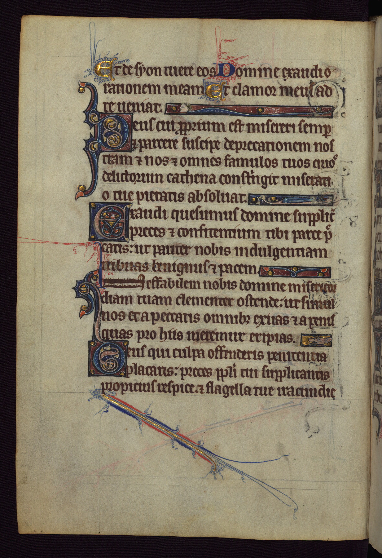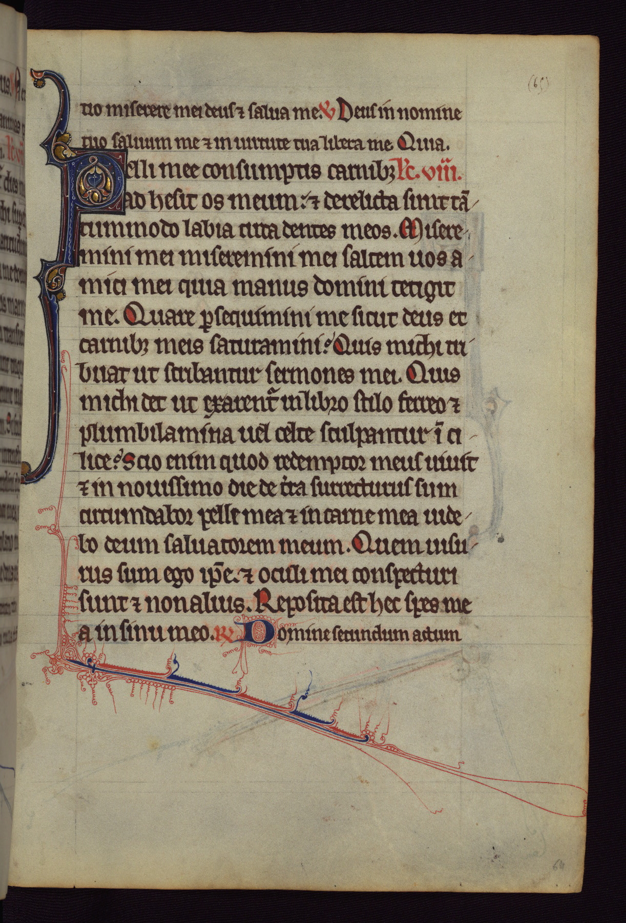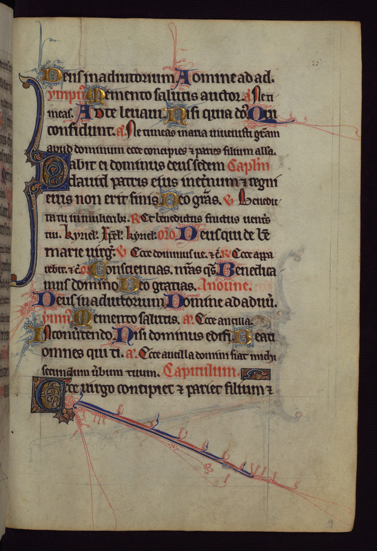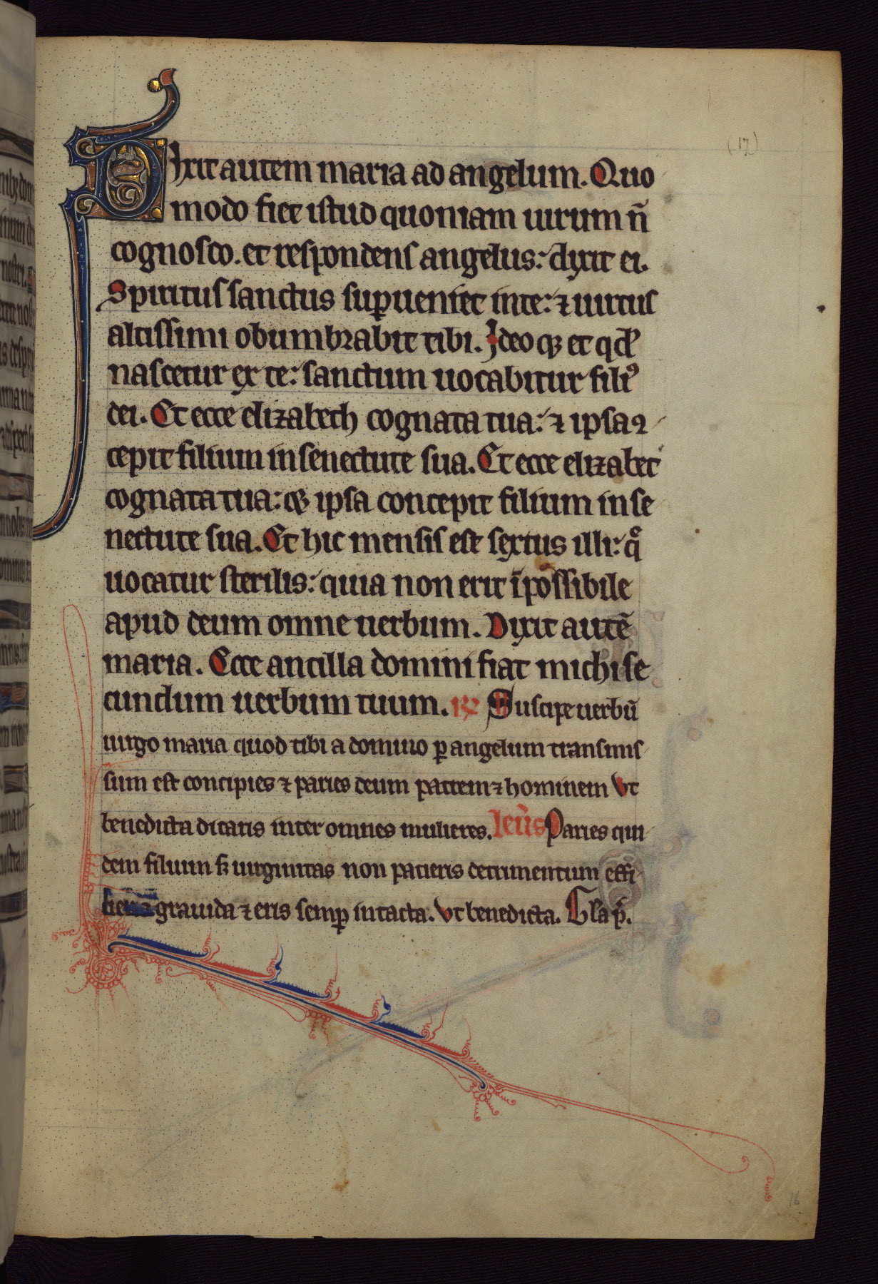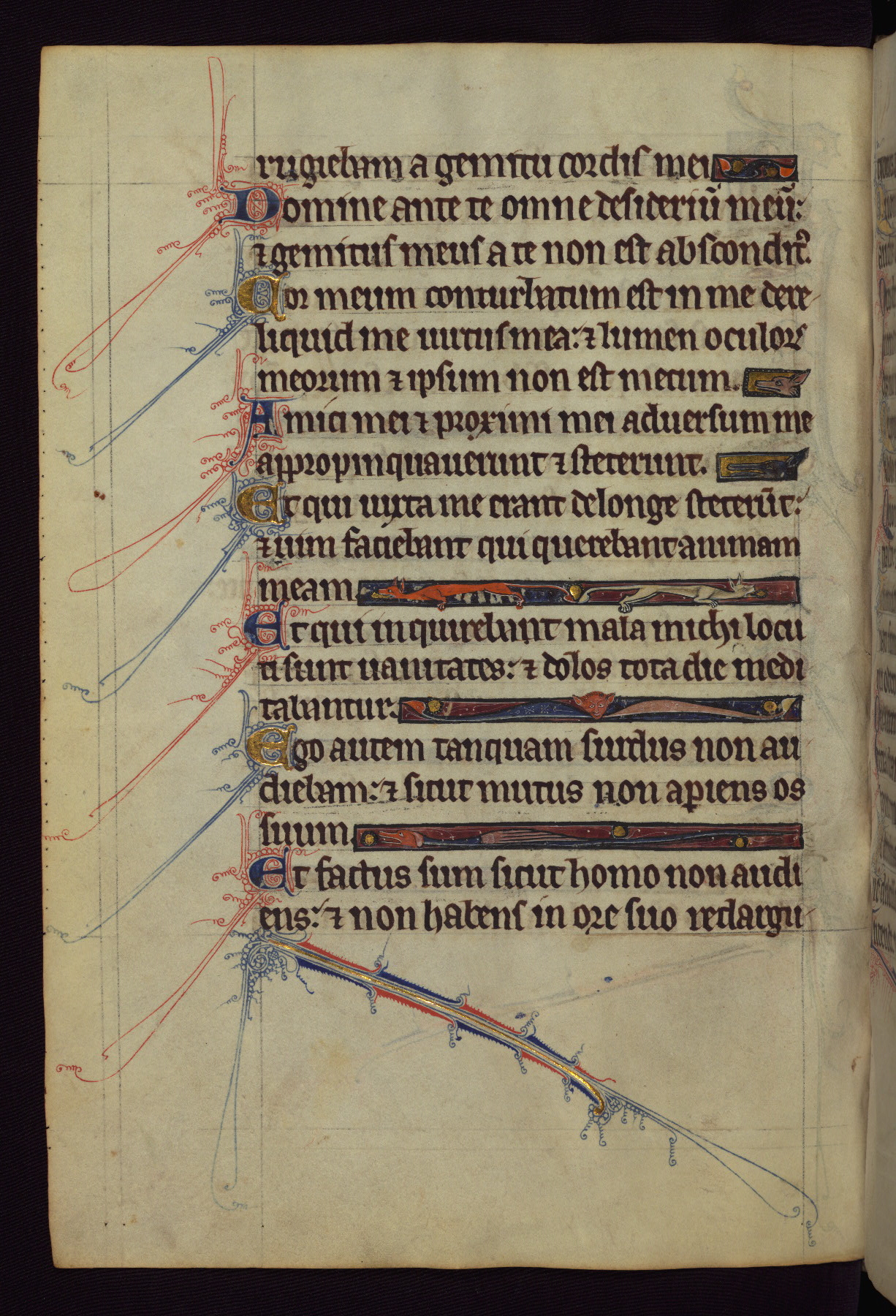 This finely illuminated and iconographically rich book of hours was made in England at the end of the thirteenth century. The manuscript is incomplete and misbound. Its main artist can also be found at work in a Bible (Oxford, Bodleian Library Ms. Auct. D.3.2) and a psalter (Cambridge, Trinity College Cambridge Ms. O.4.16). The manuscript contains a number of unusual texts, including the Hours of Jesus Crucified and the Office of St. Catherine. The patron of the manuscript is not clear; a woman is depicted as praying in many of the initials, but rubrics in the Office of the Dead mention "freres" (brothers). The imagery is inventive, and the Hours of Christ Crucified are graced with images depicting the funeral of Reynard the Fox in its margins. In the absence of a calendar, it is not possible to locate the origin of the manuscript precisely.