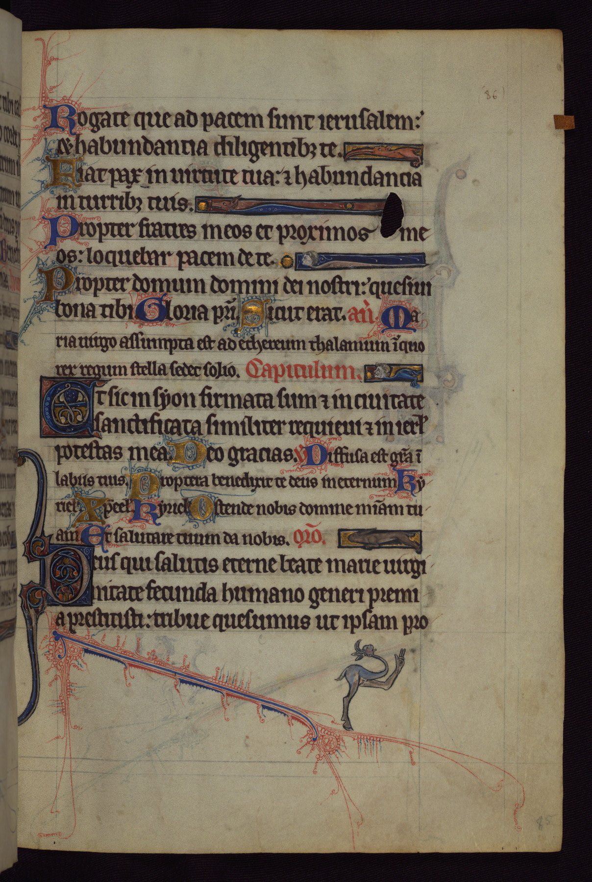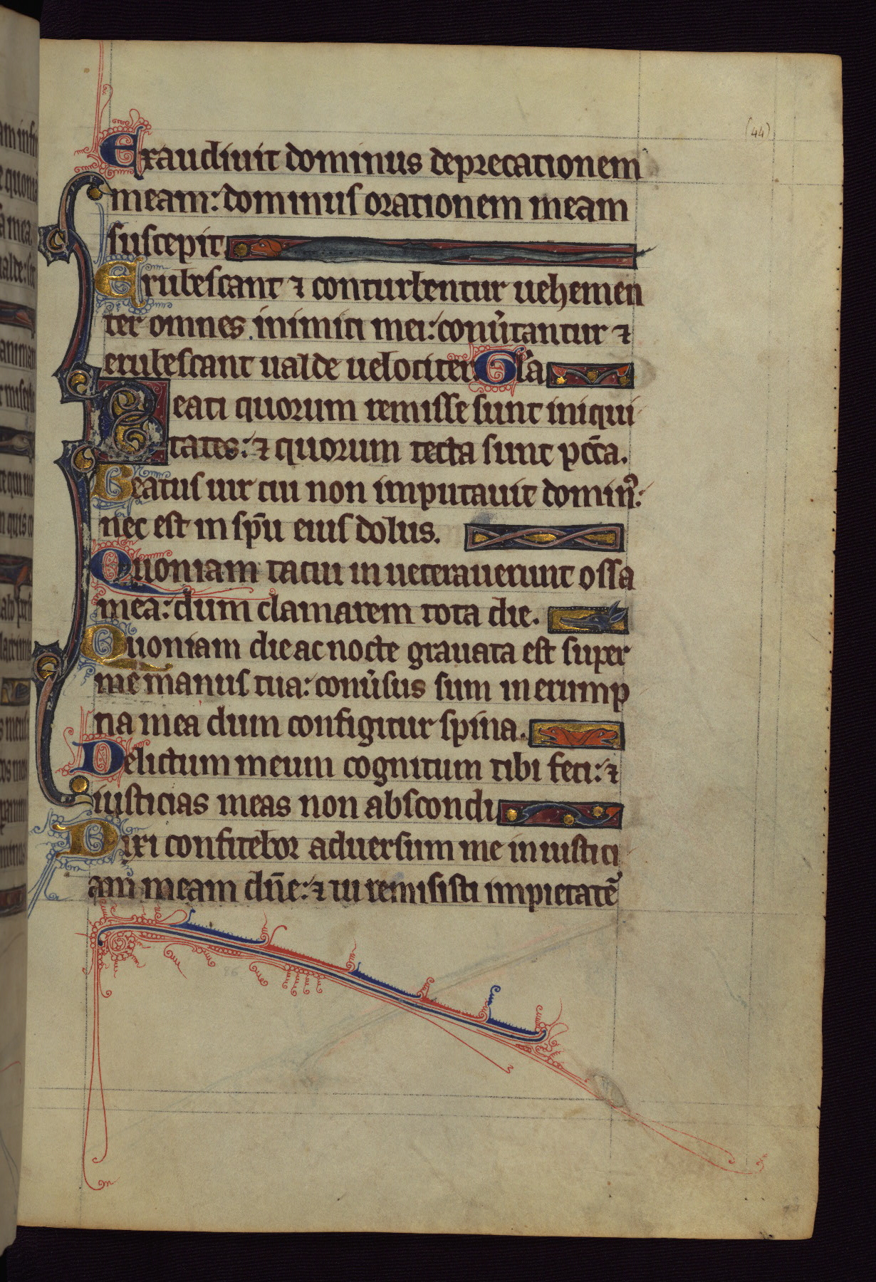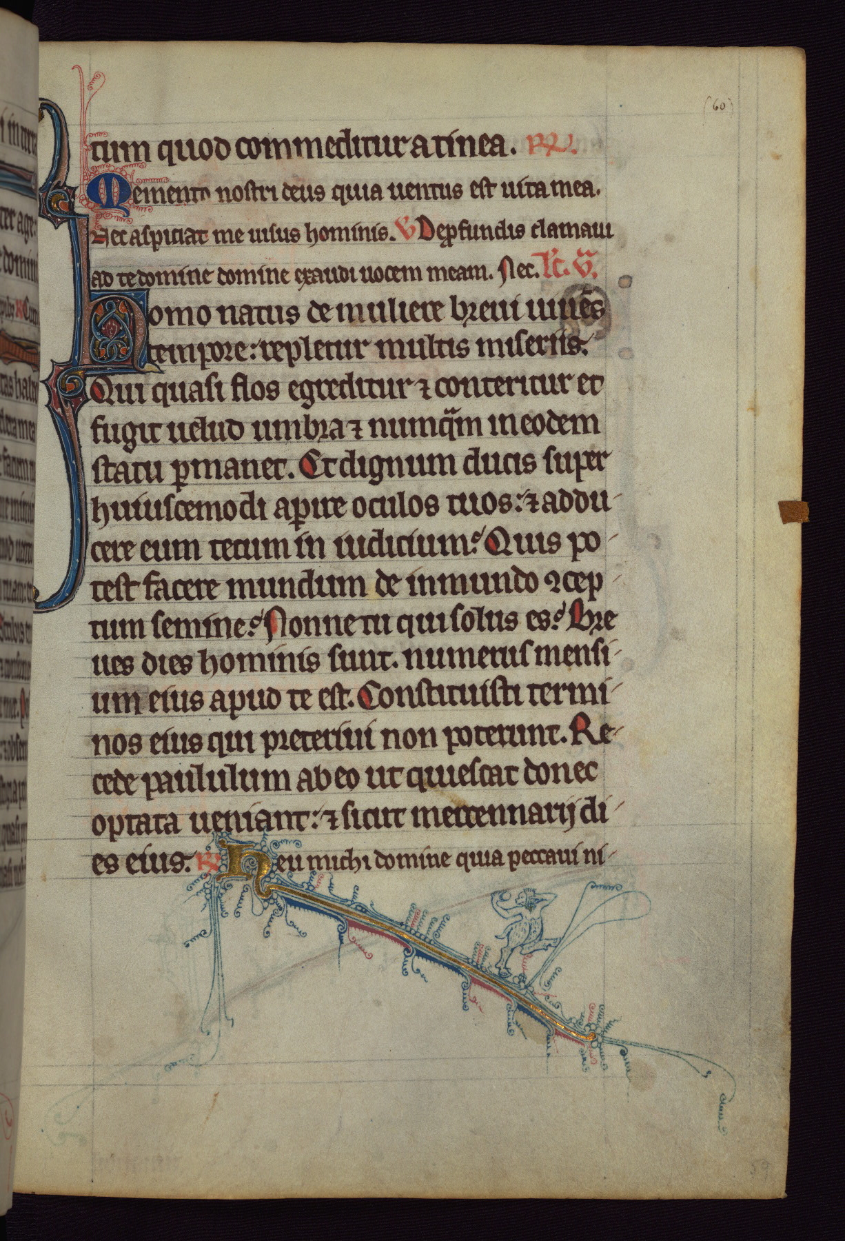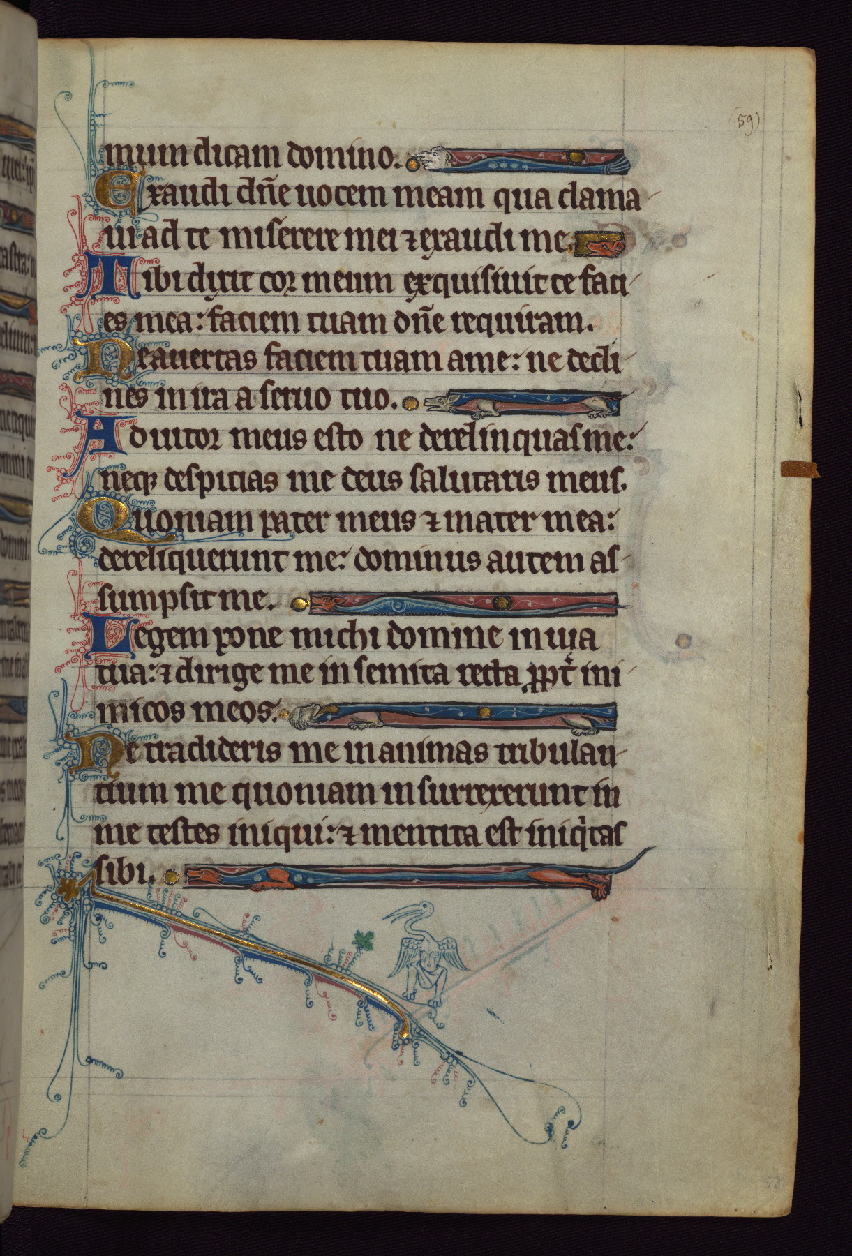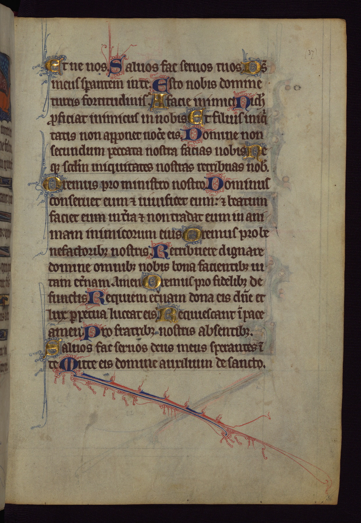 This finely illuminated and iconographically rich book of hours was made in England at the end of the thirteenth century. The manuscript is incomplete and misbound. Its main artist can also be found at work in a Bible (Oxford, Bodleian Library Ms. Auct. D.3.2) and a psalter (Cambridge, Trinity College Cambridge Ms. O.4.16). The manuscript contains a number of unusual texts, including the Hours of Jesus Crucified and the Office of St. Catherine. The patron of the manuscript is not clear; a woman is depicted as praying in many of the initials, but rubrics in the Office of the Dead mention "freres" (brothers). The imagery is inventive, and the Hours of Christ Crucified are graced with images depicting the funeral of Reynard the Fox in its margins. In the absence of a calendar, it is not possible to locate the origin of the manuscript precisely.