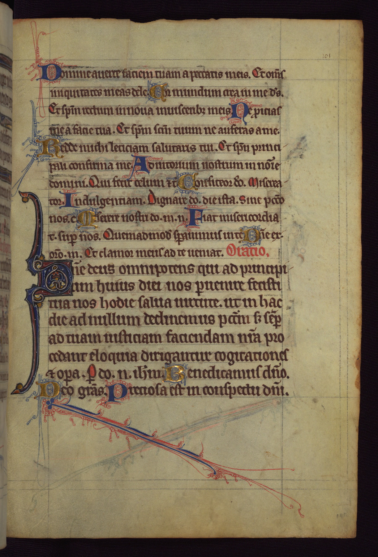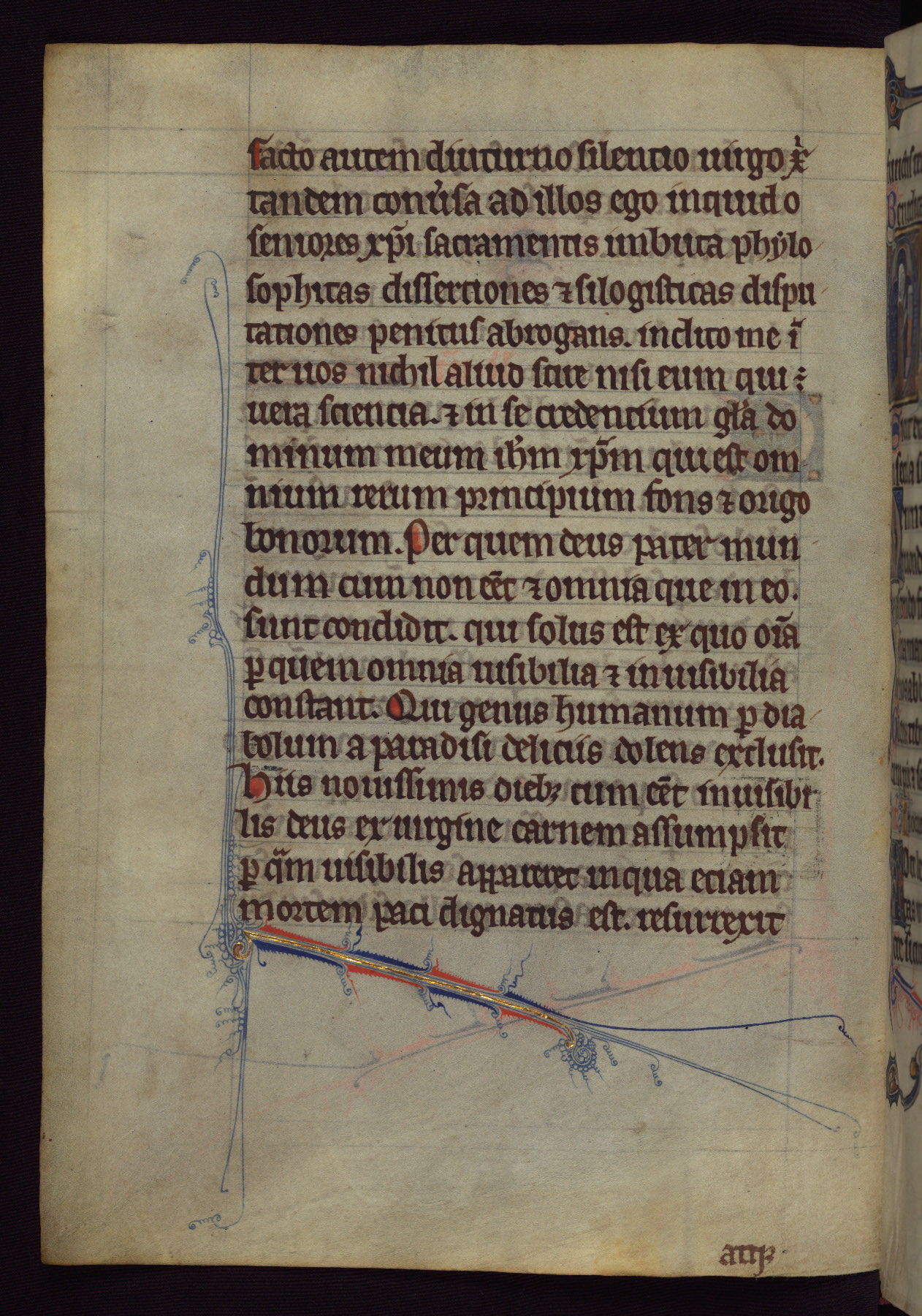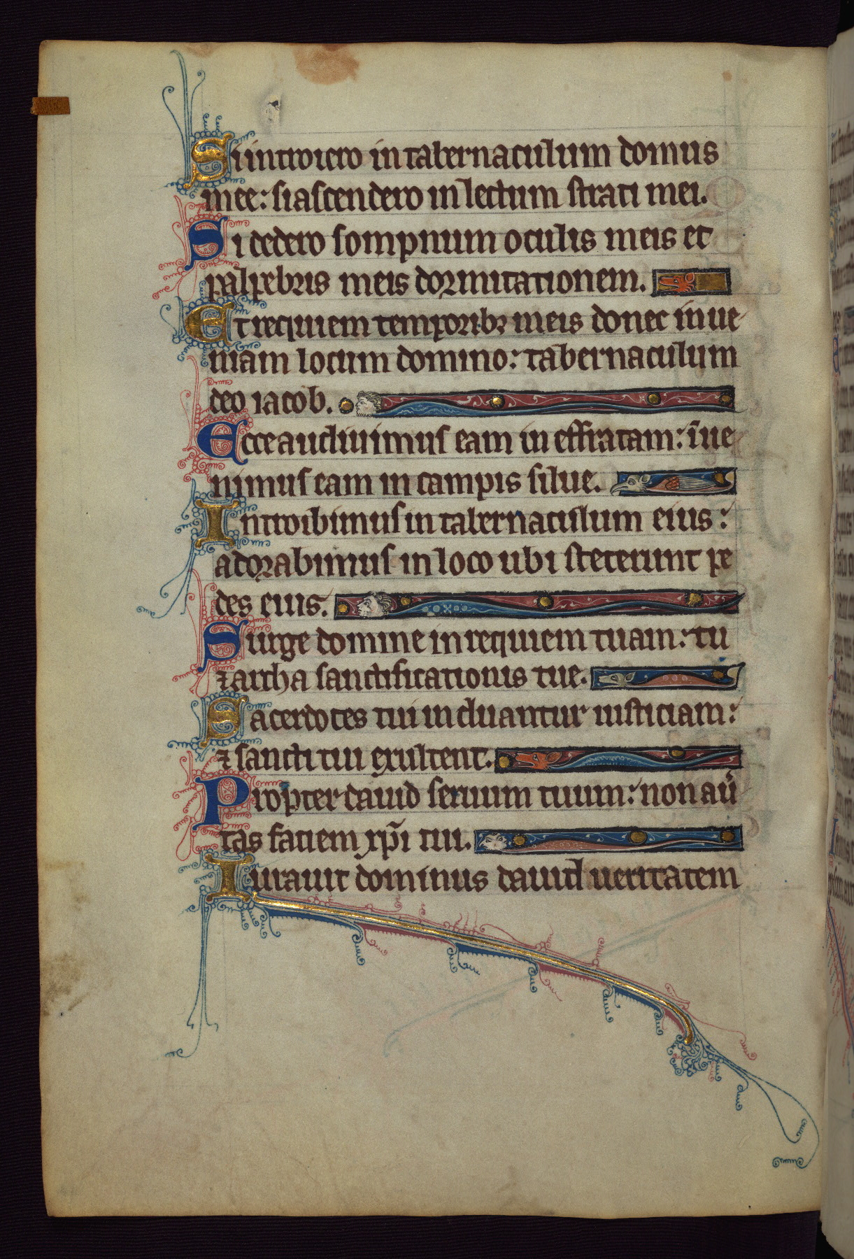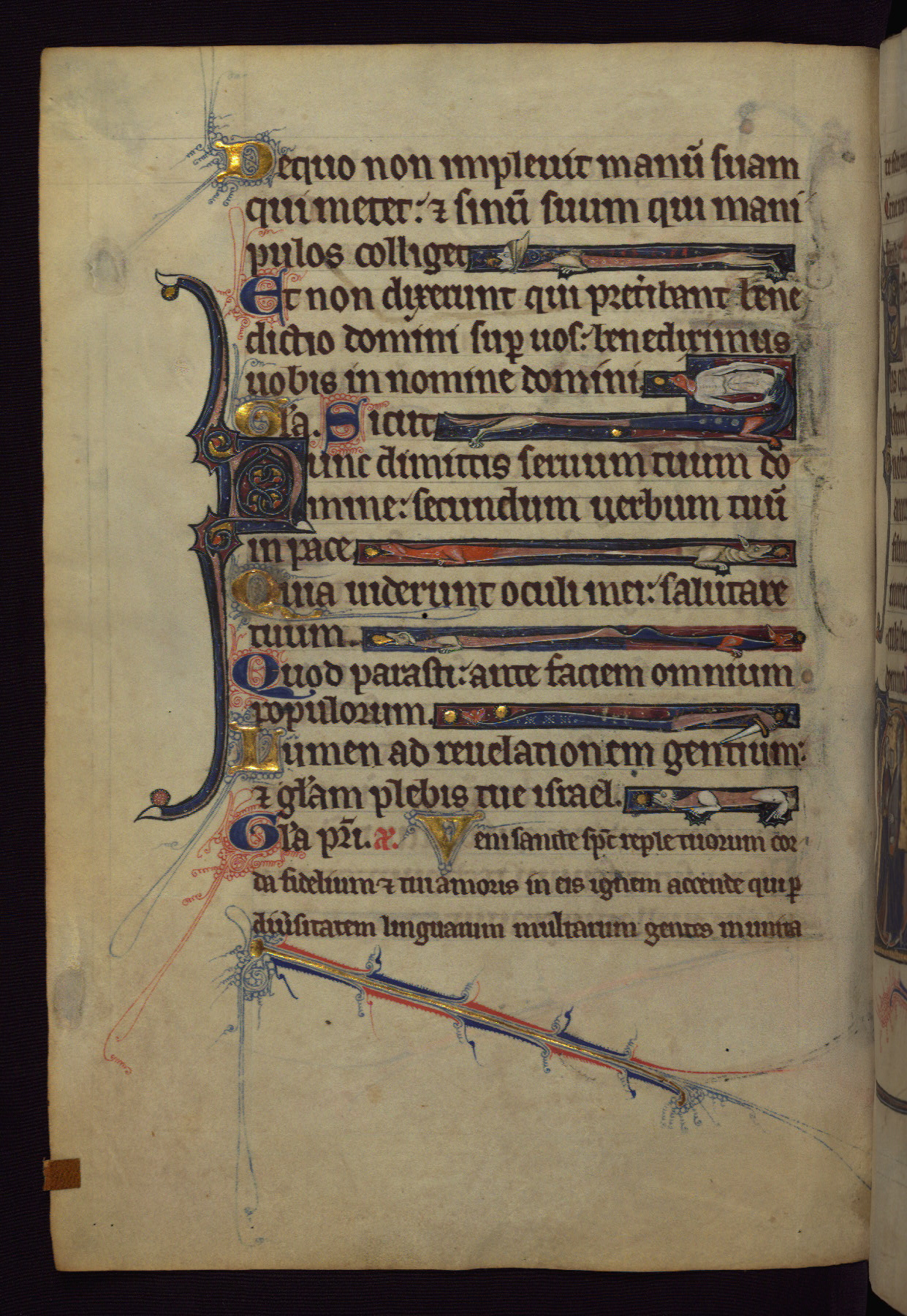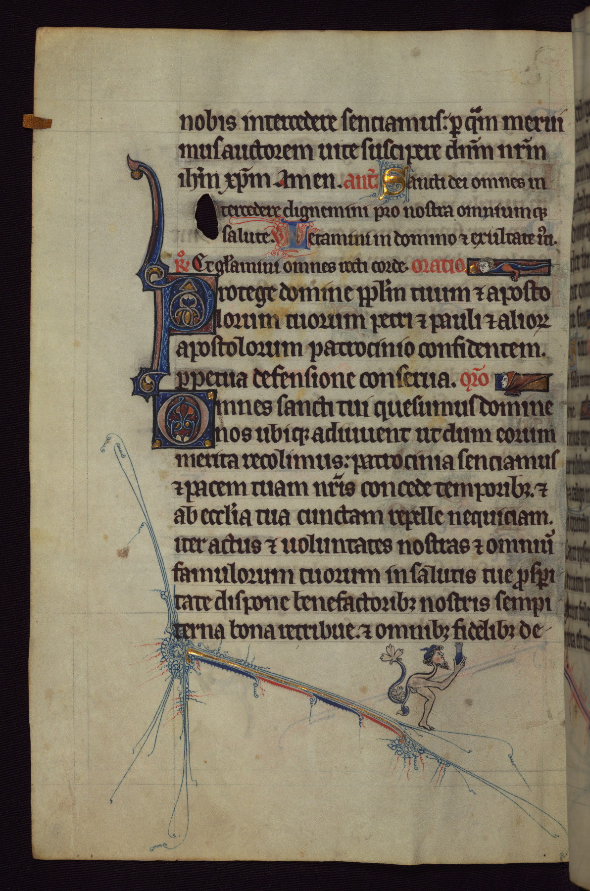 This finely illuminated and iconographically rich book of hours was made in England at the end of the thirteenth century. The manuscript is incomplete and misbound. Its main artist can also be found at work in a Bible (Oxford, Bodleian Library Ms. Auct. D.3.2) and a psalter (Cambridge, Trinity College Cambridge Ms. O.4.16). The manuscript contains a number of unusual texts, including the Hours of Jesus Crucified and the Office of St. Catherine. The patron of the manuscript is not clear; a woman is depicted as praying in many of the initials, but rubrics in the Office of the Dead mention "freres" (brothers). The imagery is inventive, and the Hours of Christ Crucified are graced with images depicting the funeral of Reynard the Fox in its margins. In the absence of a calendar, it is not possible to locate the origin of the manuscript precisely.