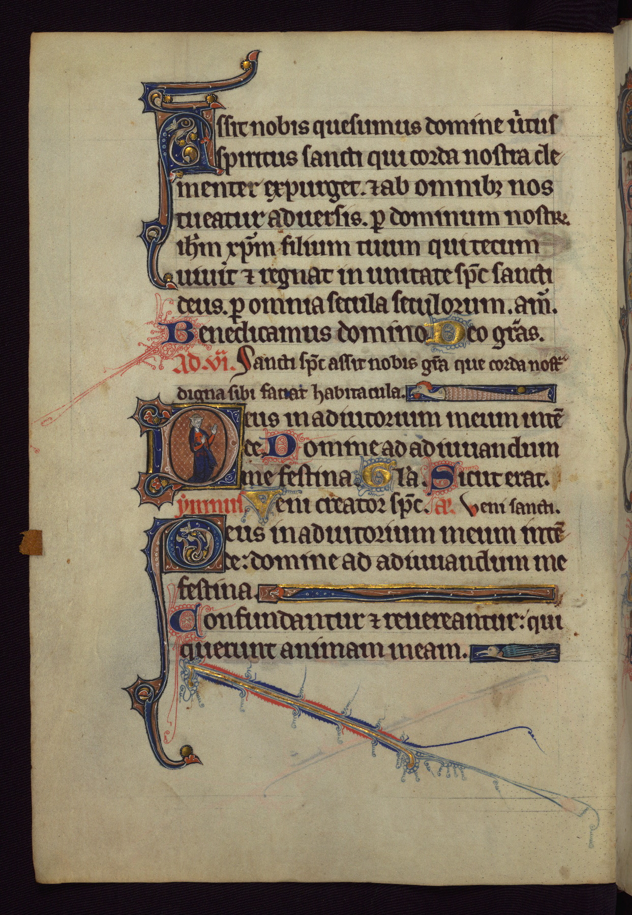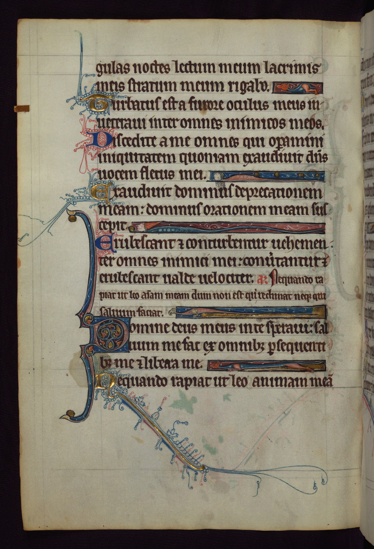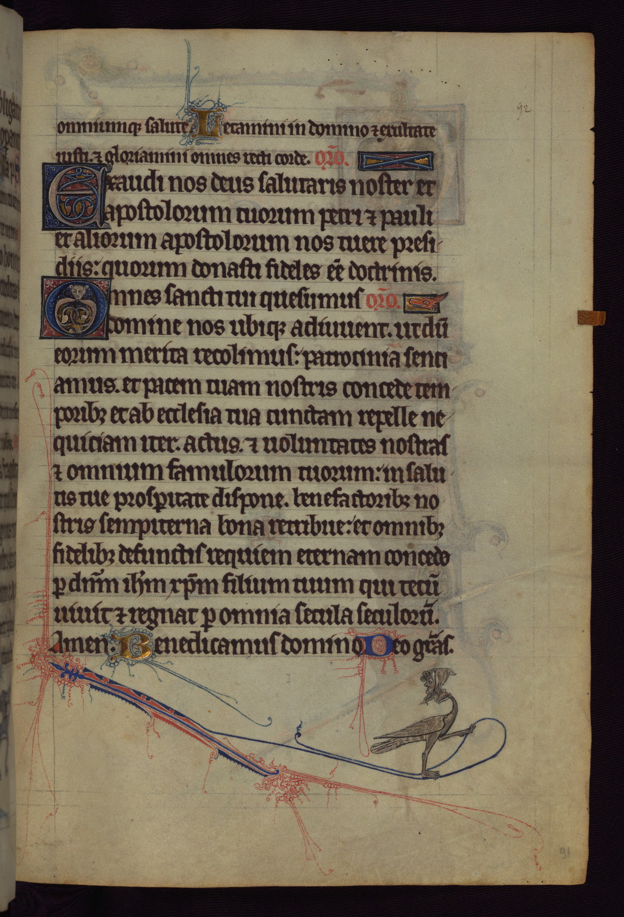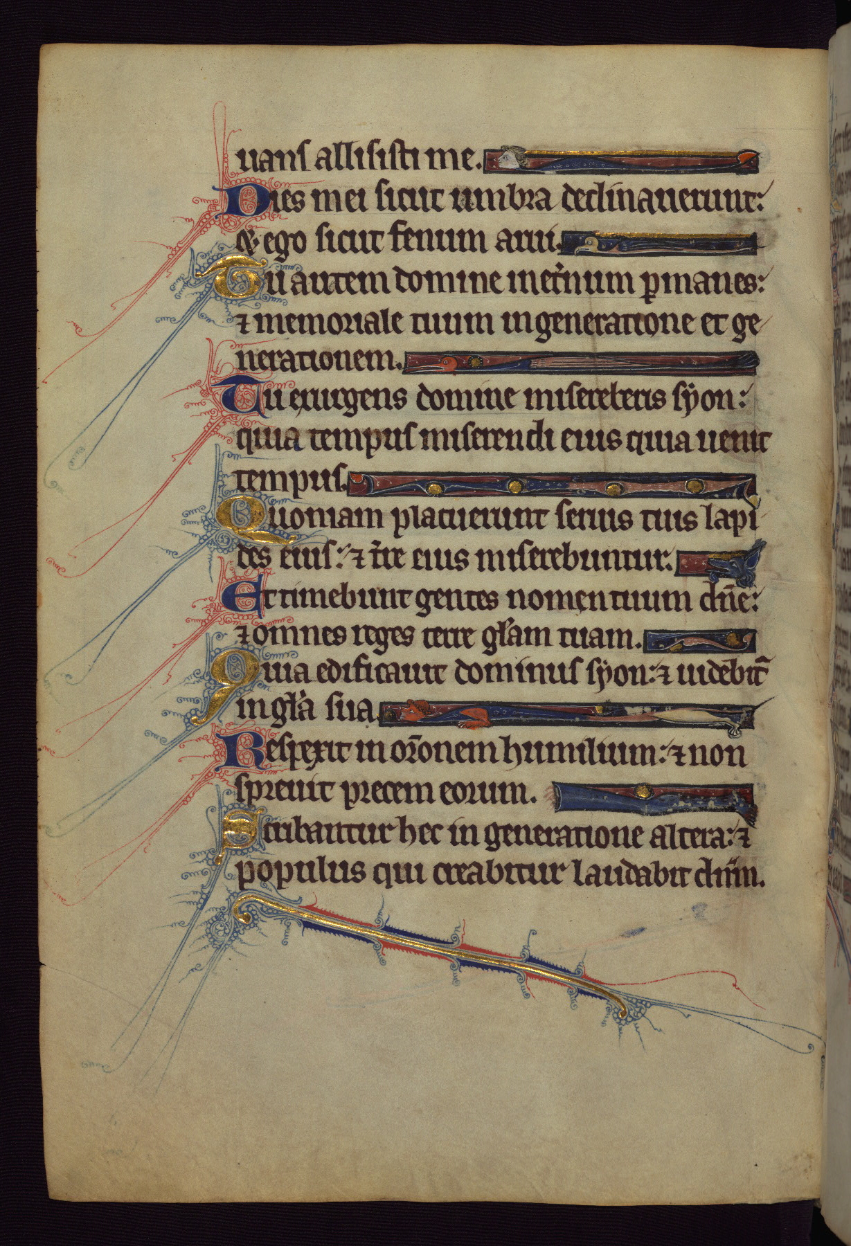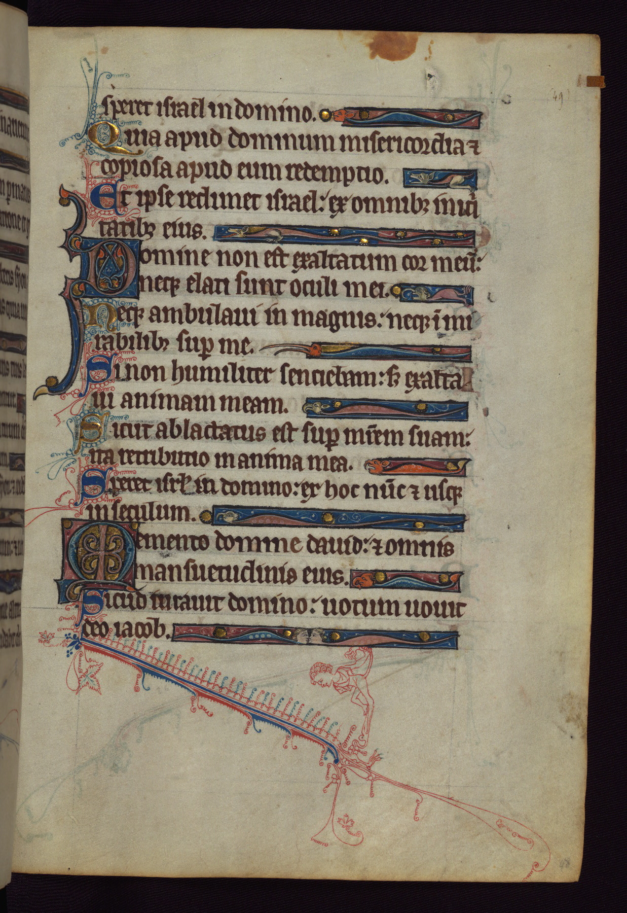 This finely illuminated and iconographically rich book of hours was made in England at the end of the thirteenth century. The manuscript is incomplete and misbound. Its main artist can also be found at work in a Bible (Oxford, Bodleian Library Ms. Auct. D.3.2) and a psalter (Cambridge, Trinity College Cambridge Ms. O.4.16). The manuscript contains a number of unusual texts, including the Hours of Jesus Crucified and the Office of St. Catherine. The patron of the manuscript is not clear; a woman is depicted as praying in many of the initials, but rubrics in the Office of the Dead mention "freres" (brothers). The imagery is inventive, and the Hours of Christ Crucified are graced with images depicting the funeral of Reynard the Fox in its margins. In the absence of a calendar, it is not possible to locate the origin of the manuscript precisely.
