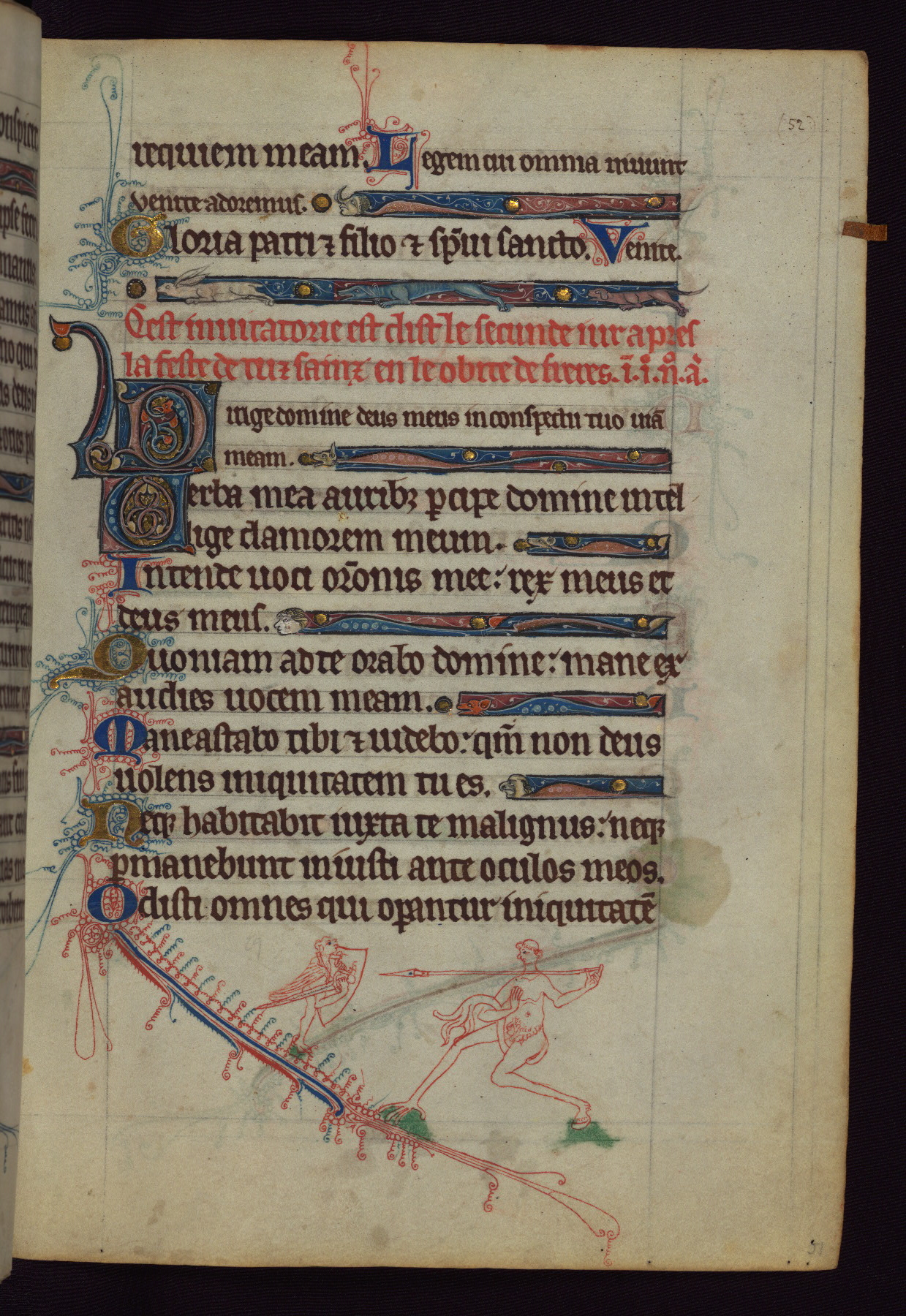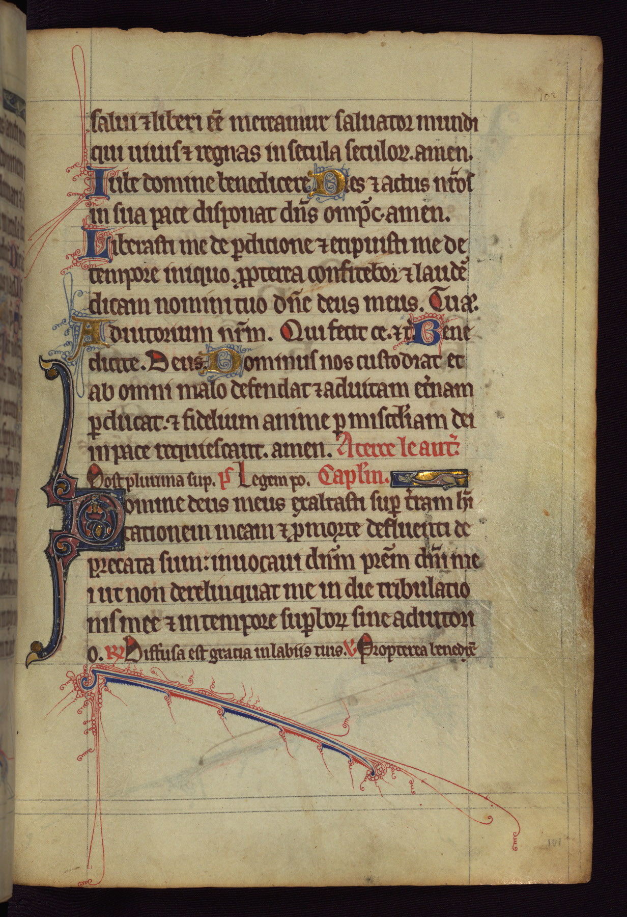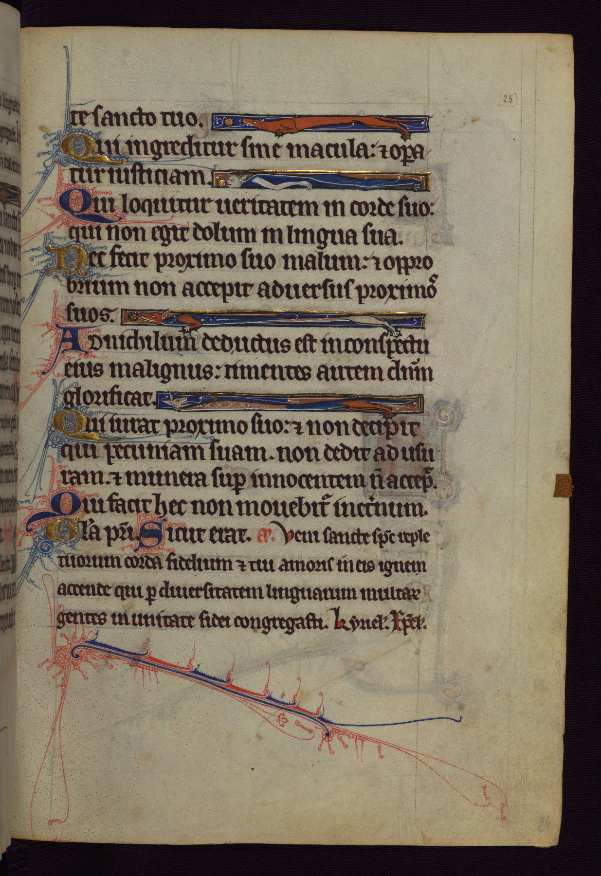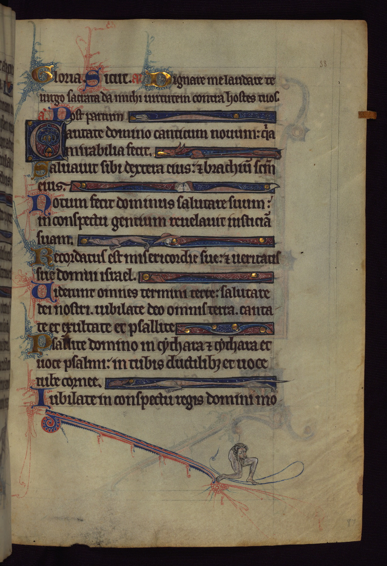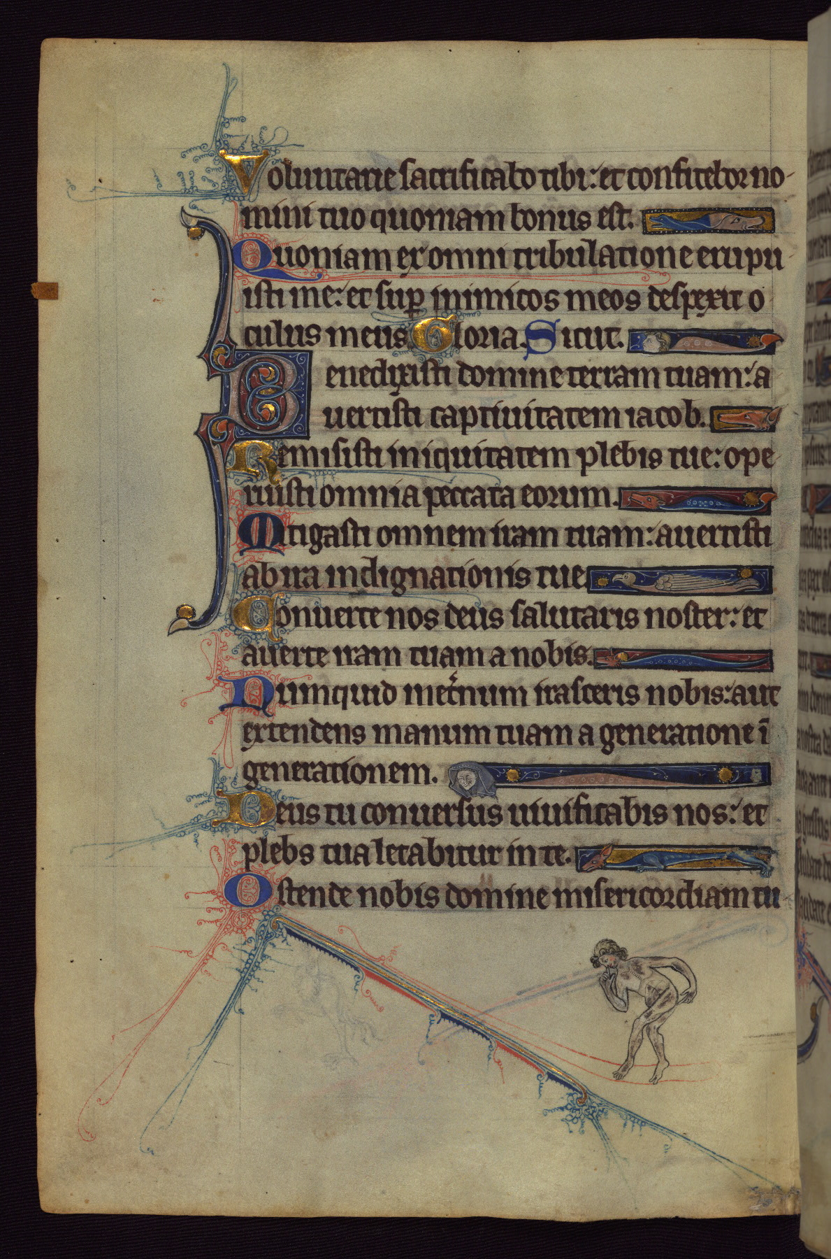 This finely illuminated and iconographically rich book of hours was made in England at the end of the thirteenth century. The manuscript is incomplete and misbound. Its main artist can also be found at work in a Bible (Oxford, Bodleian Library Ms. Auct. D.3.2) and a psalter (Cambridge, Trinity College Cambridge Ms. O.4.16). The manuscript contains a number of unusual texts, including the Hours of Jesus Crucified and the Office of St. Catherine. The patron of the manuscript is not clear; a woman is depicted as praying in many of the initials, but rubrics in the Office of the Dead mention "freres" (brothers). The imagery is inventive, and the Hours of Christ Crucified are graced with images depicting the funeral of Reynard the Fox in its margins. In the absence of a calendar, it is not possible to locate the origin of the manuscript precisely.
