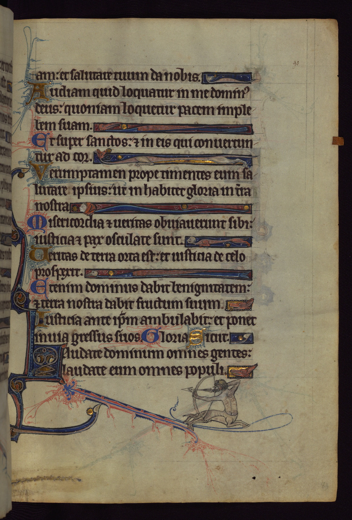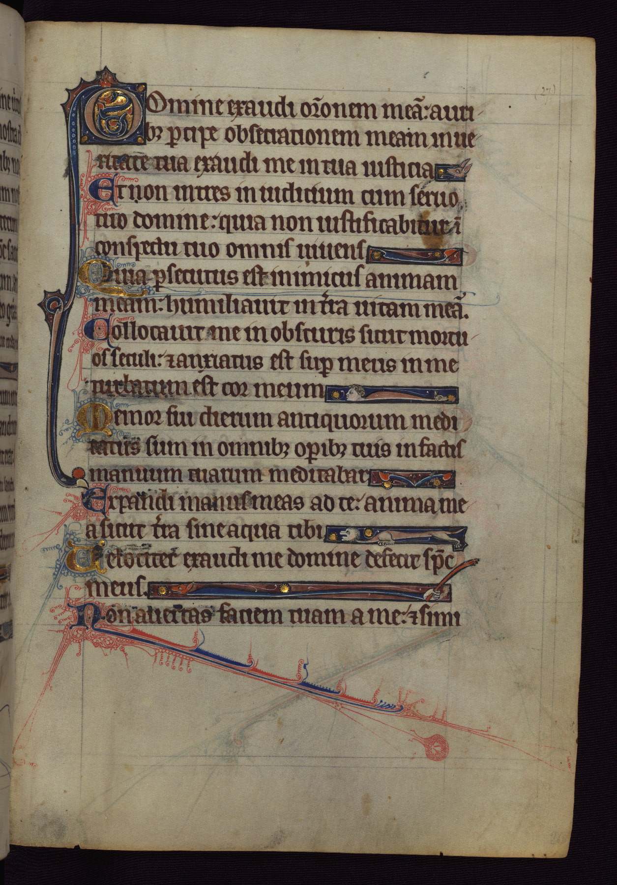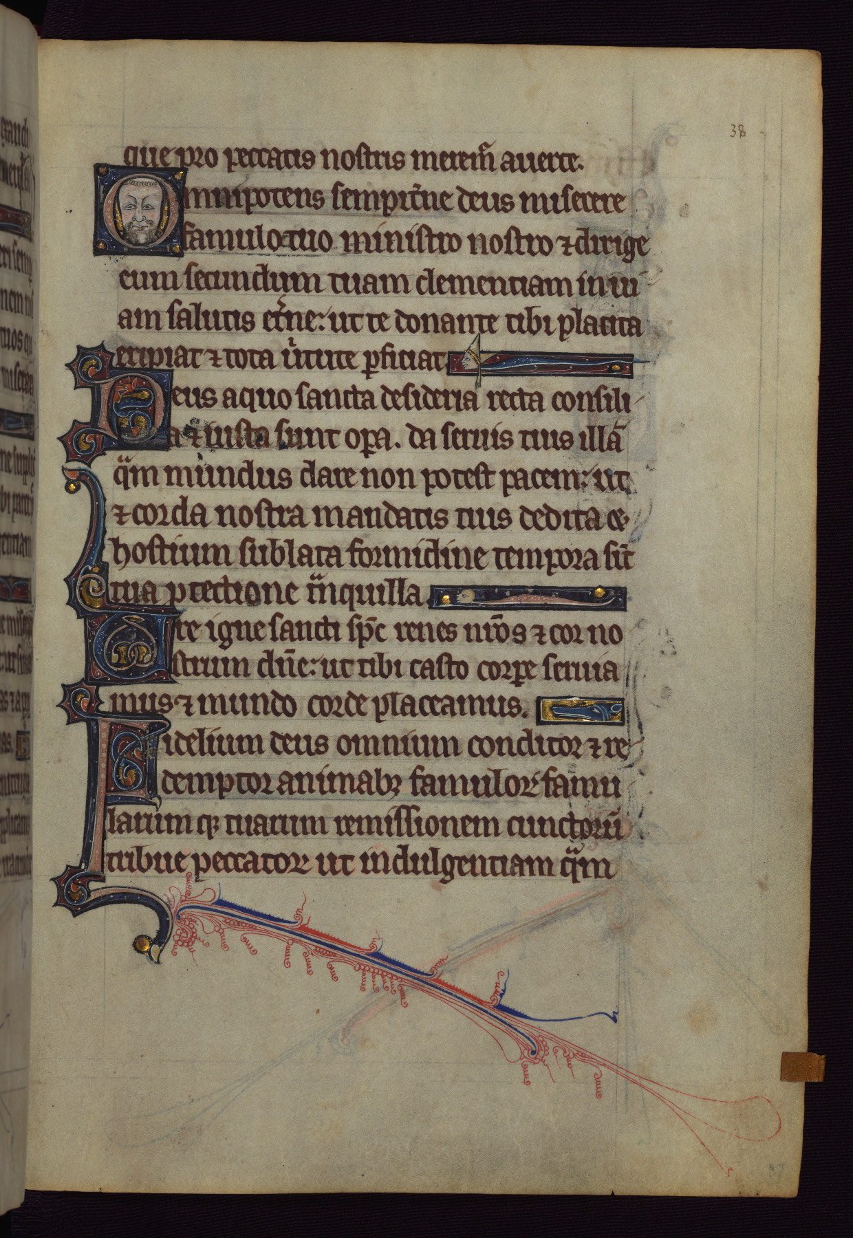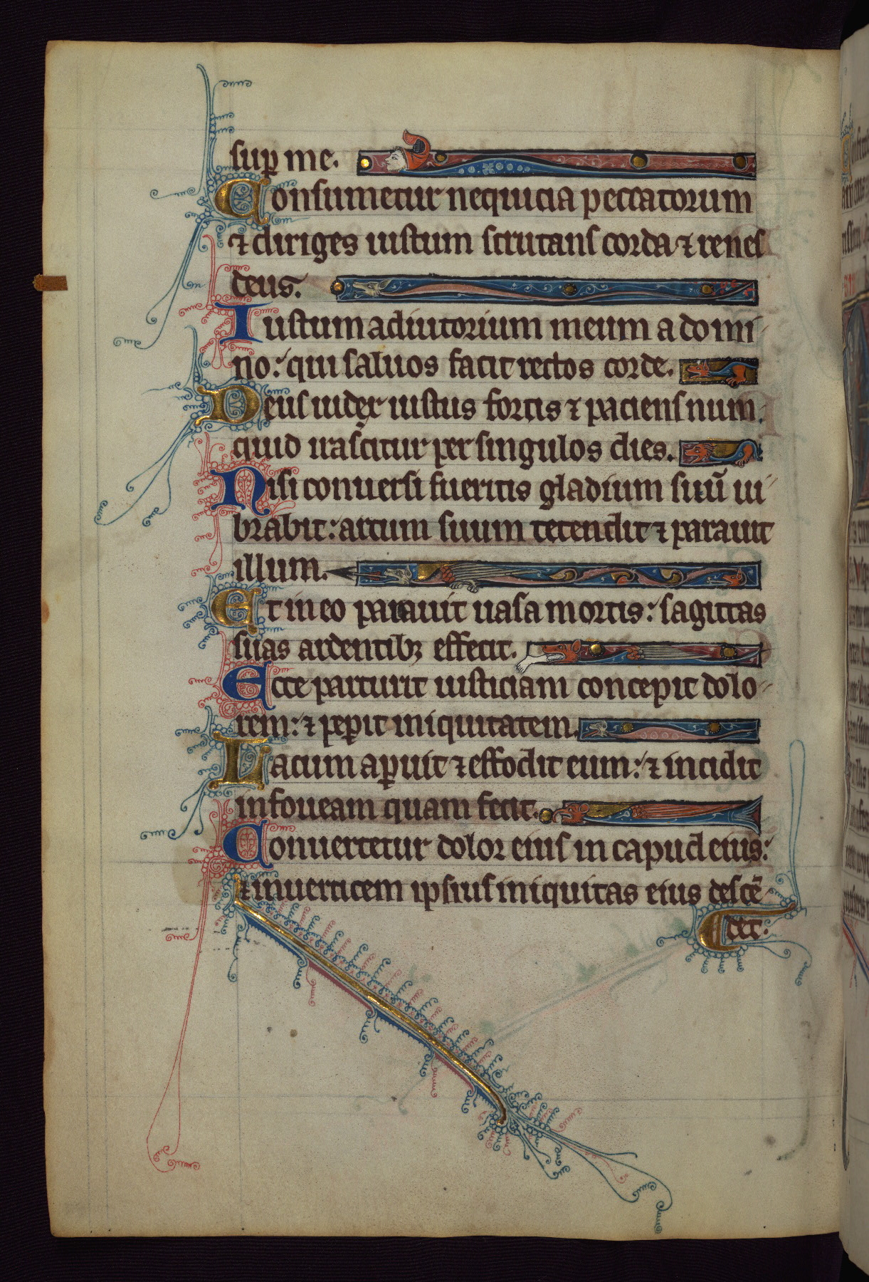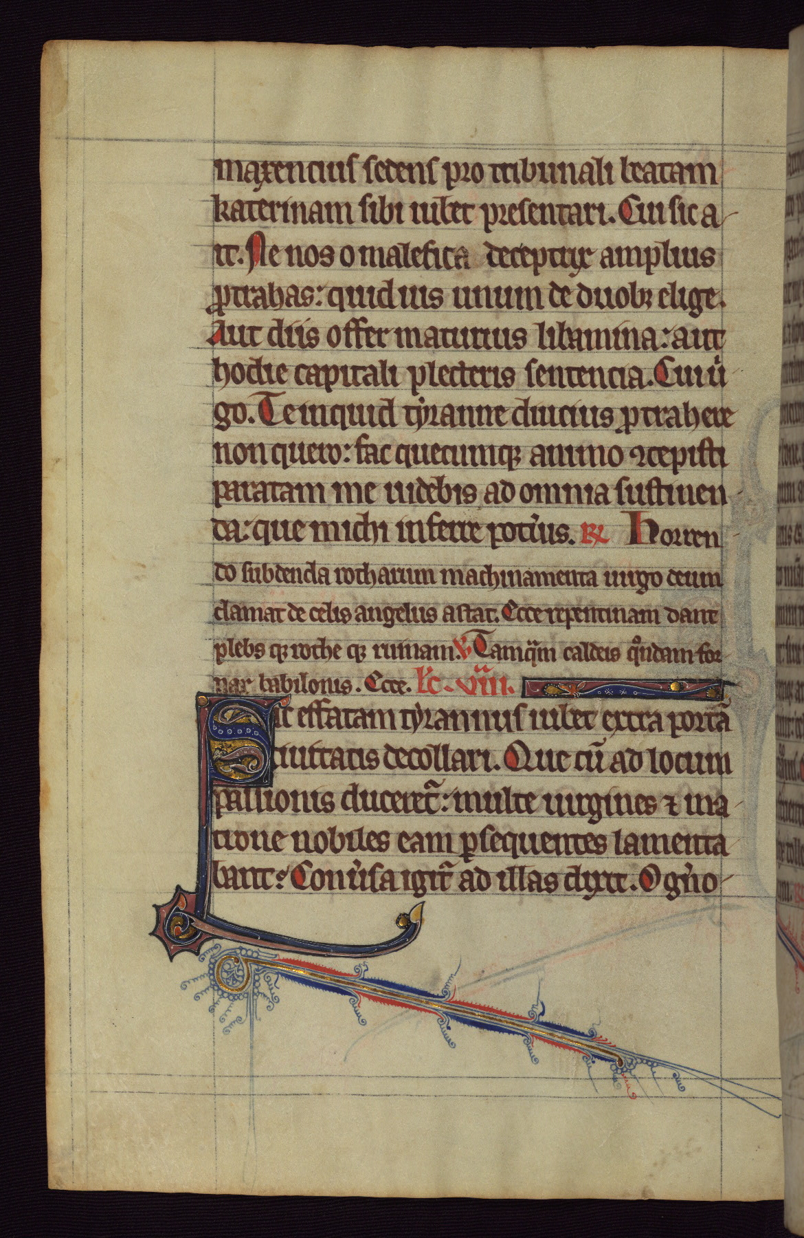 This finely illuminated and iconographically rich book of hours was made in England at the end of the thirteenth century. The manuscript is incomplete and misbound. Its main artist can also be found at work in a Bible (Oxford, Bodleian Library Ms. Auct. D.3.2) and a psalter (Cambridge, Trinity College Cambridge Ms. O.4.16). The manuscript contains a number of unusual texts, including the Hours of Jesus Crucified and the Office of St. Catherine. The patron of the manuscript is not clear; a woman is depicted as praying in many of the initials, but rubrics in the Office of the Dead mention "freres" (brothers). The imagery is inventive, and the Hours of Christ Crucified are graced with images depicting the funeral of Reynard the Fox in its margins. In the absence of a calendar, it is not possible to locate the origin of the manuscript precisely.