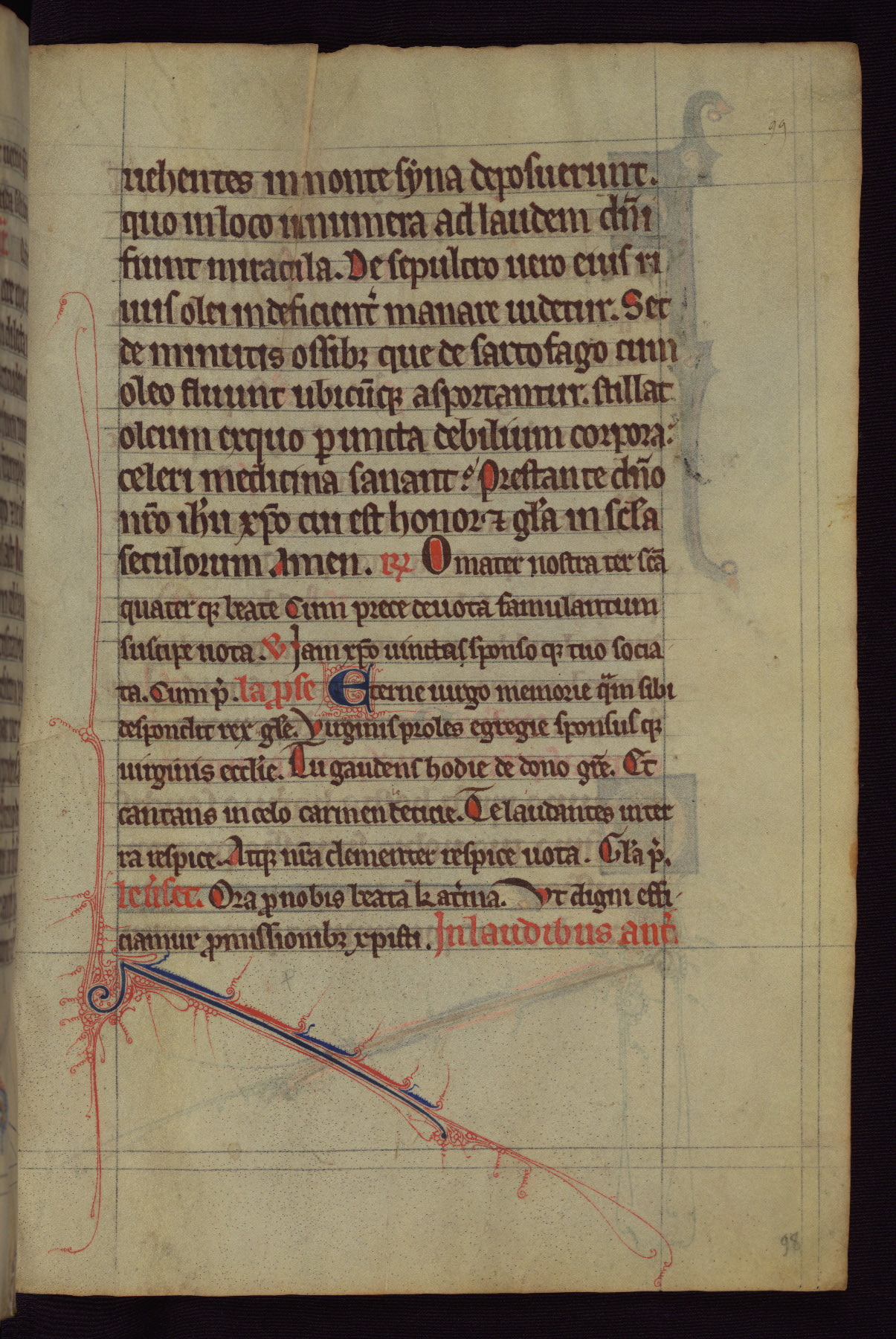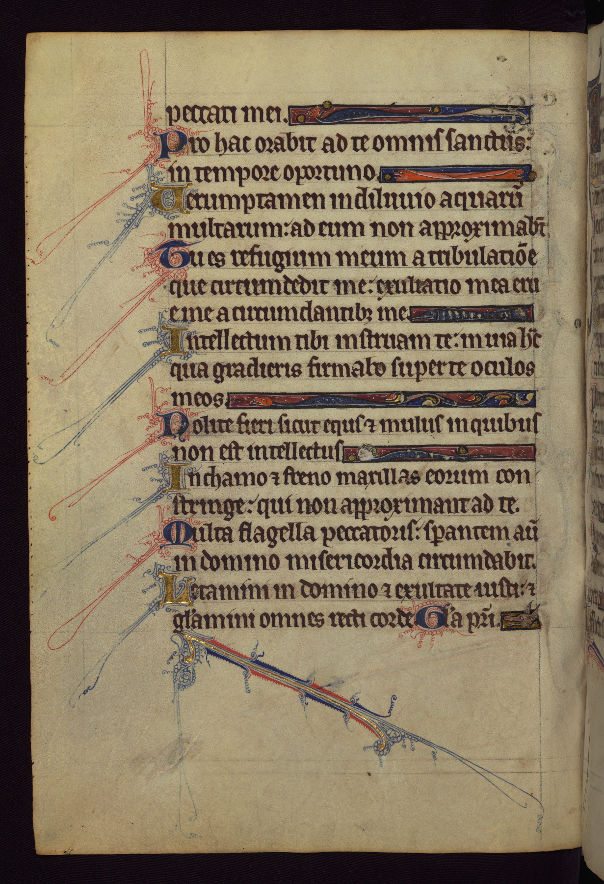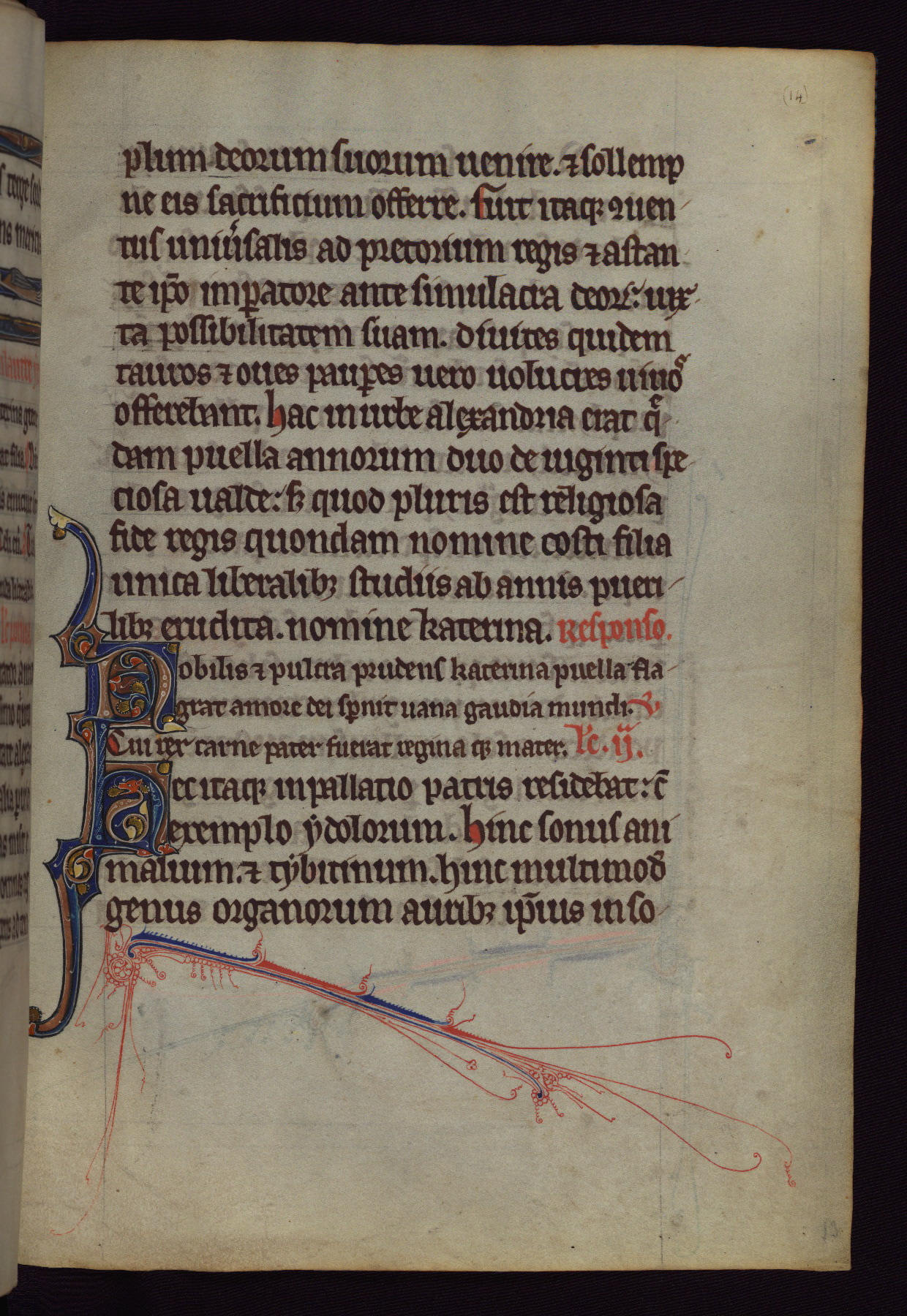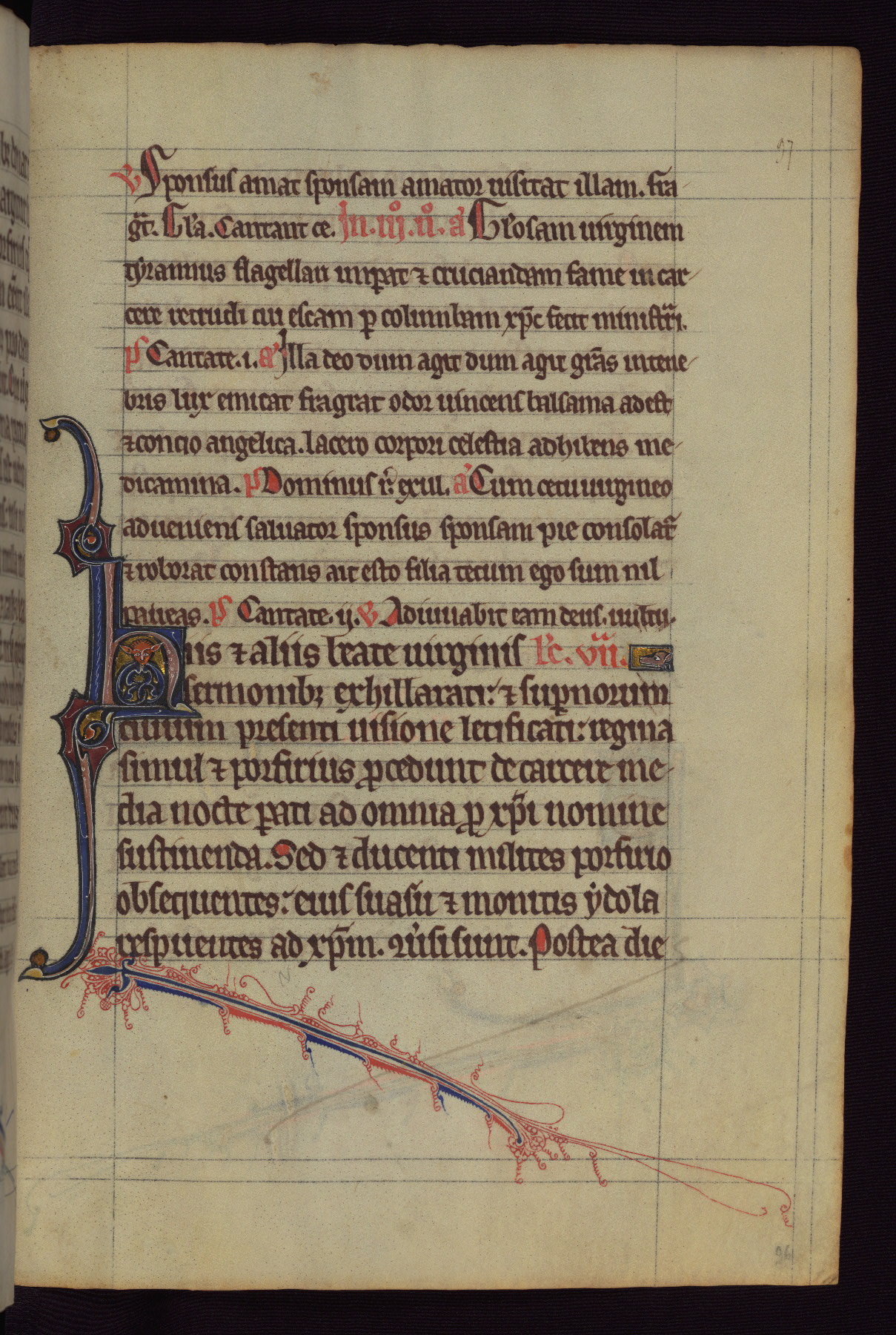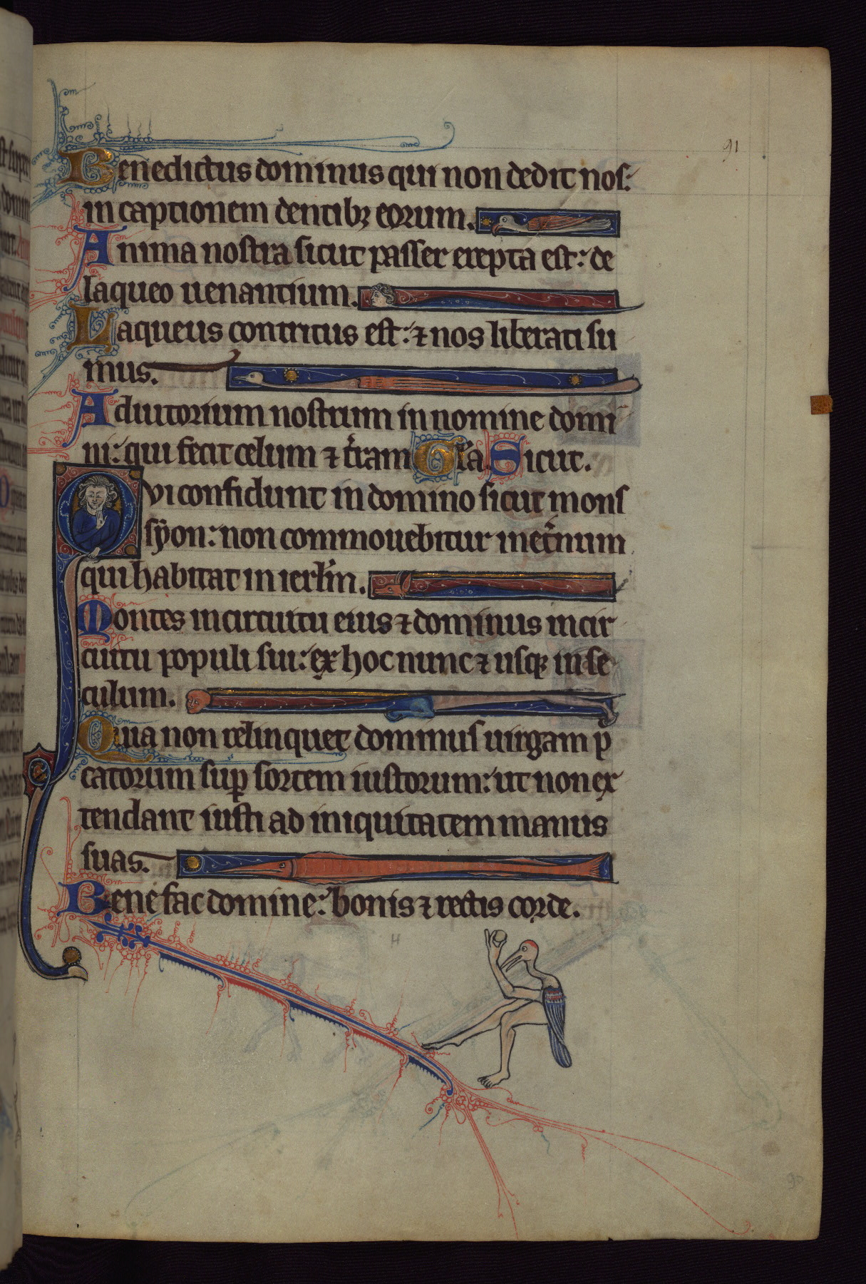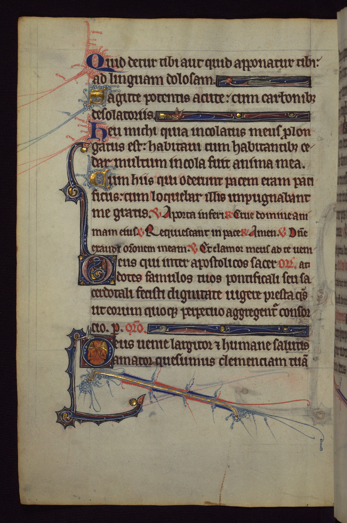 This finely illuminated and iconographically rich book of hours was made in England at the end of the thirteenth century. The manuscript is incomplete and misbound. Its main artist can also be found at work in a Bible (Oxford, Bodleian Library Ms. Auct. D.3.2) and a psalter (Cambridge, Trinity College Cambridge Ms. O.4.16). The manuscript contains a number of unusual texts, including the Hours of Jesus Crucified and the Office of St. Catherine. The patron of the manuscript is not clear; a woman is depicted as praying in many of the initials, but rubrics in the Office of the Dead mention "freres" (brothers). The imagery is inventive, and the Hours of Christ Crucified are graced with images depicting the funeral of Reynard the Fox in its margins. In the absence of a calendar, it is not possible to locate the origin of the manuscript precisely.