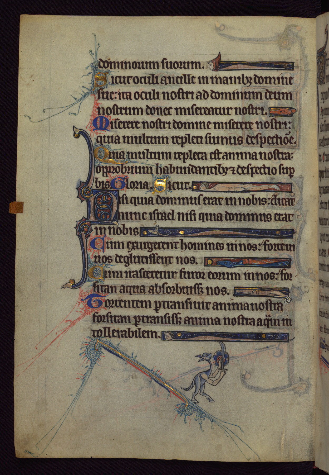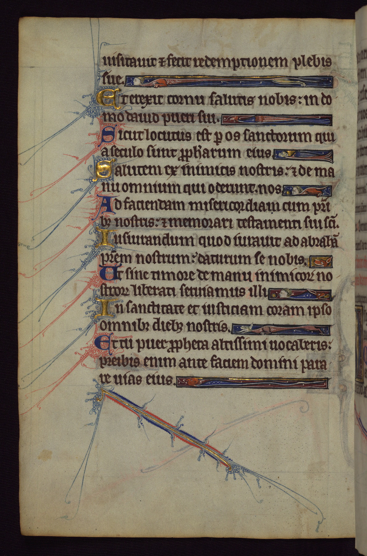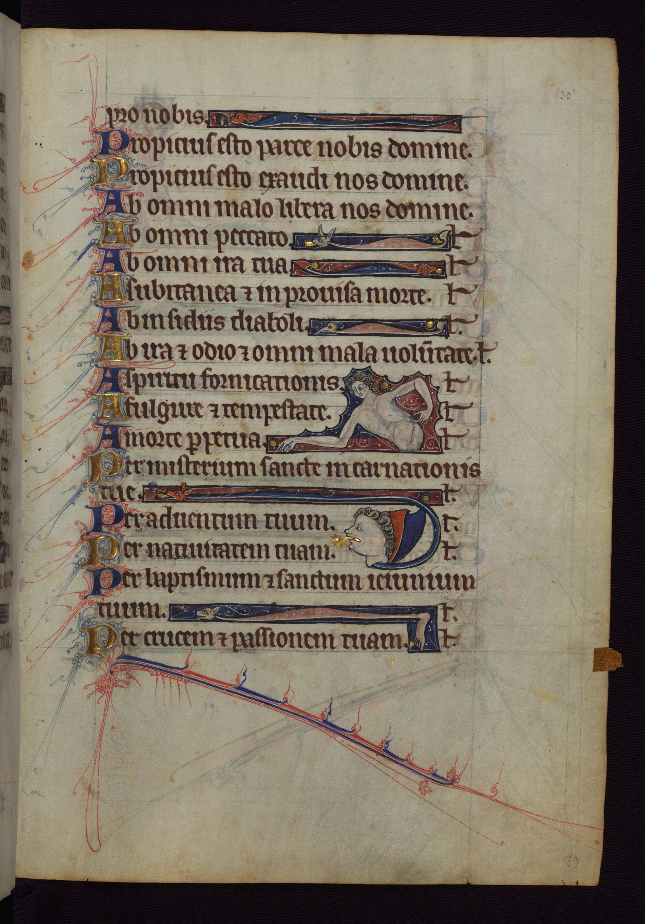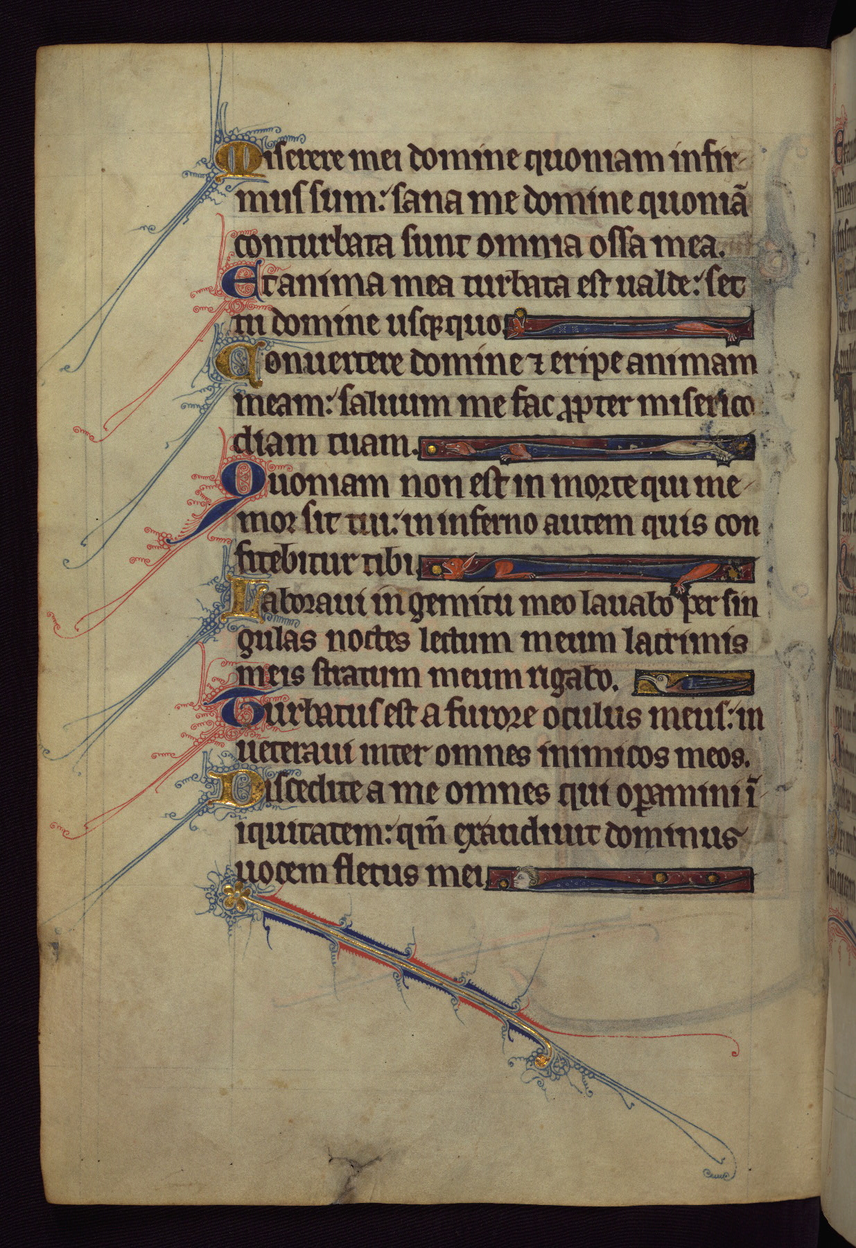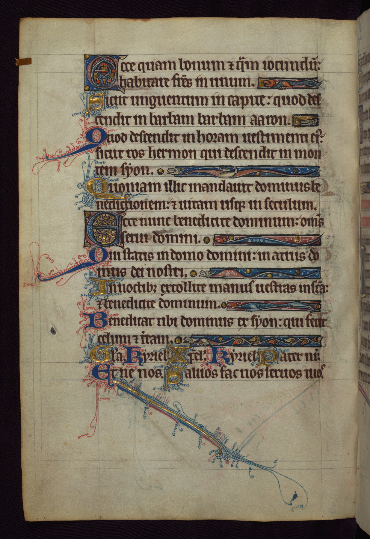 This finely illuminated and iconographically rich book of hours was made in England at the end of the thirteenth century. The manuscript is incomplete and misbound. Its main artist can also be found at work in a Bible (Oxford, Bodleian Library Ms. Auct. D.3.2) and a psalter (Cambridge, Trinity College Cambridge Ms. O.4.16). The manuscript contains a number of unusual texts, including the Hours of Jesus Crucified and the Office of St. Catherine. The patron of the manuscript is not clear; a woman is depicted as praying in many of the initials, but rubrics in the Office of the Dead mention "freres" (brothers). The imagery is inventive, and the Hours of Christ Crucified are graced with images depicting the funeral of Reynard the Fox in its margins. In the absence of a calendar, it is not possible to locate the origin of the manuscript precisely.