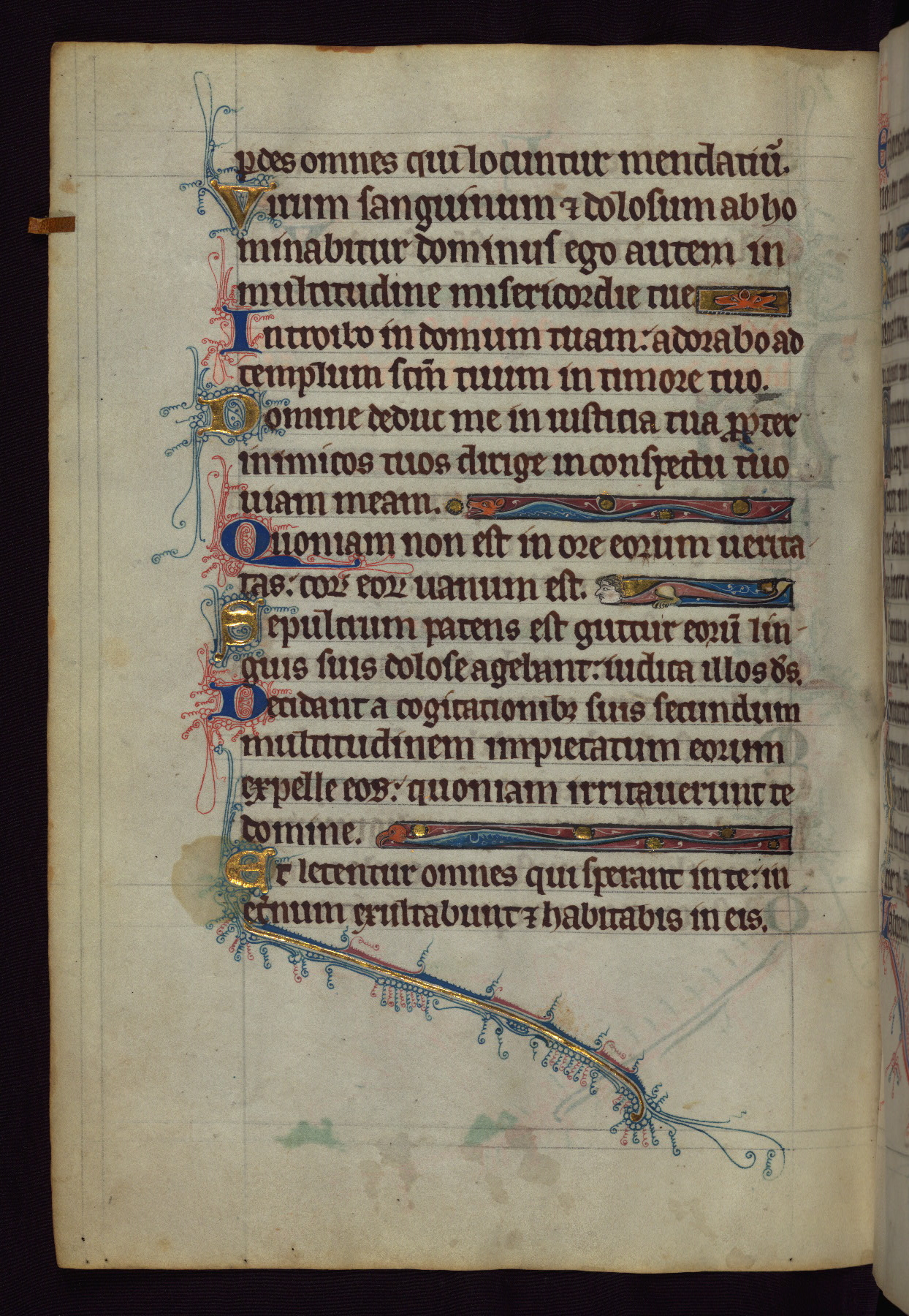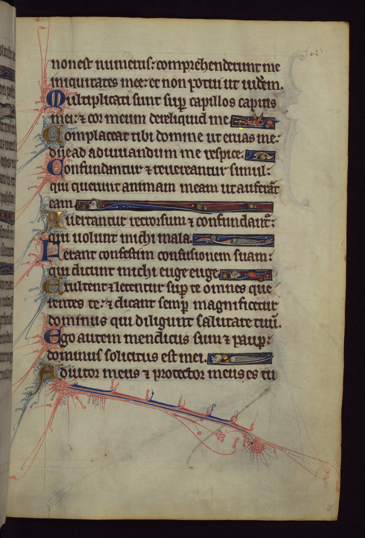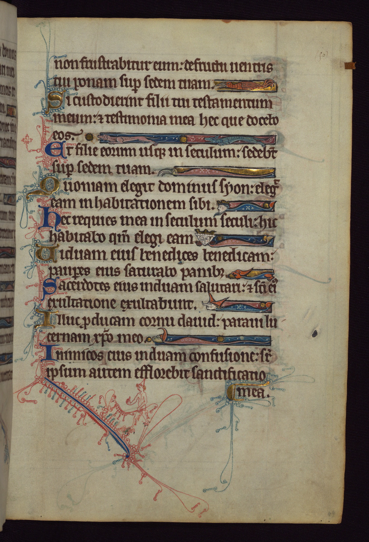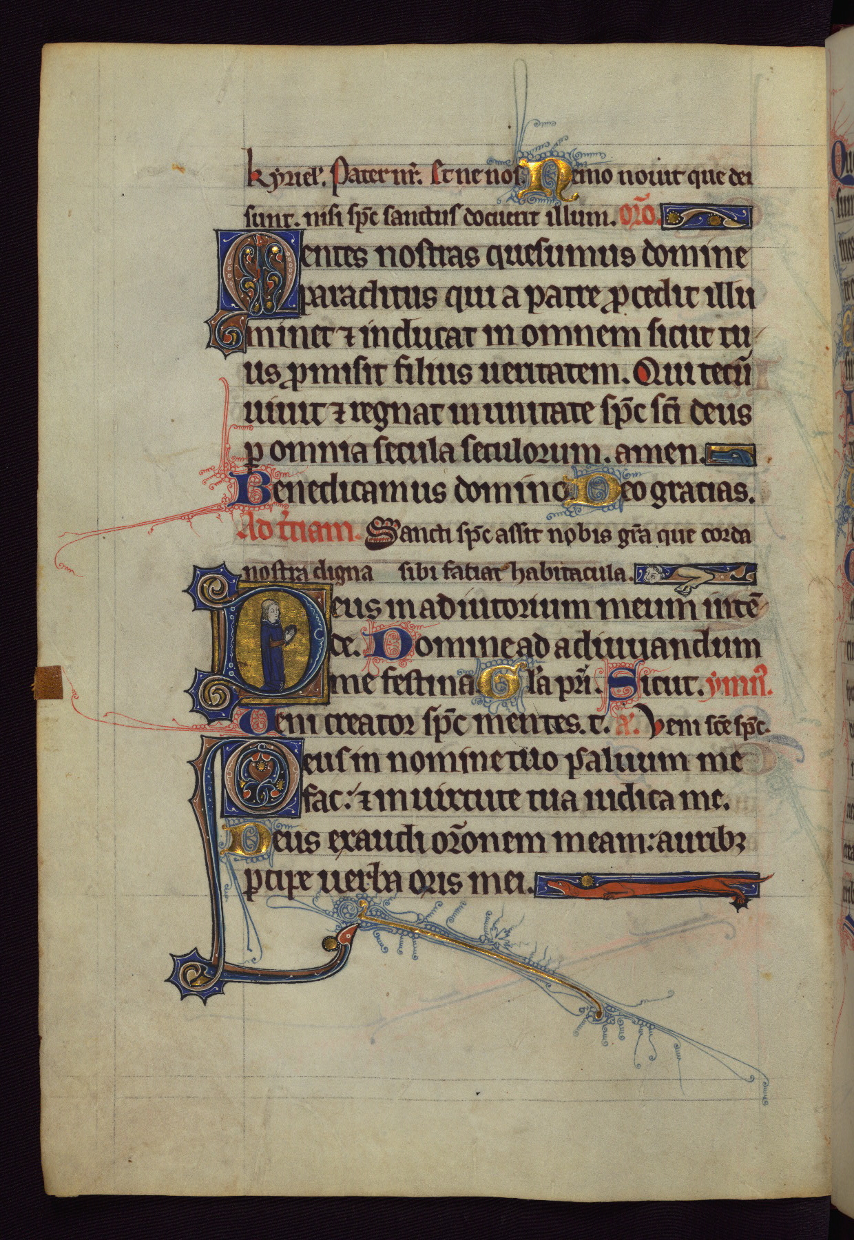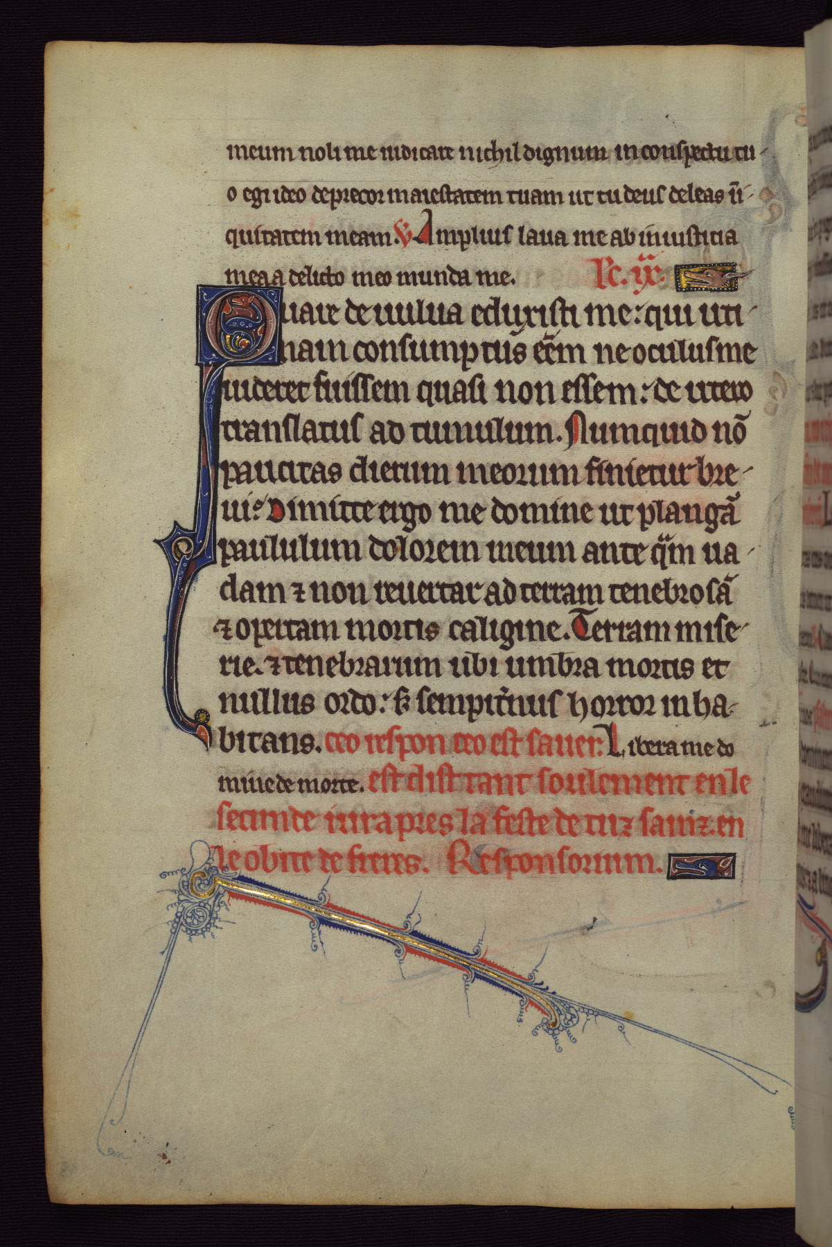 This finely illuminated and iconographically rich book of hours was made in England at the end of the thirteenth century. The manuscript is incomplete and misbound. Its main artist can also be found at work in a Bible (Oxford, Bodleian Library Ms. Auct. D.3.2) and a psalter (Cambridge, Trinity College Cambridge Ms. O.4.16). The manuscript contains a number of unusual texts, including the Hours of Jesus Crucified and the Office of St. Catherine. The patron of the manuscript is not clear; a woman is depicted as praying in many of the initials, but rubrics in the Office of the Dead mention "freres" (brothers). The imagery is inventive, and the Hours of Christ Crucified are graced with images depicting the funeral of Reynard the Fox in its margins. In the absence of a calendar, it is not possible to locate the origin of the manuscript precisely.
