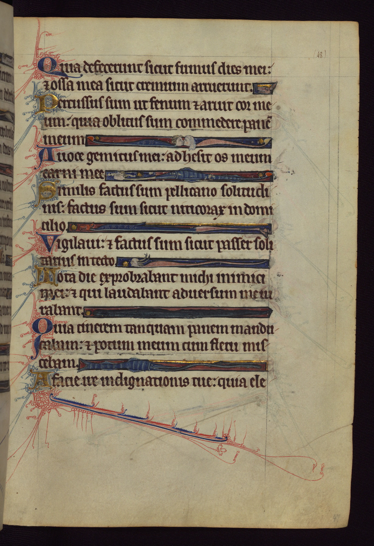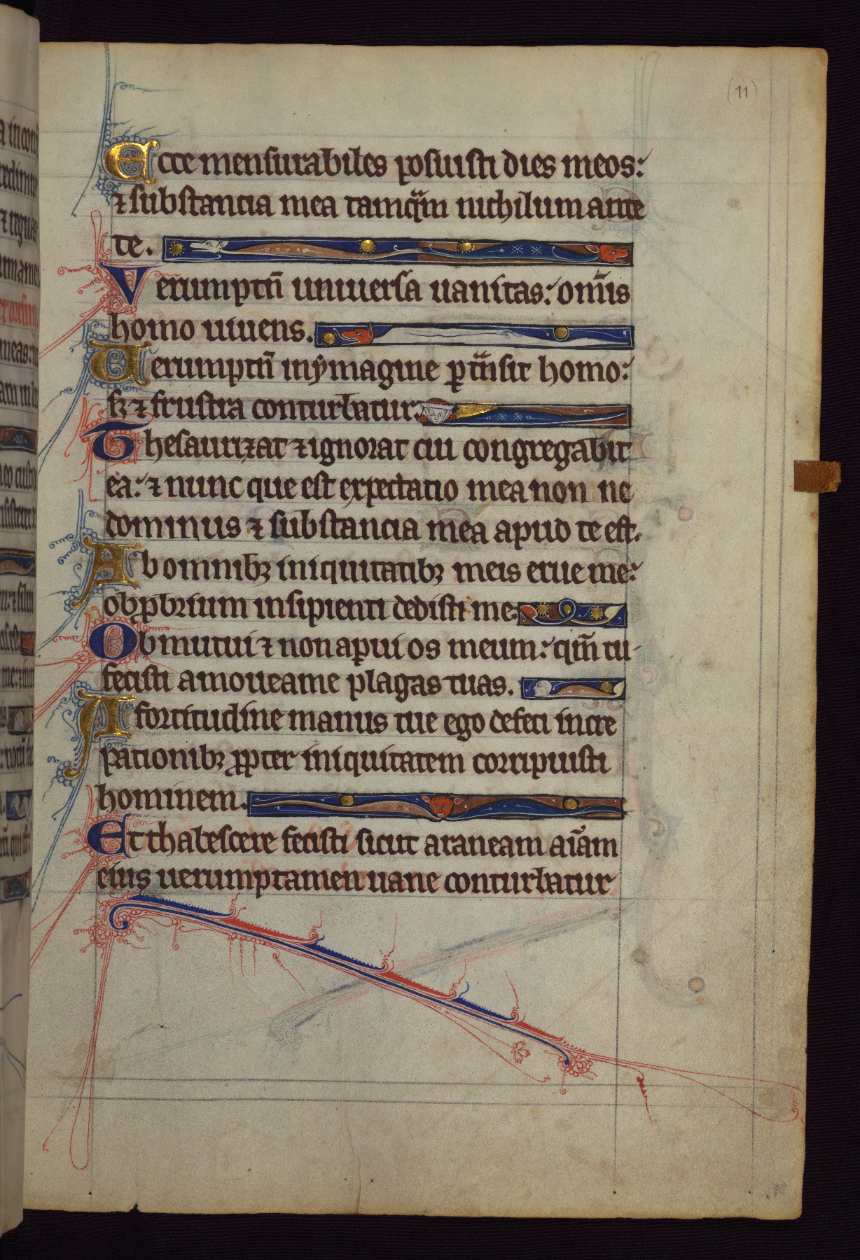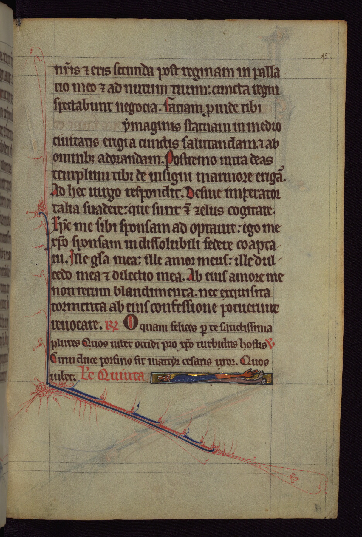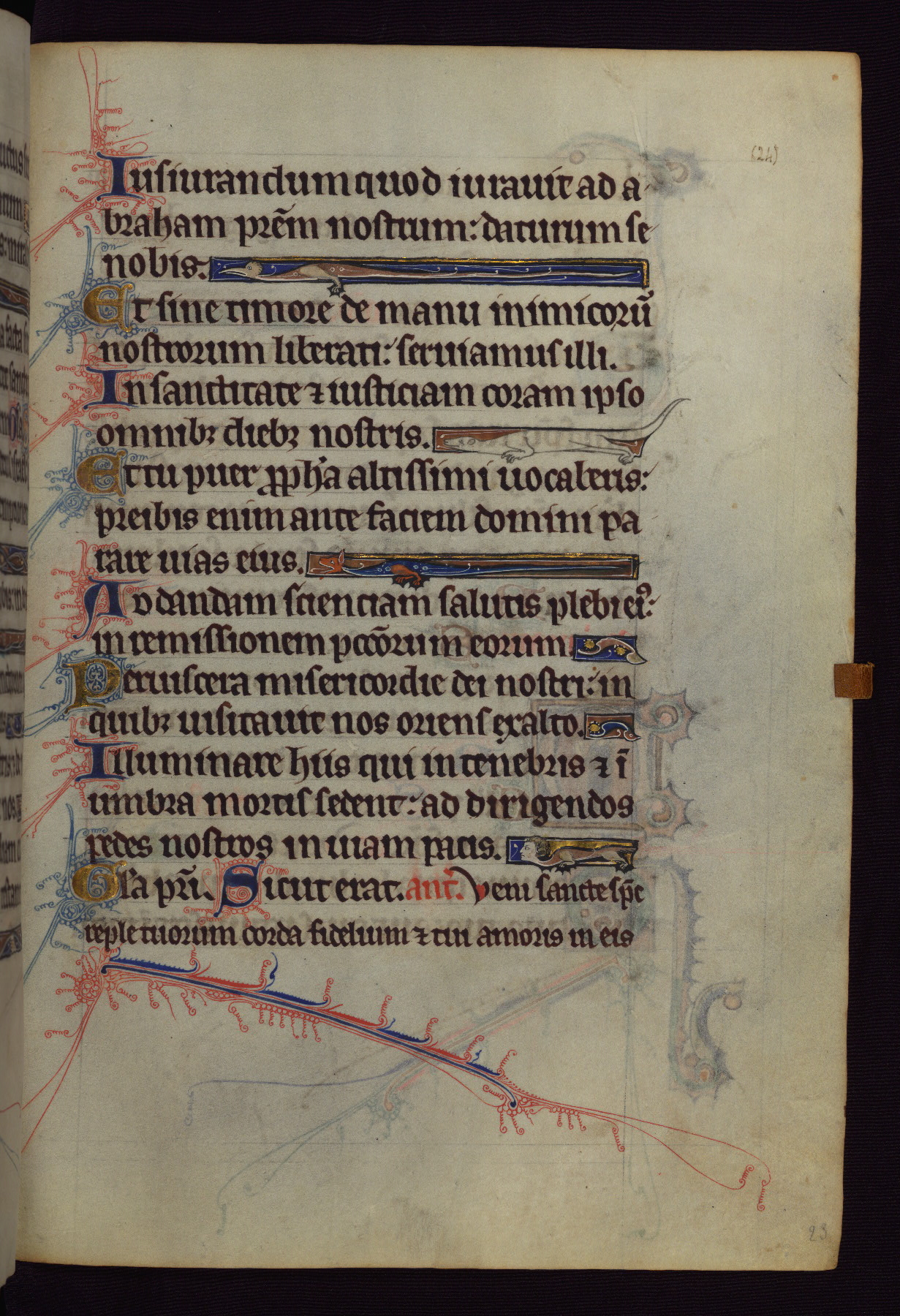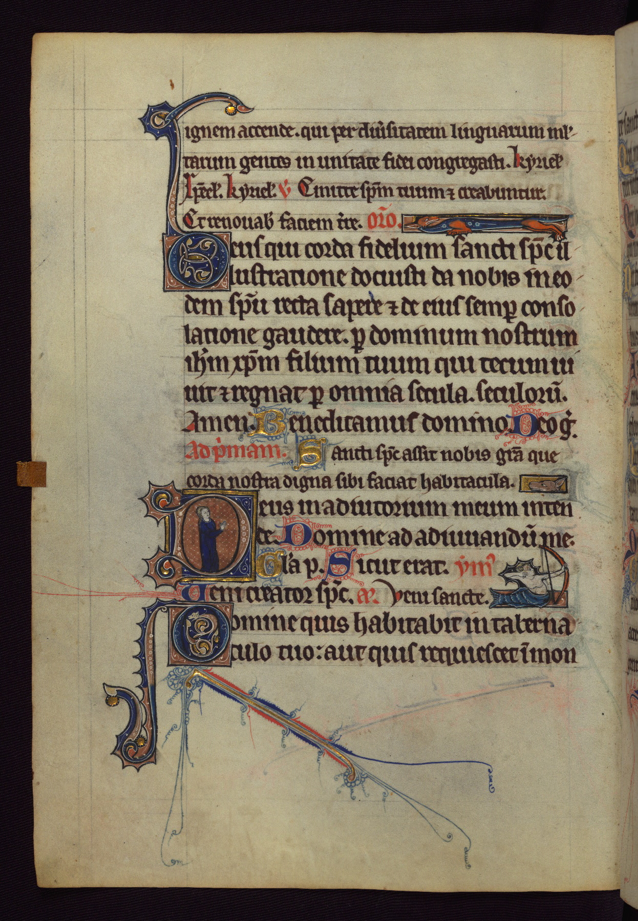 This finely illuminated and iconographically rich book of hours was made in England at the end of the thirteenth century. The manuscript is incomplete and misbound. Its main artist can also be found at work in a Bible (Oxford, Bodleian Library Ms. Auct. D.3.2) and a psalter (Cambridge, Trinity College Cambridge Ms. O.4.16). The manuscript contains a number of unusual texts, including the Hours of Jesus Crucified and the Office of St. Catherine. The patron of the manuscript is not clear; a woman is depicted as praying in many of the initials, but rubrics in the Office of the Dead mention "freres" (brothers). The imagery is inventive, and the Hours of Christ Crucified are graced with images depicting the funeral of Reynard the Fox in its margins. In the absence of a calendar, it is not possible to locate the origin of the manuscript precisely.