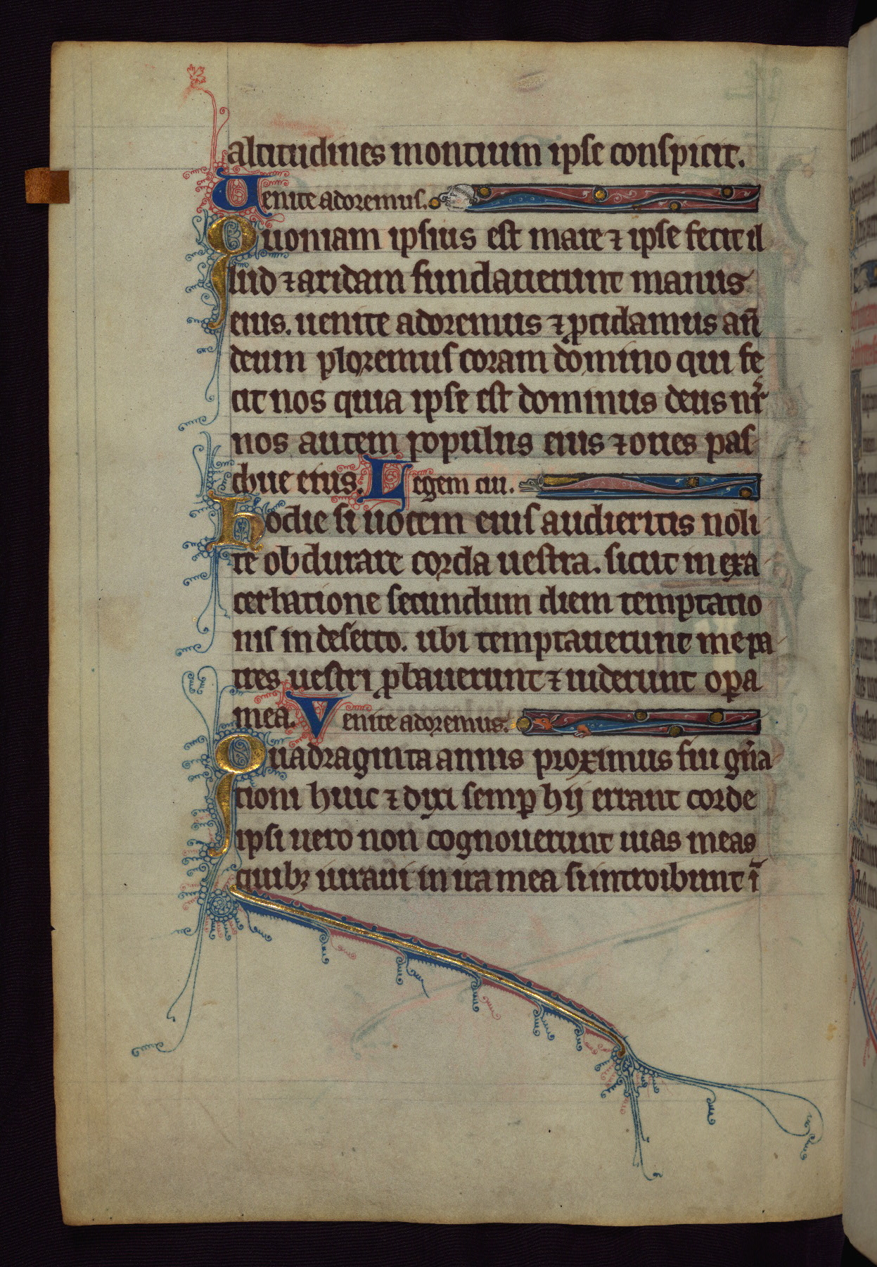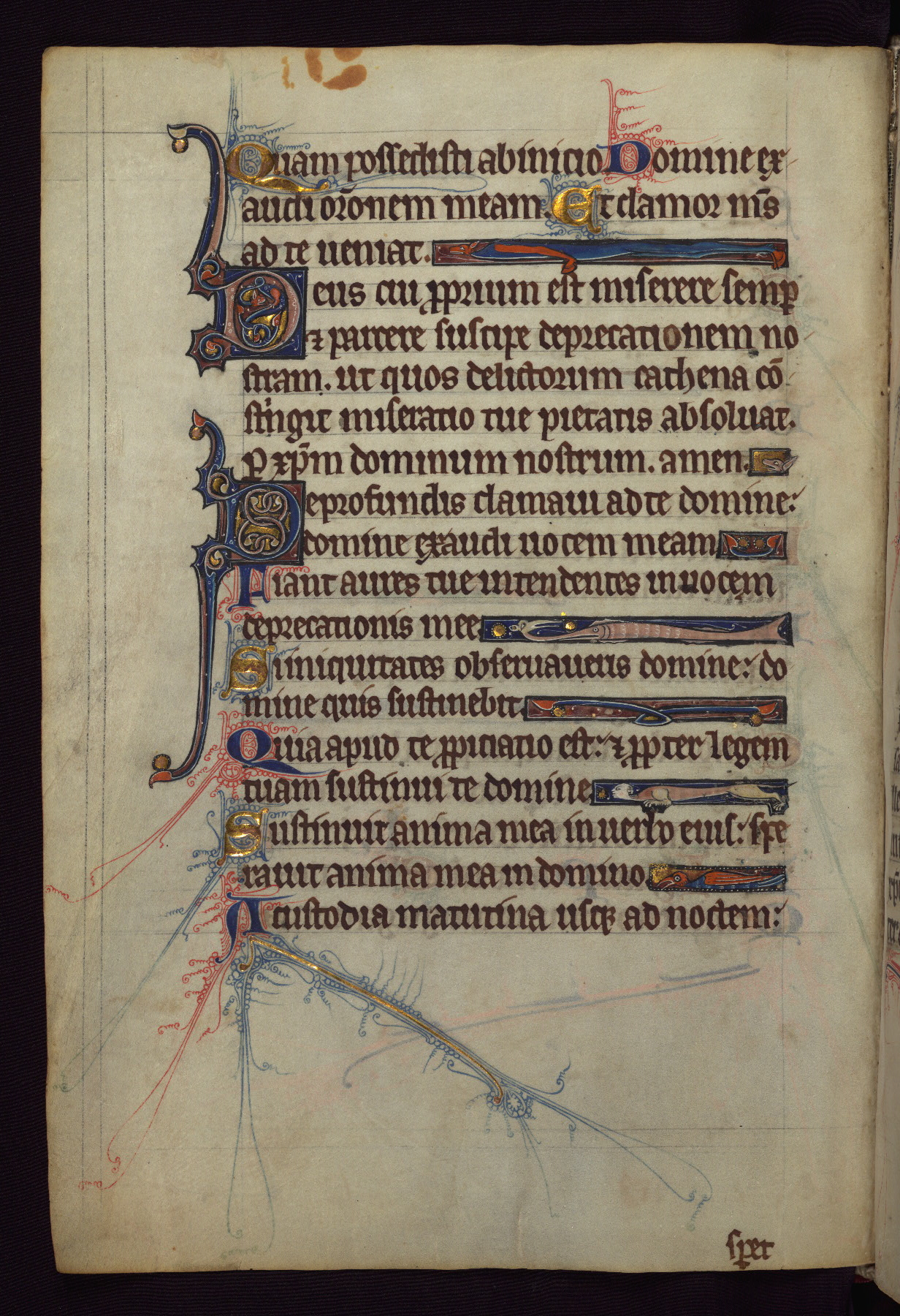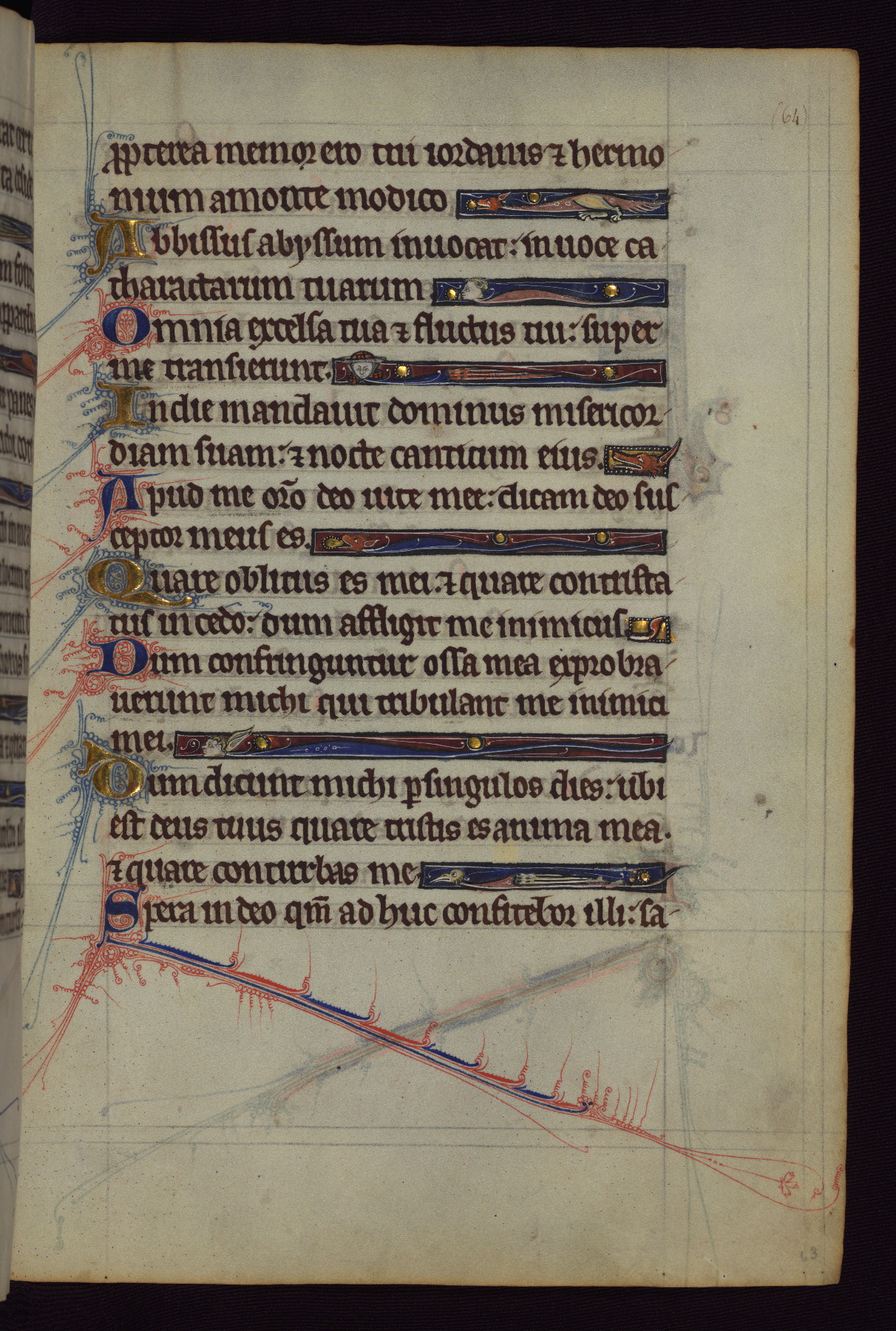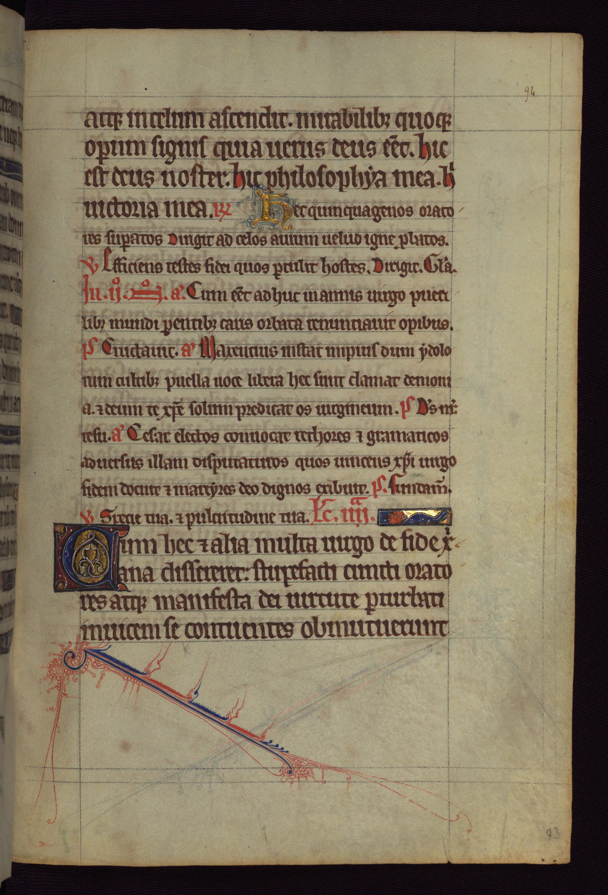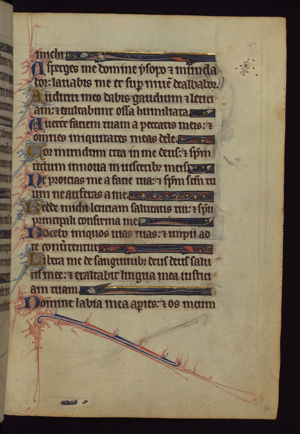 This finely illuminated and iconographically rich book of hours was made in England at the end of the thirteenth century. The manuscript is incomplete and misbound. Its main artist can also be found at work in a Bible (Oxford, Bodleian Library Ms. Auct. D.3.2) and a psalter (Cambridge, Trinity College Cambridge Ms. O.4.16). The manuscript contains a number of unusual texts, including the Hours of Jesus Crucified and the Office of St. Catherine. The patron of the manuscript is not clear; a woman is depicted as praying in many of the initials, but rubrics in the Office of the Dead mention "freres" (brothers). The imagery is inventive, and the Hours of Christ Crucified are graced with images depicting the funeral of Reynard the Fox in its margins. In the absence of a calendar, it is not possible to locate the origin of the manuscript precisely.