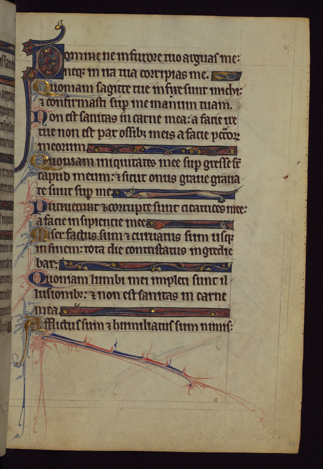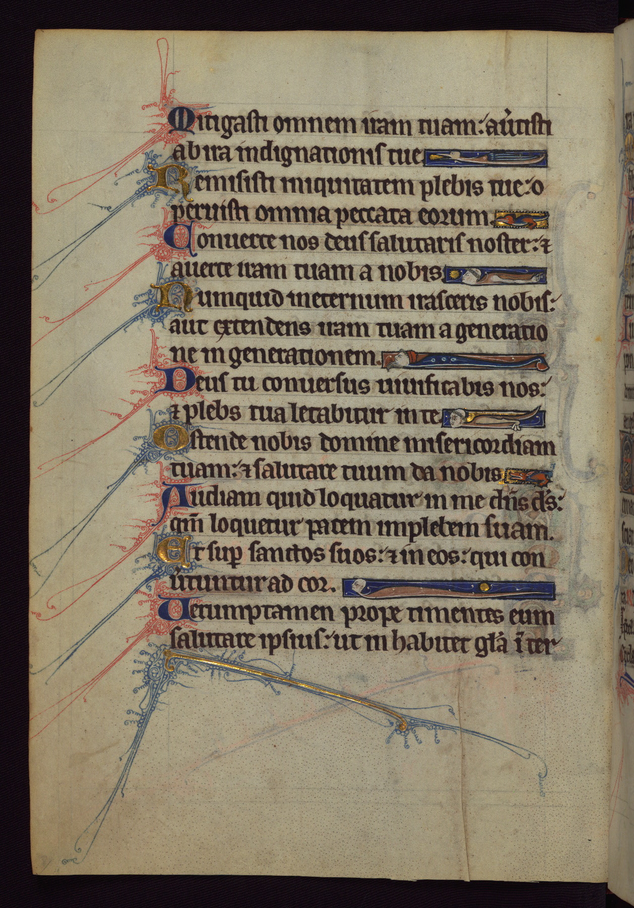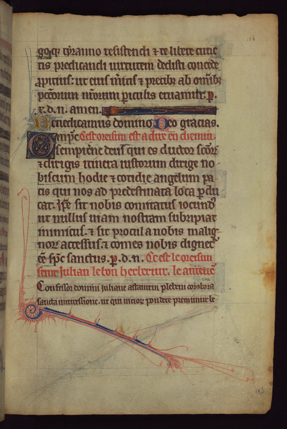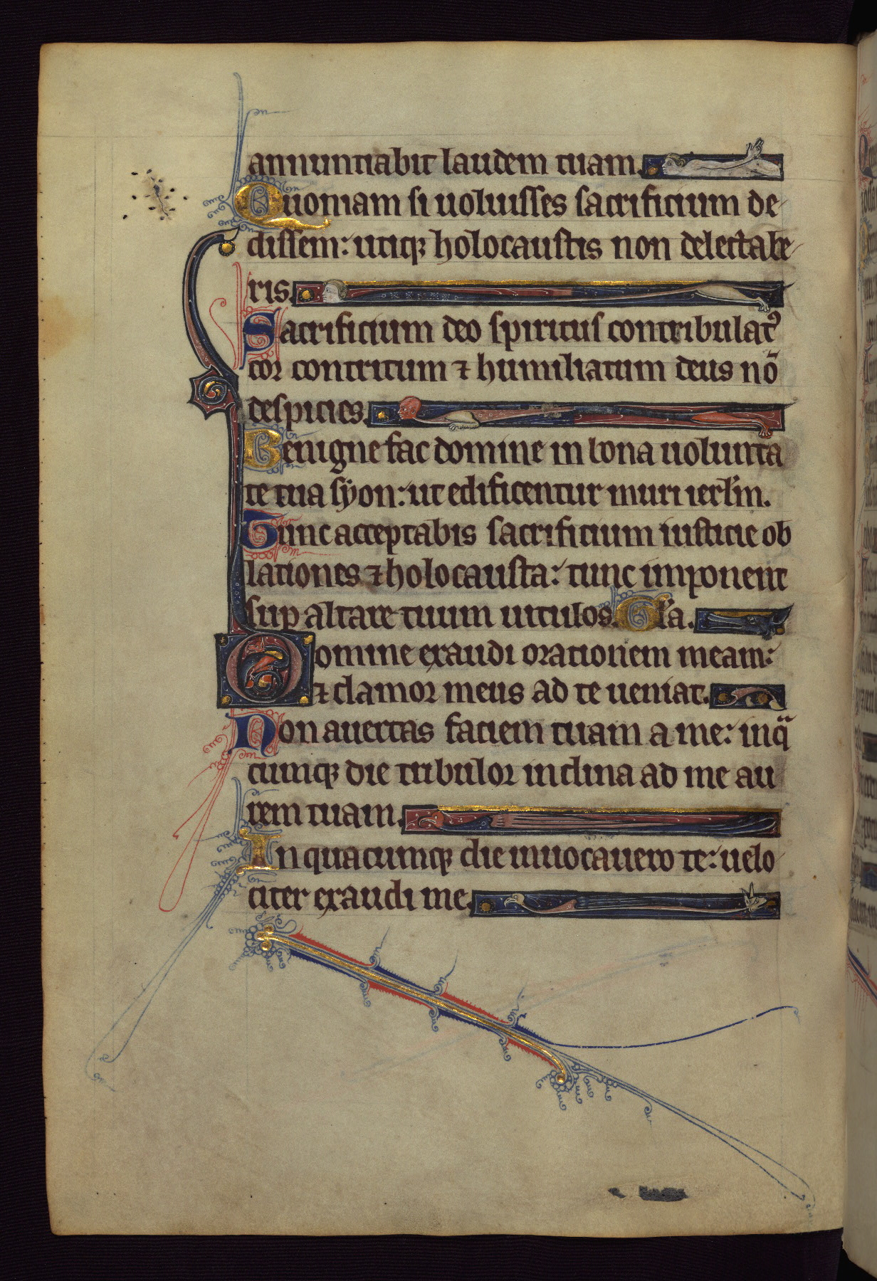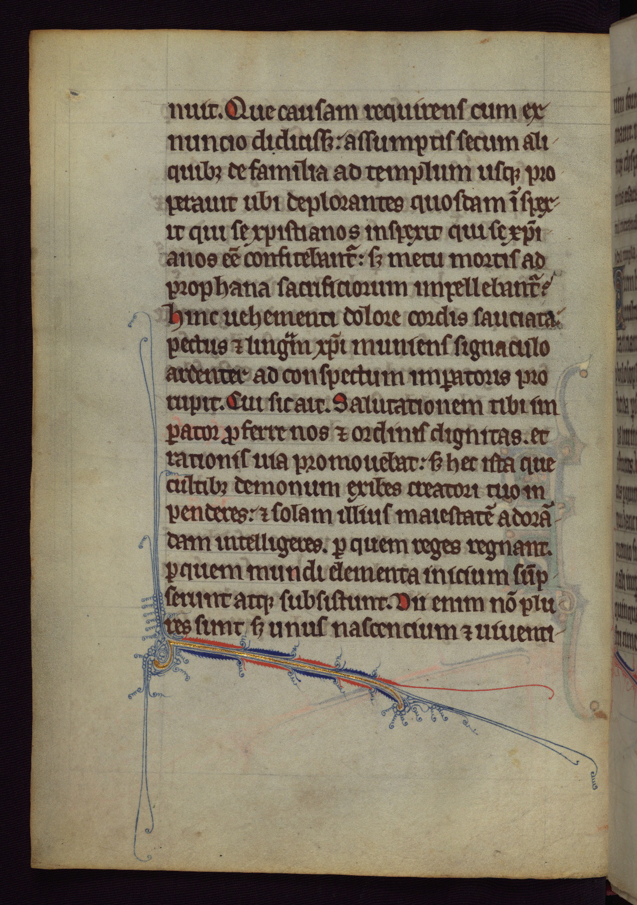 This finely illuminated and iconographically rich book of hours was made in England at the end of the thirteenth century. The manuscript is incomplete and misbound. Its main artist can also be found at work in a Bible (Oxford, Bodleian Library Ms. Auct. D.3.2) and a psalter (Cambridge, Trinity College Cambridge Ms. O.4.16). The manuscript contains a number of unusual texts, including the Hours of Jesus Crucified and the Office of St. Catherine. The patron of the manuscript is not clear; a woman is depicted as praying in many of the initials, but rubrics in the Office of the Dead mention "freres" (brothers). The imagery is inventive, and the Hours of Christ Crucified are graced with images depicting the funeral of Reynard the Fox in its margins. In the absence of a calendar, it is not possible to locate the origin of the manuscript precisely.