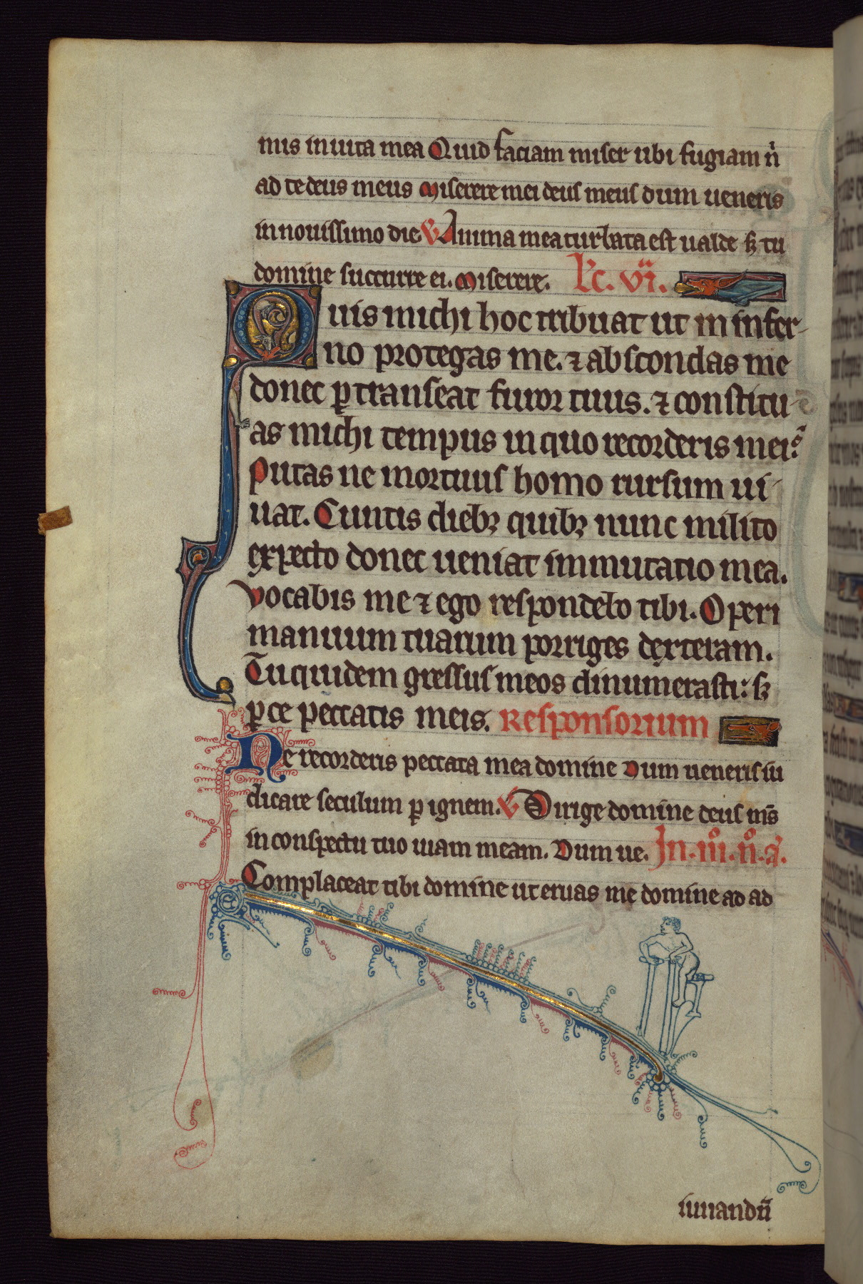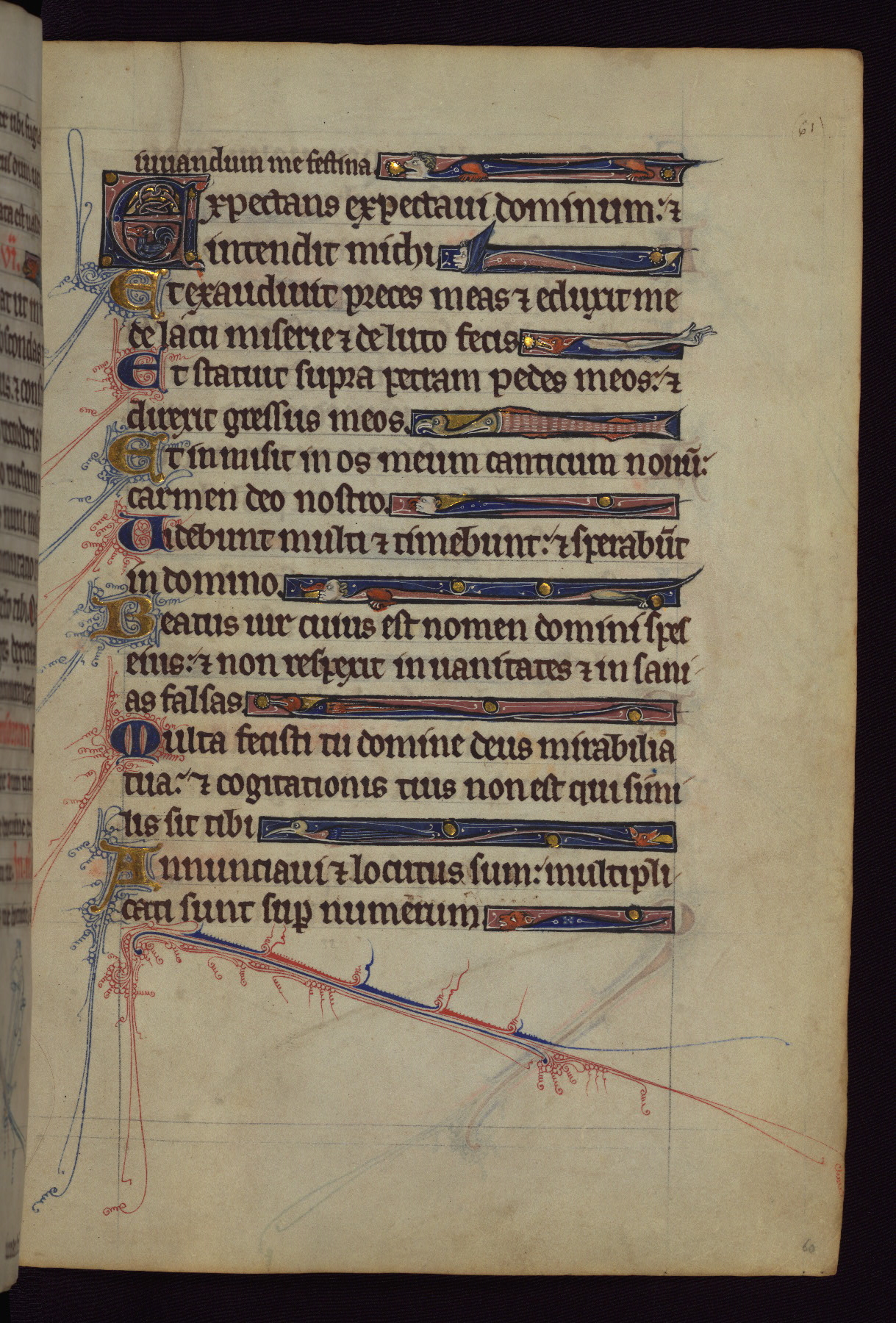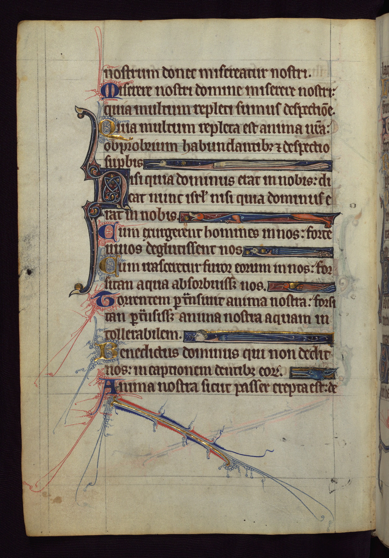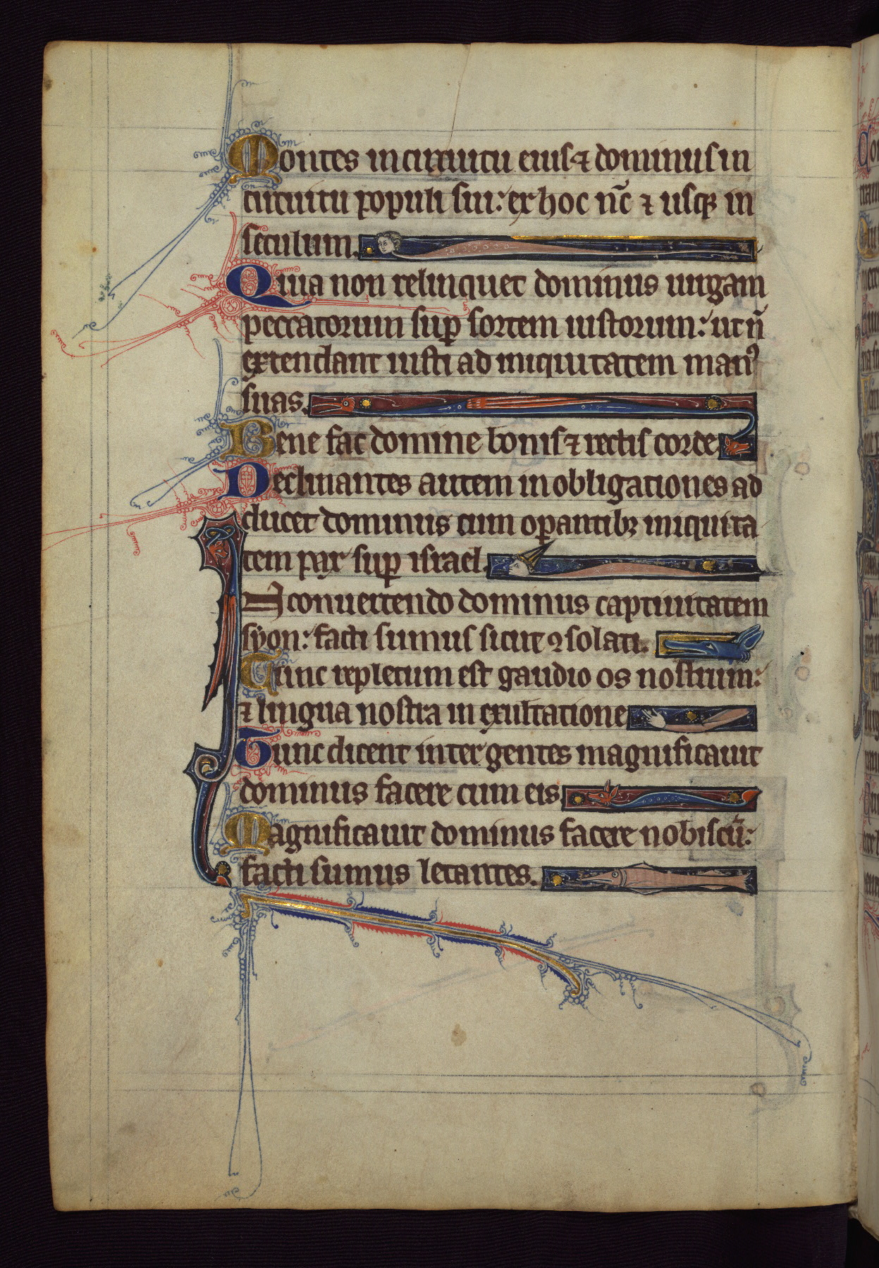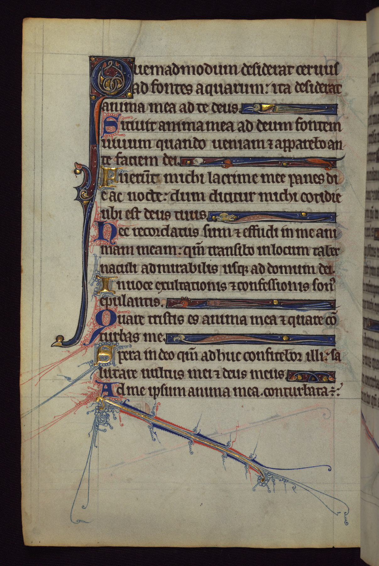 This finely illuminated and iconographically rich book of hours was made in England at the end of the thirteenth century. The manuscript is incomplete and misbound. Its main artist can also be found at work in a Bible (Oxford, Bodleian Library Ms. Auct. D.3.2) and a psalter (Cambridge, Trinity College Cambridge Ms. O.4.16). The manuscript contains a number of unusual texts, including the Hours of Jesus Crucified and the Office of St. Catherine. The patron of the manuscript is not clear; a woman is depicted as praying in many of the initials, but rubrics in the Office of the Dead mention "freres" (brothers). The imagery is inventive, and the Hours of Christ Crucified are graced with images depicting the funeral of Reynard the Fox in its margins. In the absence of a calendar, it is not possible to locate the origin of the manuscript precisely.