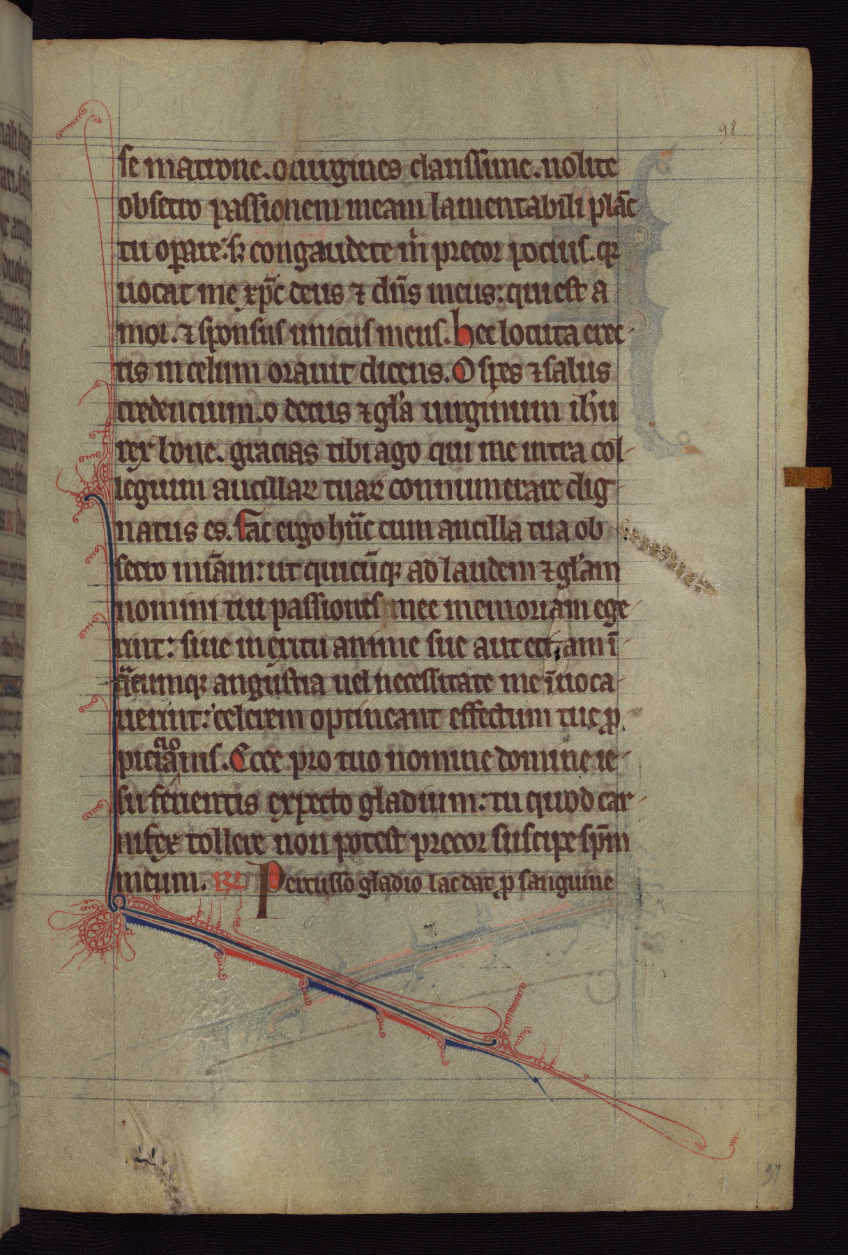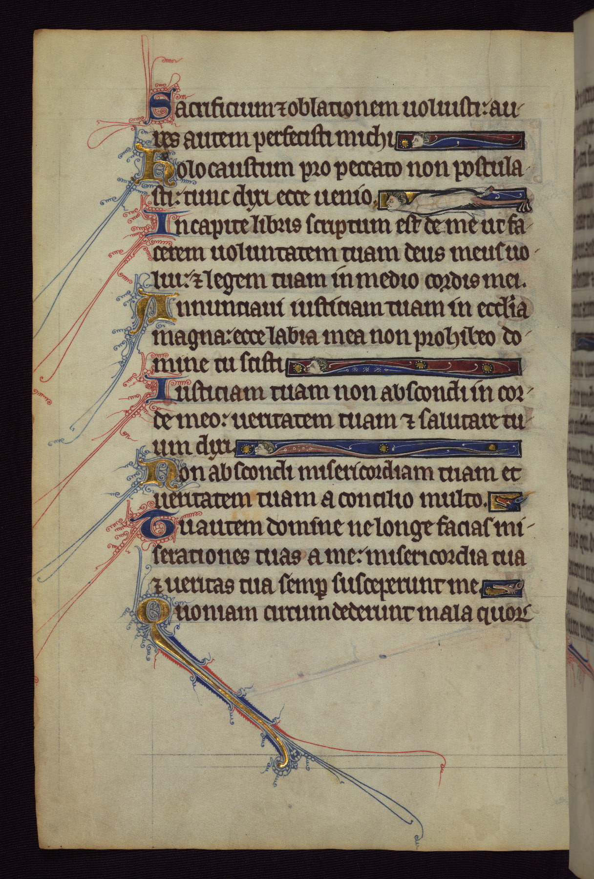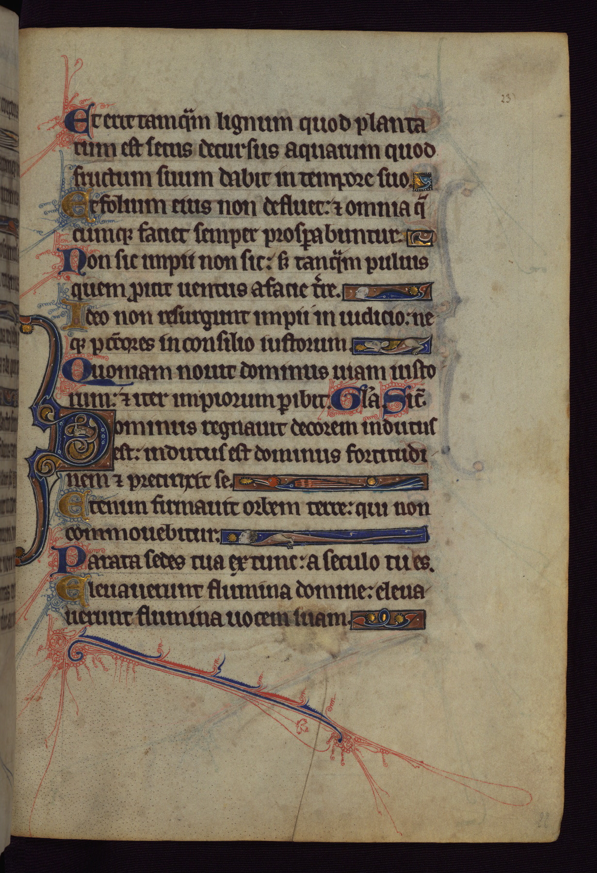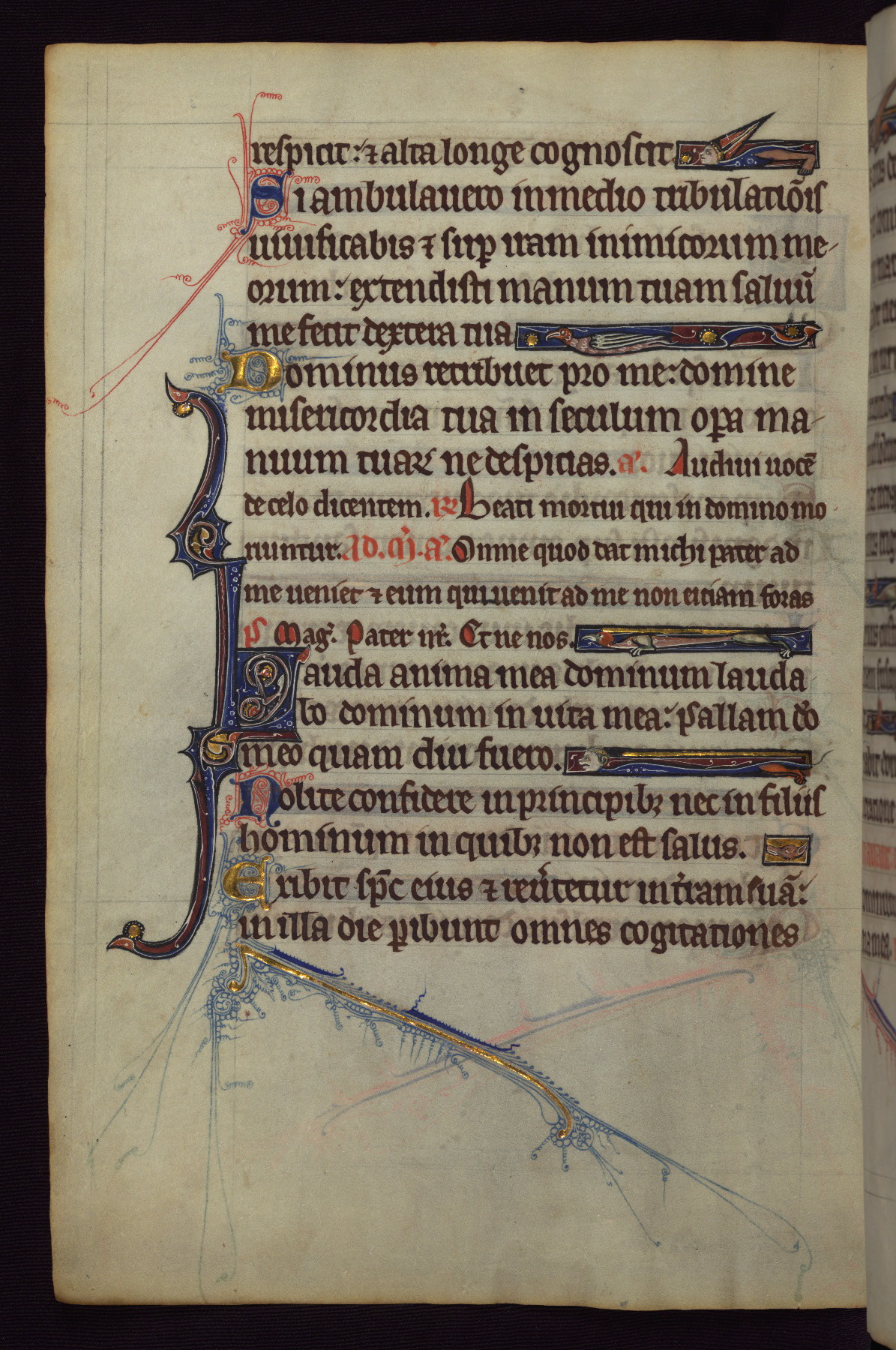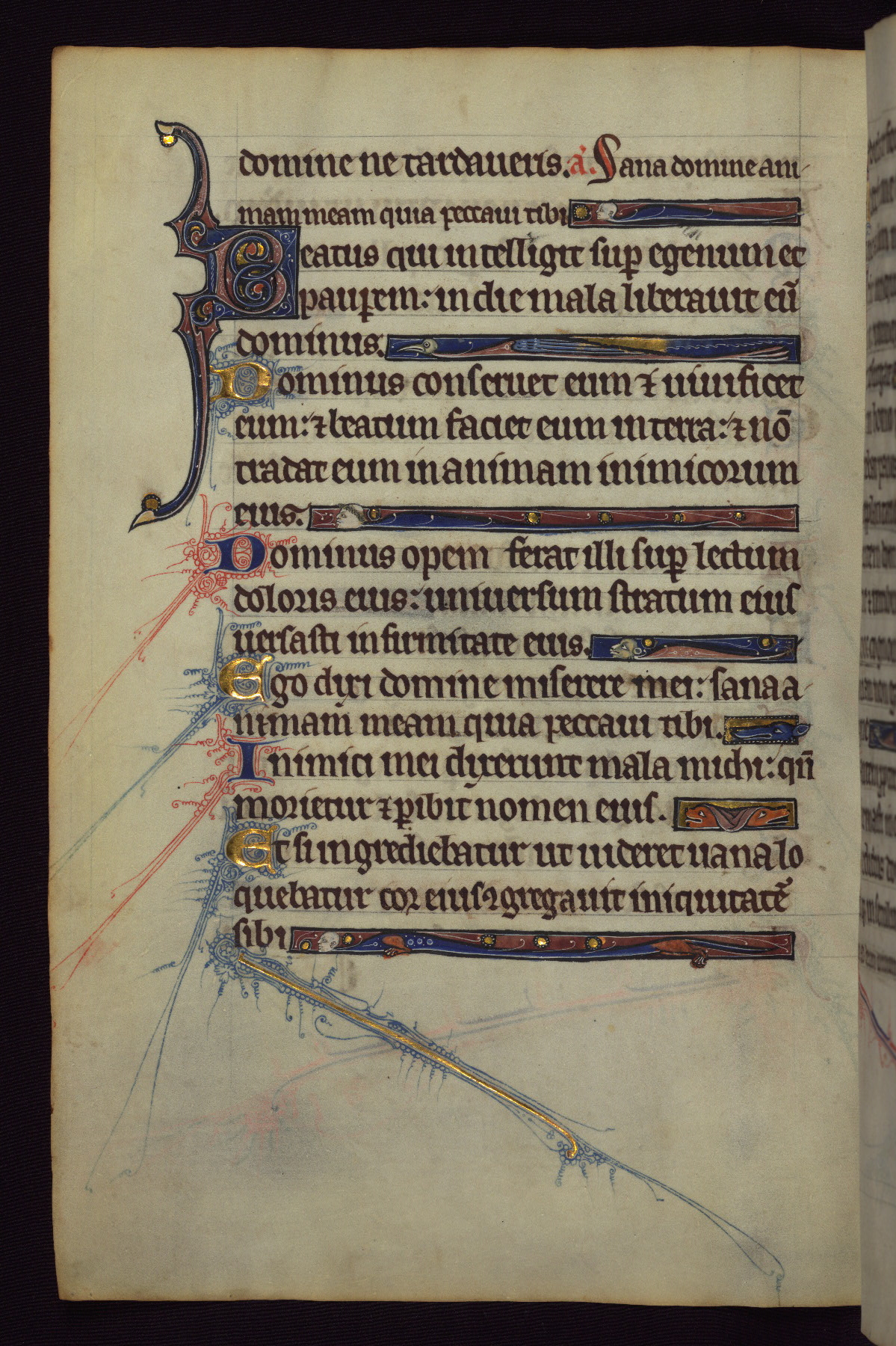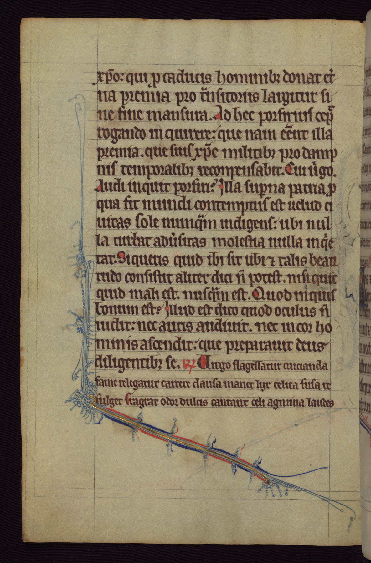 This finely illuminated and iconographically rich book of hours was made in England at the end of the thirteenth century. The manuscript is incomplete and misbound. Its main artist can also be found at work in a Bible (Oxford, Bodleian Library Ms. Auct. D.3.2) and a psalter (Cambridge, Trinity College Cambridge Ms. O.4.16). The manuscript contains a number of unusual texts, including the Hours of Jesus Crucified and the Office of St. Catherine. The patron of the manuscript is not clear; a woman is depicted as praying in many of the initials, but rubrics in the Office of the Dead mention "freres" (brothers). The imagery is inventive, and the Hours of Christ Crucified are graced with images depicting the funeral of Reynard the Fox in its margins. In the absence of a calendar, it is not possible to locate the origin of the manuscript precisely.