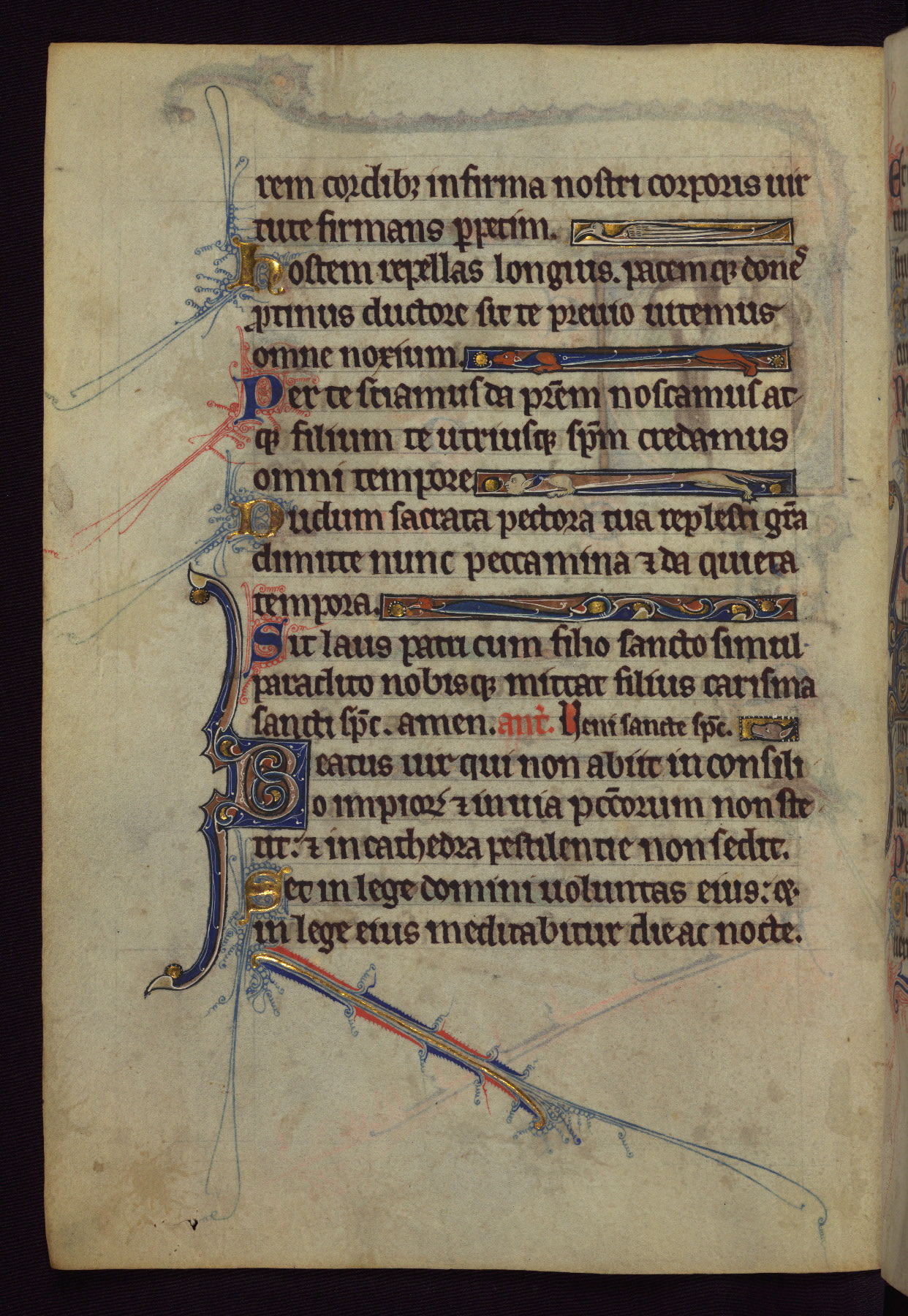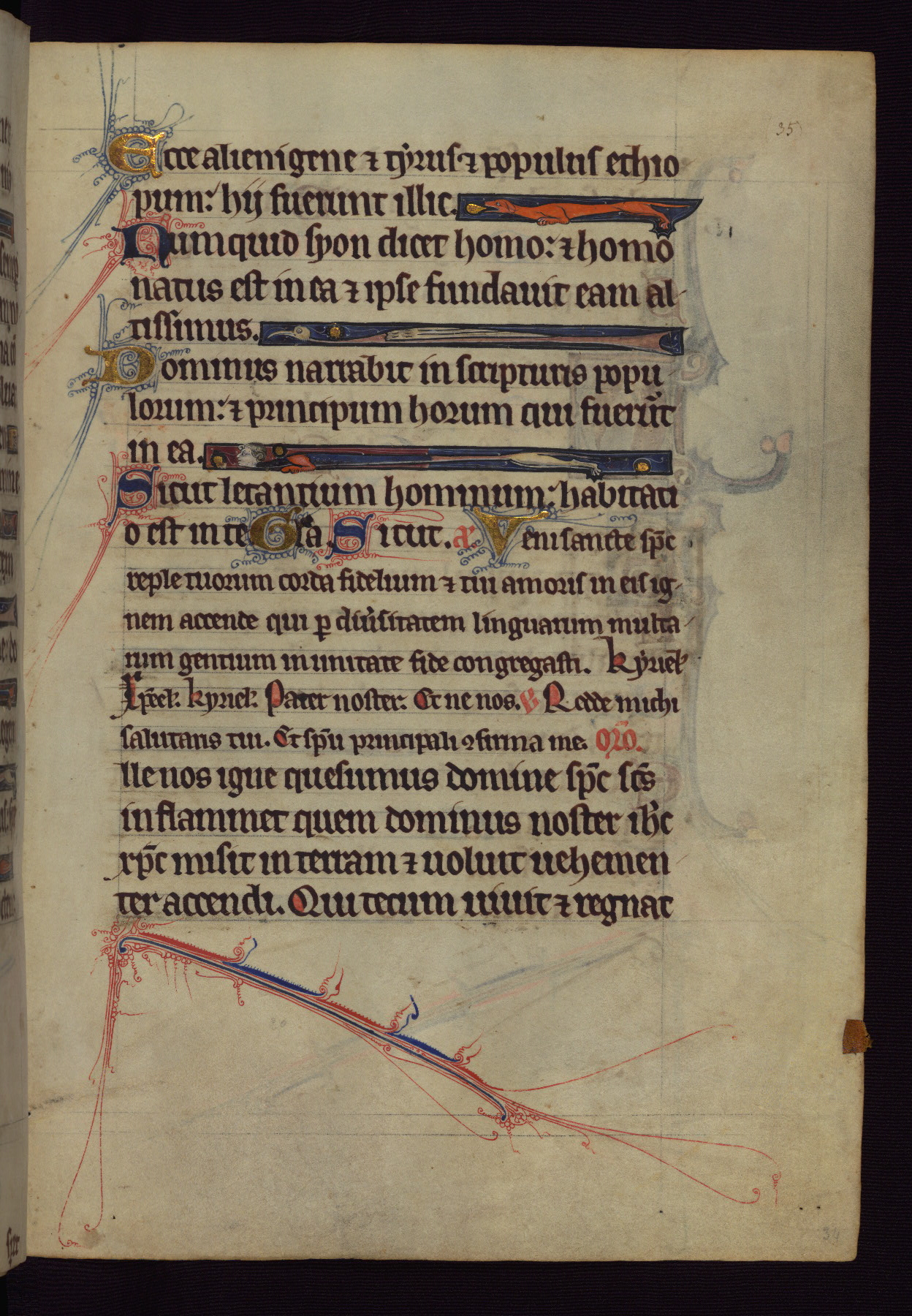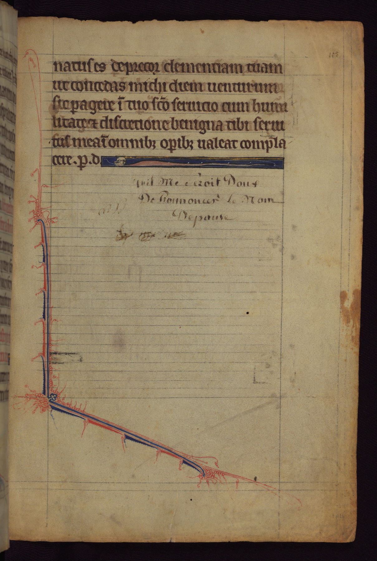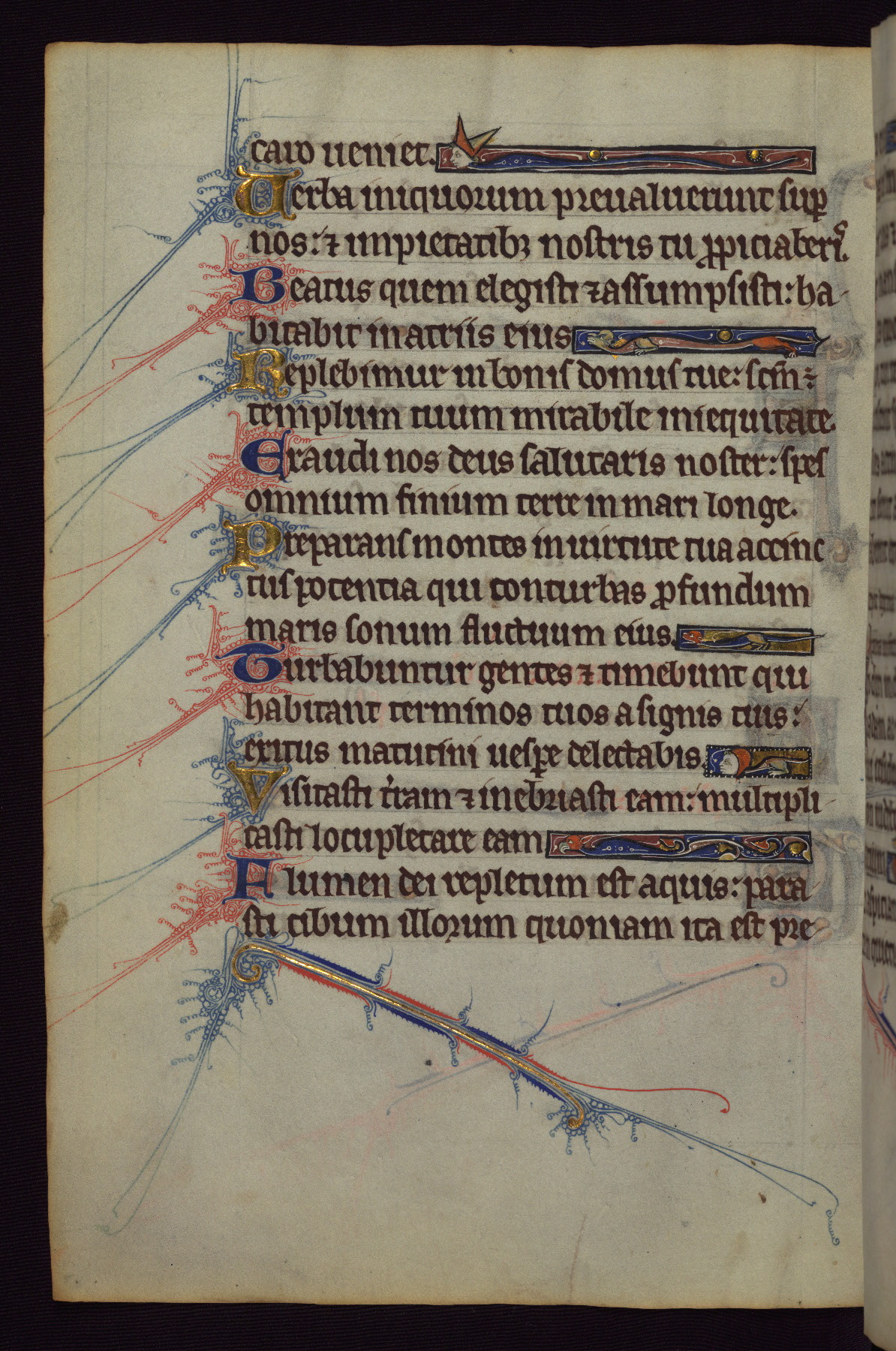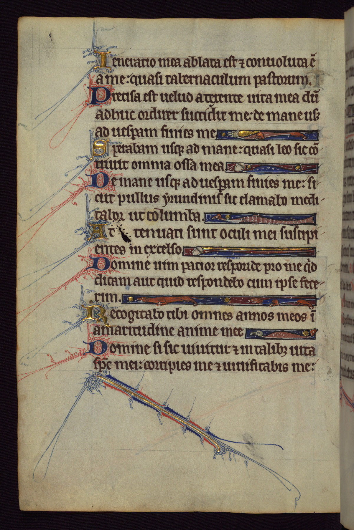 This finely illuminated and iconographically rich book of hours was made in England at the end of the thirteenth century. The manuscript is incomplete and misbound. Its main artist can also be found at work in a Bible (Oxford, Bodleian Library Ms. Auct. D.3.2) and a psalter (Cambridge, Trinity College Cambridge Ms. O.4.16). The manuscript contains a number of unusual texts, including the Hours of Jesus Crucified and the Office of St. Catherine. The patron of the manuscript is not clear; a woman is depicted as praying in many of the initials, but rubrics in the Office of the Dead mention "freres" (brothers). The imagery is inventive, and the Hours of Christ Crucified are graced with images depicting the funeral of Reynard the Fox in its margins. In the absence of a calendar, it is not possible to locate the origin of the manuscript precisely.
