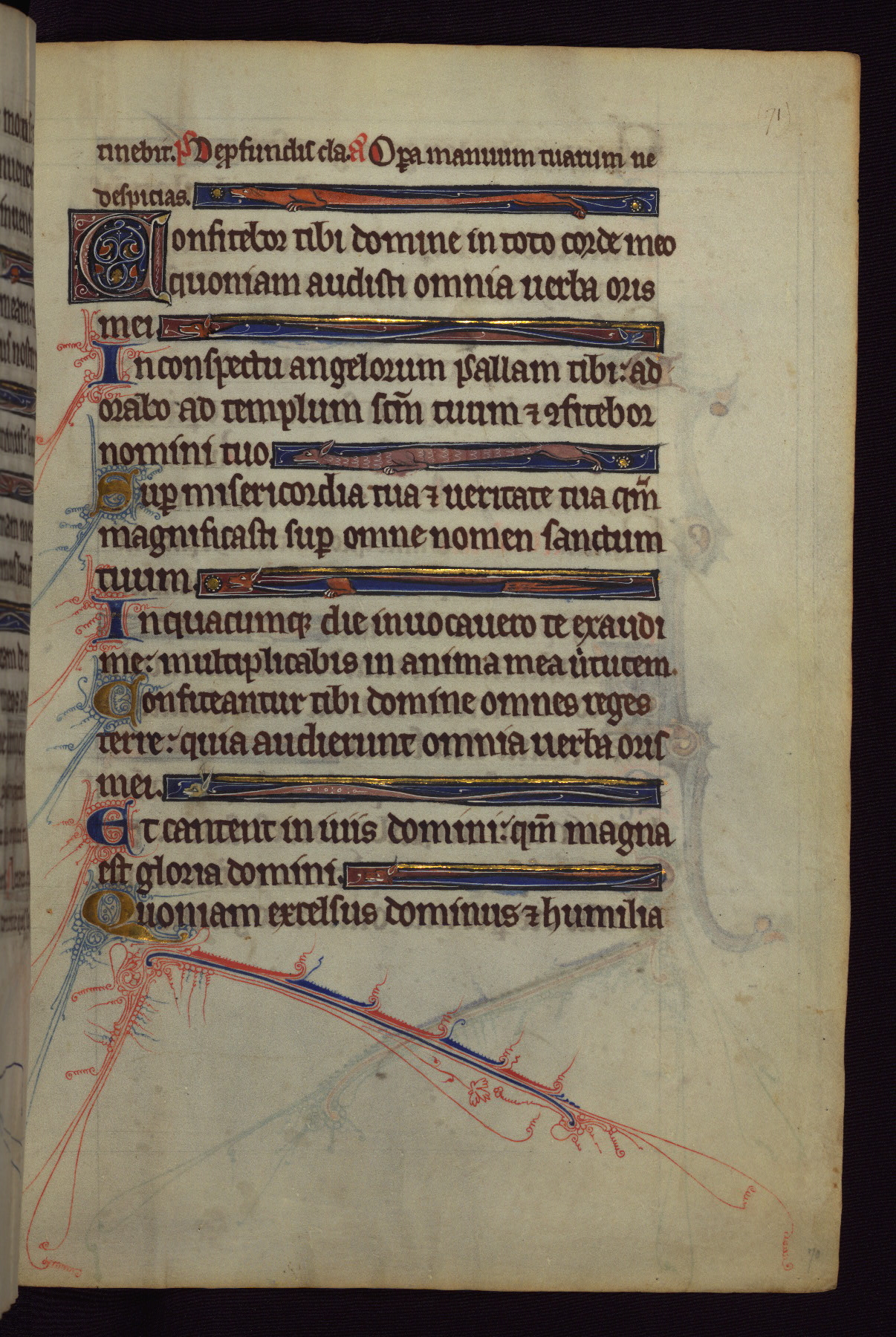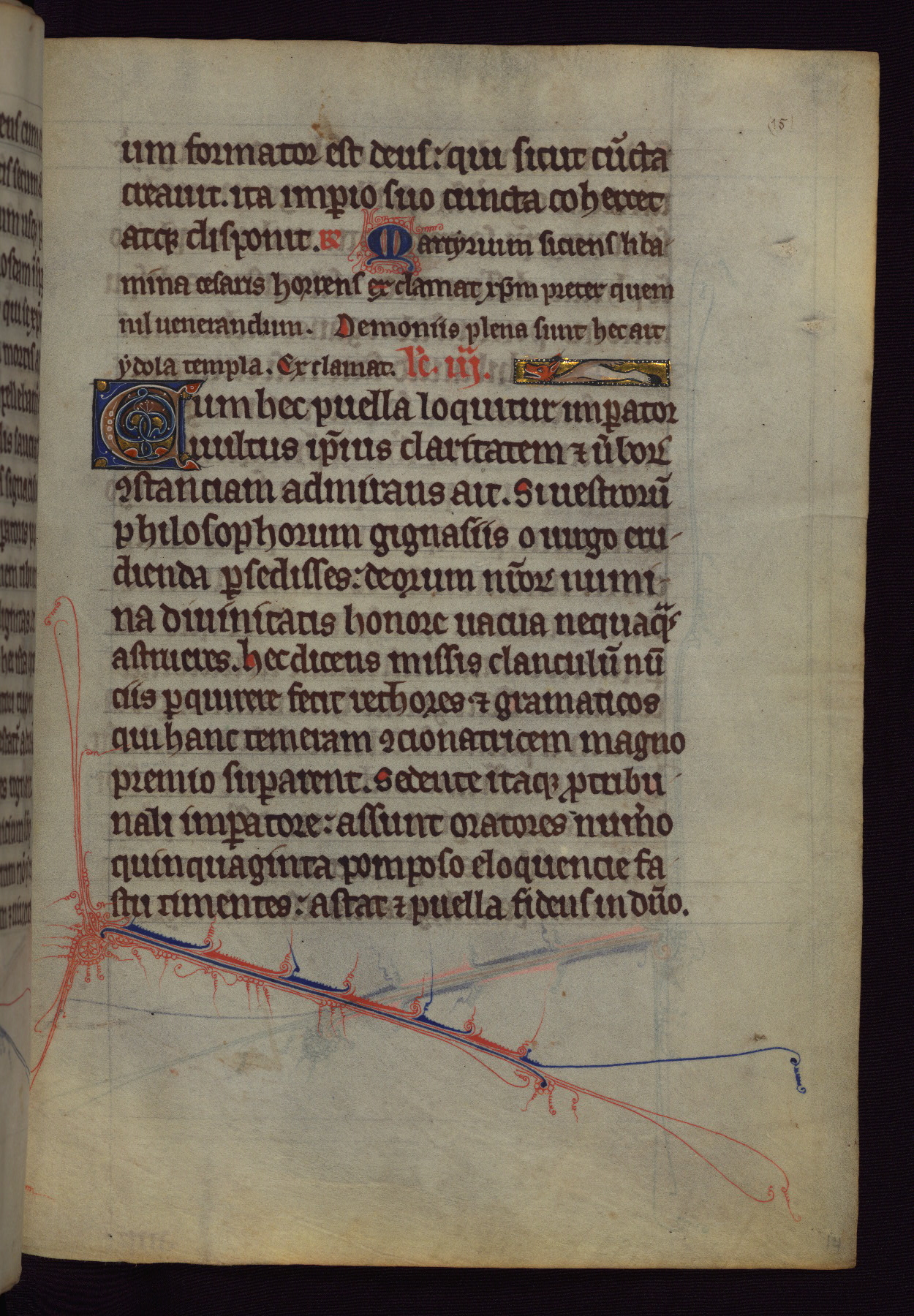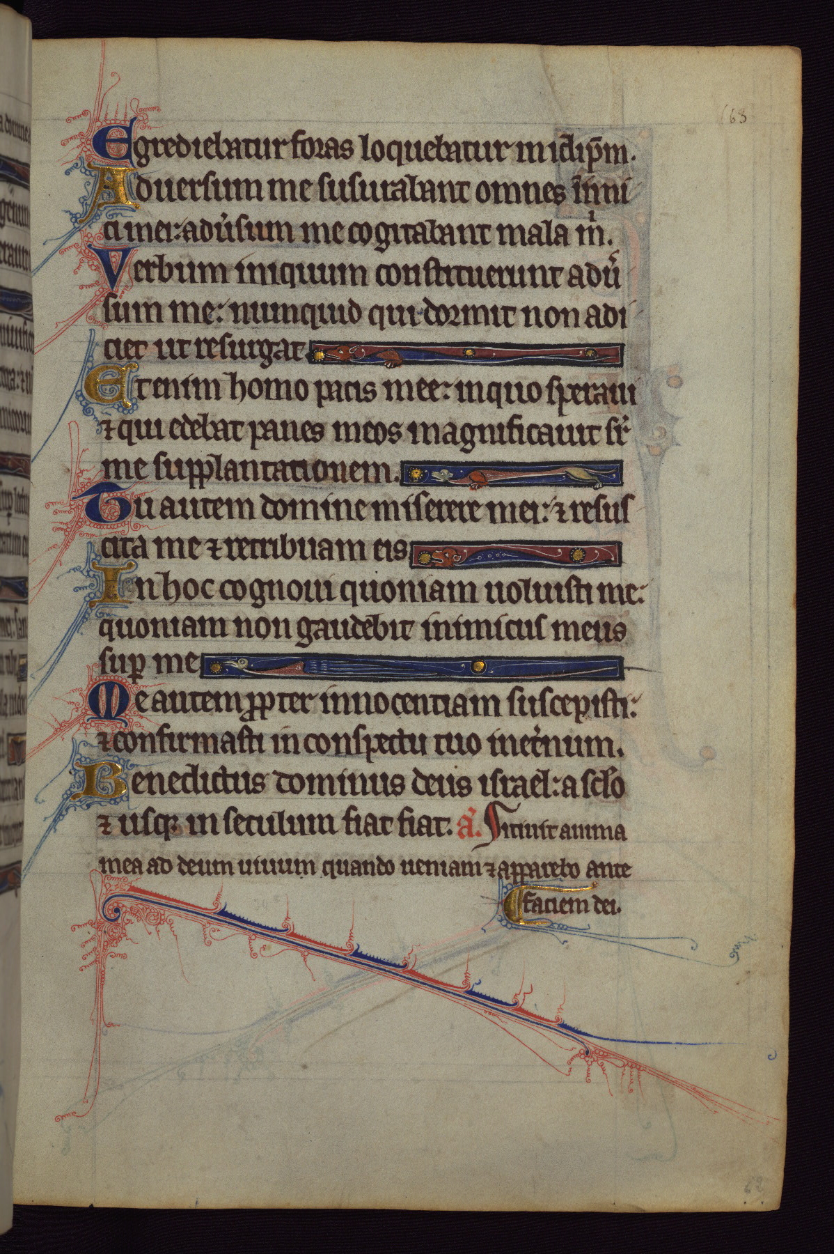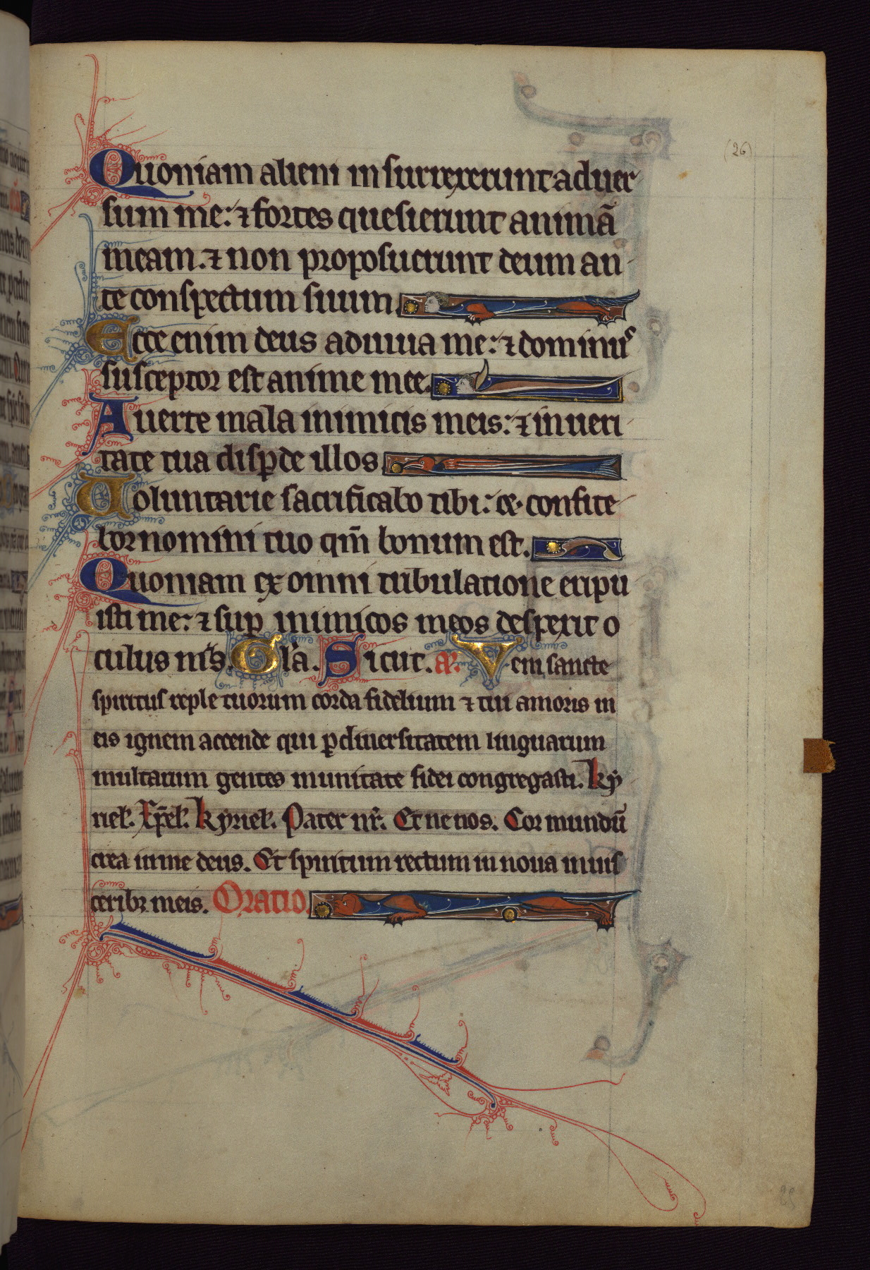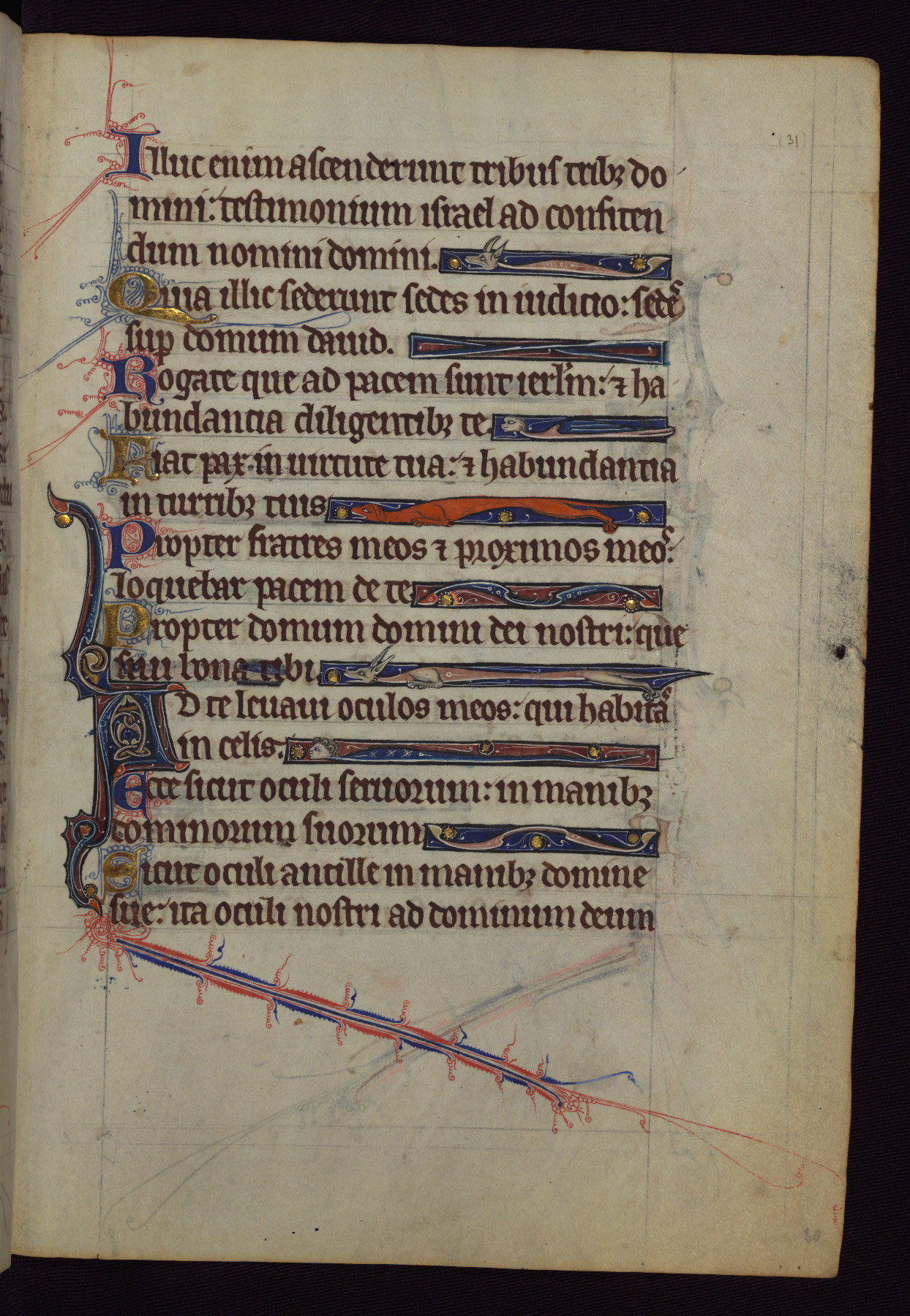 This finely illuminated and iconographically rich book of hours was made in England at the end of the thirteenth century. The manuscript is incomplete and misbound. Its main artist can also be found at work in a Bible (Oxford, Bodleian Library Ms. Auct. D.3.2) and a psalter (Cambridge, Trinity College Cambridge Ms. O.4.16). The manuscript contains a number of unusual texts, including the Hours of Jesus Crucified and the Office of St. Catherine. The patron of the manuscript is not clear; a woman is depicted as praying in many of the initials, but rubrics in the Office of the Dead mention "freres" (brothers). The imagery is inventive, and the Hours of Christ Crucified are graced with images depicting the funeral of Reynard the Fox in its margins. In the absence of a calendar, it is not possible to locate the origin of the manuscript precisely.