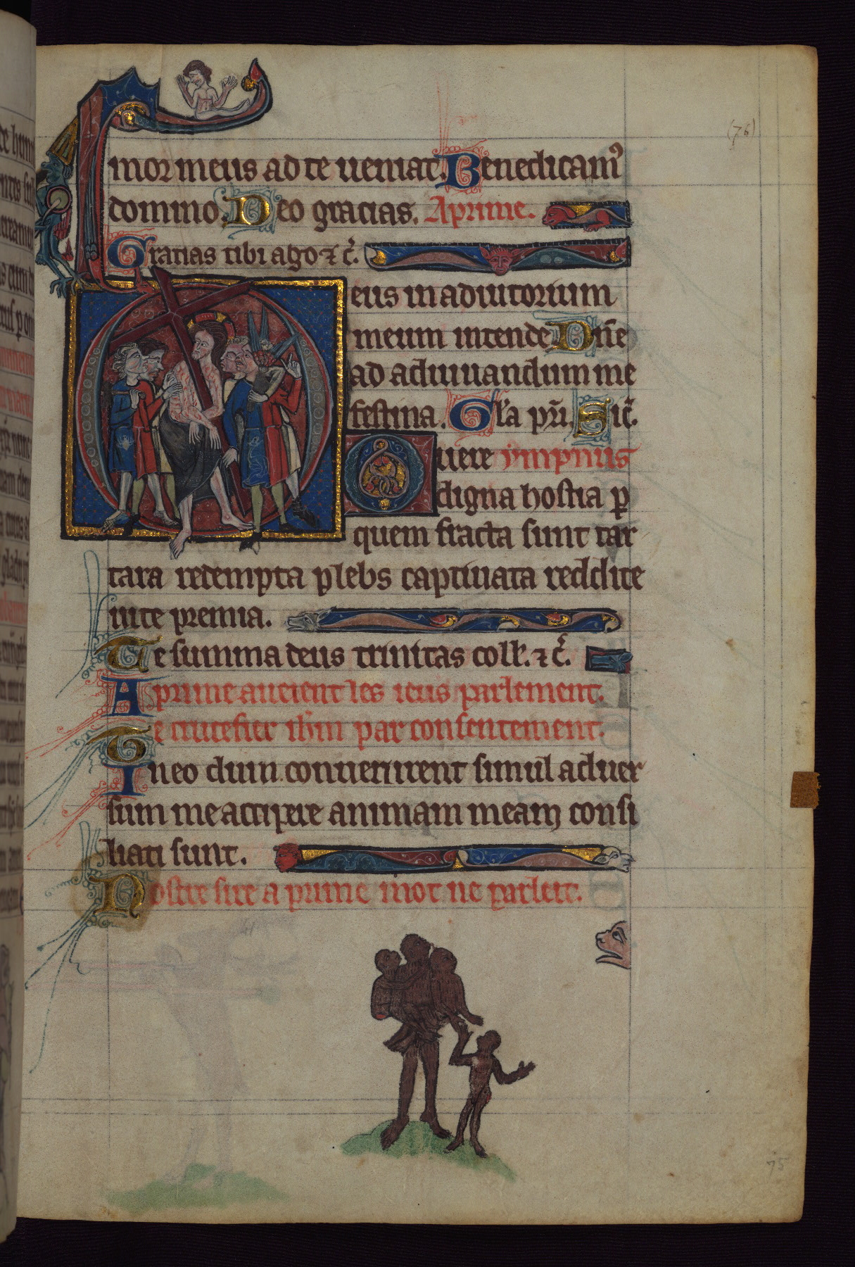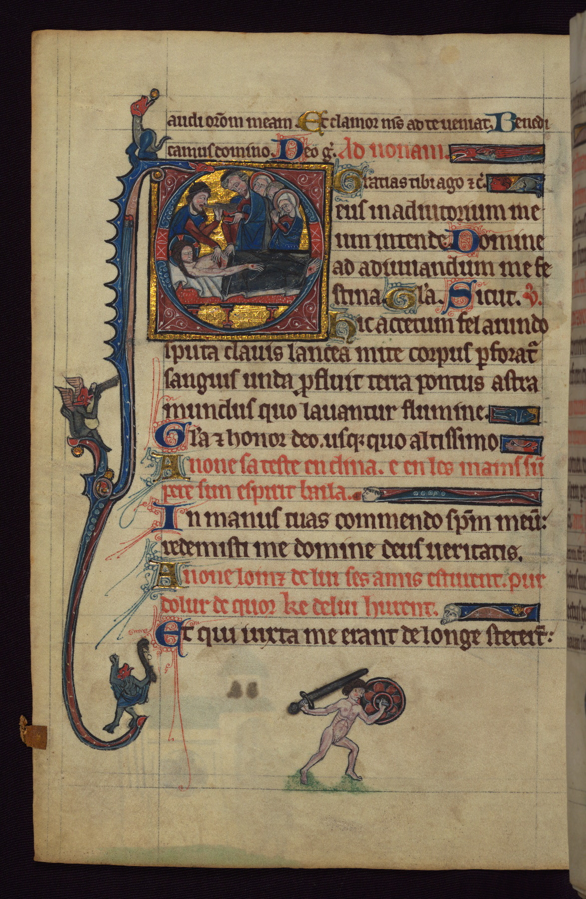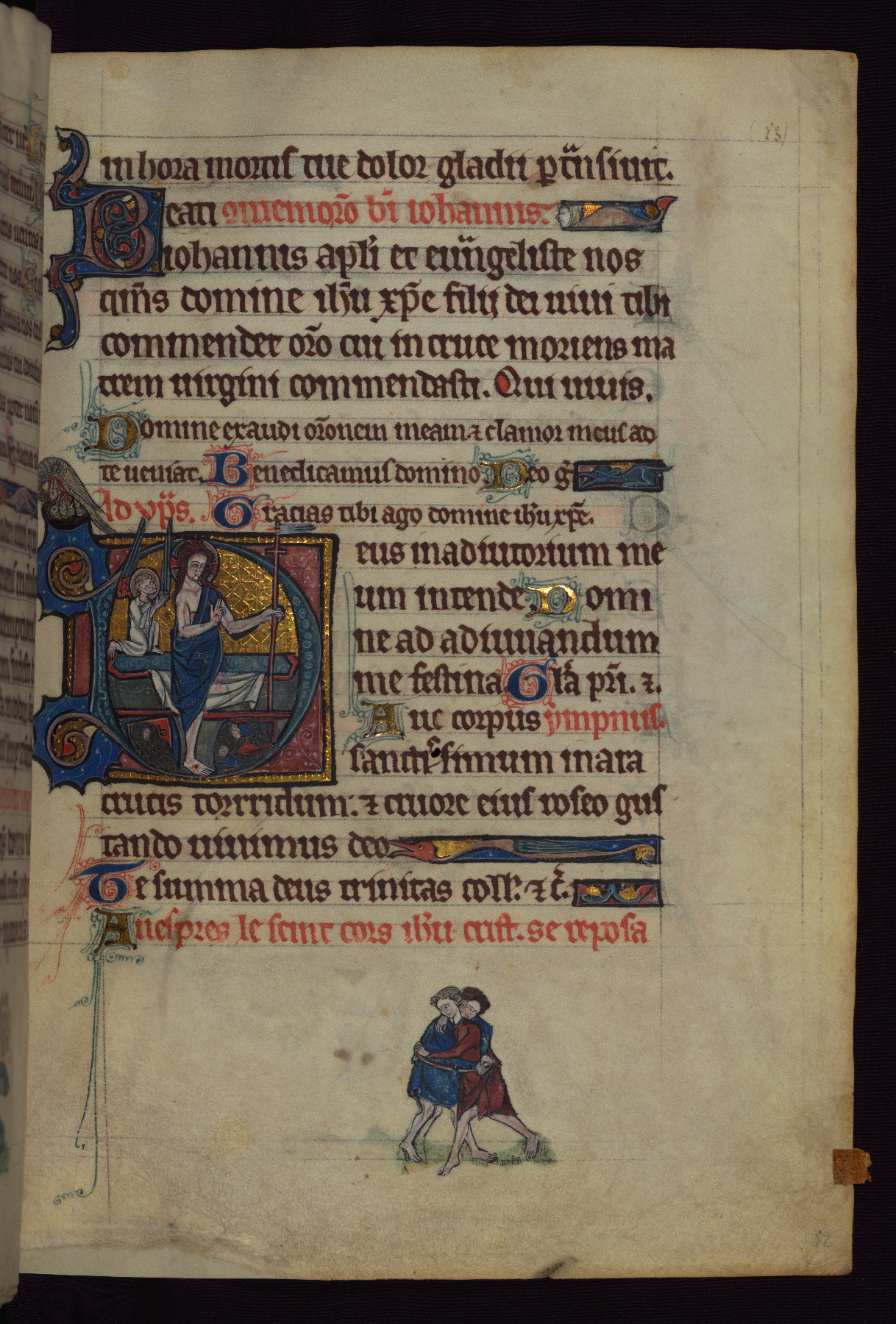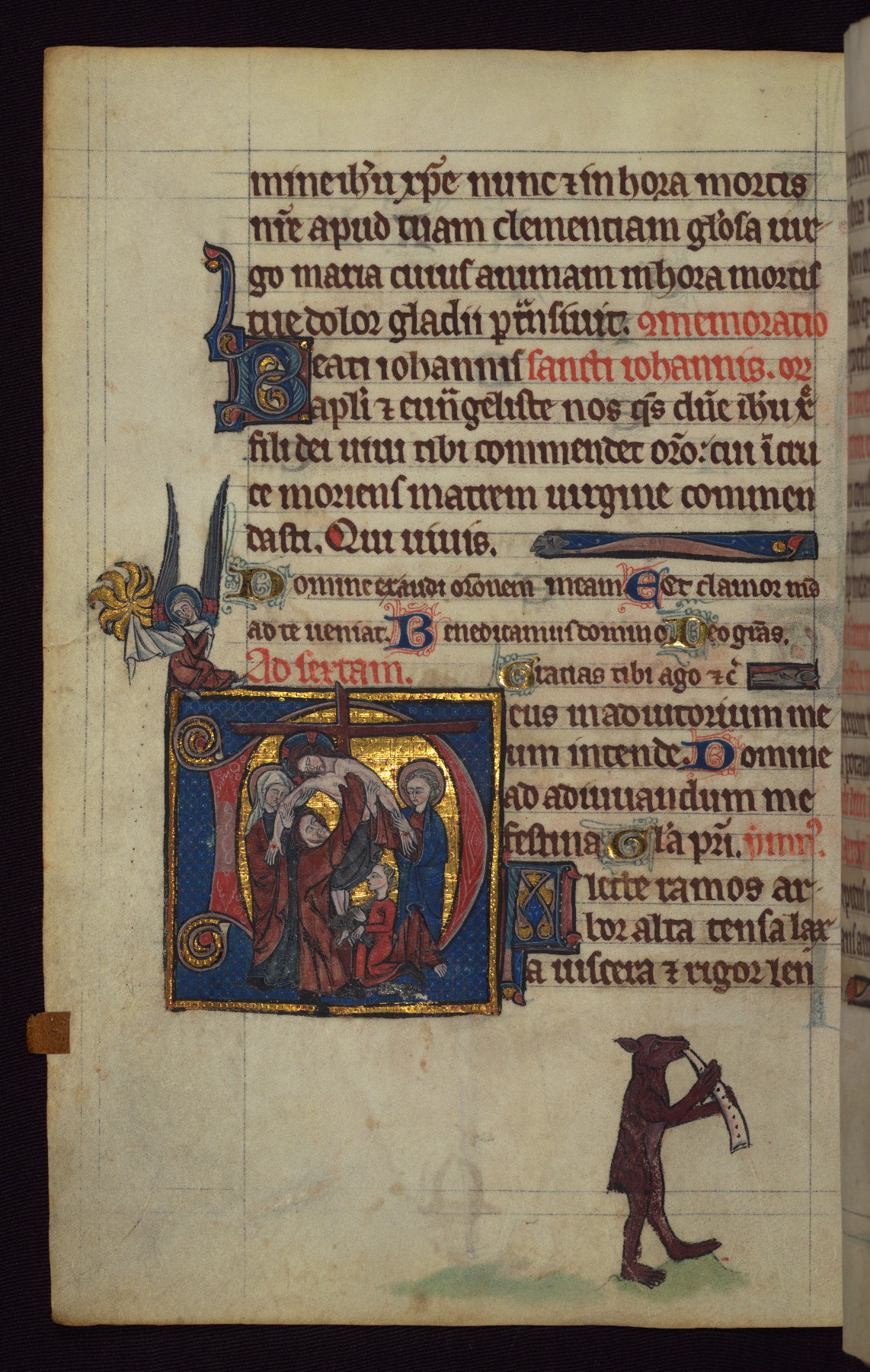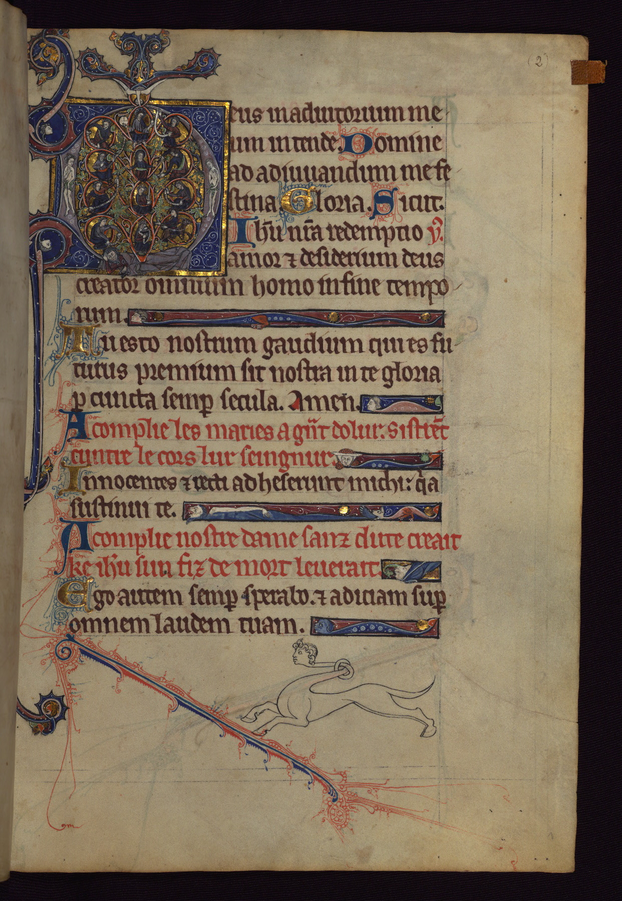 This finely illuminated and iconographically rich book of hours was made in England at the end of the thirteenth century. The manuscript is incomplete and misbound. Its main artist can also be found at work in a Bible (Oxford, Bodleian Library Ms. Auct. D.3.2) and a psalter (Cambridge, Trinity College Cambridge Ms. O.4.16). The manuscript contains a number of unusual texts, including the Hours of Jesus Crucified and the Office of St. Catherine. The patron of the manuscript is not clear; a woman is depicted as praying in many of the initials, but rubrics in the Office of the Dead mention "freres" (brothers). The imagery is inventive, and the Hours of Christ Crucified are graced with images depicting the funeral of Reynard the Fox in its margins. In the absence of a calendar, it is not possible to locate the origin of the manuscript precisely.