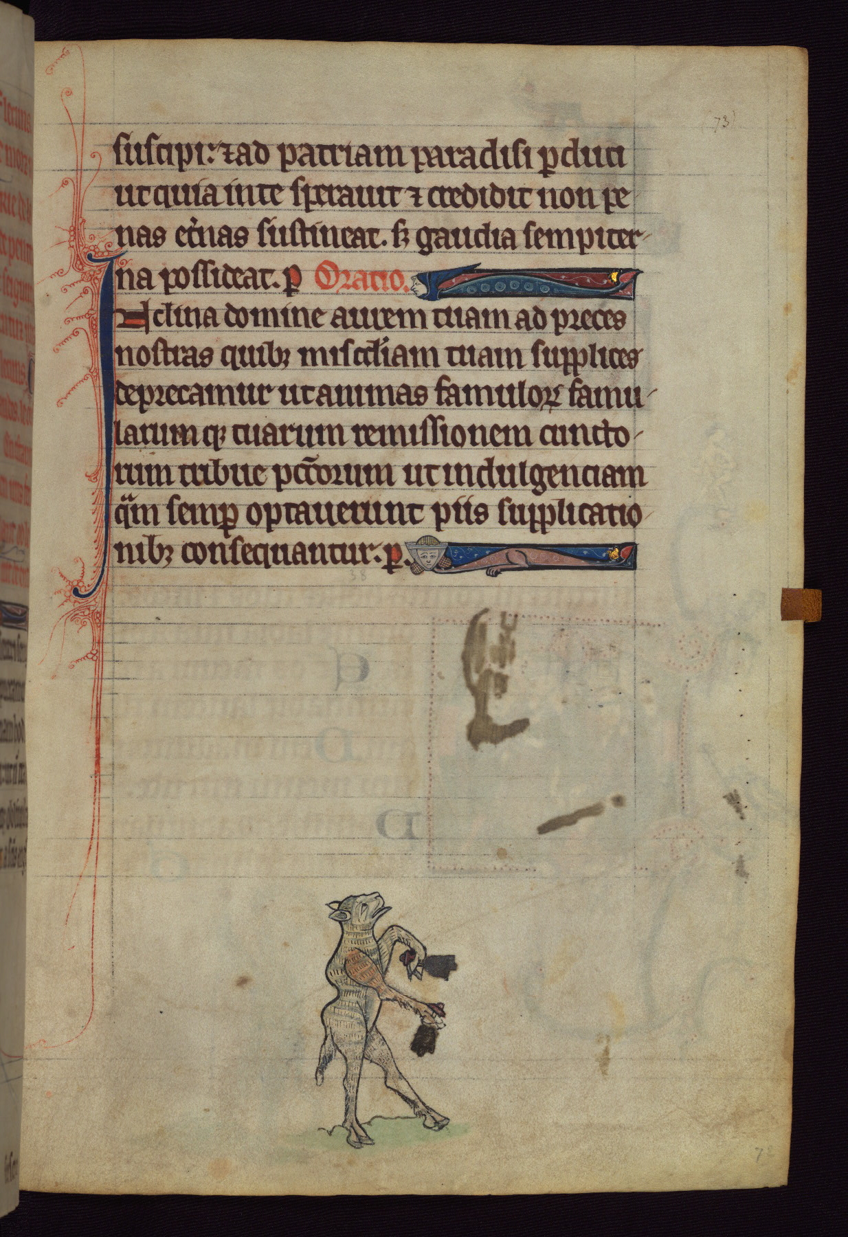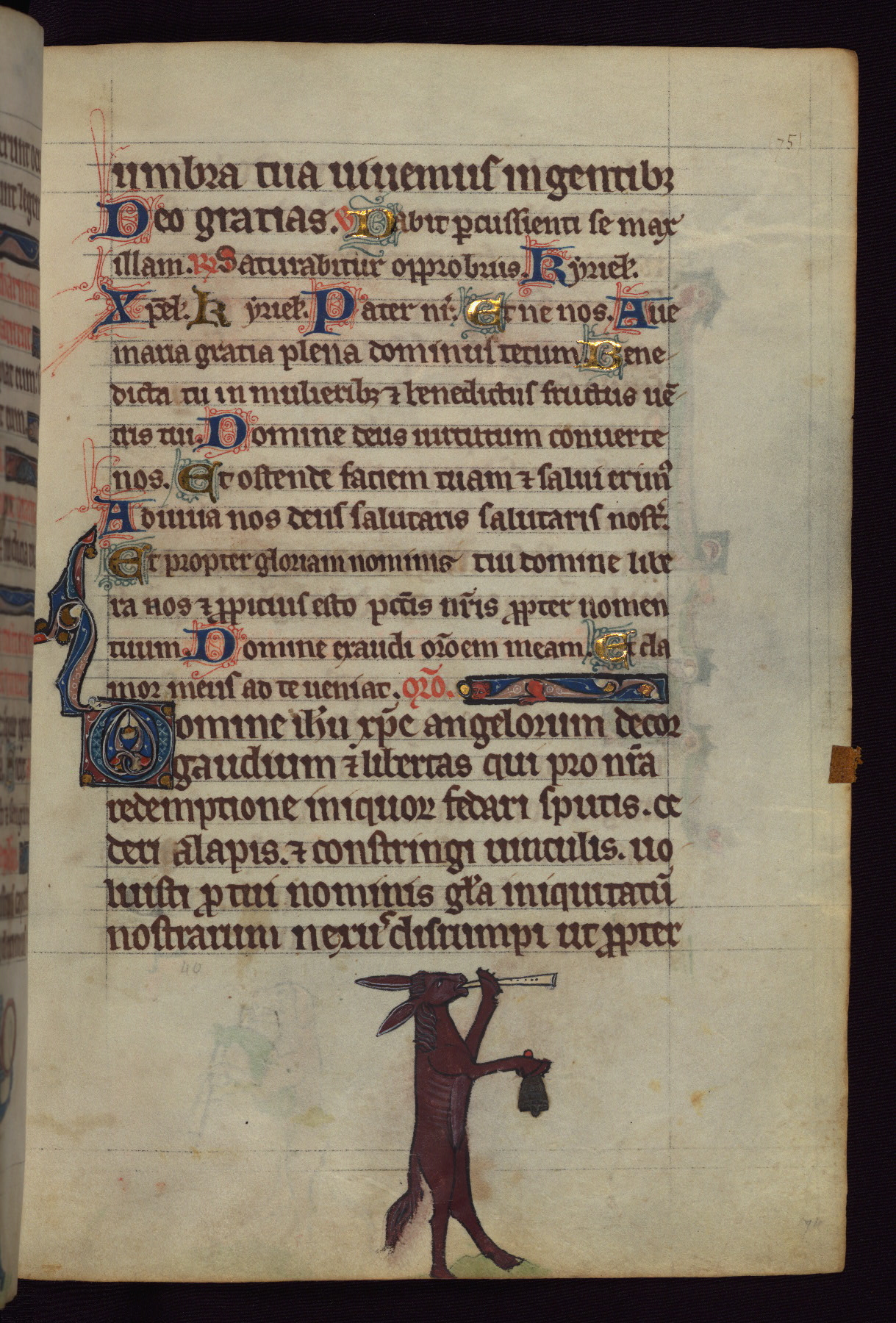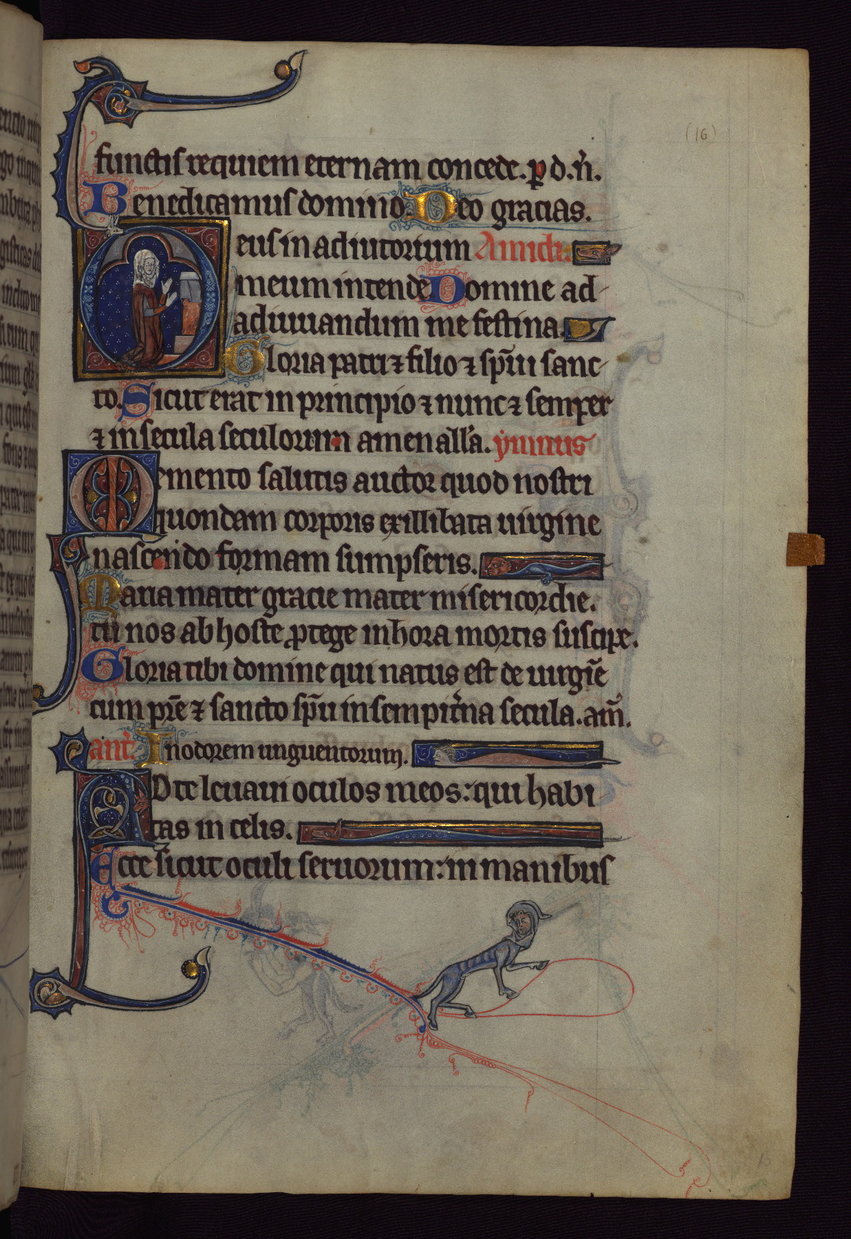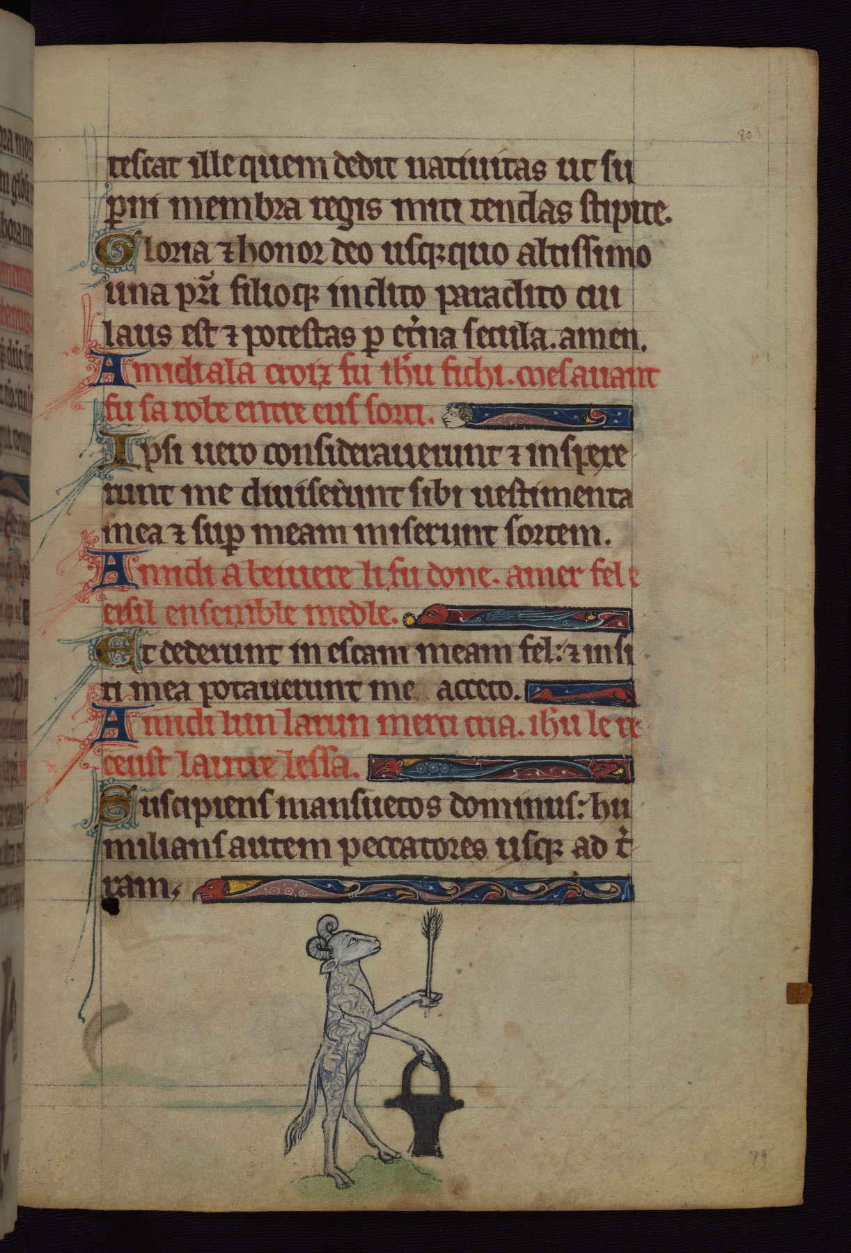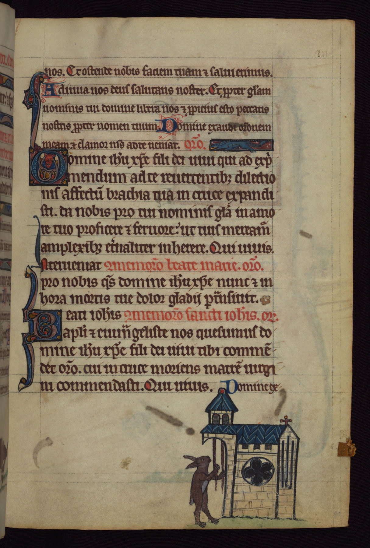 This finely illuminated and iconographically rich book of hours was made in England at the end of the thirteenth century. The manuscript is incomplete and misbound. Its main artist can also be found at work in a Bible (Oxford, Bodleian Library Ms. Auct. D.3.2) and a psalter (Cambridge, Trinity College Cambridge Ms. O.4.16). The manuscript contains a number of unusual texts, including the Hours of Jesus Crucified and the Office of St. Catherine. The patron of the manuscript is not clear; a woman is depicted as praying in many of the initials, but rubrics in the Office of the Dead mention "freres" (brothers). The imagery is inventive, and the Hours of Christ Crucified are graced with images depicting the funeral of Reynard the Fox in its margins. In the absence of a calendar, it is not possible to locate the origin of the manuscript precisely.