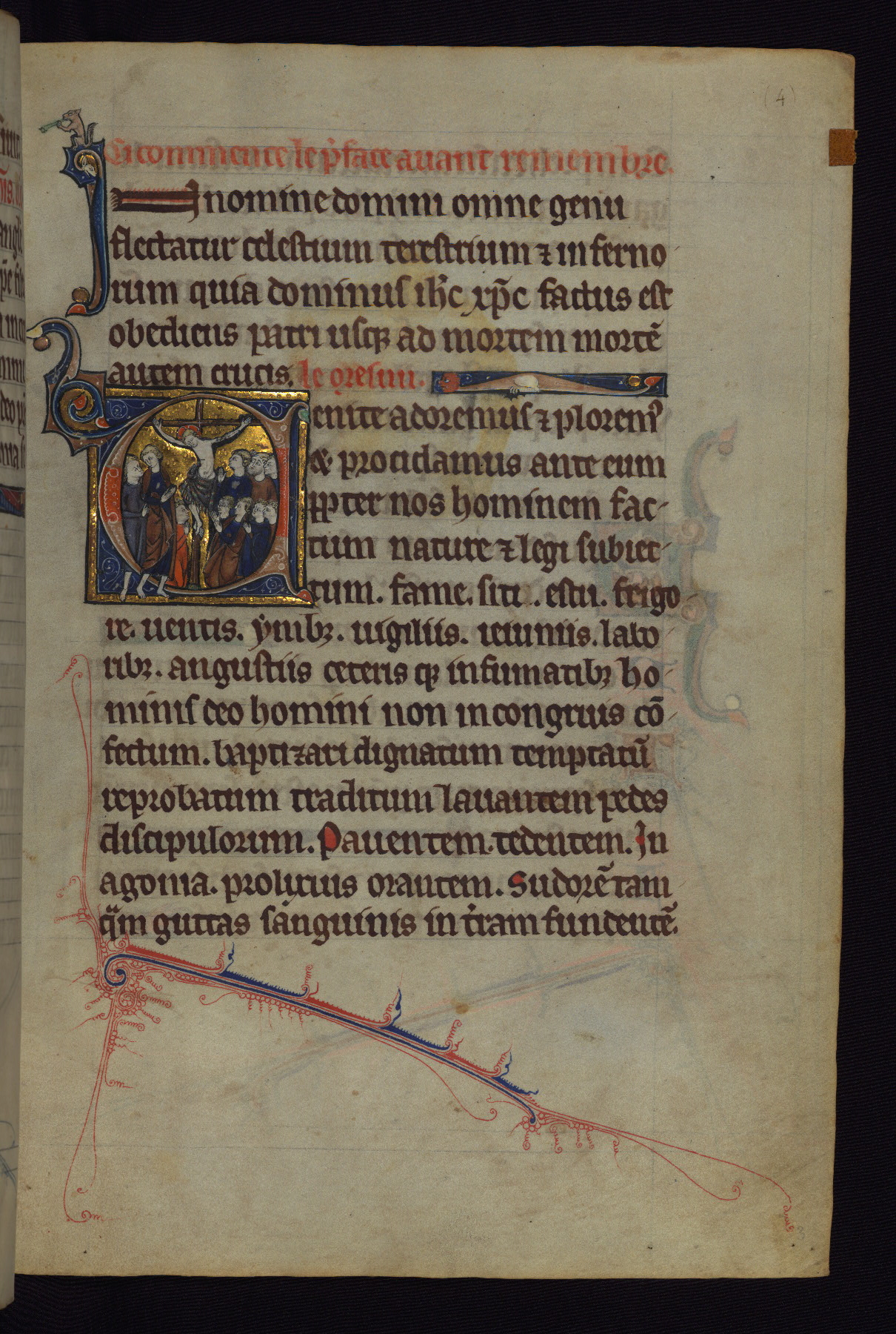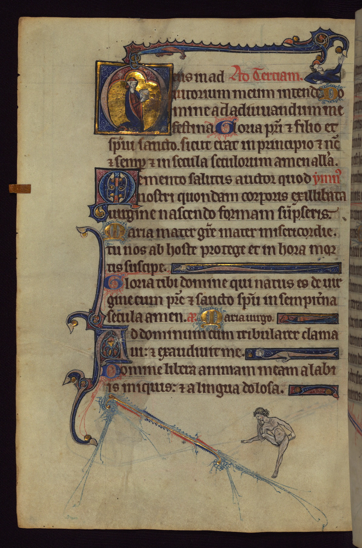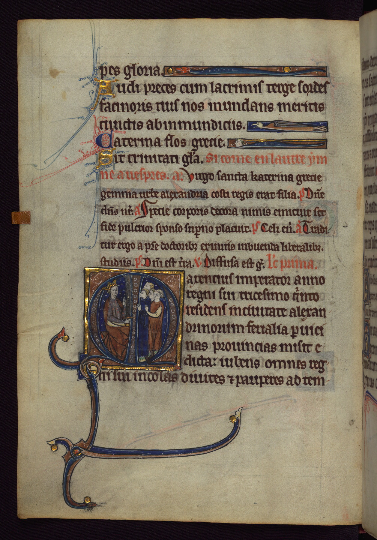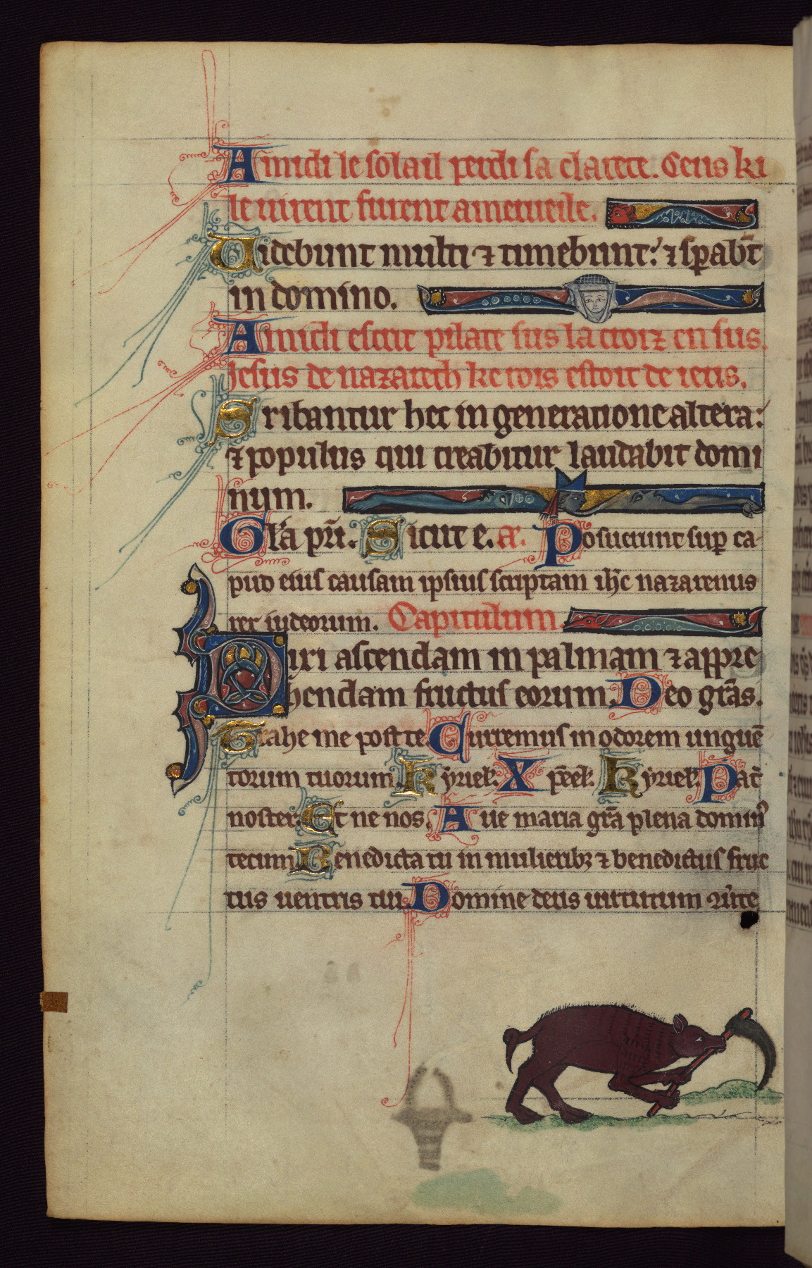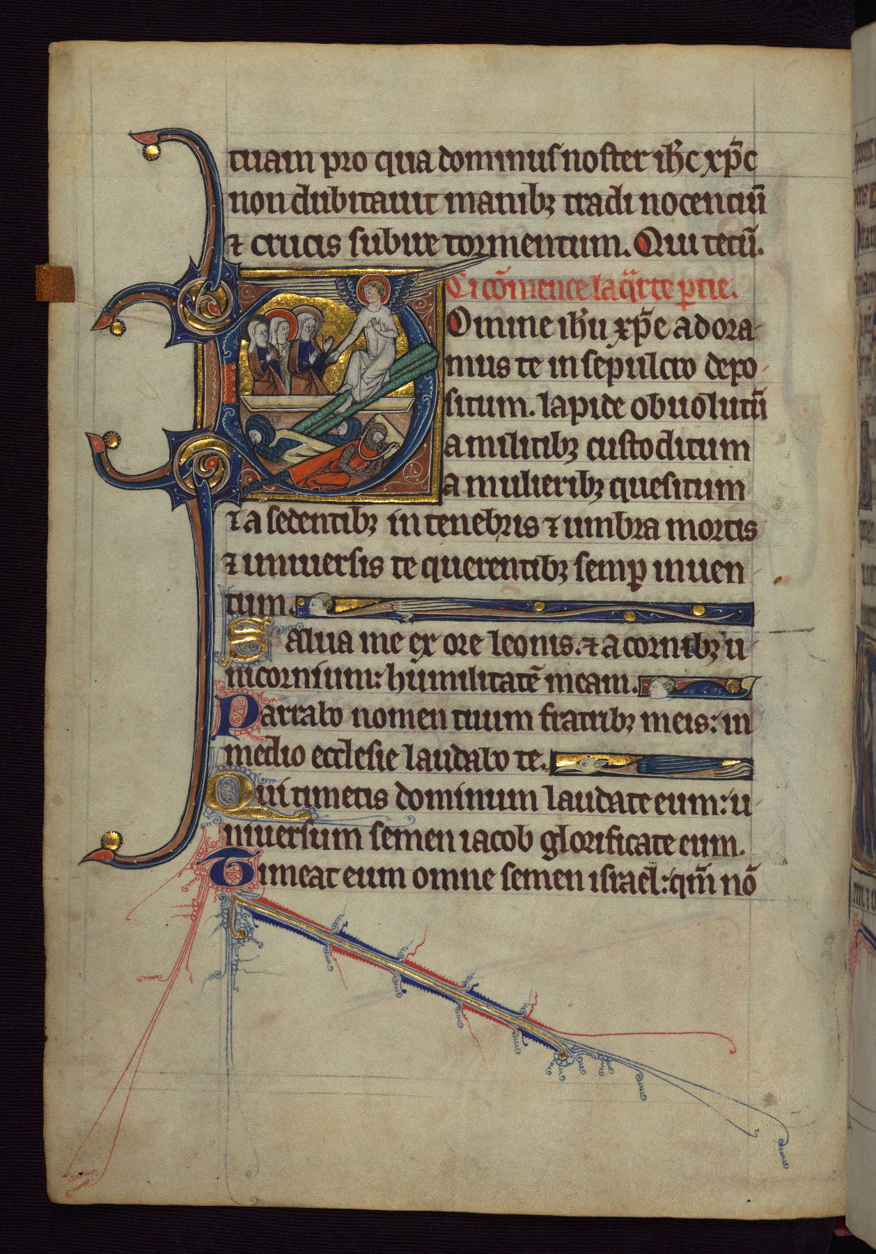 This finely illuminated and iconographically rich book of hours was made in England at the end of the thirteenth century. The manuscript is incomplete and misbound. Its main artist can also be found at work in a Bible (Oxford, Bodleian Library Ms. Auct. D.3.2) and a psalter (Cambridge, Trinity College Cambridge Ms. O.4.16). The manuscript contains a number of unusual texts, including the Hours of Jesus Crucified and the Office of St. Catherine. The patron of the manuscript is not clear; a woman is depicted as praying in many of the initials, but rubrics in the Office of the Dead mention "freres" (brothers). The imagery is inventive, and the Hours of Christ Crucified are graced with images depicting the funeral of Reynard the Fox in its margins. In the absence of a calendar, it is not possible to locate the origin of the manuscript precisely.