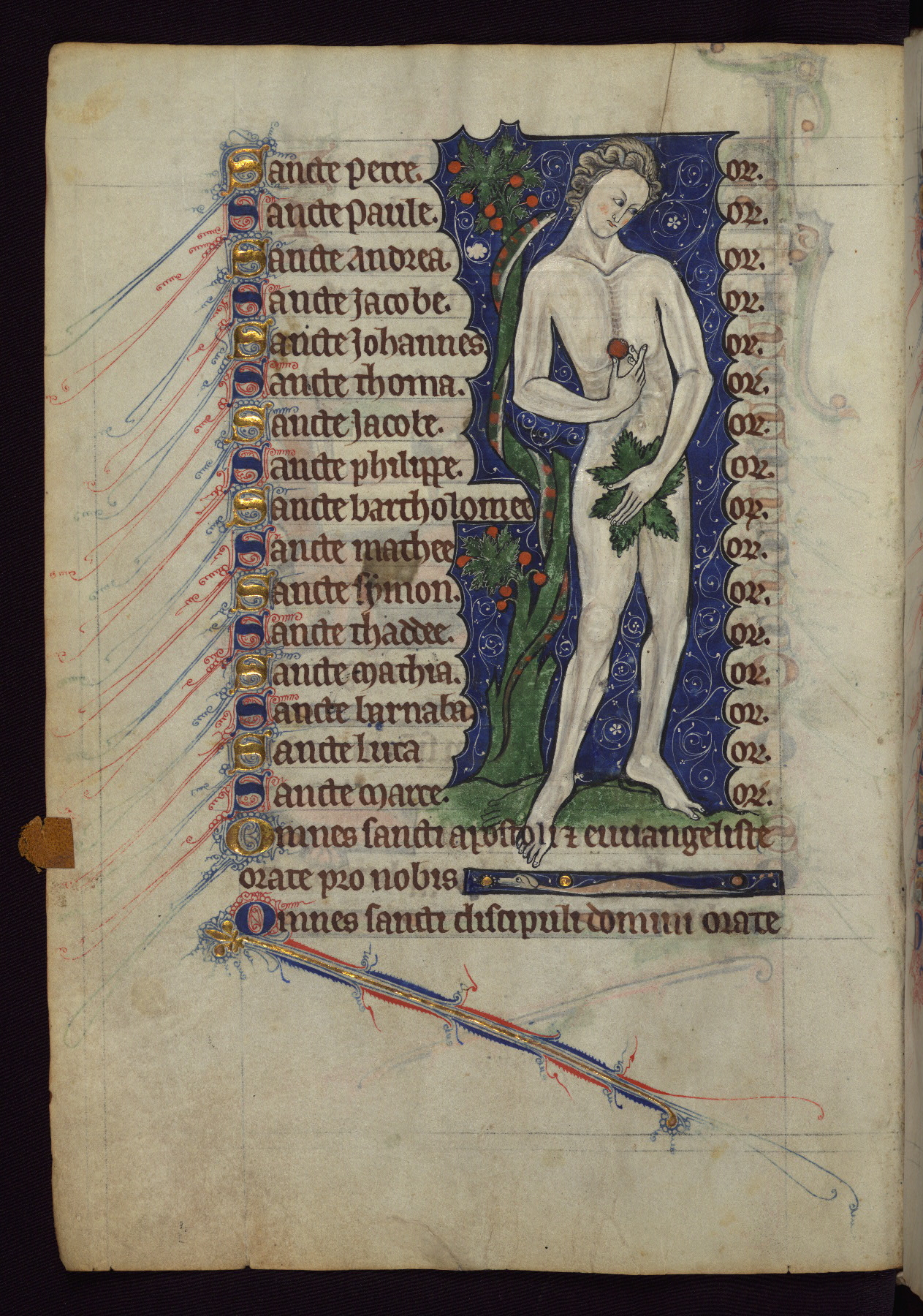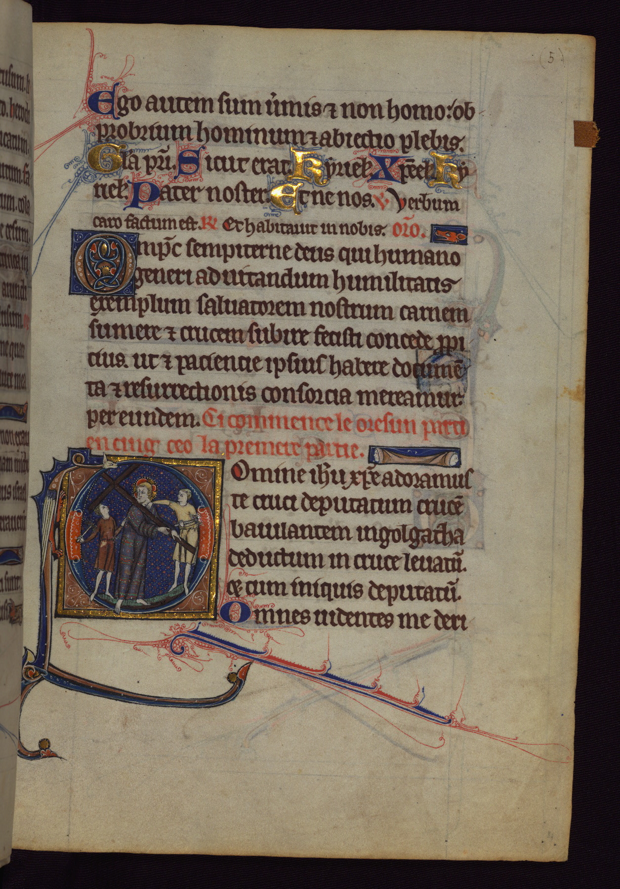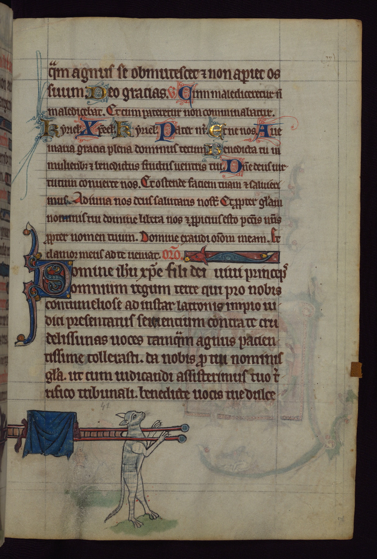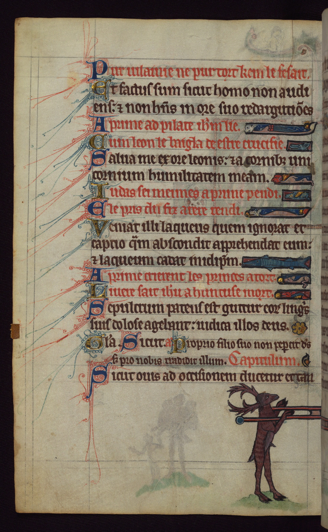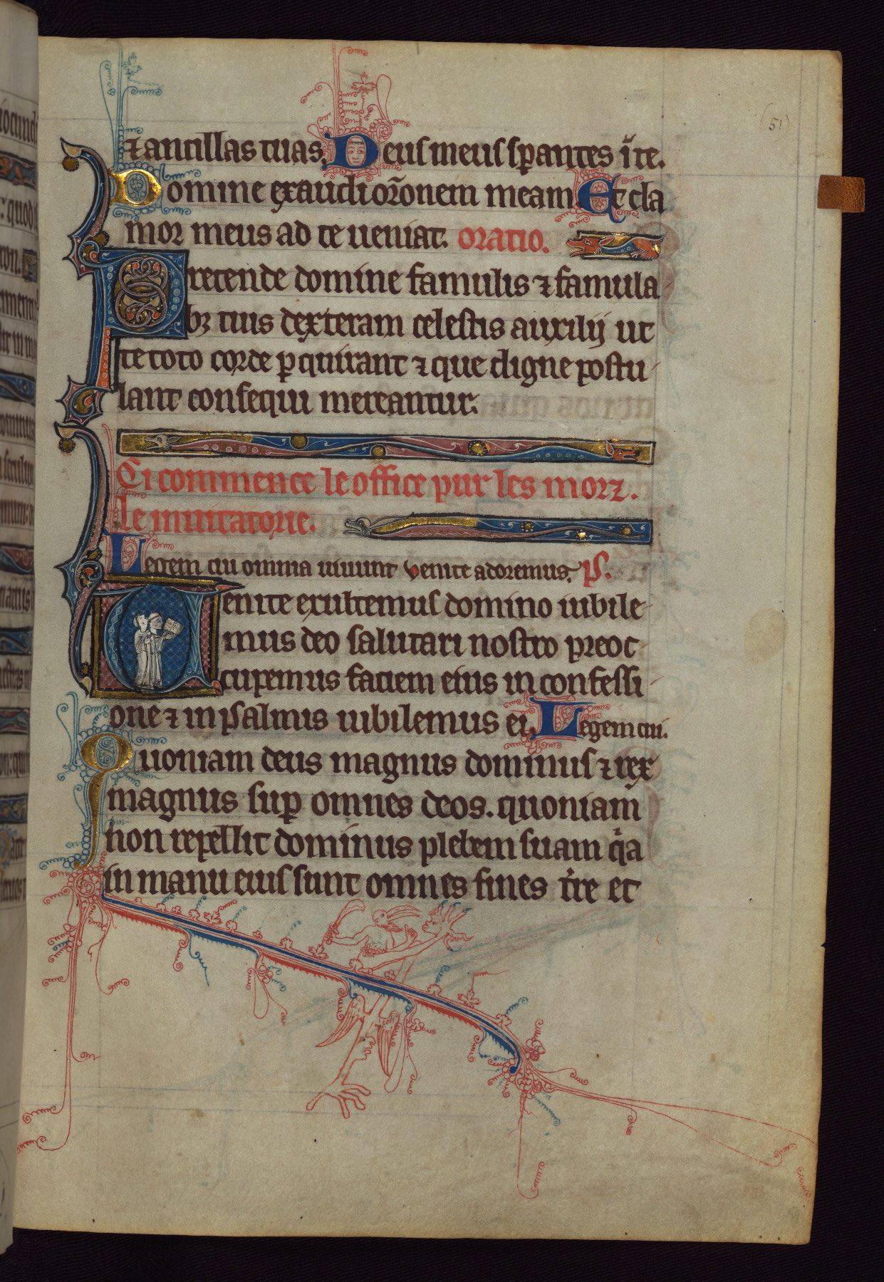 This finely illuminated and iconographically rich book of hours was made in England at the end of the thirteenth century. The manuscript is incomplete and misbound. Its main artist can also be found at work in a Bible (Oxford, Bodleian Library Ms. Auct. D.3.2) and a psalter (Cambridge, Trinity College Cambridge Ms. O.4.16). The manuscript contains a number of unusual texts, including the Hours of Jesus Crucified and the Office of St. Catherine. The patron of the manuscript is not clear; a woman is depicted as praying in many of the initials, but rubrics in the Office of the Dead mention "freres" (brothers). The imagery is inventive, and the Hours of Christ Crucified are graced with images depicting the funeral of Reynard the Fox in its margins. In the absence of a calendar, it is not possible to locate the origin of the manuscript precisely.