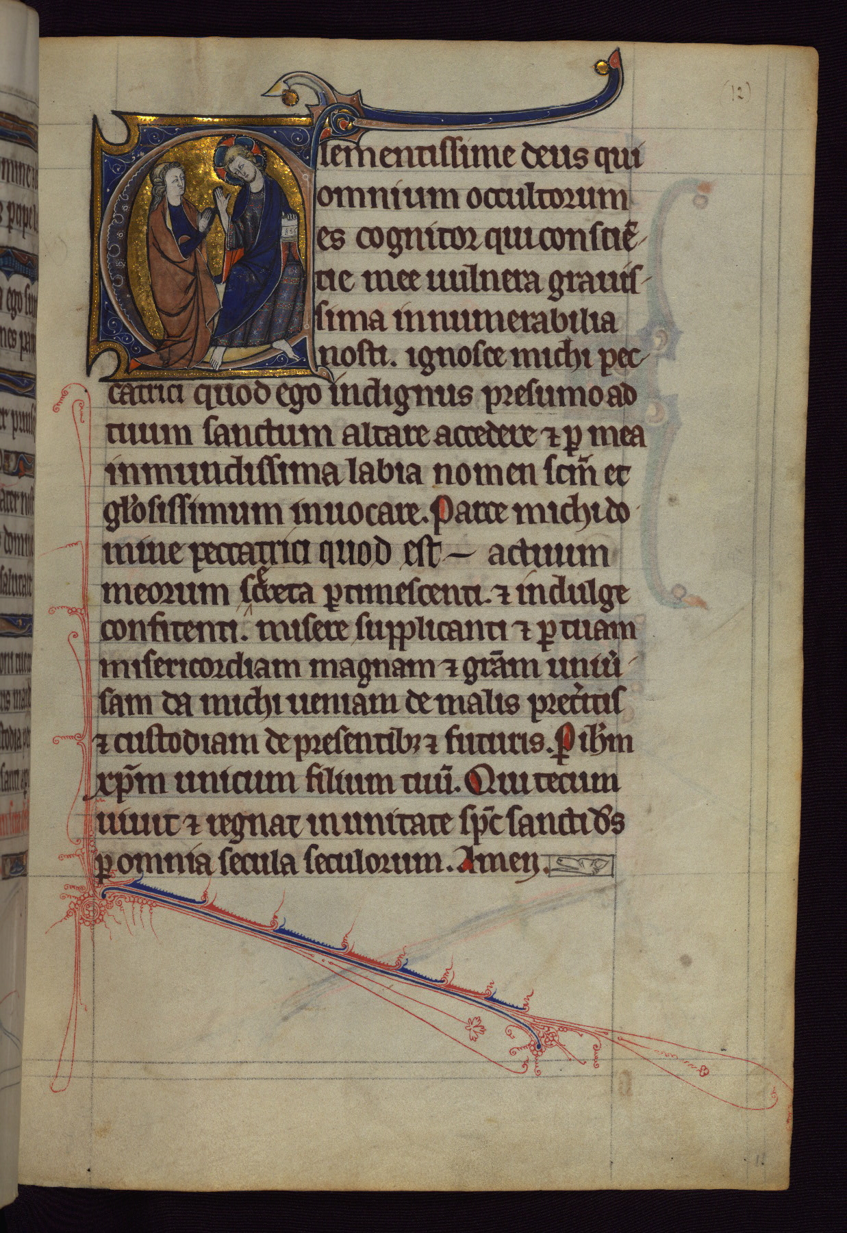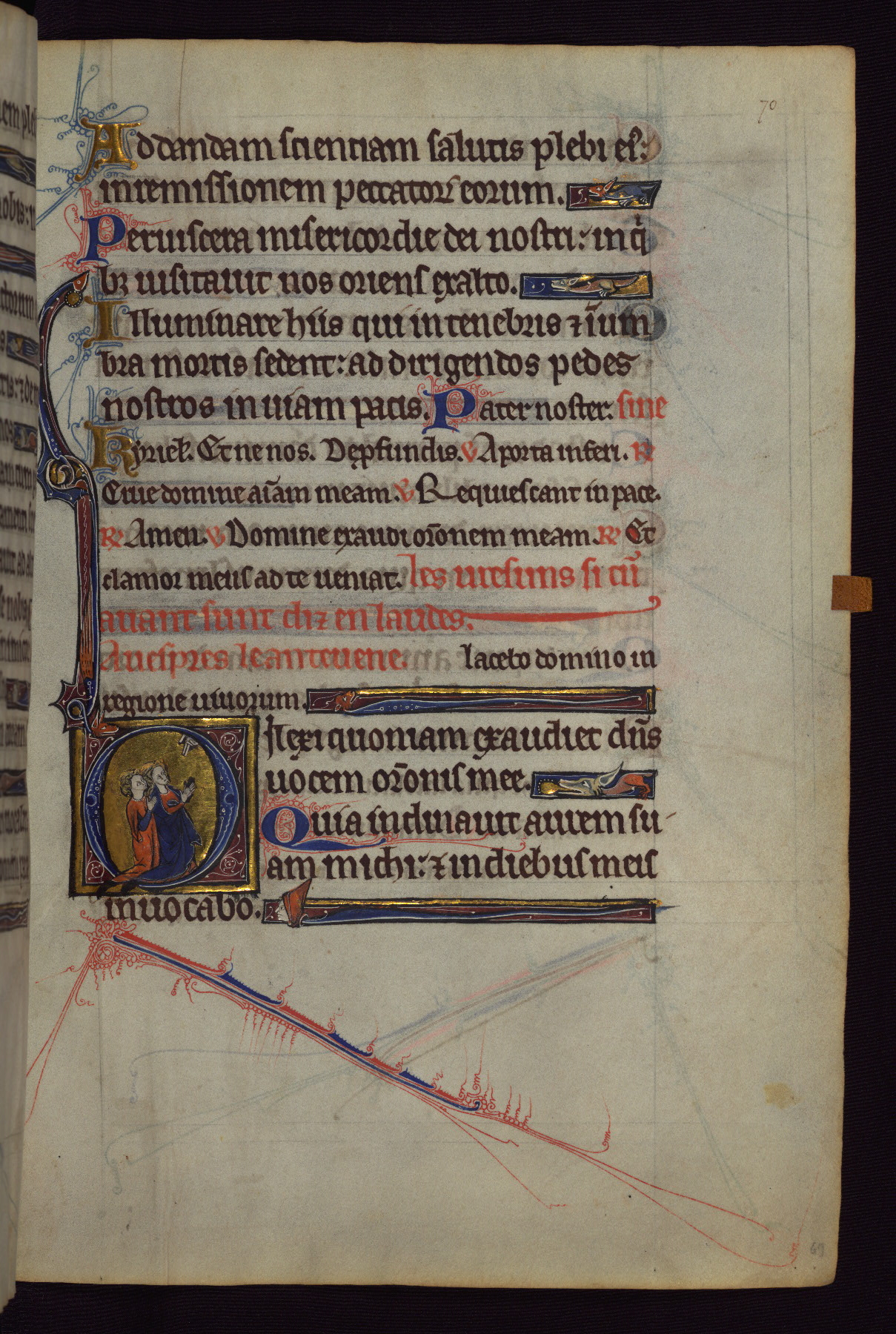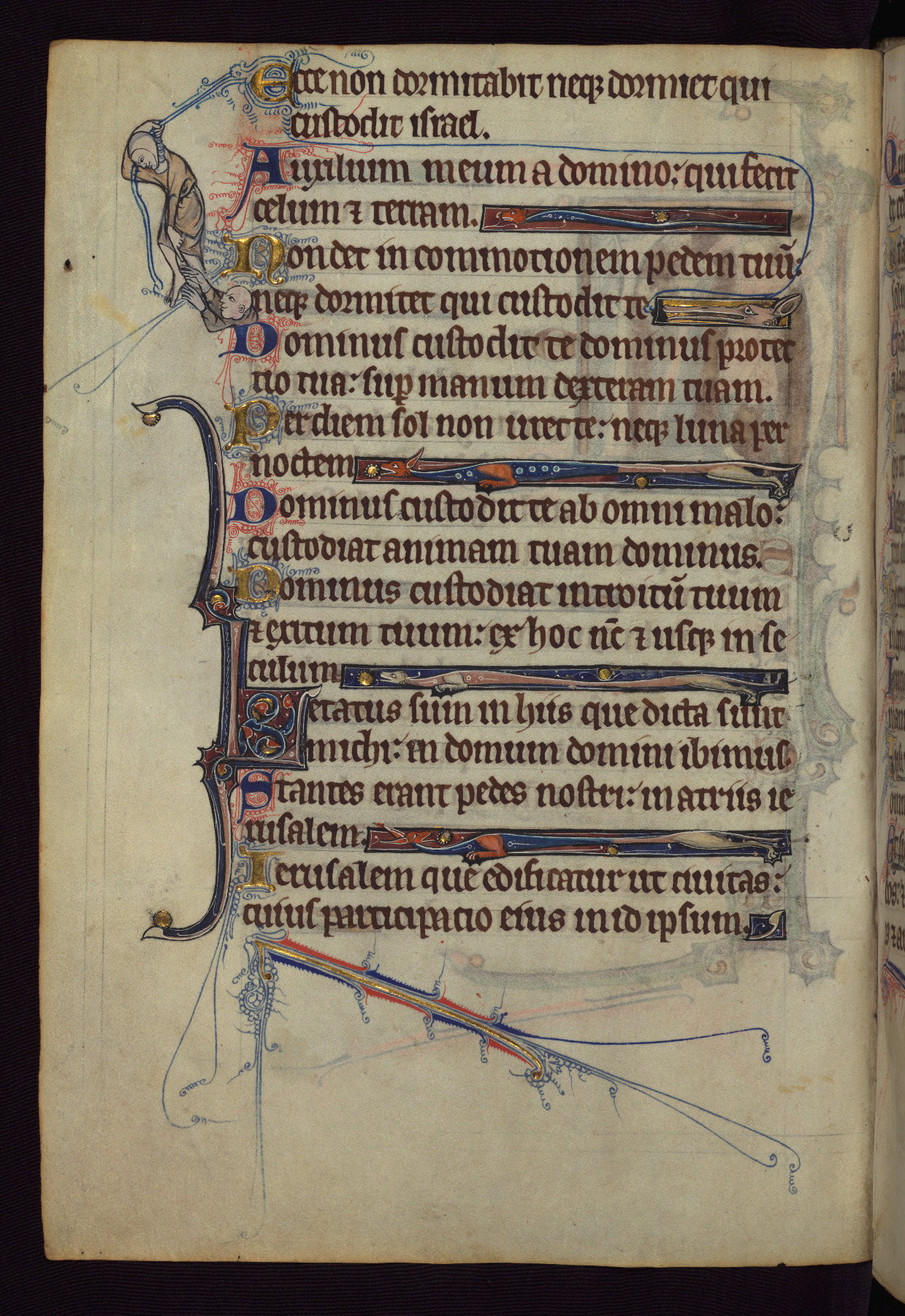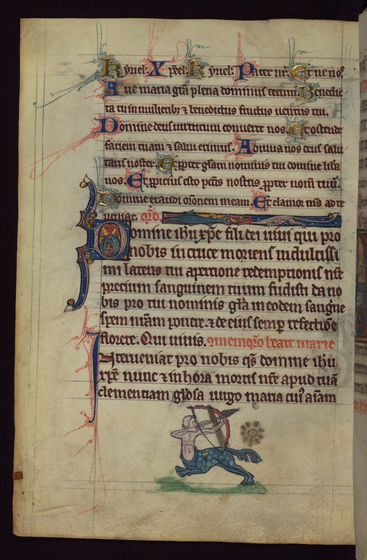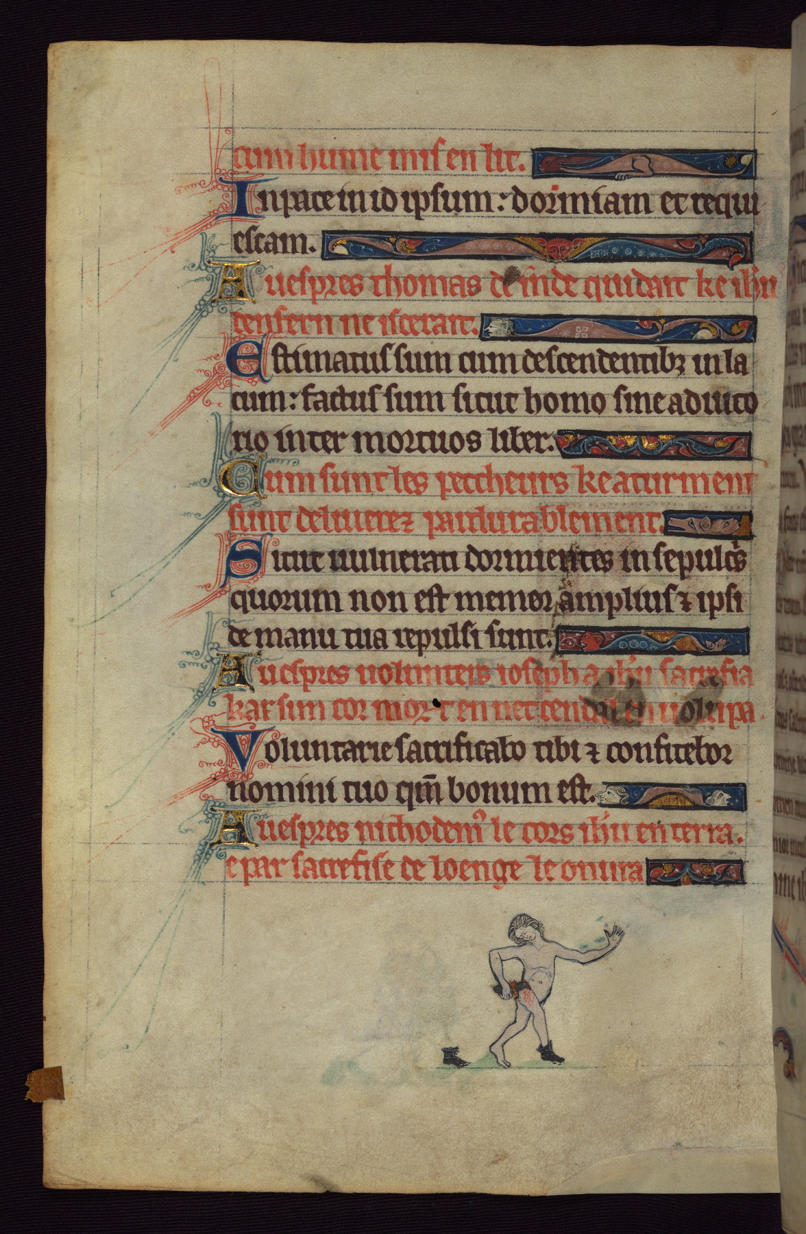 This finely illuminated and iconographically rich book of hours was made in England at the end of the thirteenth century. The manuscript is incomplete and misbound. Its main artist can also be found at work in a Bible (Oxford, Bodleian Library Ms. Auct. D.3.2) and a psalter (Cambridge, Trinity College Cambridge Ms. O.4.16). The manuscript contains a number of unusual texts, including the Hours of Jesus Crucified and the Office of St. Catherine. The patron of the manuscript is not clear; a woman is depicted as praying in many of the initials, but rubrics in the Office of the Dead mention "freres" (brothers). The imagery is inventive, and the Hours of Christ Crucified are graced with images depicting the funeral of Reynard the Fox in its margins. In the absence of a calendar, it is not possible to locate the origin of the manuscript precisely.