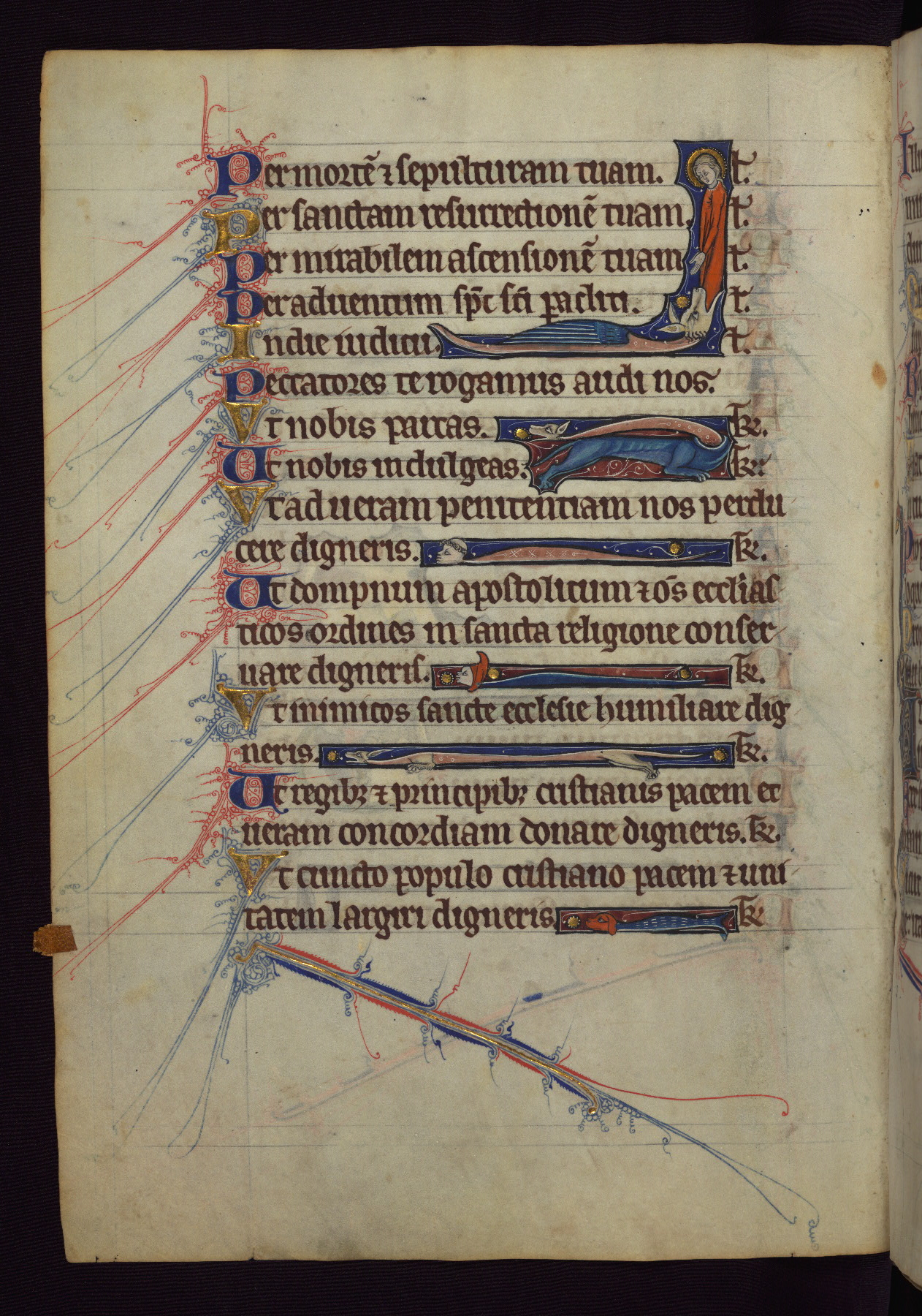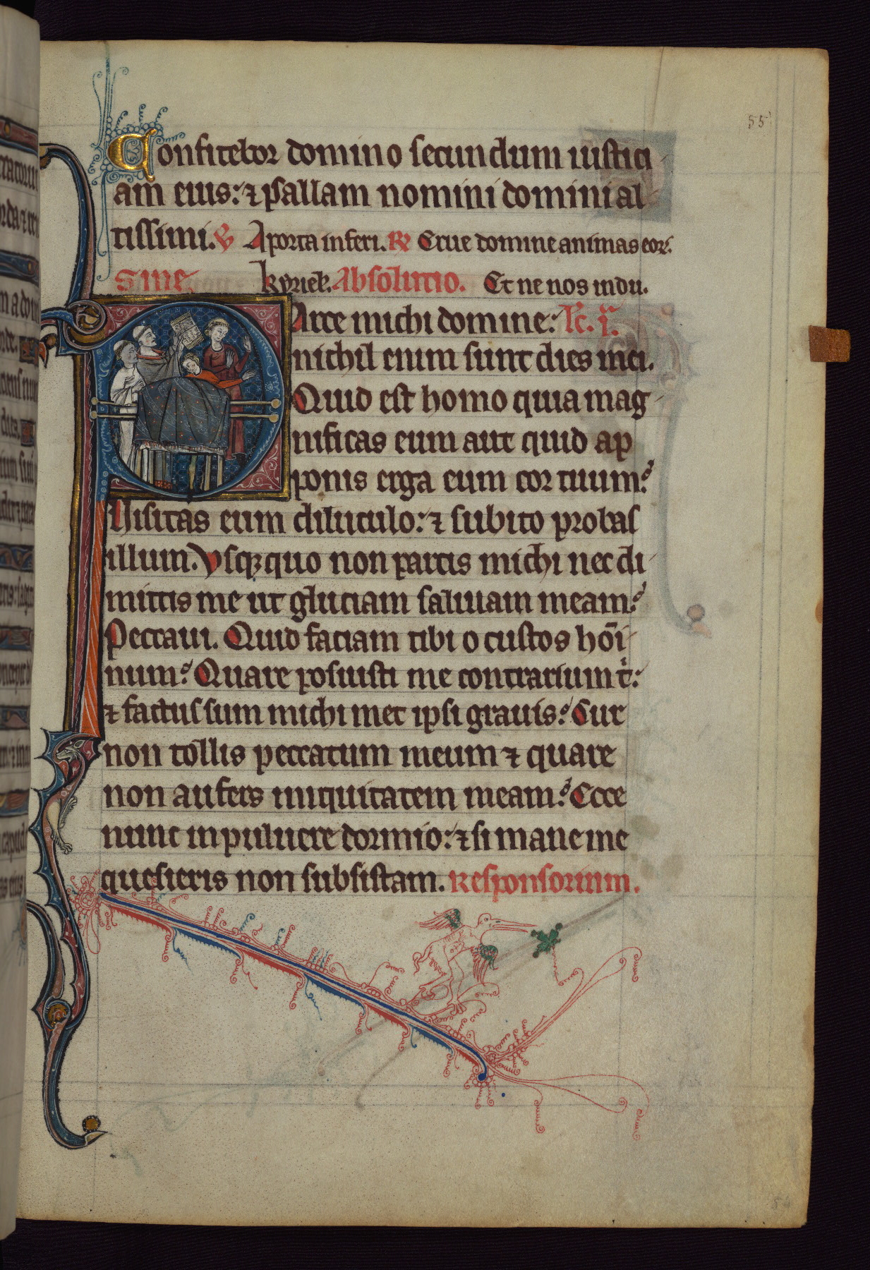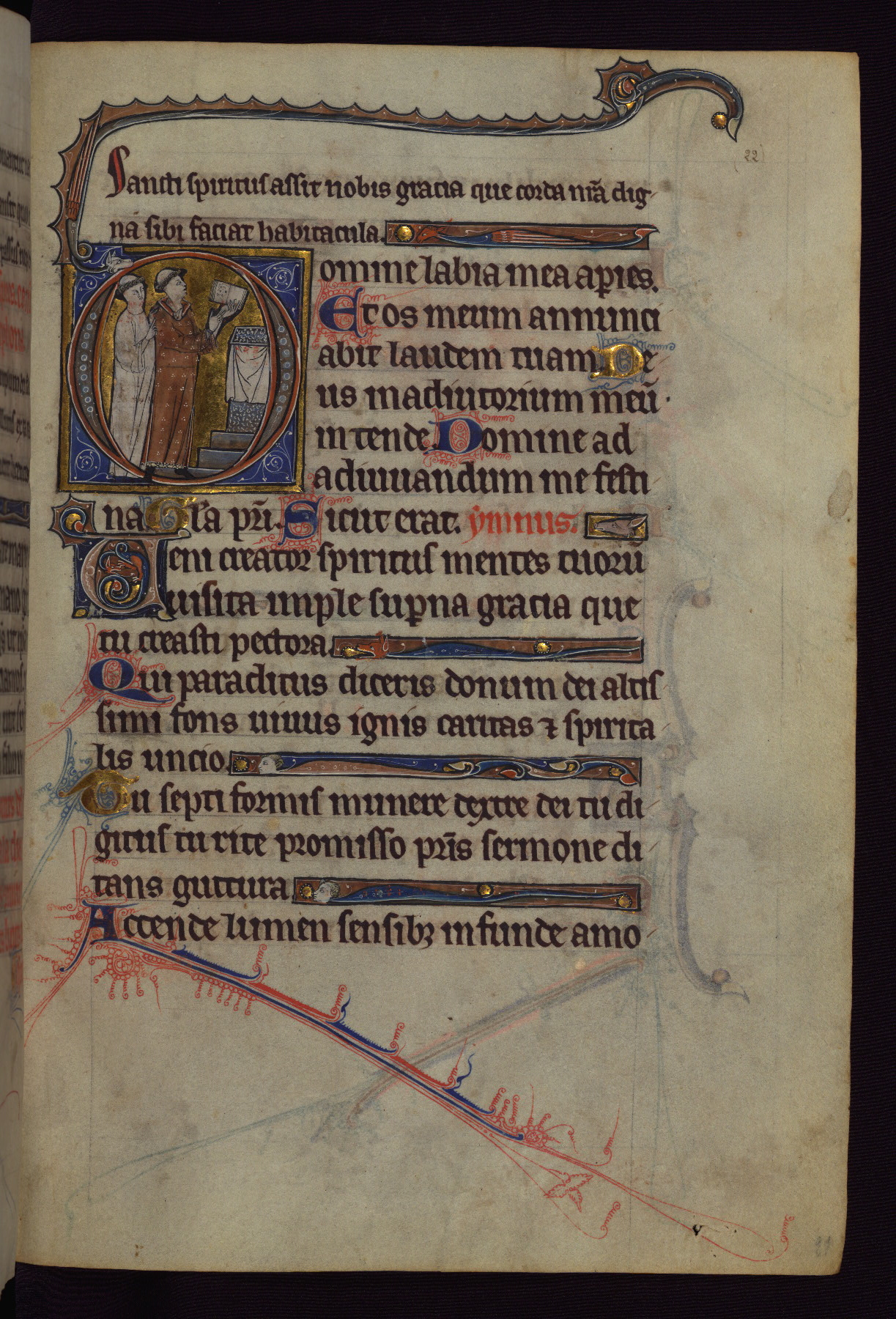 - Decoration note: One half-page line drawing; thirty-two historiated initials; minor decorated initials; line fillers; marginalia