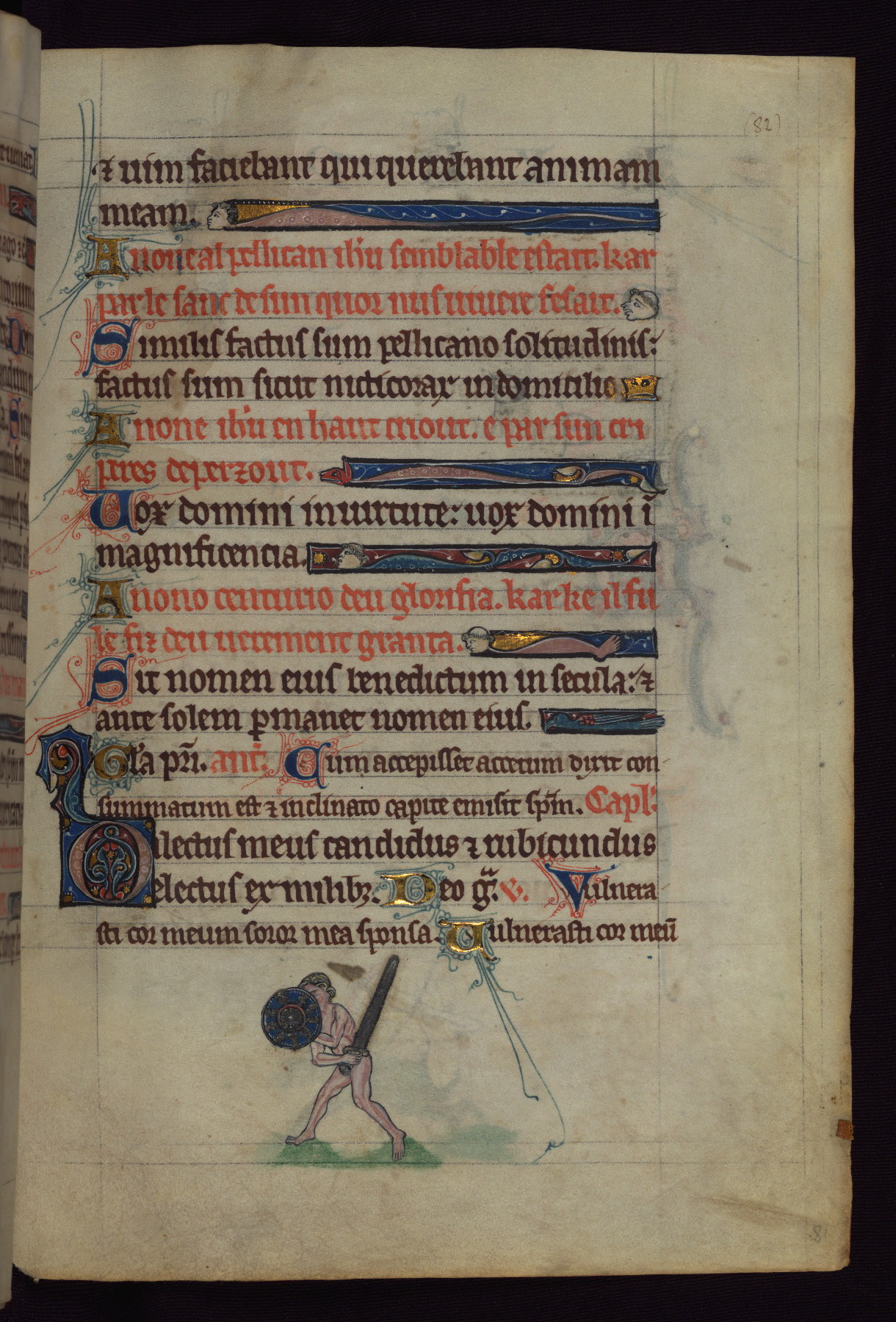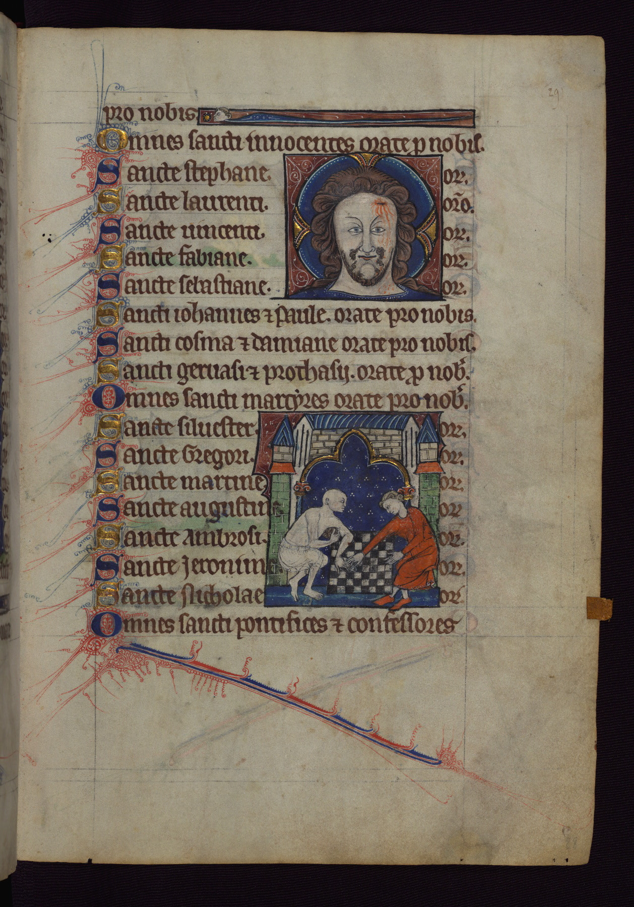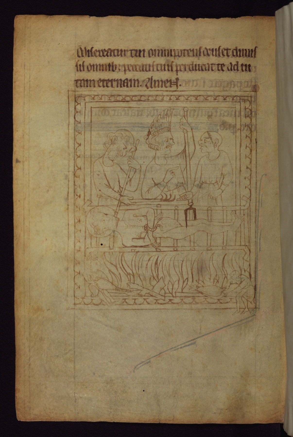 - Decoration note: One half-page line drawing; thirty-two historiated initials; minor decorated initials; line fillers; marginalia
