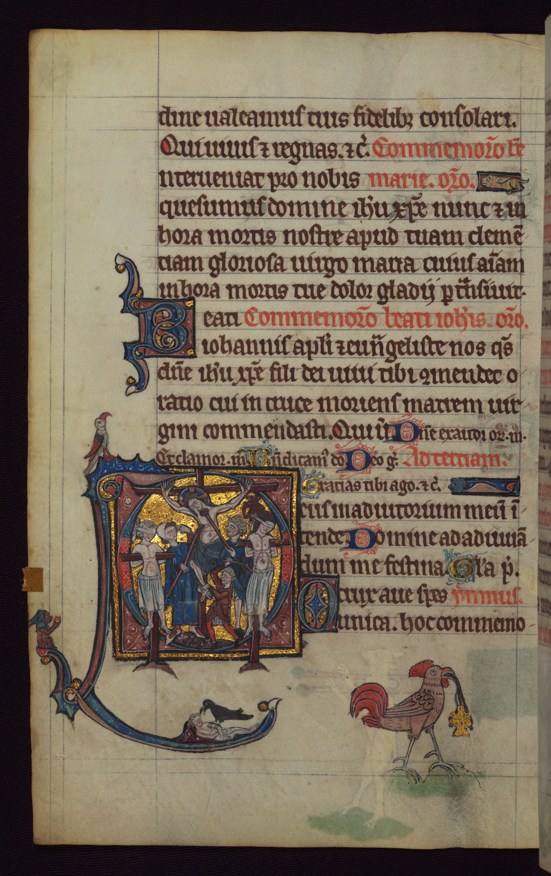 - Title: Crucifixion; Chanticleer the Cock swinging a censer, from a marginal cycle of images of the funeral of Renard the Fox