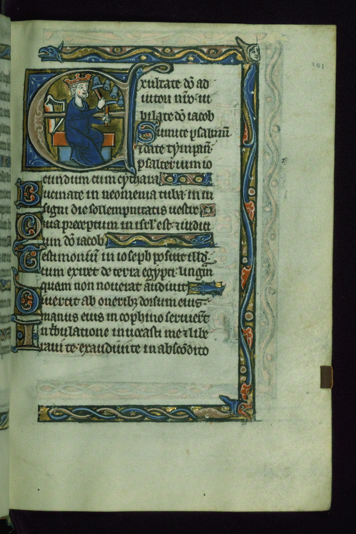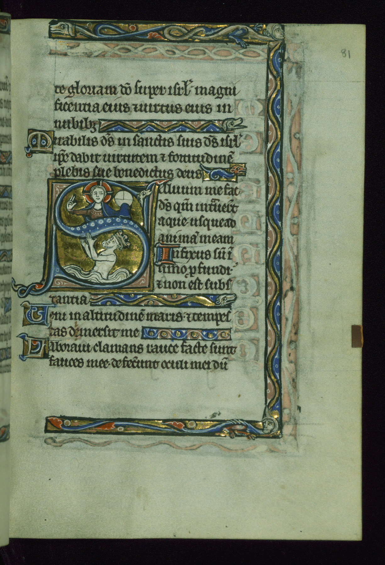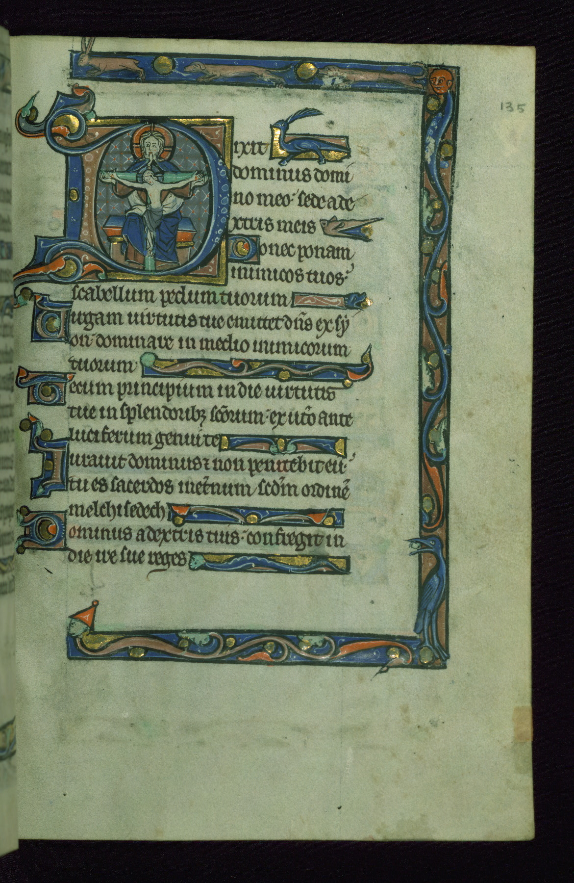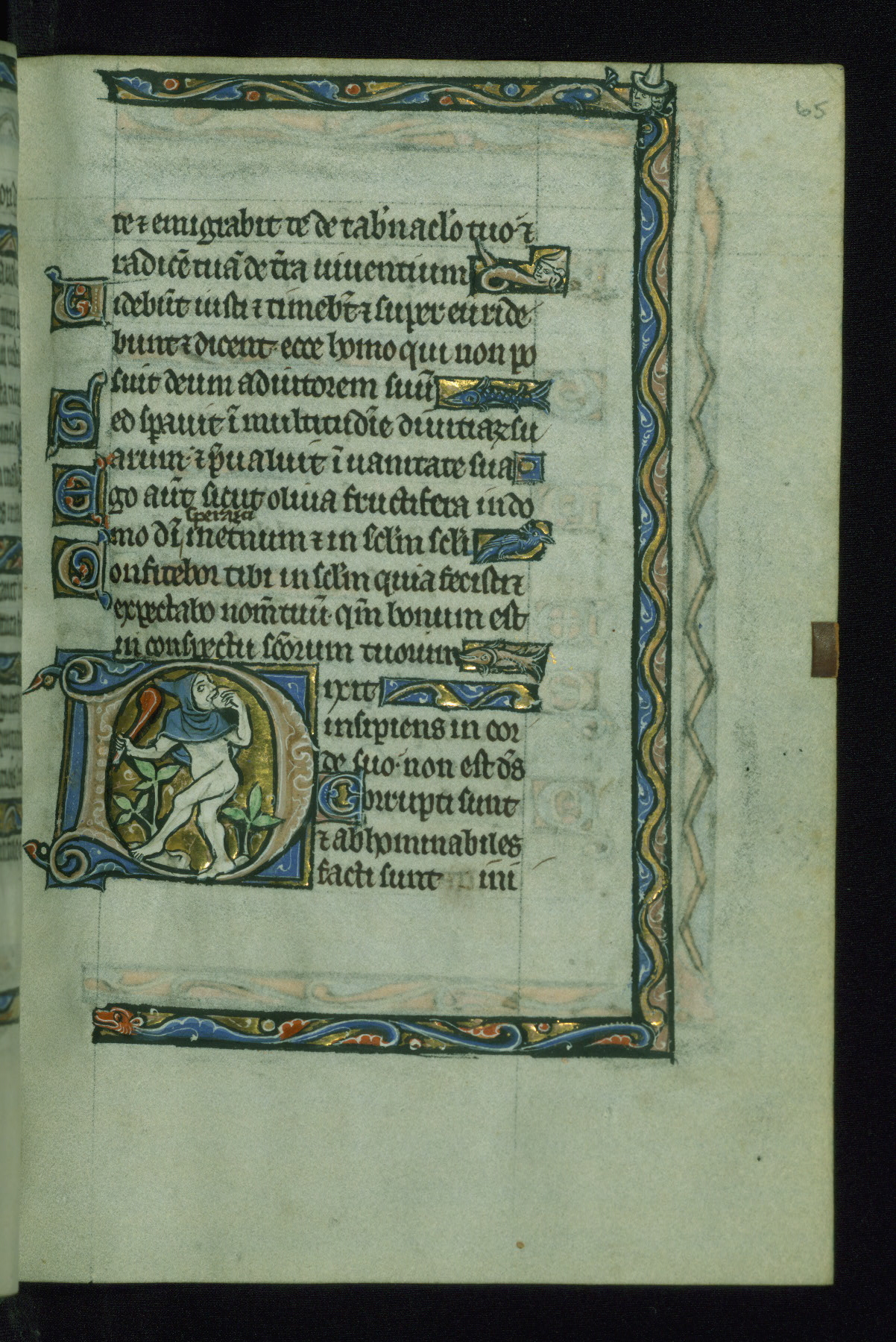 - Decoration note: Seven extant historiated initials (6-8 lines) begin each biblical Psalm, with eighth now lacking at Psalm 97; enlarged decorated initials in blue, rose and gold with white patterning throughout, used for "KL" in calendar, secondary text divisions, and Psalm versals (1-2 line); line-fillers and bar borders throughout, filled with flora, fauna, dragons, and hybrid creatures; red rubrics in calendar only; text in dark brown ink