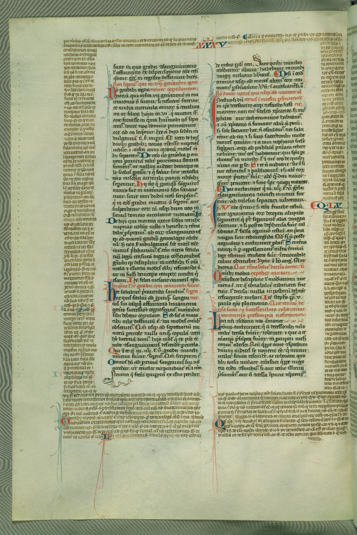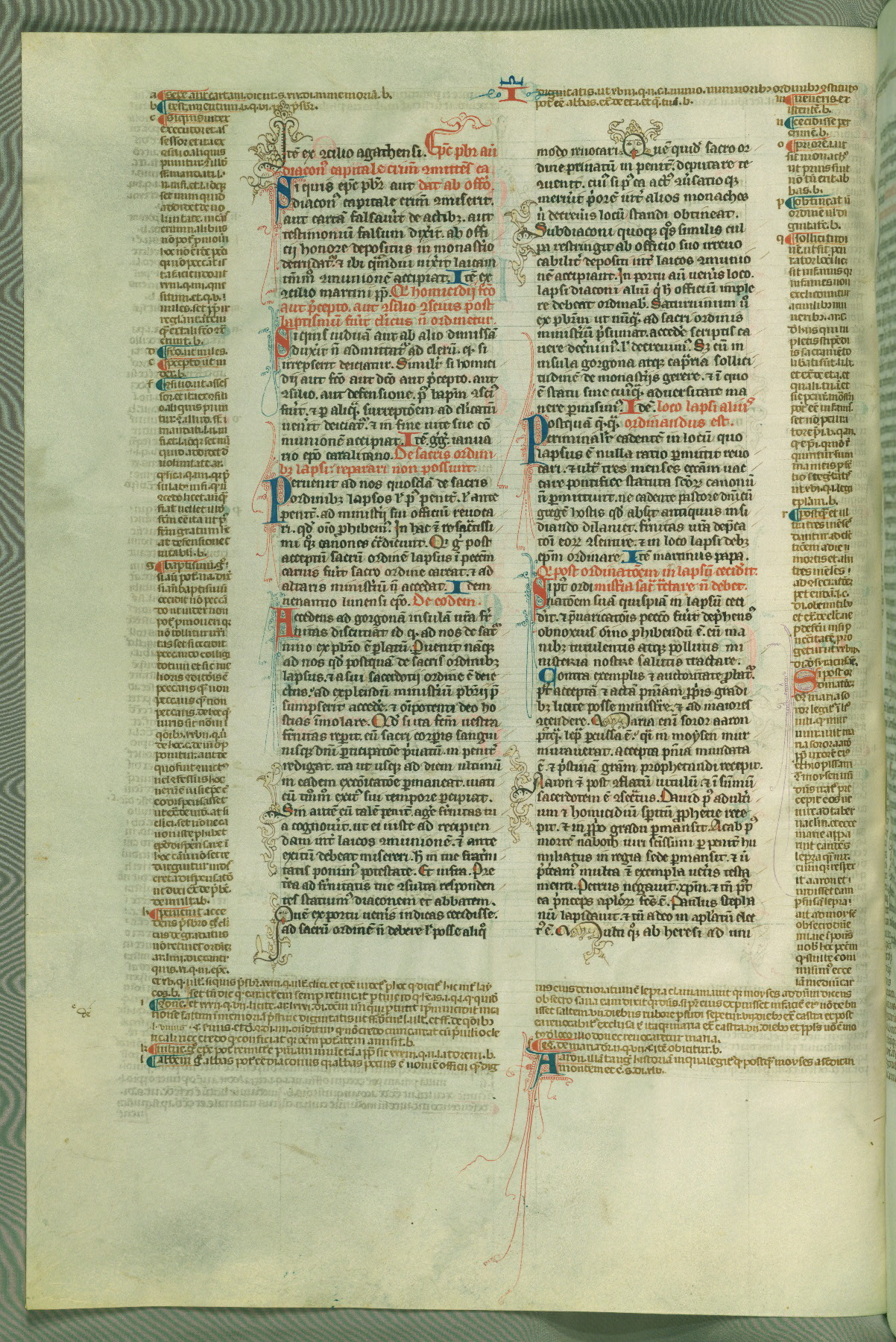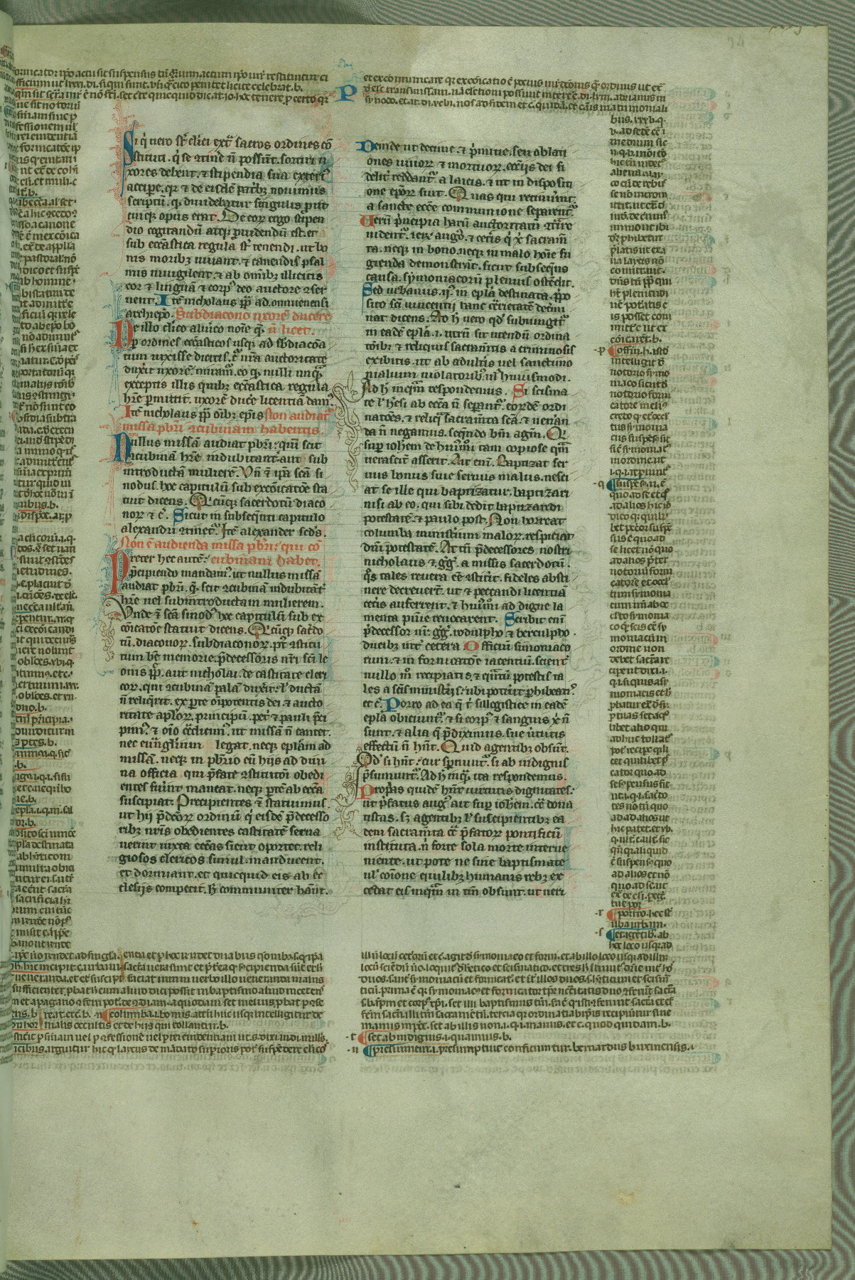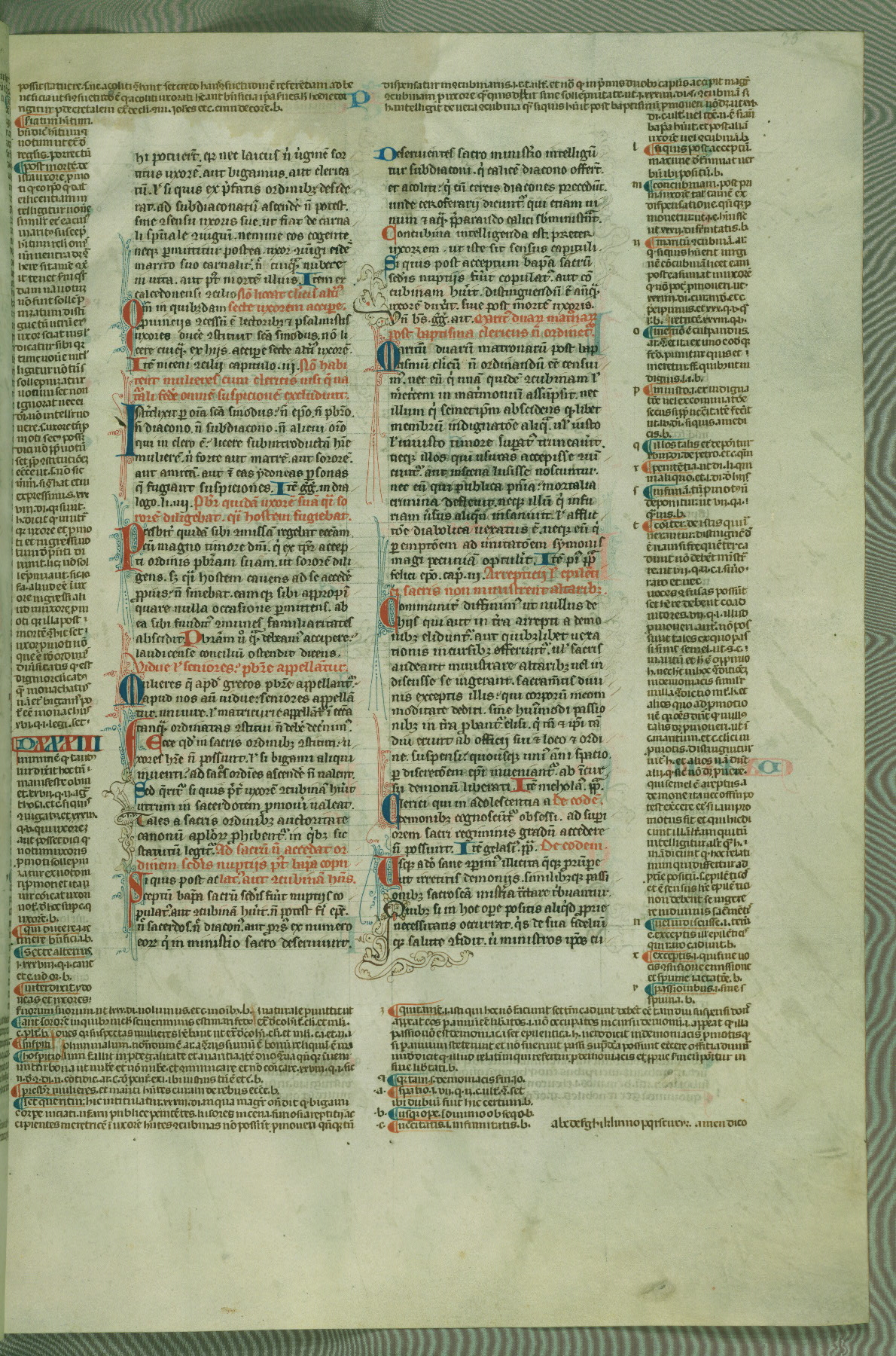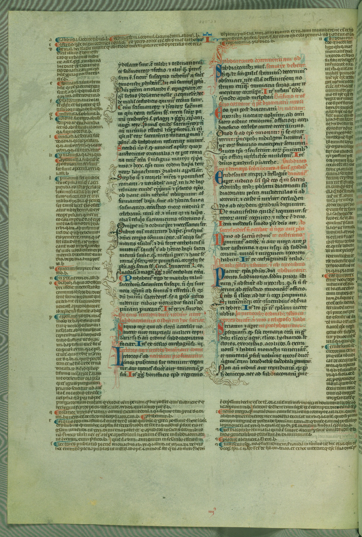 This deluxe version of Gratian's Decretum was created ca. 1280-90, most likely in Hainaut. The lively decoration of the manuscript indicates a marked taste for narrative, and there are thirty-seven historiated initials. The gloss work was completed by Bartholomew of Brescia. At first, Paris would seem to be the most likely place of origin, given that it was the leading center for the study of canon law. However, this particular manuscript exhibits scribal features that suggest its place of origin as being the Cistercian abbey of Cambron in Hainaut. Furthermore, Abbot Baudouin de Bousso, whose tenure at the abbey was from 1283 to 1293, was schooled in theology at the University of Paris, and he would eventually endorse the production of many fine manuscripts while at Cambron. In fact, the catalyst for this endeavor seems to have been the Beaupré Antiphonary (W.759-761), which was was created at Cambron during the 1280s. Stylistic features of W.133 seem to have connections with the Beaupré Antiphonary. For example, Cistercian monks are shown in three extant illuminations throughout three of the antiphonary volumes; these monks are pictured in brown habits similar to the type worn by clerics in W.133. The reliance upon Cistercian precedents for textual and design features associates W.133 with the Cistercian abbey at Cambron. However, more remains to be confirmed by further inspection of the output of the scriptorium at Cambron.
