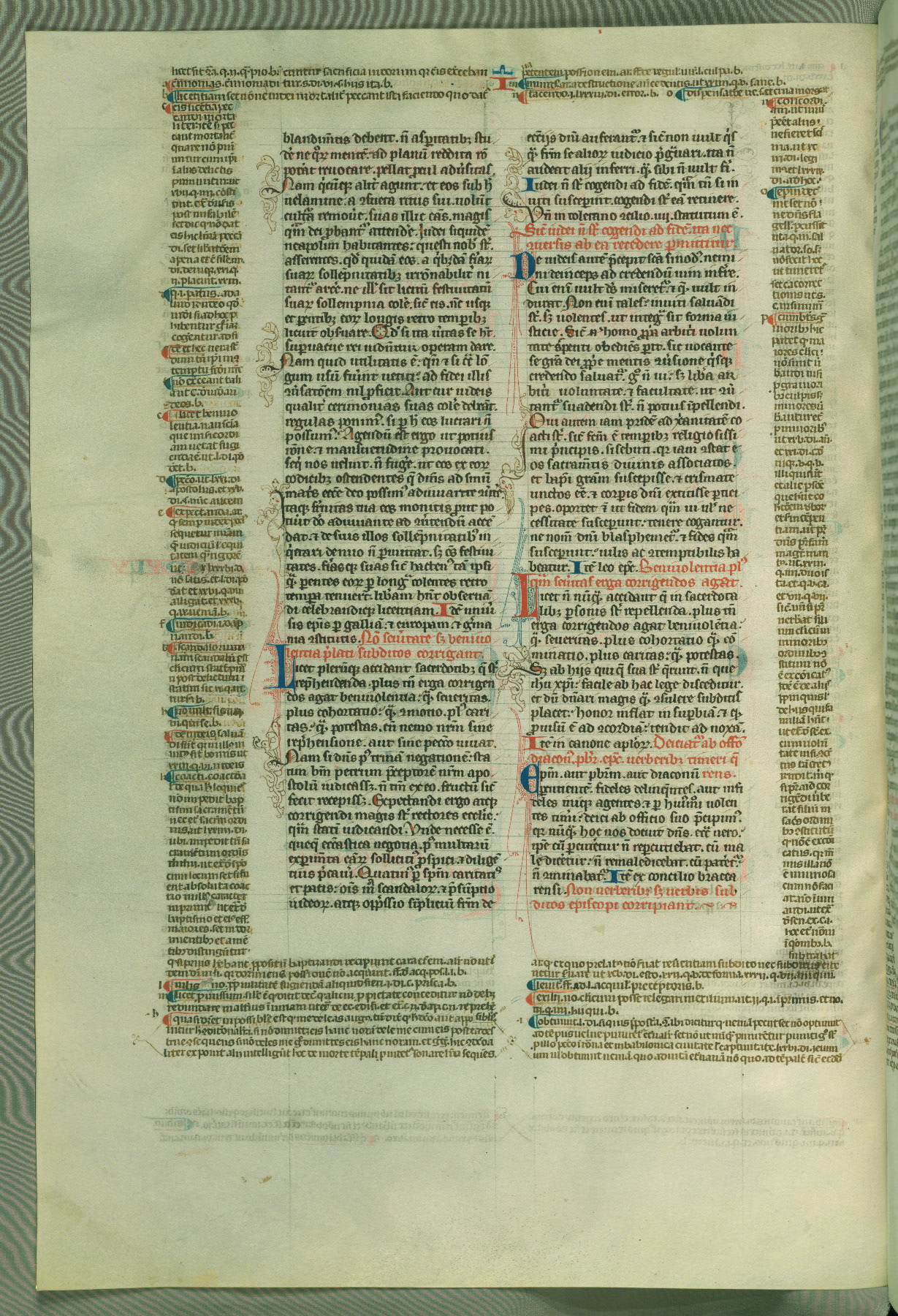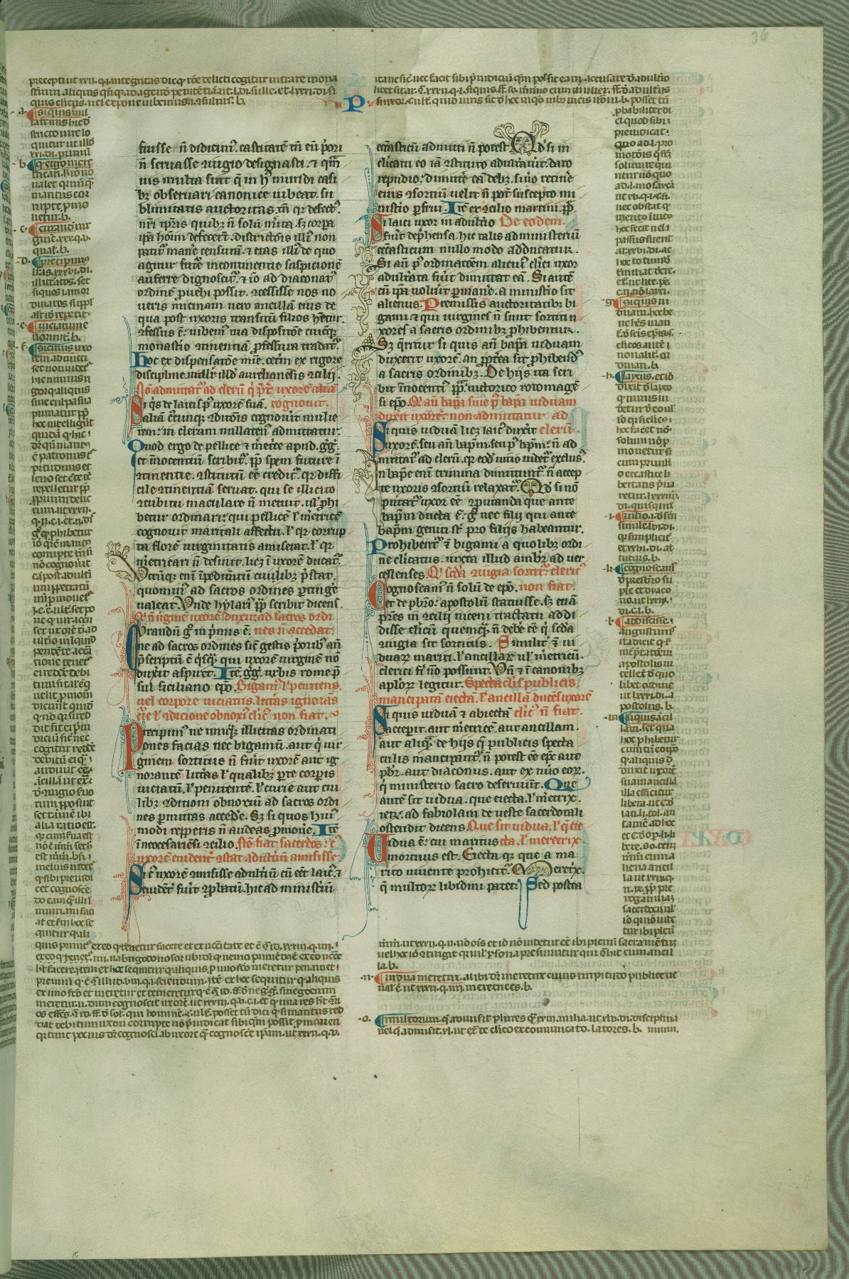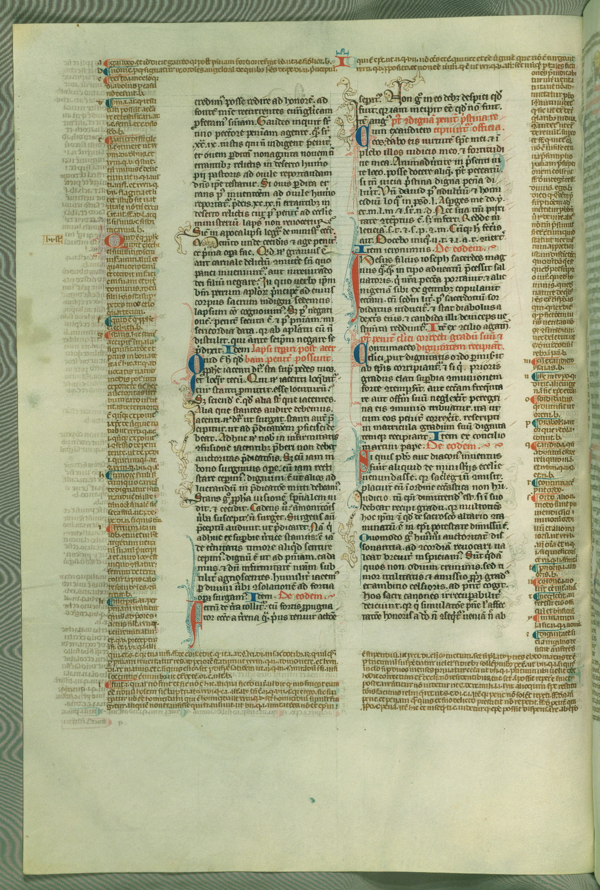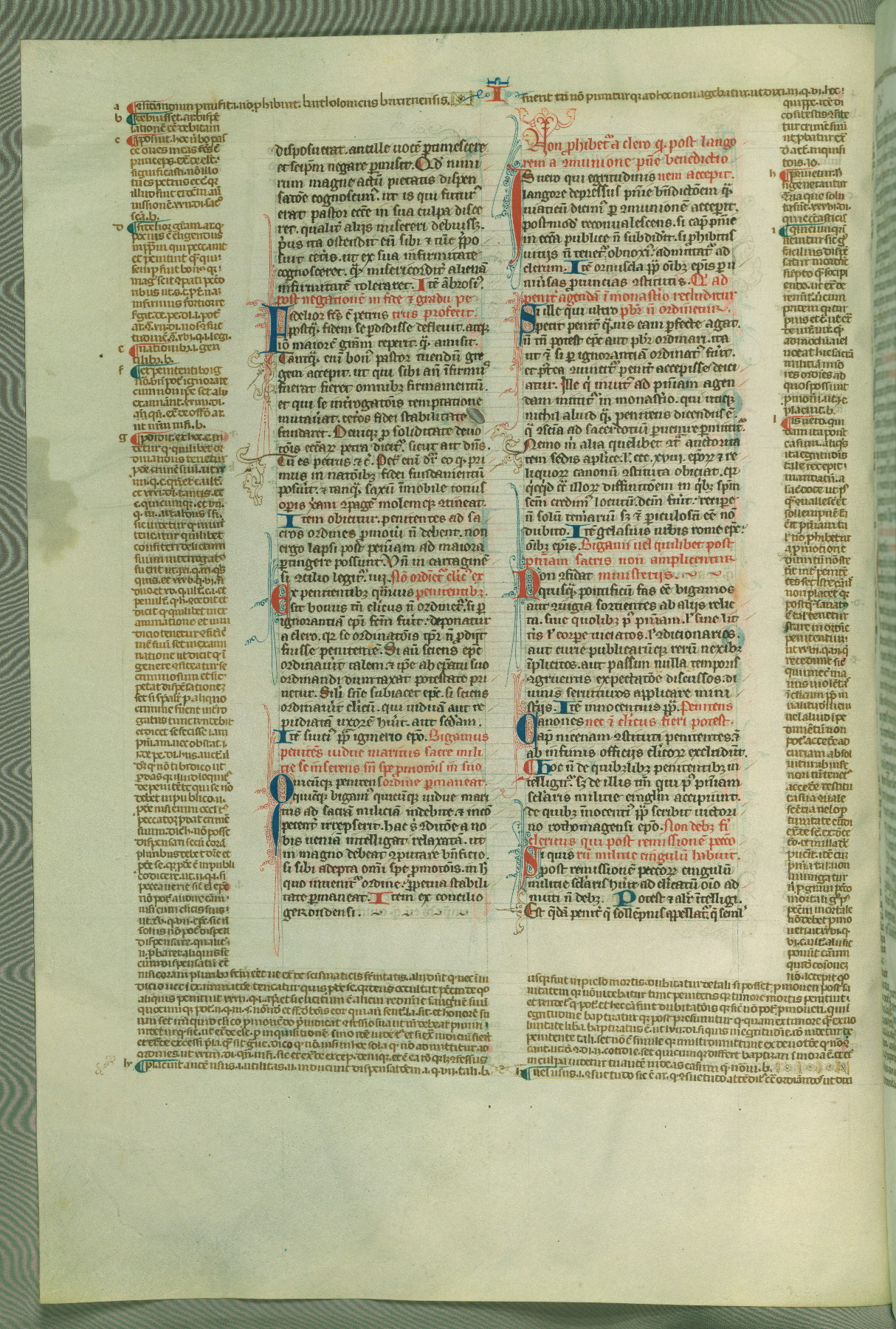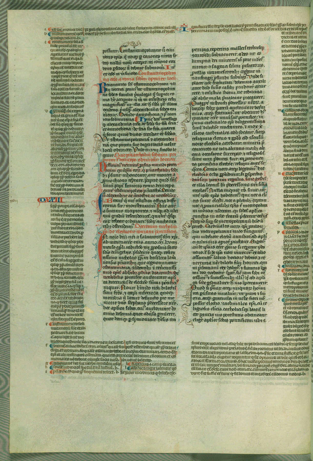 This deluxe version of Gratian's Decretum was created ca. 1280-90, most likely in Hainaut. The lively decoration of the manuscript indicates a marked taste for narrative, and there are thirty-seven historiated initials. The gloss work was completed by Bartholomew of Brescia. At first, Paris would seem to be the most likely place of origin, given that it was the leading center for the study of canon law. However, this particular manuscript exhibits scribal features that suggest its place of origin as being the Cistercian abbey of Cambron in Hainaut. Furthermore, Abbot Baudouin de Bousso, whose tenure at the abbey was from 1283 to 1293, was schooled in theology at the University of Paris, and he would eventually endorse the production of many fine manuscripts while at Cambron. In fact, the catalyst for this endeavor seems to have been the Beaupré Antiphonary (W.759-761), which was was created at Cambron during the 1280s. Stylistic features of W.133 seem to have connections with the Beaupré Antiphonary. For example, Cistercian monks are shown in three extant illuminations throughout three of the antiphonary volumes; these monks are pictured in brown habits similar to the type worn by clerics in W.133. The reliance upon Cistercian precedents for textual and design features associates W.133 with the Cistercian abbey at Cambron. However, more remains to be confirmed by further inspection of the output of the scriptorium at Cambron.