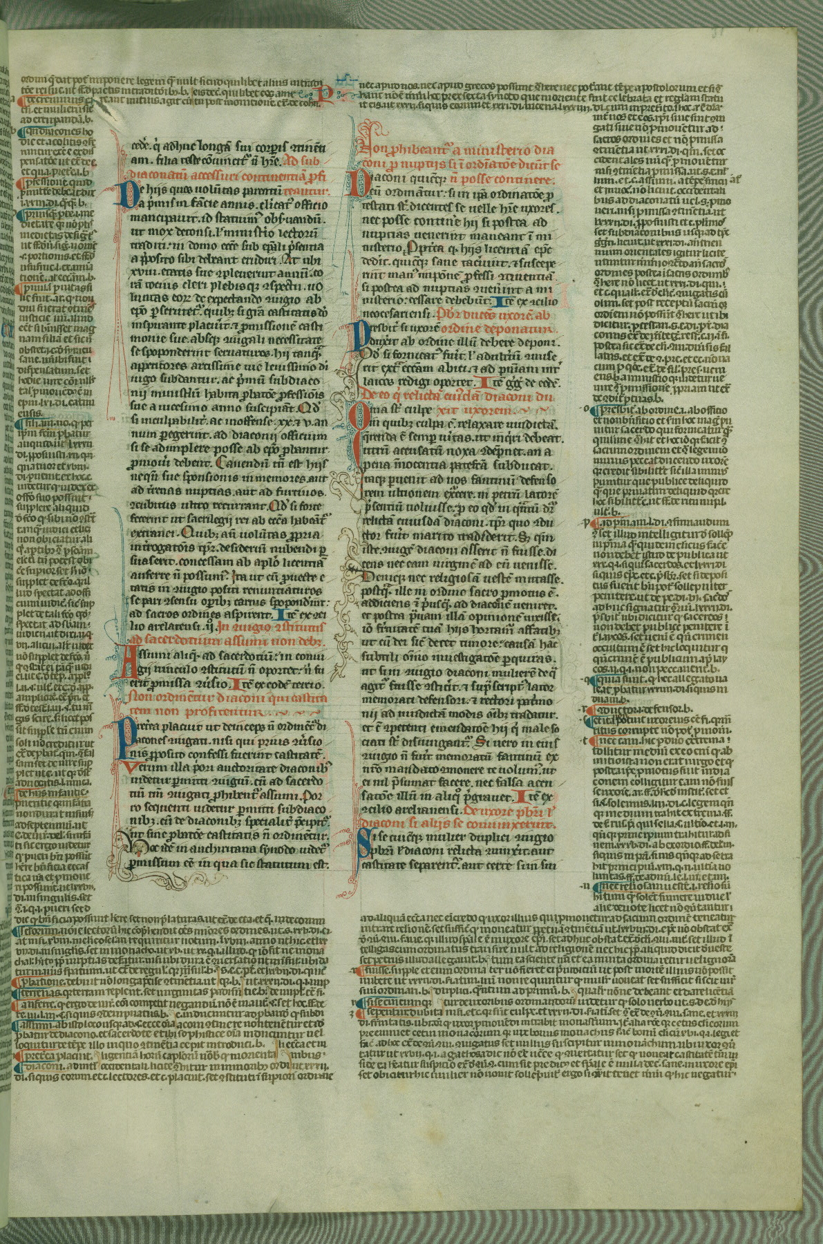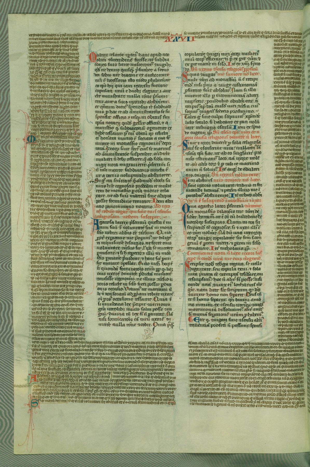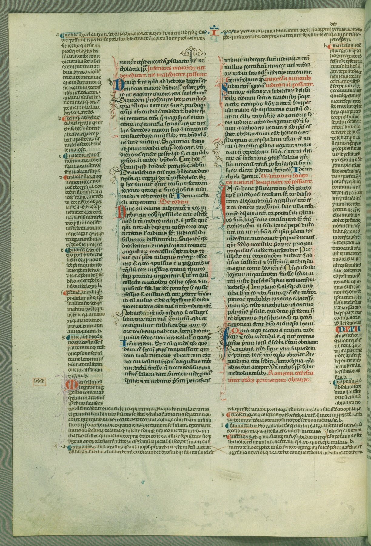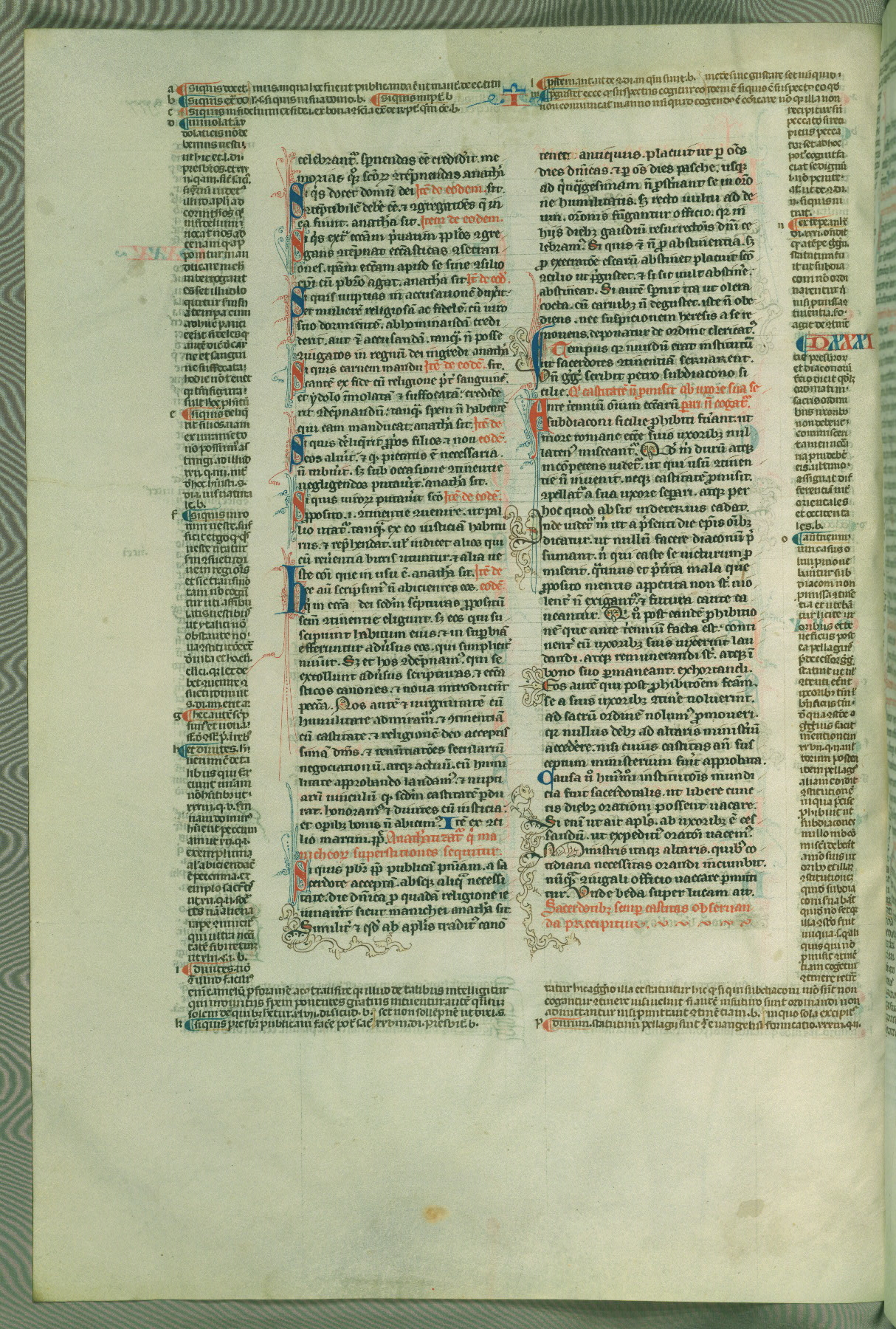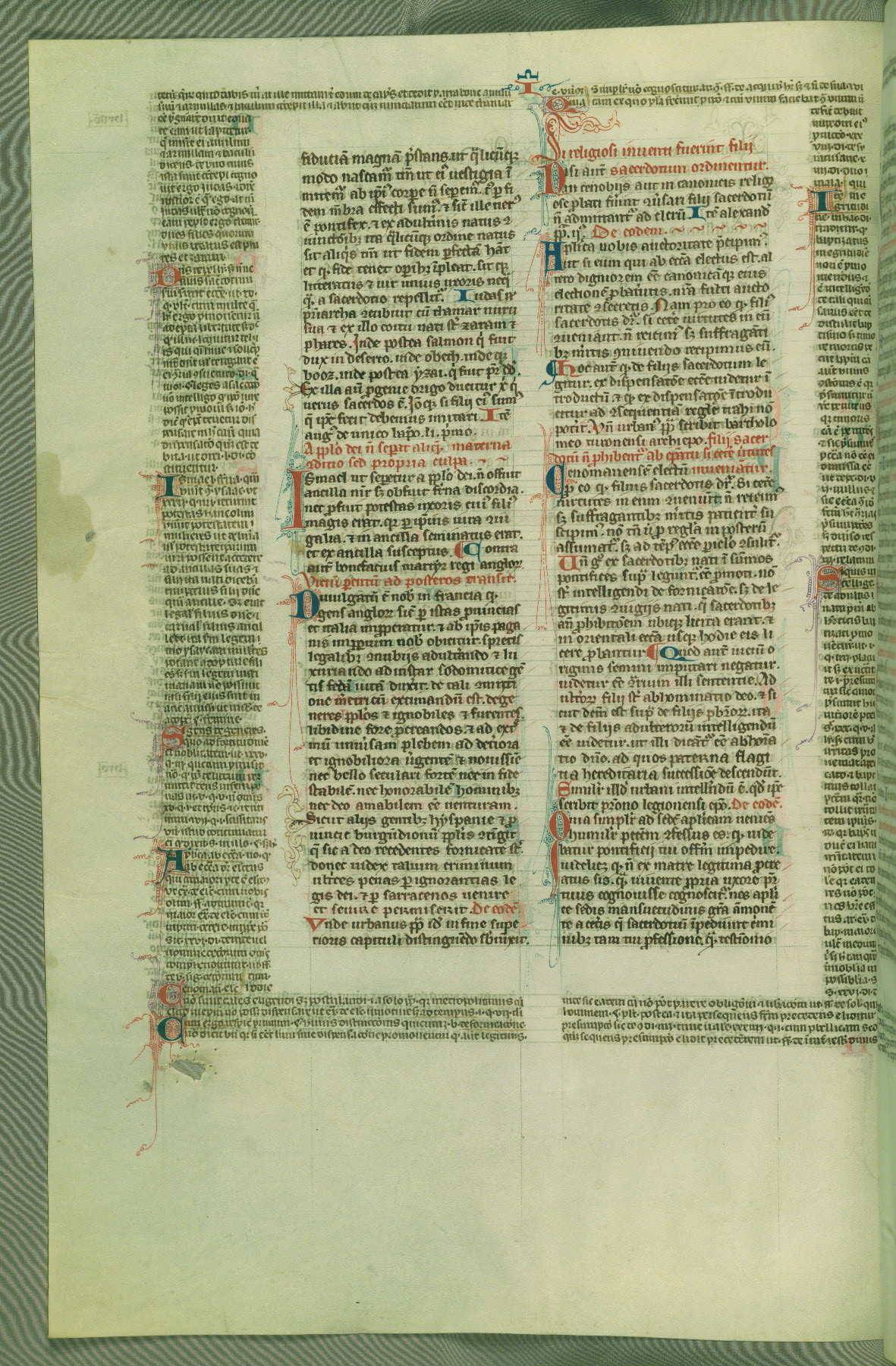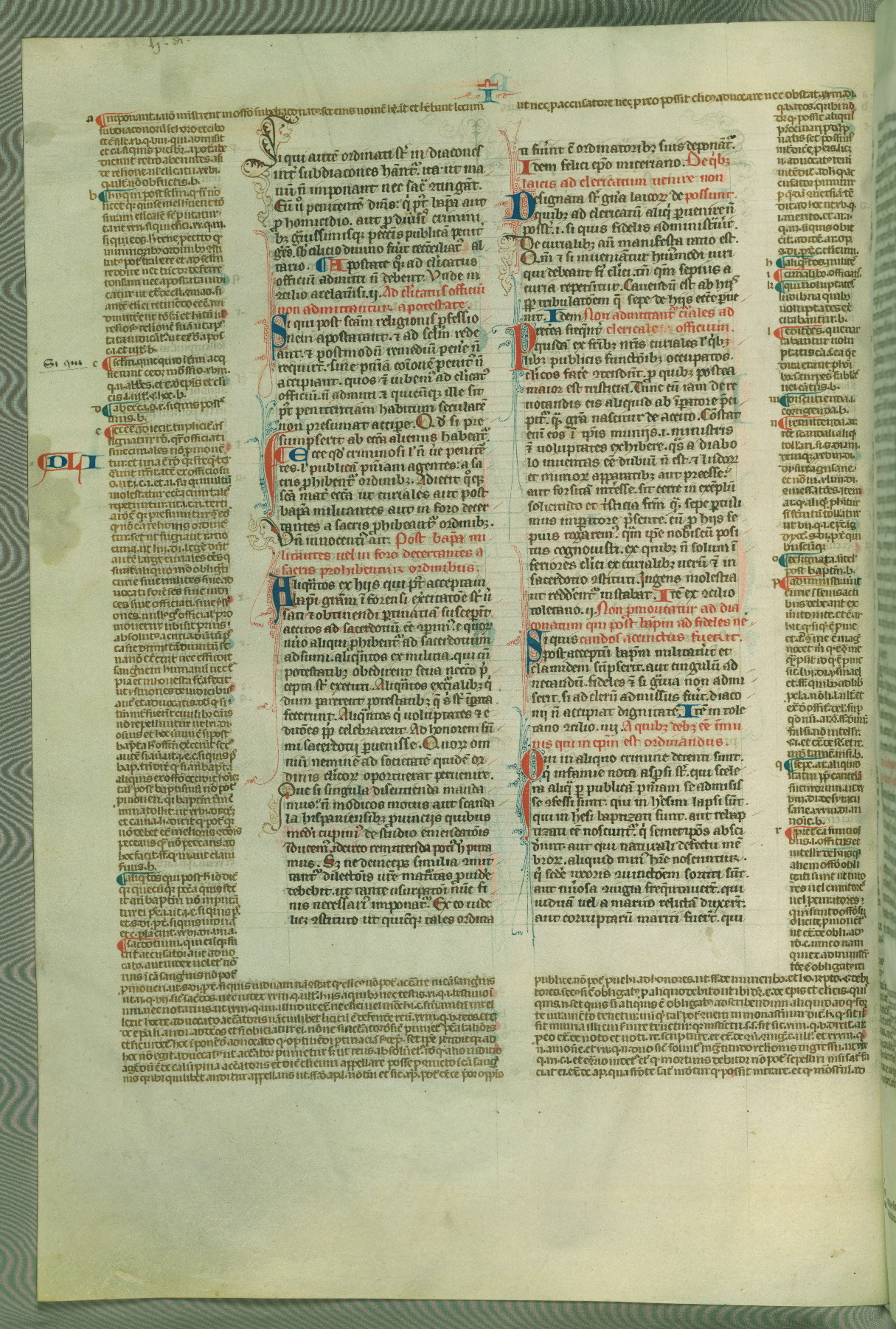 This deluxe version of Gratian's Decretum was created ca. 1280-90, most likely in Hainaut. The lively decoration of the manuscript indicates a marked taste for narrative, and there are thirty-seven historiated initials. The gloss work was completed by Bartholomew of Brescia. At first, Paris would seem to be the most likely place of origin, given that it was the leading center for the study of canon law. However, this particular manuscript exhibits scribal features that suggest its place of origin as being the Cistercian abbey of Cambron in Hainaut. Furthermore, Abbot Baudouin de Bousso, whose tenure at the abbey was from 1283 to 1293, was schooled in theology at the University of Paris, and he would eventually endorse the production of many fine manuscripts while at Cambron. In fact, the catalyst for this endeavor seems to have been the Beaupré Antiphonary (W.759-761), which was was created at Cambron during the 1280s. Stylistic features of W.133 seem to have connections with the Beaupré Antiphonary. For example, Cistercian monks are shown in three extant illuminations throughout three of the antiphonary volumes; these monks are pictured in brown habits similar to the type worn by clerics in W.133. The reliance upon Cistercian precedents for textual and design features associates W.133 with the Cistercian abbey at Cambron. However, more remains to be confirmed by further inspection of the output of the scriptorium at Cambron.