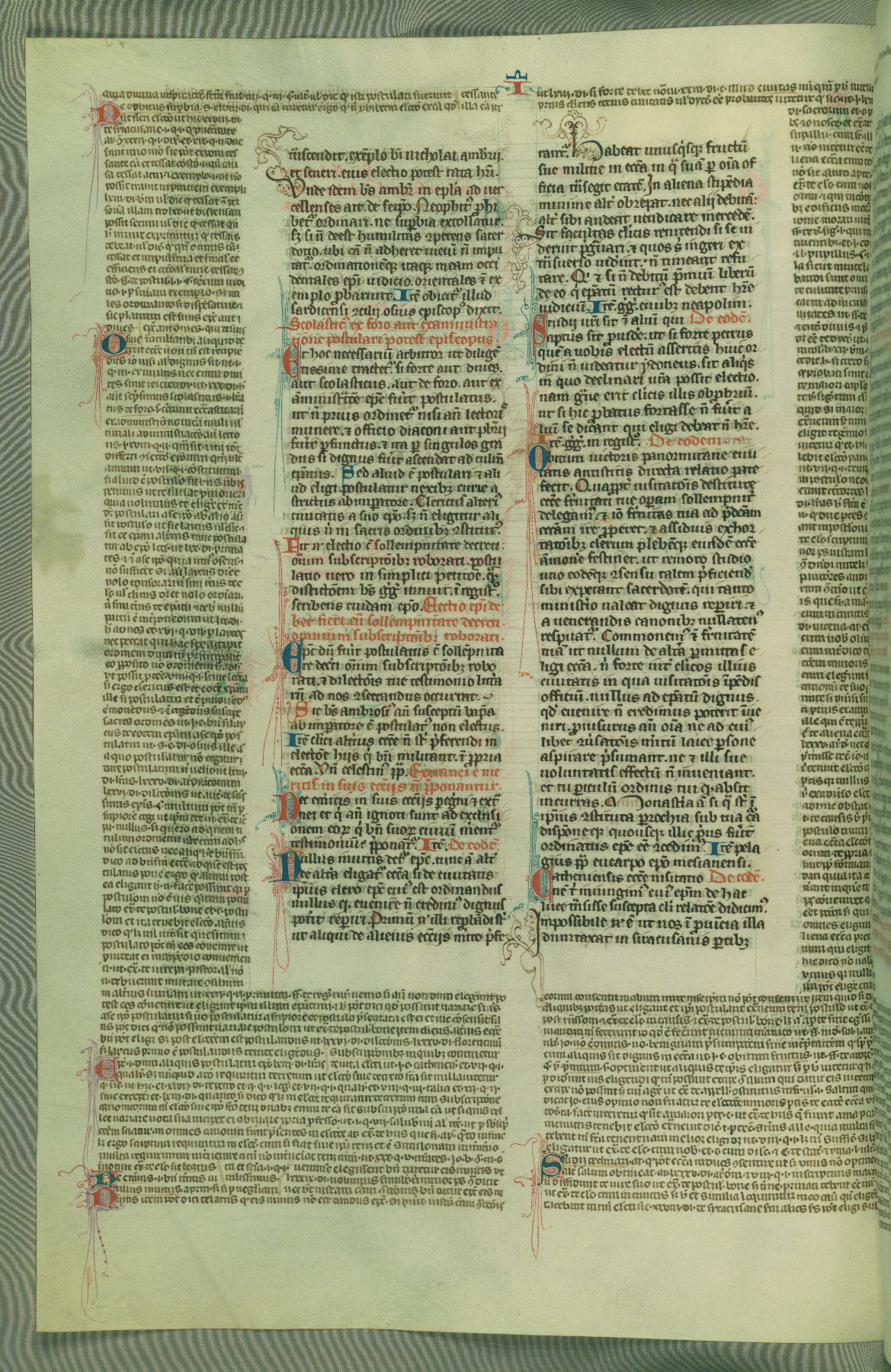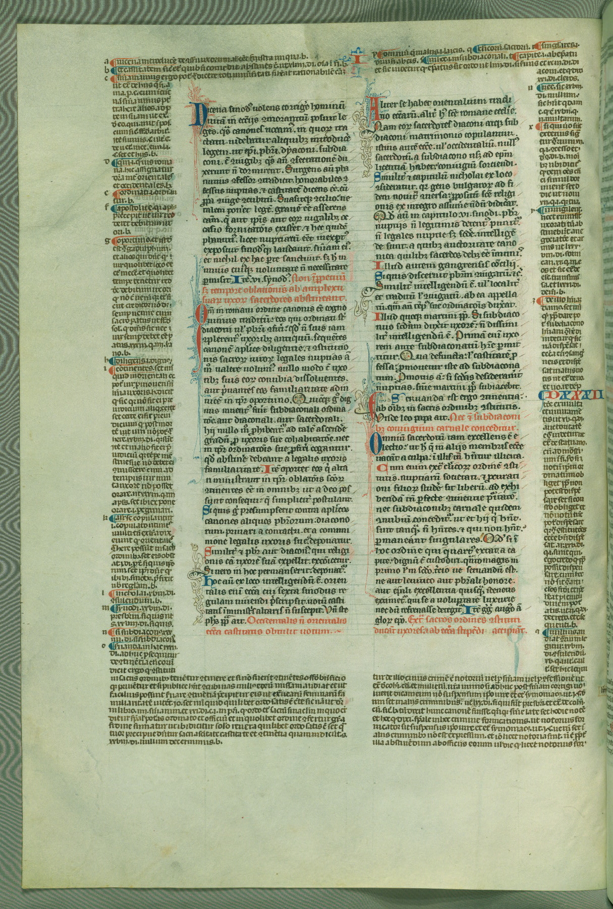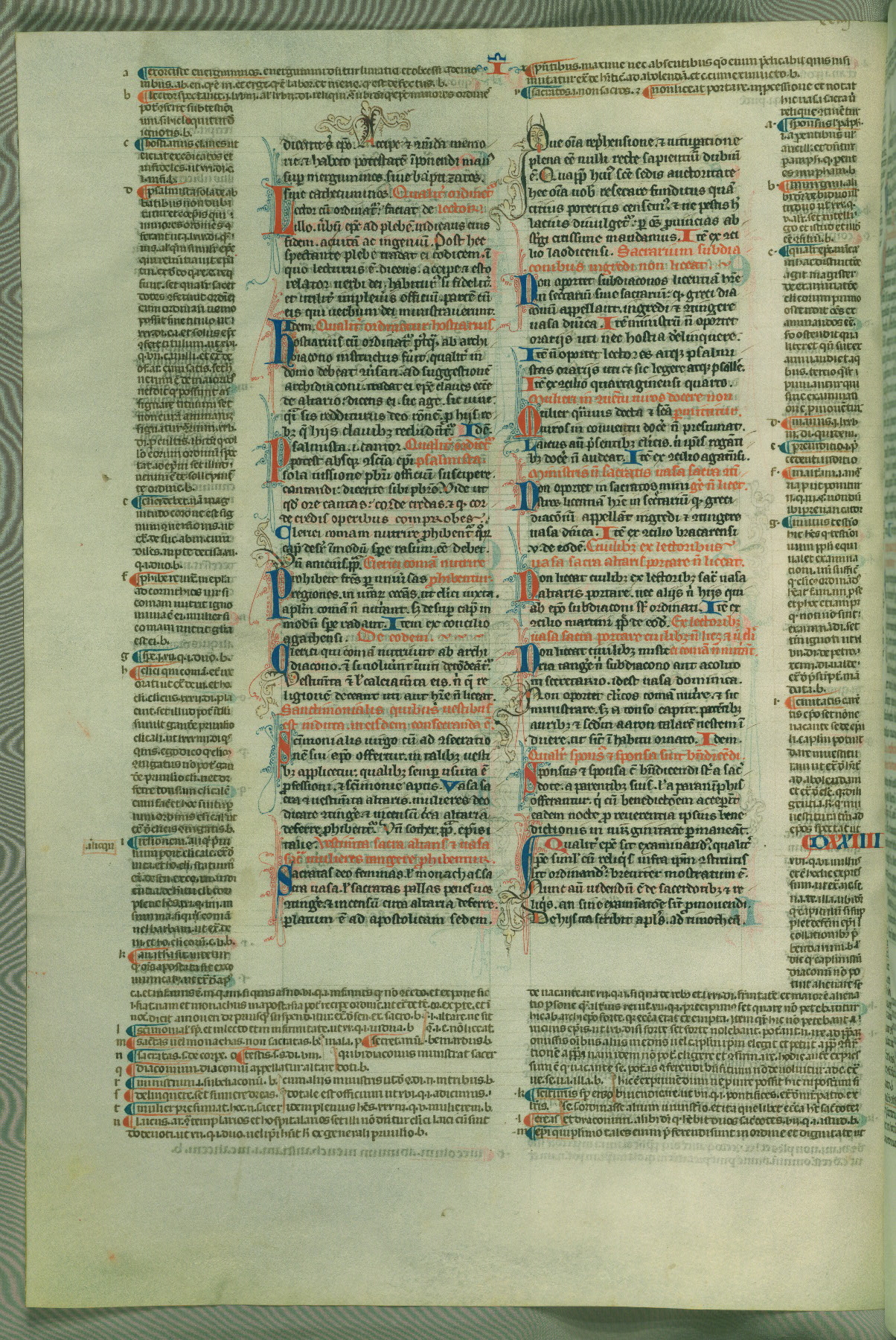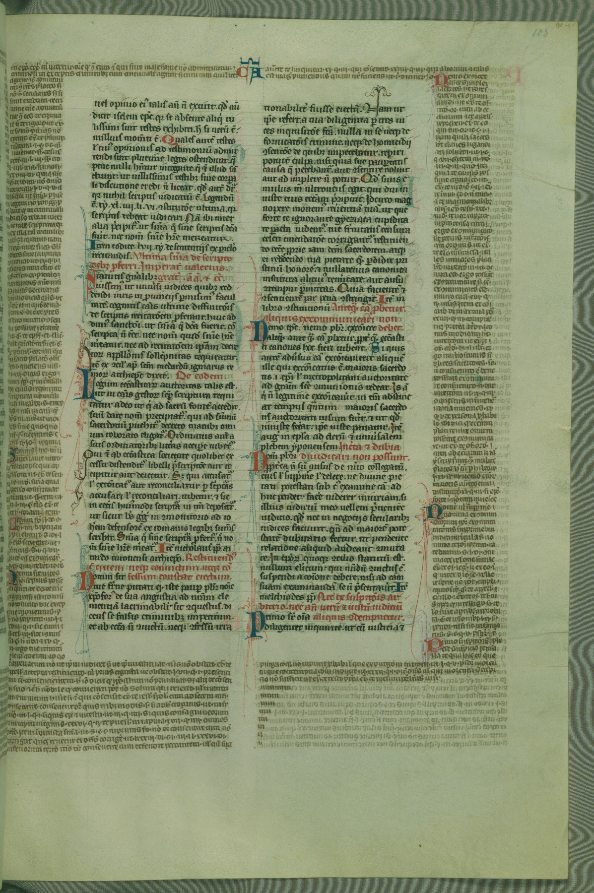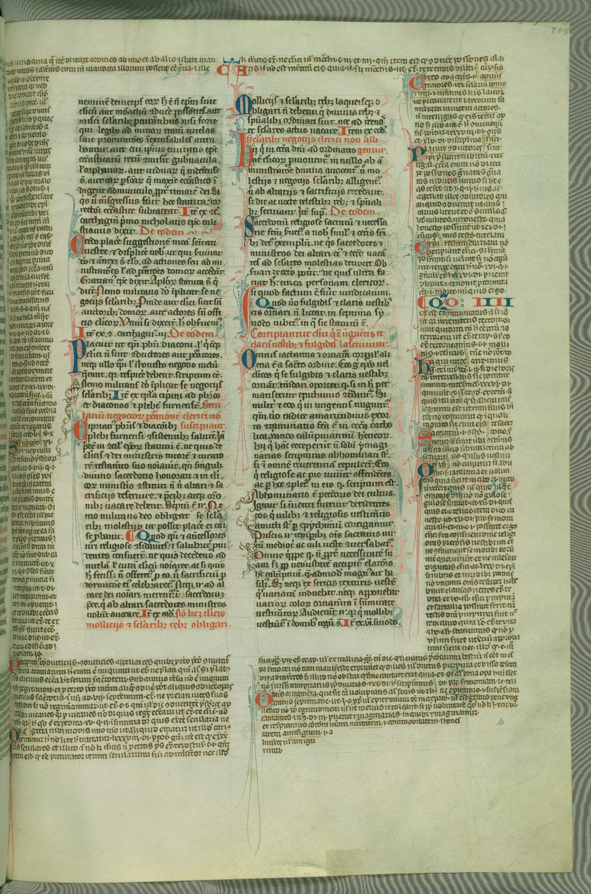 This deluxe version of Gratian's Decretum was created ca. 1280-90, most likely in Hainaut. The lively decoration of the manuscript indicates a marked taste for narrative, and there are thirty-seven historiated initials. The gloss work was completed by Bartholomew of Brescia. At first, Paris would seem to be the most likely place of origin, given that it was the leading center for the study of canon law. However, this particular manuscript exhibits scribal features that suggest its place of origin as being the Cistercian abbey of Cambron in Hainaut. Furthermore, Abbot Baudouin de Bousso, whose tenure at the abbey was from 1283 to 1293, was schooled in theology at the University of Paris, and he would eventually endorse the production of many fine manuscripts while at Cambron. In fact, the catalyst for this endeavor seems to have been the Beaupré Antiphonary (W.759-761), which was was created at Cambron during the 1280s. Stylistic features of W.133 seem to have connections with the Beaupré Antiphonary. For example, Cistercian monks are shown in three extant illuminations throughout three of the antiphonary volumes; these monks are pictured in brown habits similar to the type worn by clerics in W.133. The reliance upon Cistercian precedents for textual and design features associates W.133 with the Cistercian abbey at Cambron. However, more remains to be confirmed by further inspection of the output of the scriptorium at Cambron.