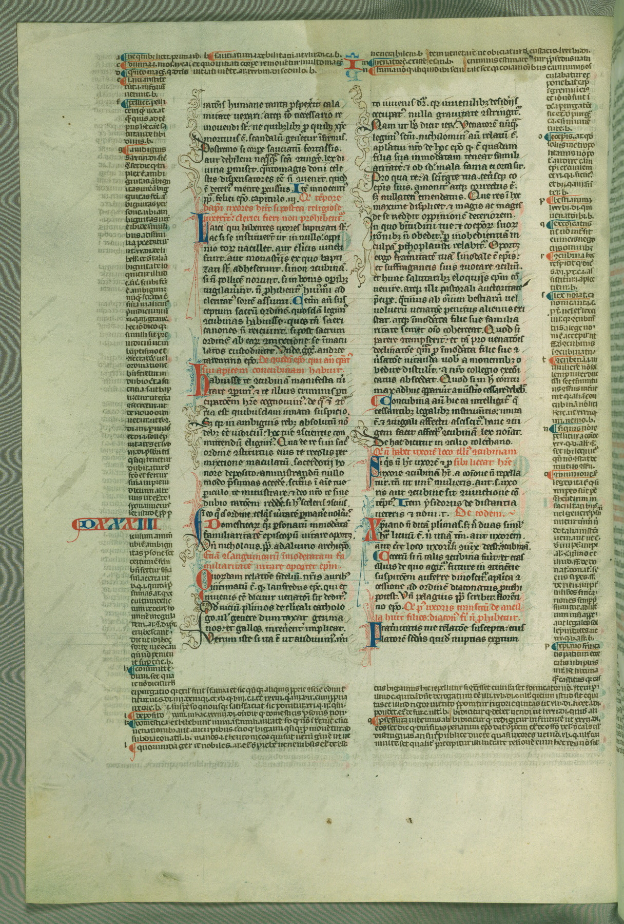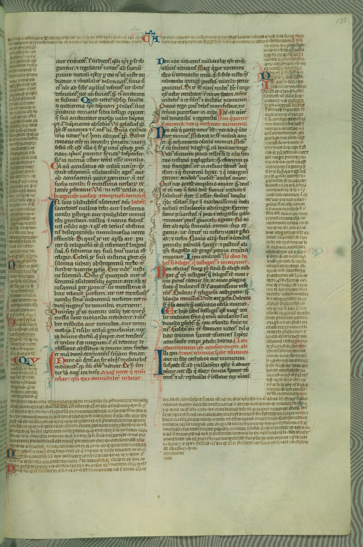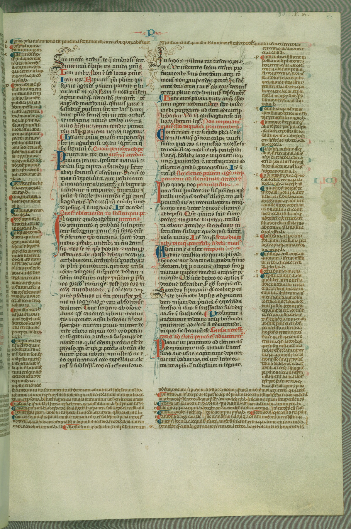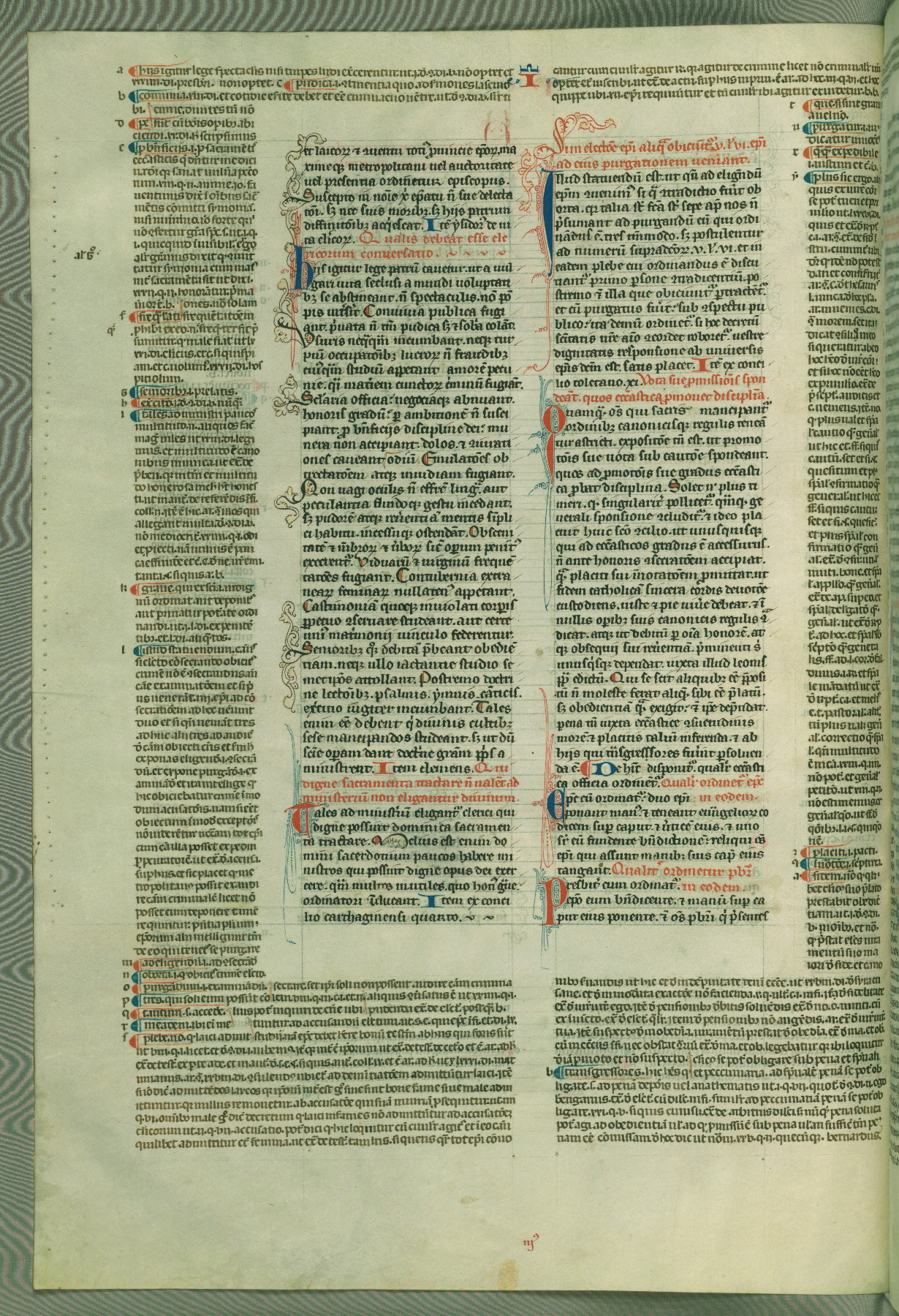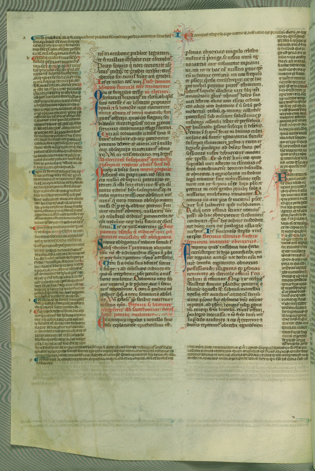 This deluxe version of Gratian's Decretum was created ca. 1280-90, most likely in Hainaut. The lively decoration of the manuscript indicates a marked taste for narrative, and there are thirty-seven historiated initials. The gloss work was completed by Bartholomew of Brescia. At first, Paris would seem to be the most likely place of origin, given that it was the leading center for the study of canon law. However, this particular manuscript exhibits scribal features that suggest its place of origin as being the Cistercian abbey of Cambron in Hainaut. Furthermore, Abbot Baudouin de Bousso, whose tenure at the abbey was from 1283 to 1293, was schooled in theology at the University of Paris, and he would eventually endorse the production of many fine manuscripts while at Cambron. In fact, the catalyst for this endeavor seems to have been the Beaupré Antiphonary (W.759-761), which was was created at Cambron during the 1280s. Stylistic features of W.133 seem to have connections with the Beaupré Antiphonary. For example, Cistercian monks are shown in three extant illuminations throughout three of the antiphonary volumes; these monks are pictured in brown habits similar to the type worn by clerics in W.133. The reliance upon Cistercian precedents for textual and design features associates W.133 with the Cistercian abbey at Cambron. However, more remains to be confirmed by further inspection of the output of the scriptorium at Cambron.
