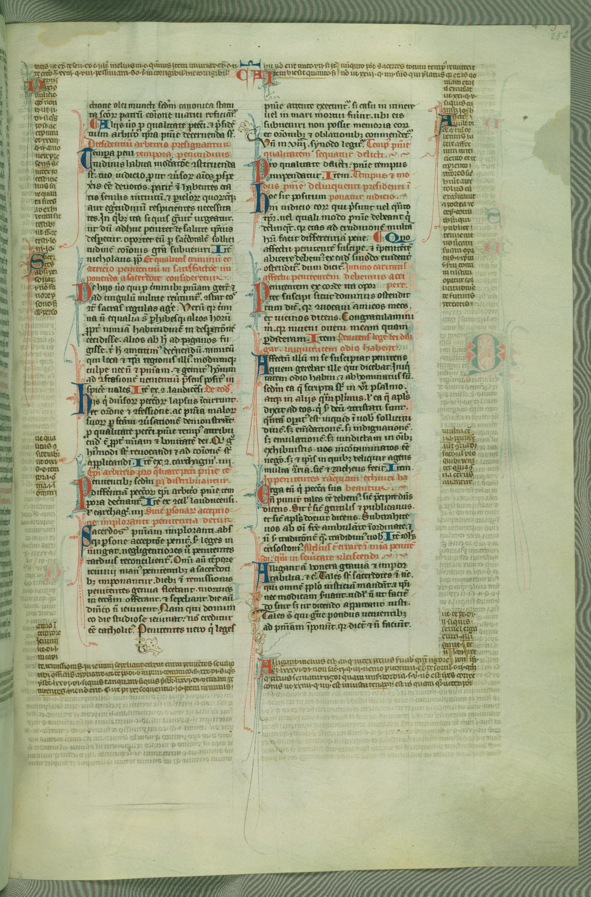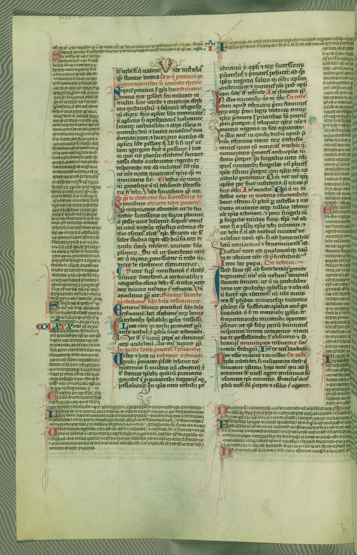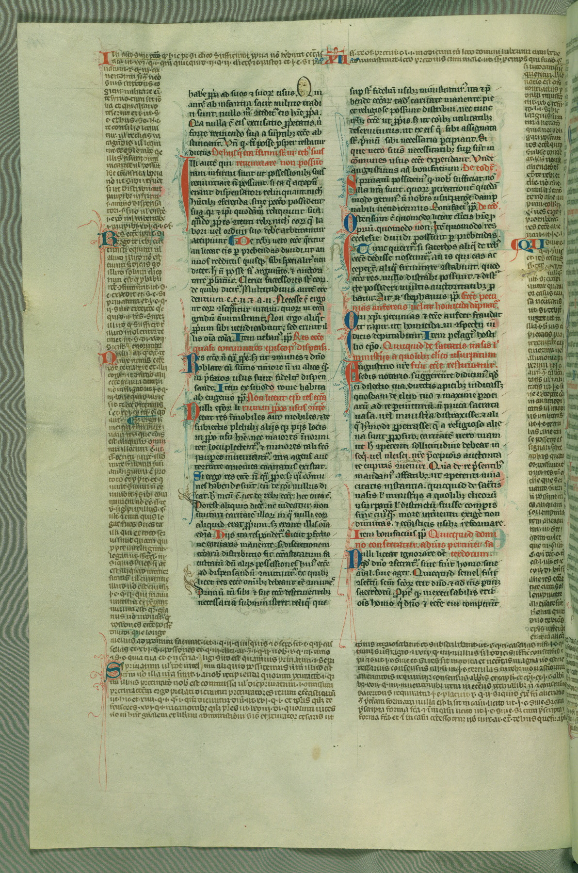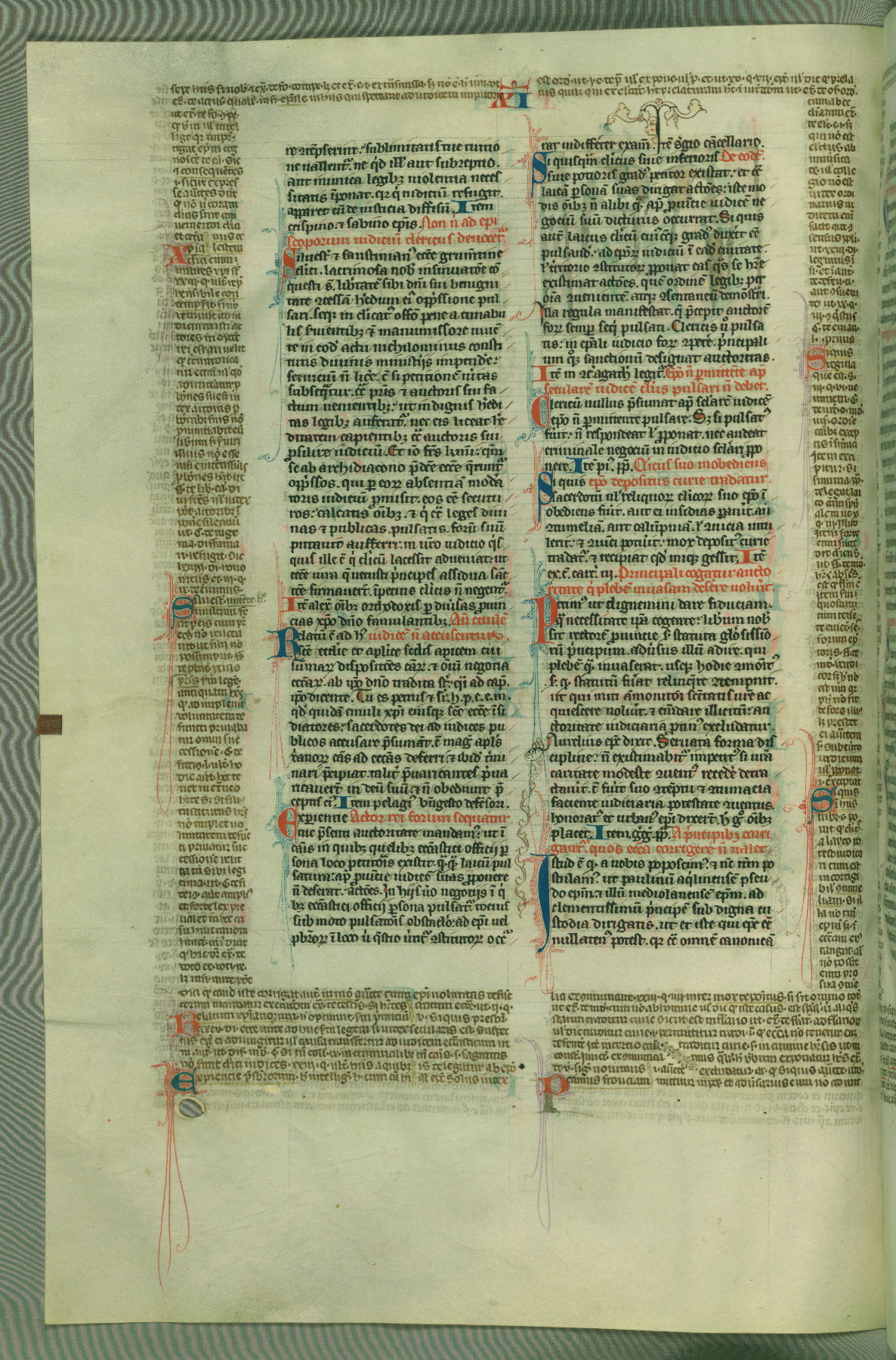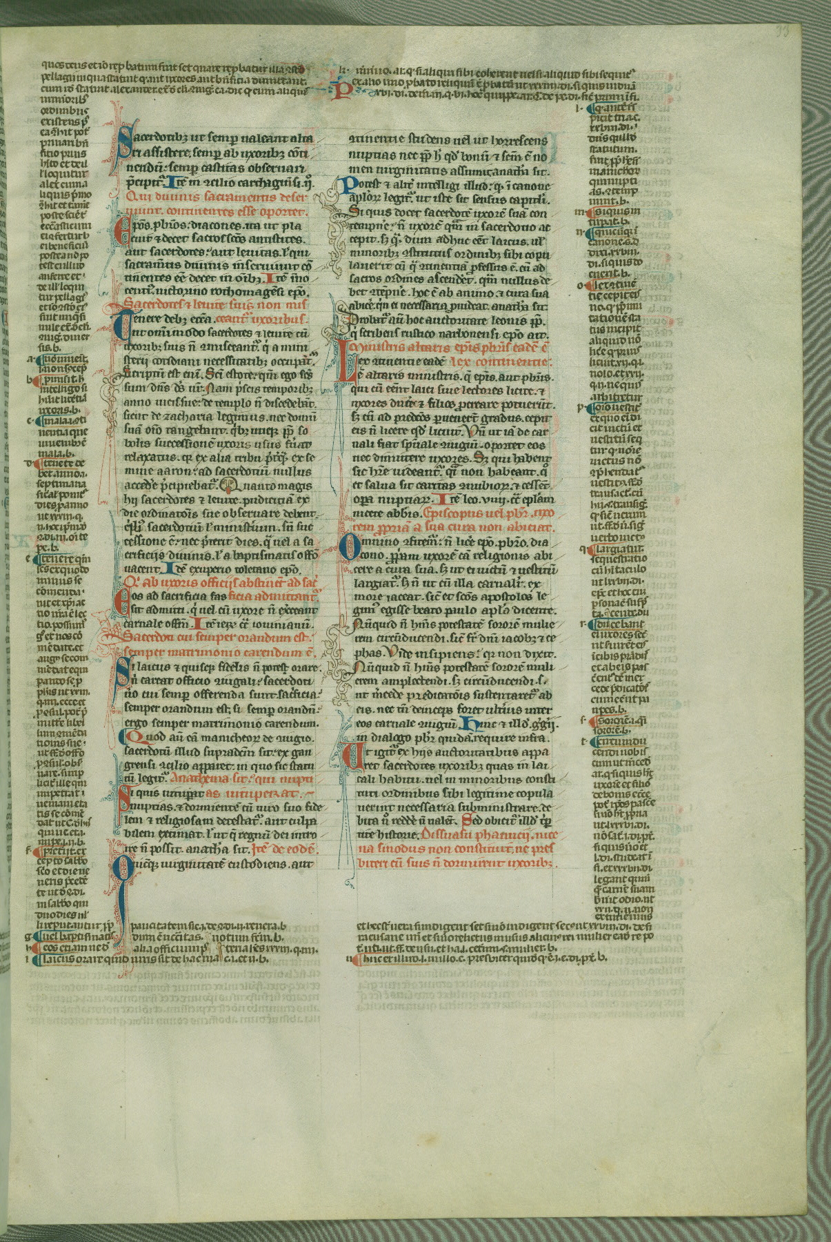 This deluxe version of Gratian's Decretum was created ca. 1280-90, most likely in Hainaut. The lively decoration of the manuscript indicates a marked taste for narrative, and there are thirty-seven historiated initials. The gloss work was completed by Bartholomew of Brescia. At first, Paris would seem to be the most likely place of origin, given that it was the leading center for the study of canon law. However, this particular manuscript exhibits scribal features that suggest its place of origin as being the Cistercian abbey of Cambron in Hainaut. Furthermore, Abbot Baudouin de Bousso, whose tenure at the abbey was from 1283 to 1293, was schooled in theology at the University of Paris, and he would eventually endorse the production of many fine manuscripts while at Cambron. In fact, the catalyst for this endeavor seems to have been the Beaupré Antiphonary (W.759-761), which was was created at Cambron during the 1280s. Stylistic features of W.133 seem to have connections with the Beaupré Antiphonary. For example, Cistercian monks are shown in three extant illuminations throughout three of the antiphonary volumes; these monks are pictured in brown habits similar to the type worn by clerics in W.133. The reliance upon Cistercian precedents for textual and design features associates W.133 with the Cistercian abbey at Cambron. However, more remains to be confirmed by further inspection of the output of the scriptorium at Cambron.