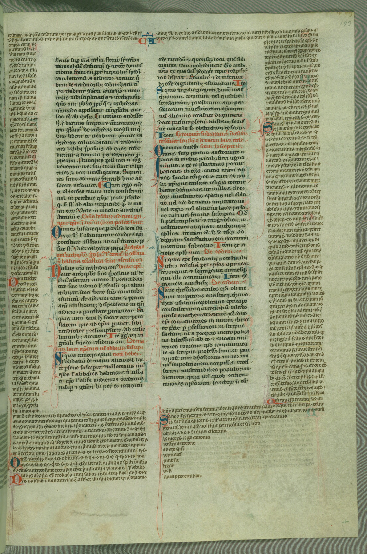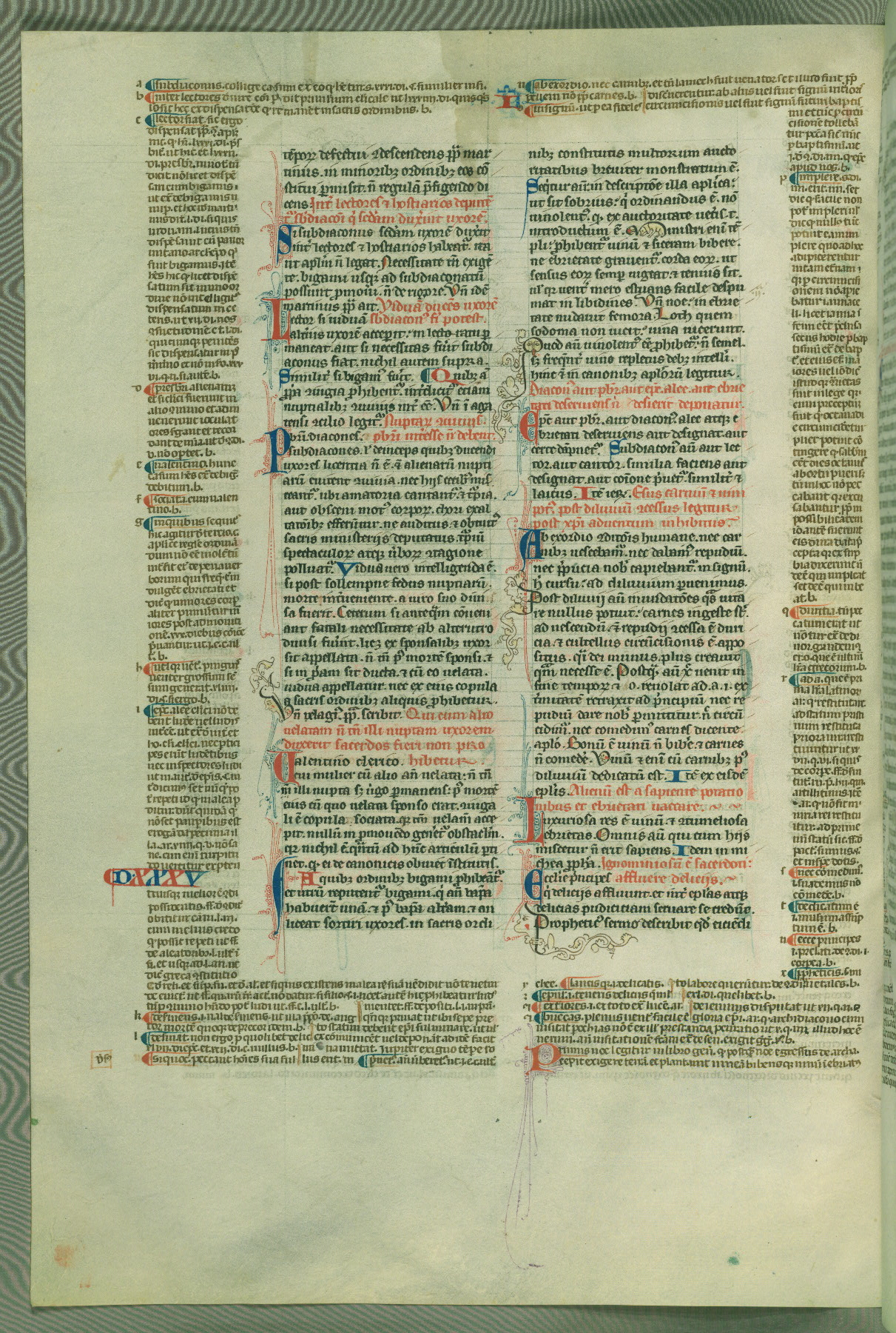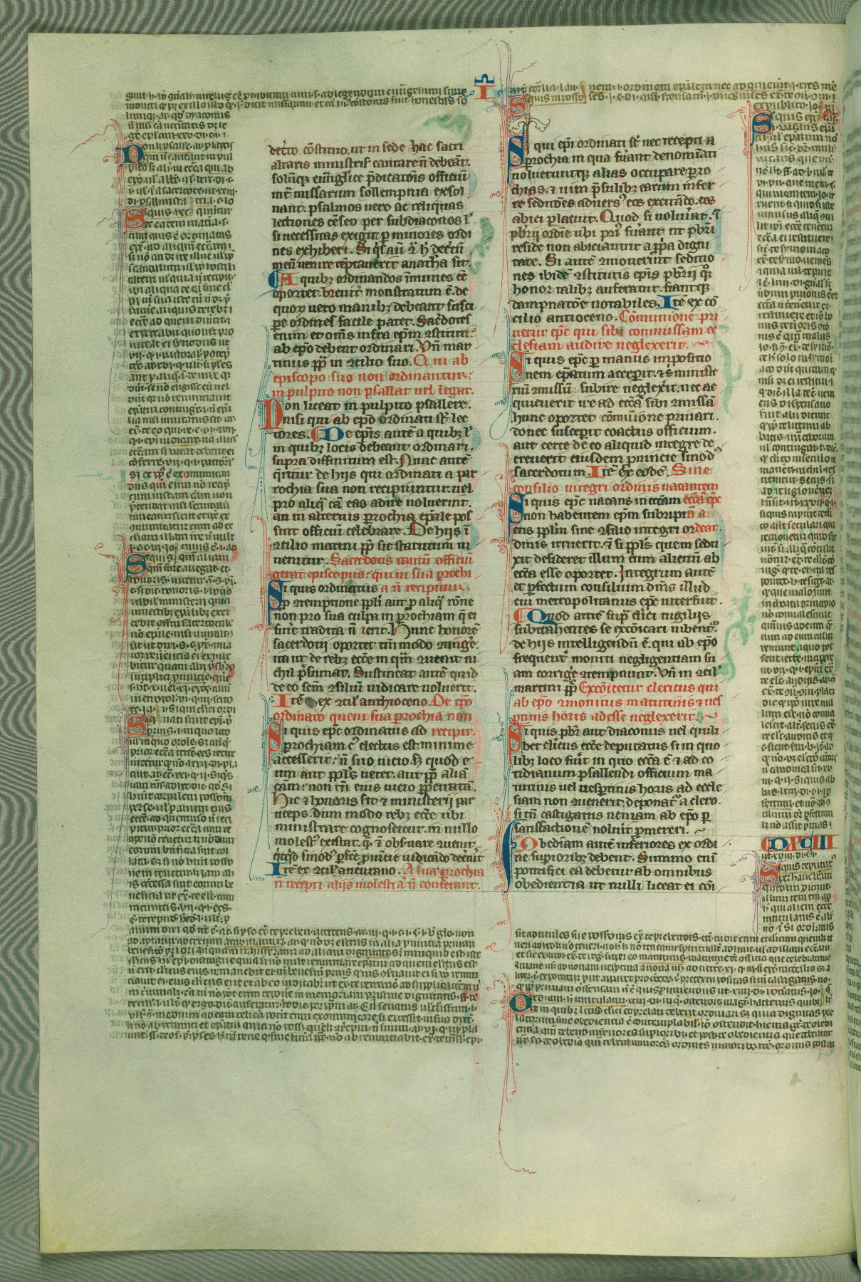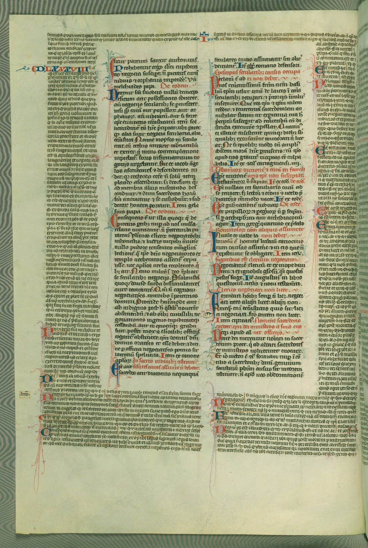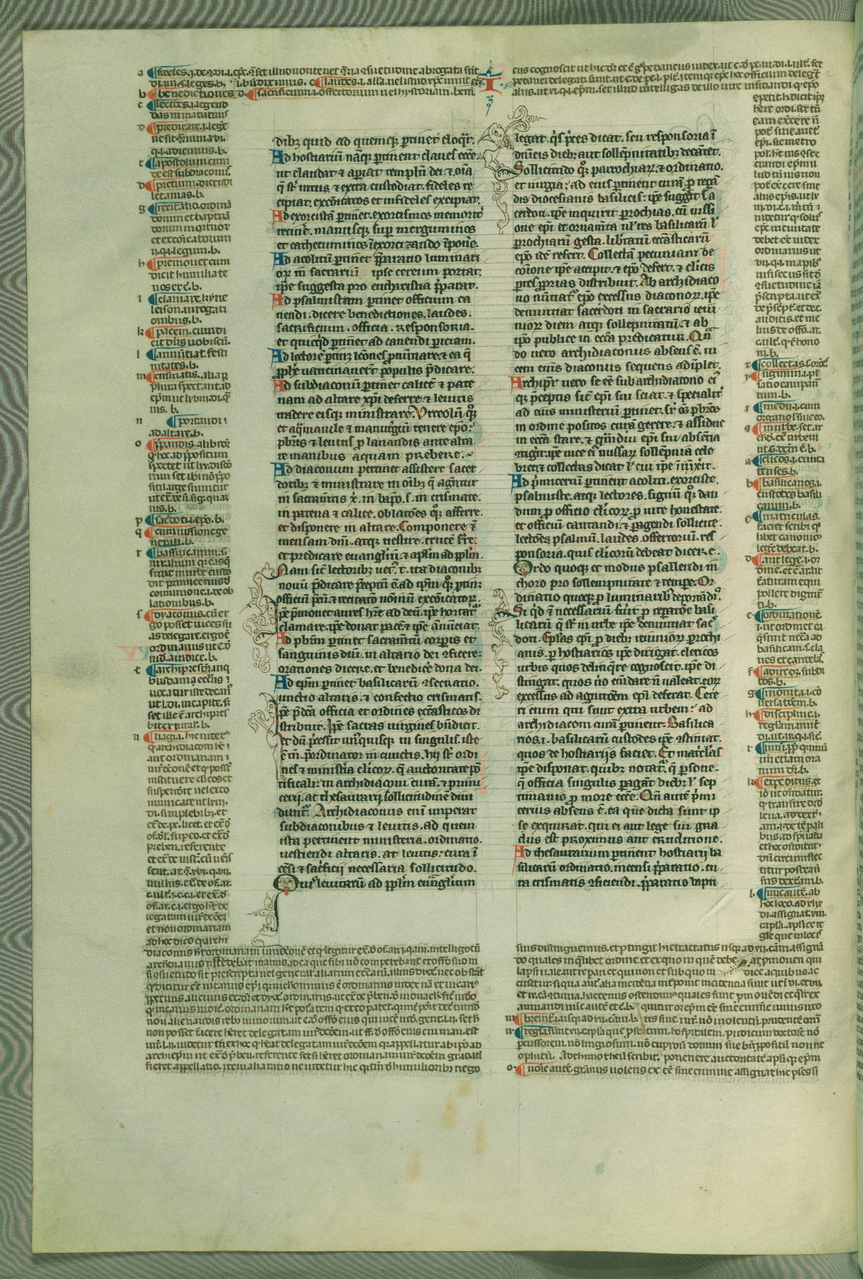 This deluxe version of Gratian's Decretum was created ca. 1280-90, most likely in Hainaut. The lively decoration of the manuscript indicates a marked taste for narrative, and there are thirty-seven historiated initials. The gloss work was completed by Bartholomew of Brescia. At first, Paris would seem to be the most likely place of origin, given that it was the leading center for the study of canon law. However, this particular manuscript exhibits scribal features that suggest its place of origin as being the Cistercian abbey of Cambron in Hainaut. Furthermore, Abbot Baudouin de Bousso, whose tenure at the abbey was from 1283 to 1293, was schooled in theology at the University of Paris, and he would eventually endorse the production of many fine manuscripts while at Cambron. In fact, the catalyst for this endeavor seems to have been the Beaupré Antiphonary (W.759-761), which was was created at Cambron during the 1280s. Stylistic features of W.133 seem to have connections with the Beaupré Antiphonary. For example, Cistercian monks are shown in three extant illuminations throughout three of the antiphonary volumes; these monks are pictured in brown habits similar to the type worn by clerics in W.133. The reliance upon Cistercian precedents for textual and design features associates W.133 with the Cistercian abbey at Cambron. However, more remains to be confirmed by further inspection of the output of the scriptorium at Cambron.
