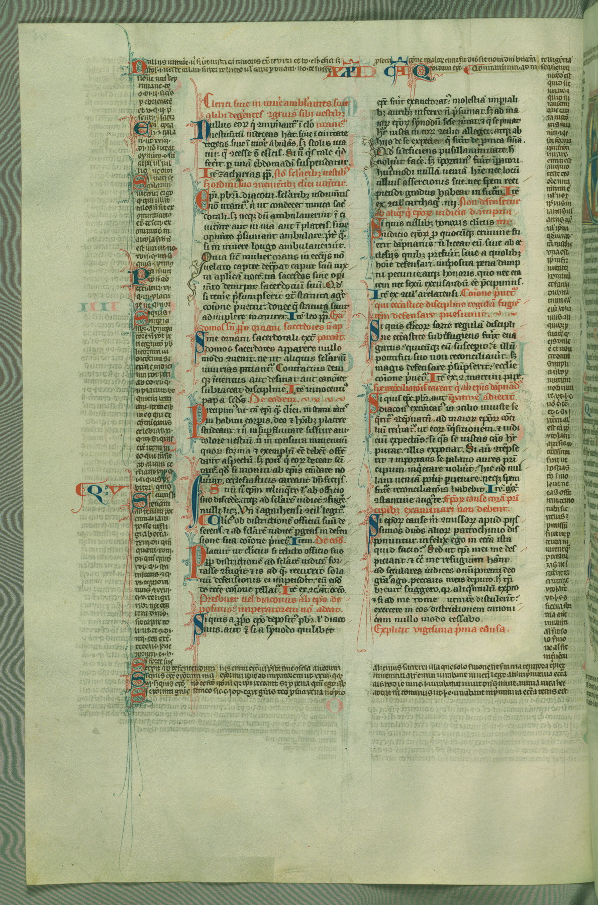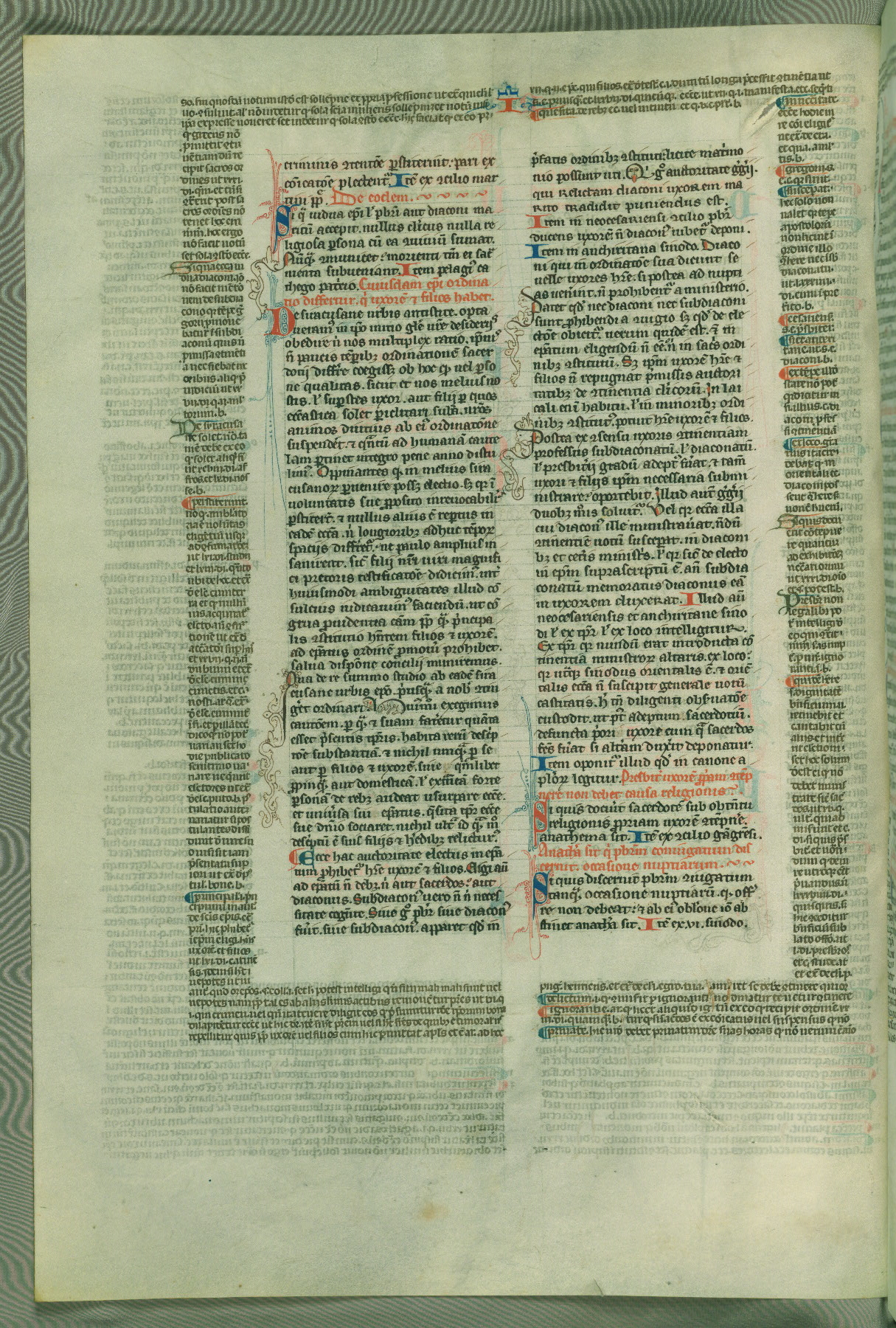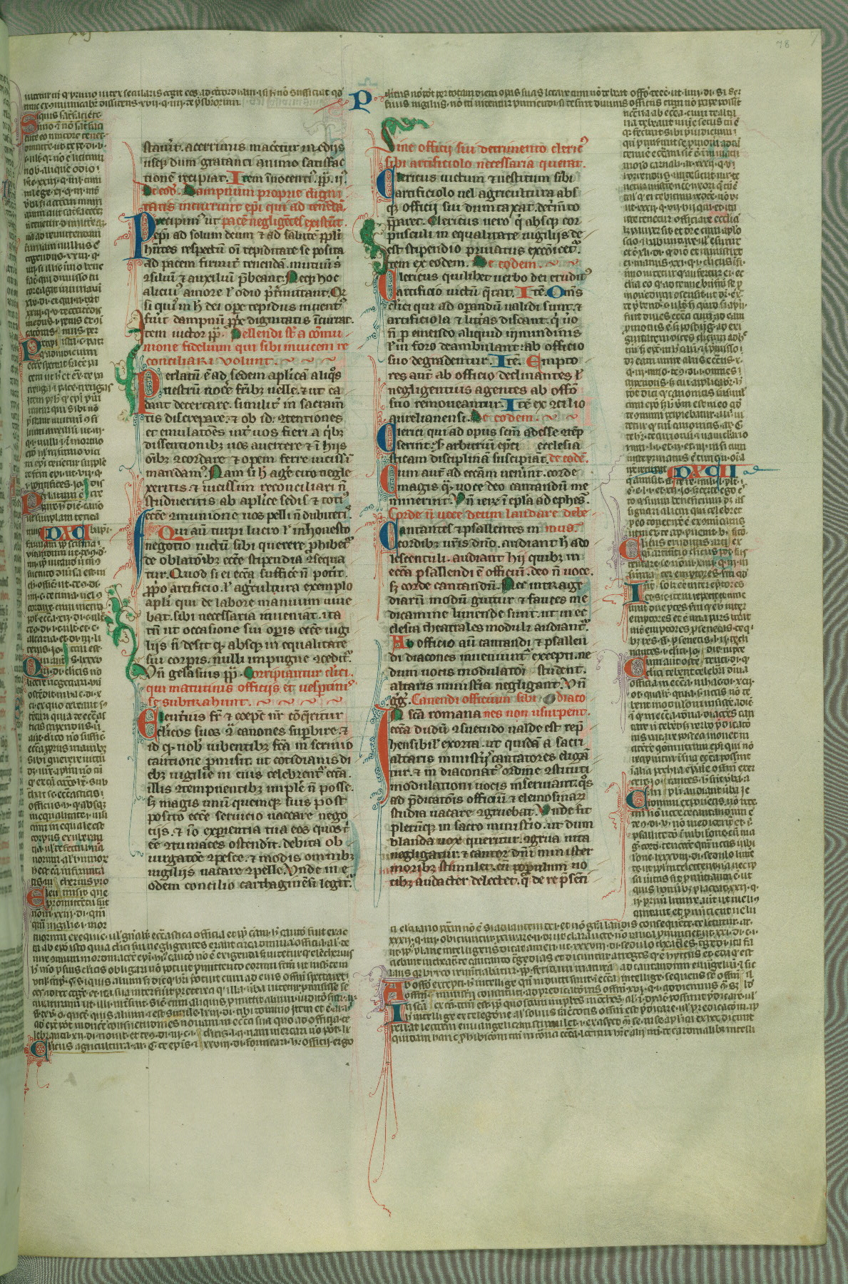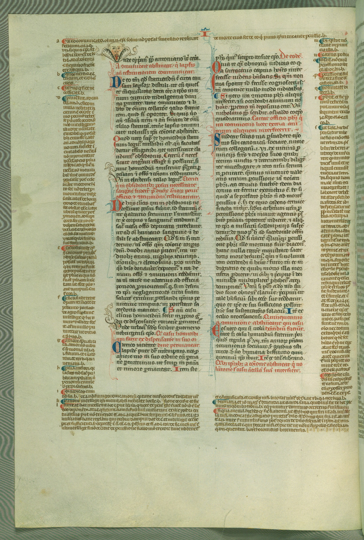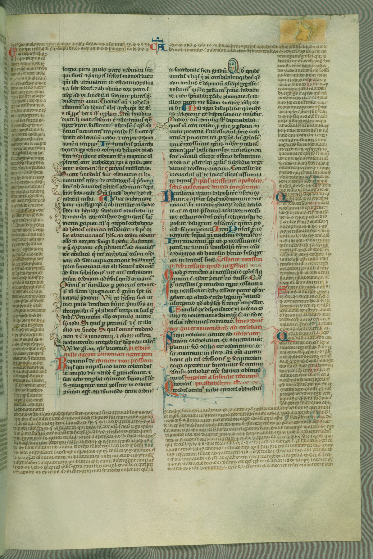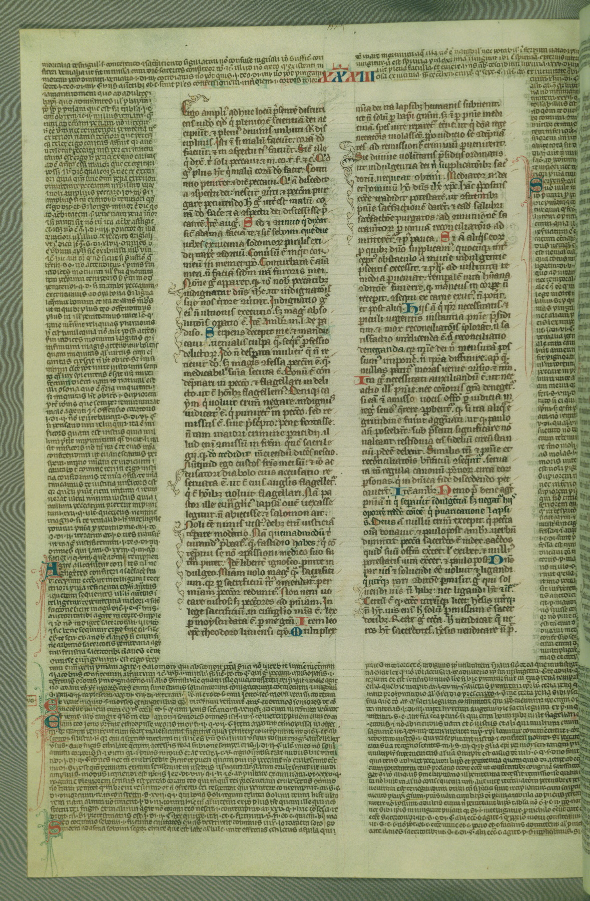 This deluxe version of Gratian's Decretum was created ca. 1280-90, most likely in Hainaut. The lively decoration of the manuscript indicates a marked taste for narrative, and there are thirty-seven historiated initials. The gloss work was completed by Bartholomew of Brescia. At first, Paris would seem to be the most likely place of origin, given that it was the leading center for the study of canon law. However, this particular manuscript exhibits scribal features that suggest its place of origin as being the Cistercian abbey of Cambron in Hainaut. Furthermore, Abbot Baudouin de Bousso, whose tenure at the abbey was from 1283 to 1293, was schooled in theology at the University of Paris, and he would eventually endorse the production of many fine manuscripts while at Cambron. In fact, the catalyst for this endeavor seems to have been the Beaupré Antiphonary (W.759-761), which was was created at Cambron during the 1280s. Stylistic features of W.133 seem to have connections with the Beaupré Antiphonary. For example, Cistercian monks are shown in three extant illuminations throughout three of the antiphonary volumes; these monks are pictured in brown habits similar to the type worn by clerics in W.133. The reliance upon Cistercian precedents for textual and design features associates W.133 with the Cistercian abbey at Cambron. However, more remains to be confirmed by further inspection of the output of the scriptorium at Cambron.