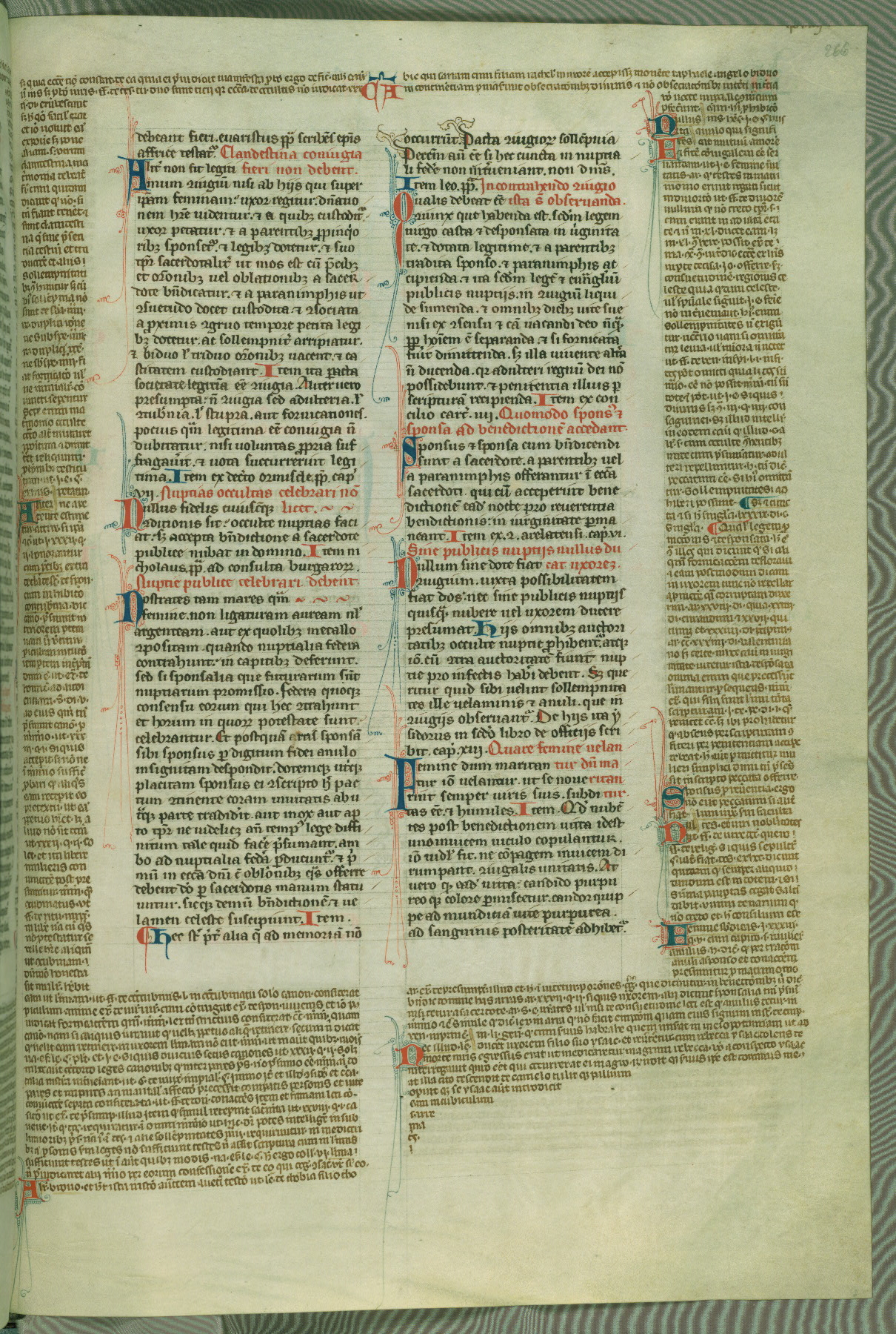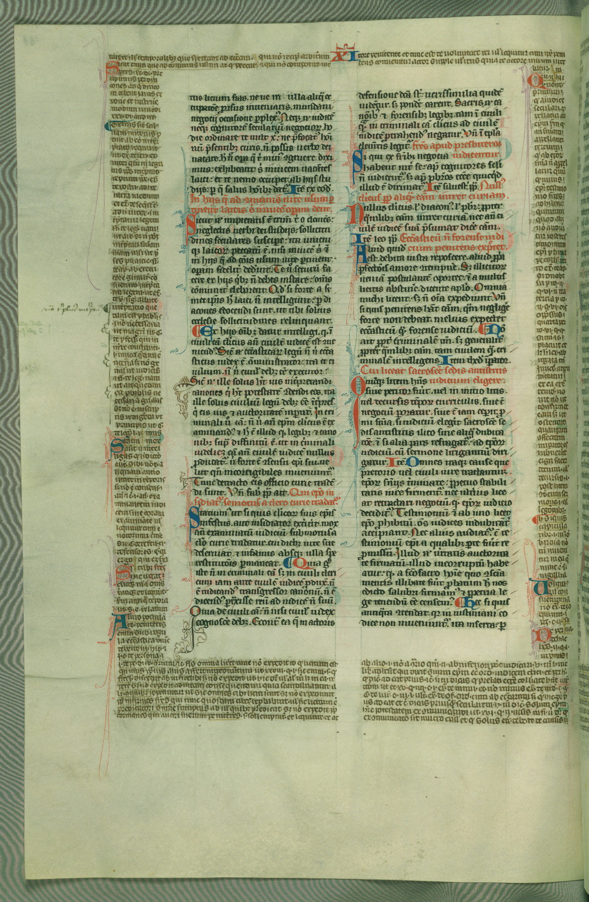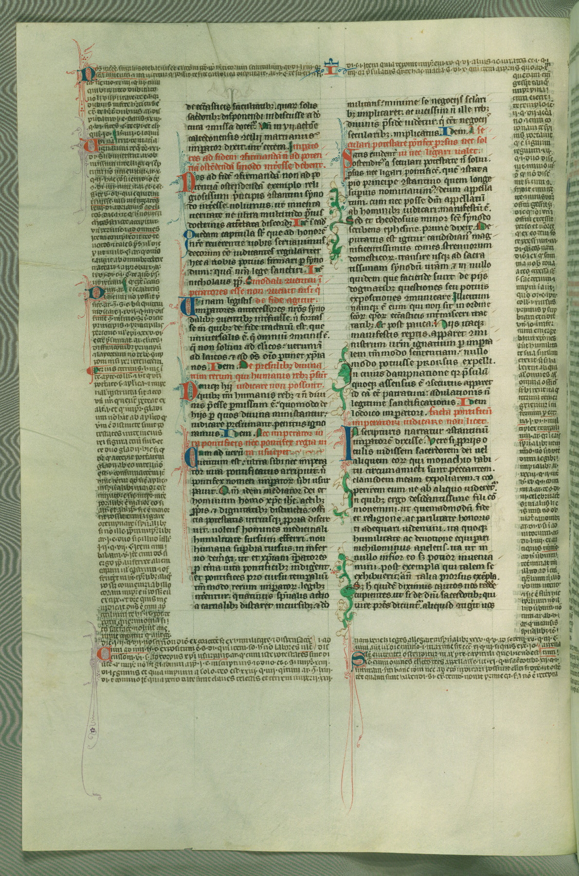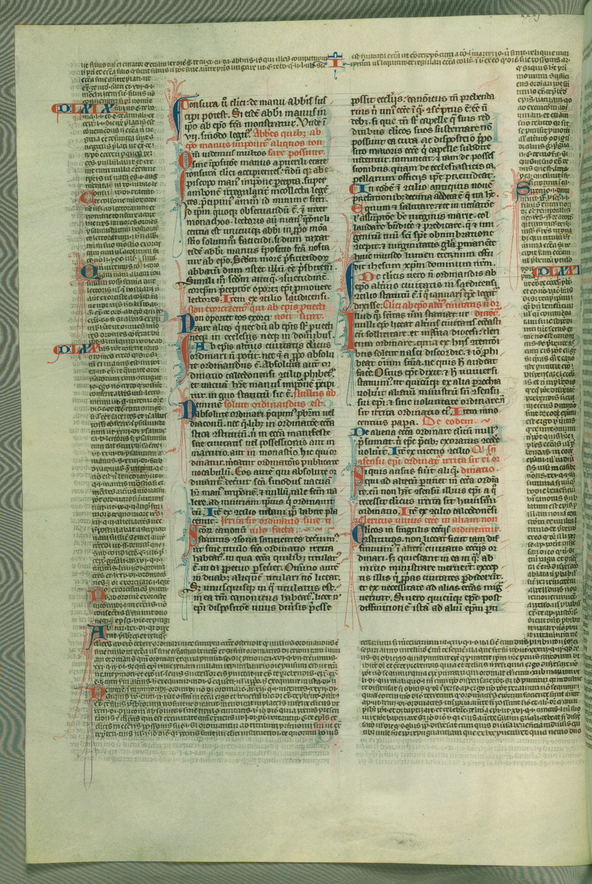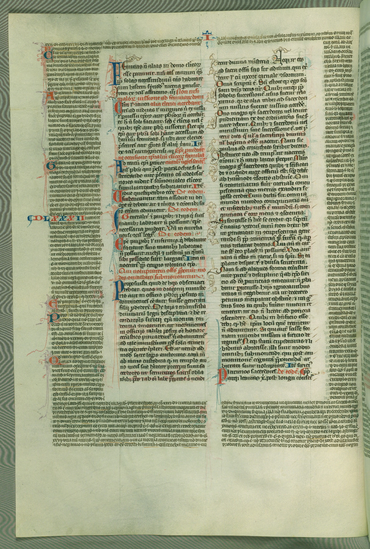 This deluxe version of Gratian's Decretum was created ca. 1280-90, most likely in Hainaut. The lively decoration of the manuscript indicates a marked taste for narrative, and there are thirty-seven historiated initials. The gloss work was completed by Bartholomew of Brescia. At first, Paris would seem to be the most likely place of origin, given that it was the leading center for the study of canon law. However, this particular manuscript exhibits scribal features that suggest its place of origin as being the Cistercian abbey of Cambron in Hainaut. Furthermore, Abbot Baudouin de Bousso, whose tenure at the abbey was from 1283 to 1293, was schooled in theology at the University of Paris, and he would eventually endorse the production of many fine manuscripts while at Cambron. In fact, the catalyst for this endeavor seems to have been the Beaupré Antiphonary (W.759-761), which was was created at Cambron during the 1280s. Stylistic features of W.133 seem to have connections with the Beaupré Antiphonary. For example, Cistercian monks are shown in three extant illuminations throughout three of the antiphonary volumes; these monks are pictured in brown habits similar to the type worn by clerics in W.133. The reliance upon Cistercian precedents for textual and design features associates W.133 with the Cistercian abbey at Cambron. However, more remains to be confirmed by further inspection of the output of the scriptorium at Cambron.