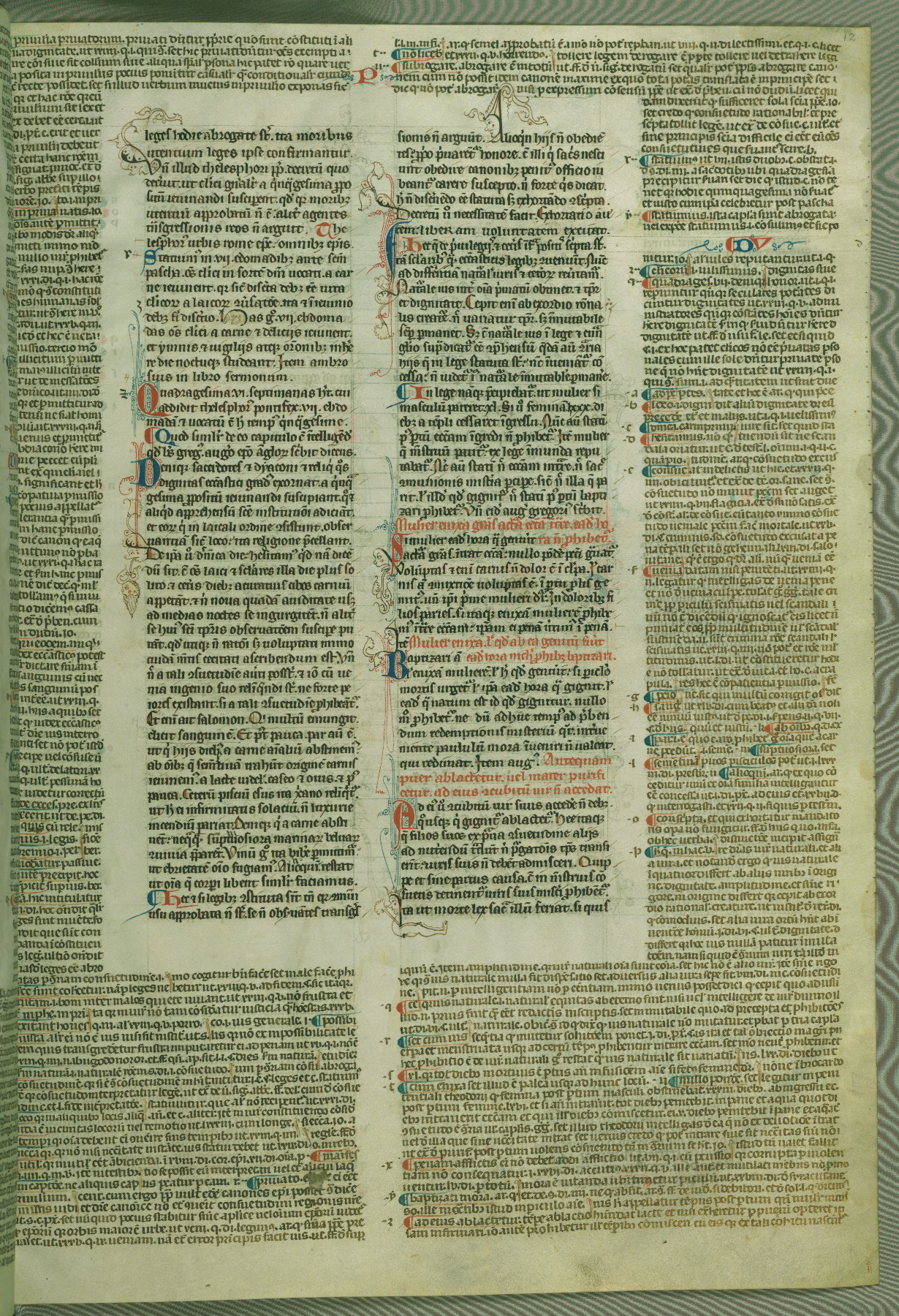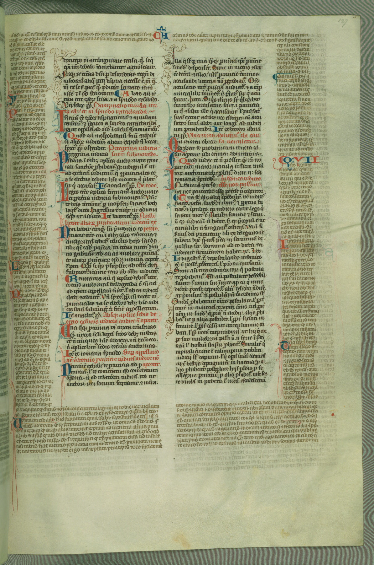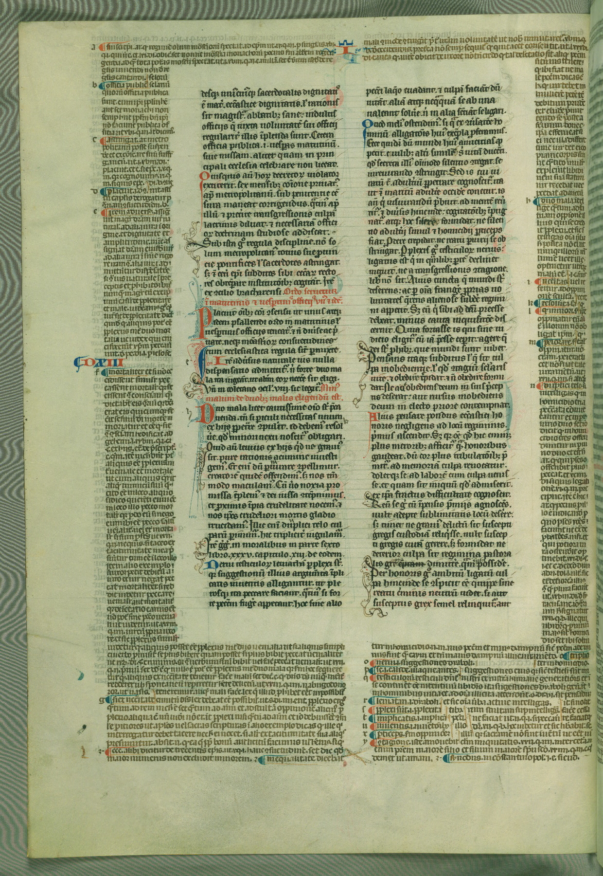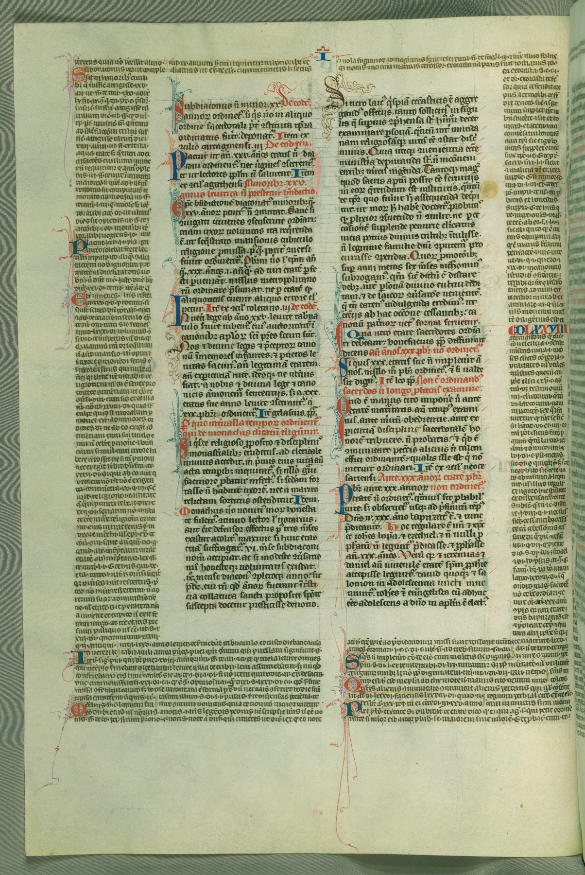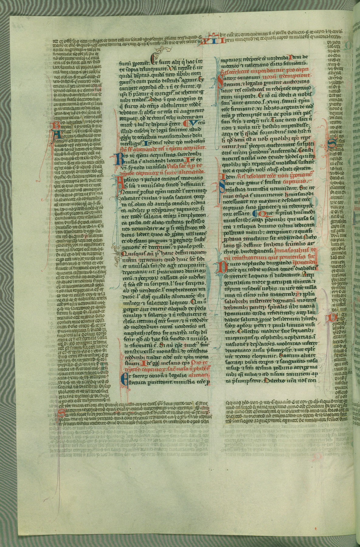 This deluxe version of Gratian's Decretum was created ca. 1280-90, most likely in Hainaut. The lively decoration of the manuscript indicates a marked taste for narrative, and there are thirty-seven historiated initials. The gloss work was completed by Bartholomew of Brescia. At first, Paris would seem to be the most likely place of origin, given that it was the leading center for the study of canon law. However, this particular manuscript exhibits scribal features that suggest its place of origin as being the Cistercian abbey of Cambron in Hainaut. Furthermore, Abbot Baudouin de Bousso, whose tenure at the abbey was from 1283 to 1293, was schooled in theology at the University of Paris, and he would eventually endorse the production of many fine manuscripts while at Cambron. In fact, the catalyst for this endeavor seems to have been the Beaupré Antiphonary (W.759-761), which was was created at Cambron during the 1280s. Stylistic features of W.133 seem to have connections with the Beaupré Antiphonary. For example, Cistercian monks are shown in three extant illuminations throughout three of the antiphonary volumes; these monks are pictured in brown habits similar to the type worn by clerics in W.133. The reliance upon Cistercian precedents for textual and design features associates W.133 with the Cistercian abbey at Cambron. However, more remains to be confirmed by further inspection of the output of the scriptorium at Cambron.