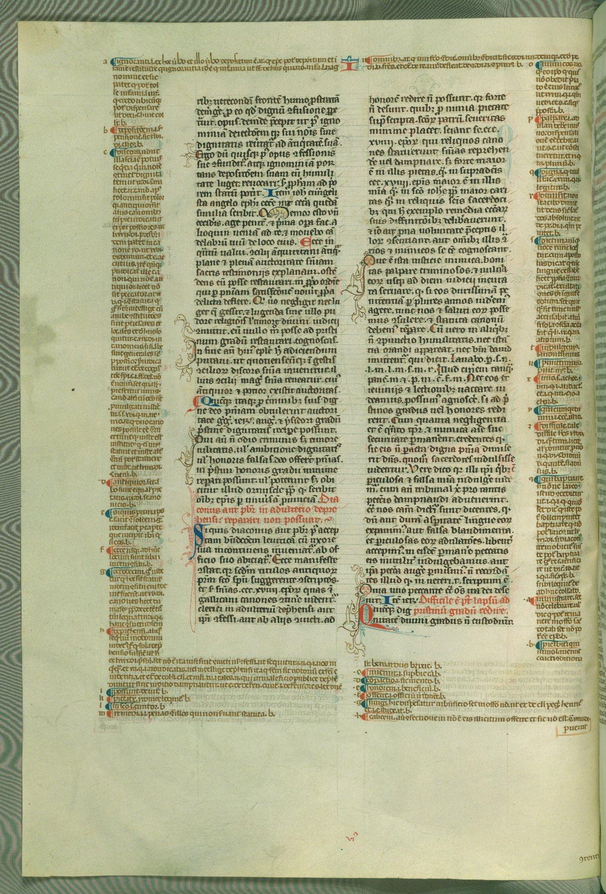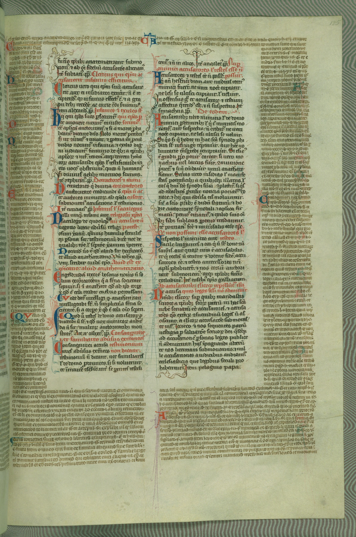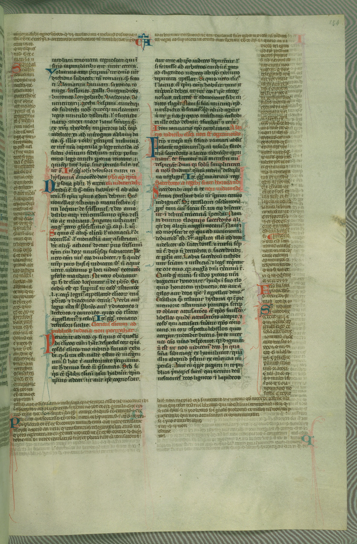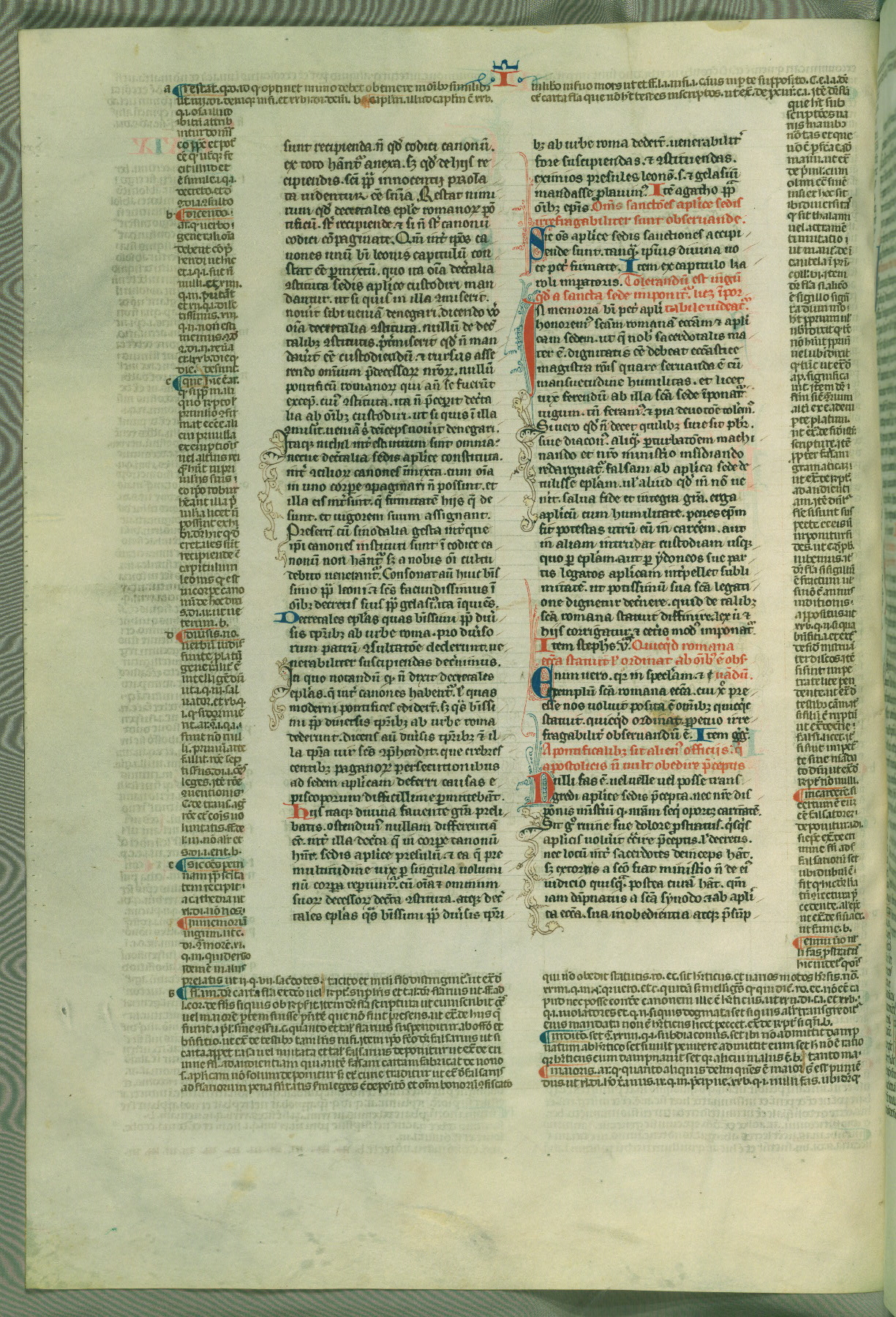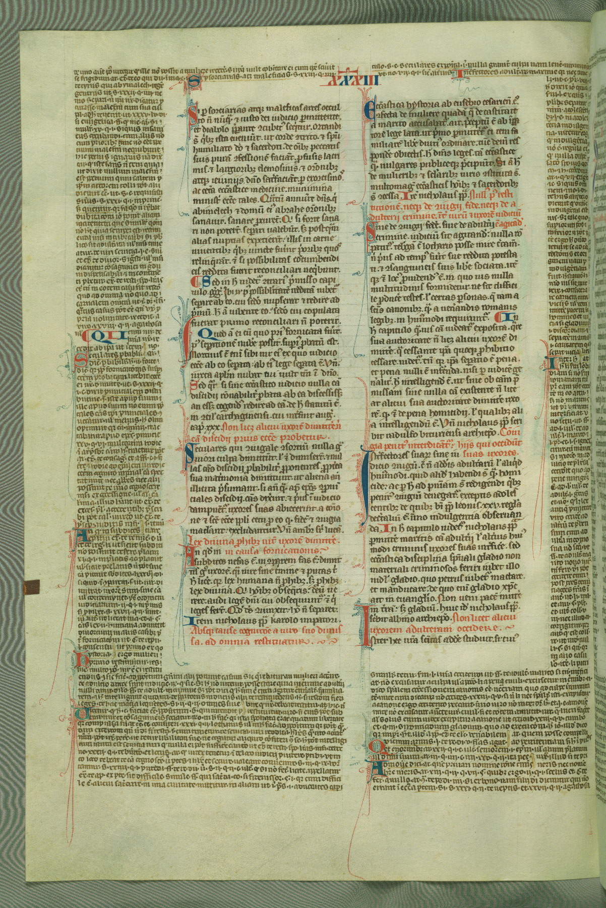 This deluxe version of Gratian's Decretum was created ca. 1280-90, most likely in Hainaut. The lively decoration of the manuscript indicates a marked taste for narrative, and there are thirty-seven historiated initials. The gloss work was completed by Bartholomew of Brescia. At first, Paris would seem to be the most likely place of origin, given that it was the leading center for the study of canon law. However, this particular manuscript exhibits scribal features that suggest its place of origin as being the Cistercian abbey of Cambron in Hainaut. Furthermore, Abbot Baudouin de Bousso, whose tenure at the abbey was from 1283 to 1293, was schooled in theology at the University of Paris, and he would eventually endorse the production of many fine manuscripts while at Cambron. In fact, the catalyst for this endeavor seems to have been the Beaupré Antiphonary (W.759-761), which was was created at Cambron during the 1280s. Stylistic features of W.133 seem to have connections with the Beaupré Antiphonary. For example, Cistercian monks are shown in three extant illuminations throughout three of the antiphonary volumes; these monks are pictured in brown habits similar to the type worn by clerics in W.133. The reliance upon Cistercian precedents for textual and design features associates W.133 with the Cistercian abbey at Cambron. However, more remains to be confirmed by further inspection of the output of the scriptorium at Cambron.
